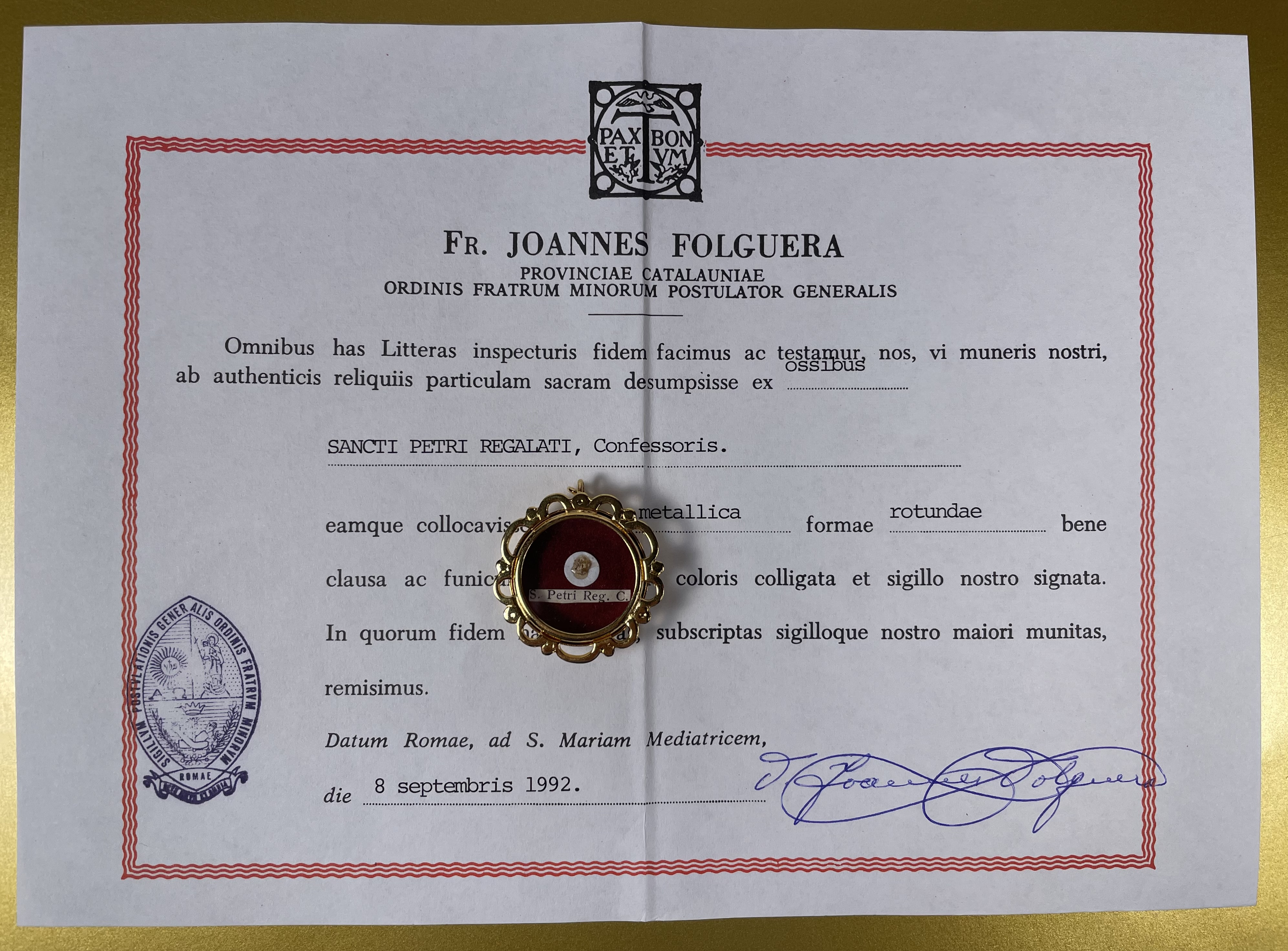 Saint Peter de Regalado (†1456) was a Spainish Franciscan (Friar Minor) and reformer who was known for his charity to the poor. Being of noble birth, in 1404, he became one of the first disciples of Pedro de Villacreces, who in 1397 had introduced into Spain the reform of the observance. In the newly founded convent at Aguilera, Peter found a life of solitude, prayer, and poverty. In 1415, he became superior of the convent at Aguilera where effected many important reforms in the discipline of its Spanish monasteries. In 1442, he was appointed head of all the Spanish Franciscans in his reform group. He. After his death on March 31, 1456, his grave became a place of pilgrimage. When his body was exhumed 36 years later, at the insistence of Isabella the Catholic, it was found incorrupt and placed in a more precious tomb. He was beatified by Pope Innocent XI on 11 March 1684, and canonized by Pope Benedict XIV on 29 June 1746. His feast is celebrated 13 May, the day of the translation of his body.