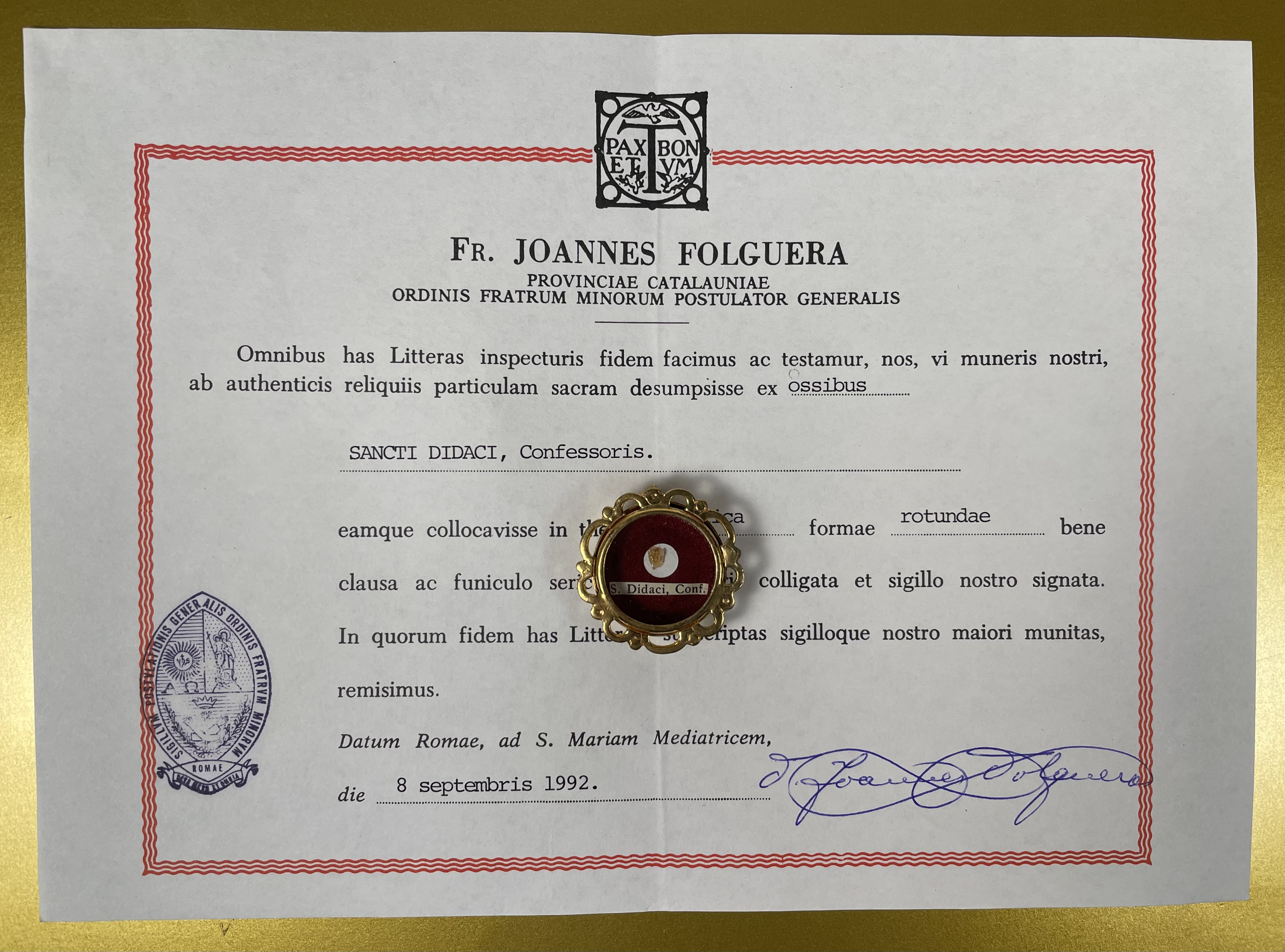 Saint Didacus of Alcalá O.F.M. (Spanish: Diego de Alcalá) († 1463), also known as Diego de San Nicolás, was a Spanish Franciscan lay brother who served as among the first group of missionaries to the newly conquered Canary Islands. In 1450, he went to Rome to share in the Jubilee Year proclaimed by Pope Nicholas V, and to be present at the canonization of Bernardine of Siena. In addition to the vast crowds of pilgrims arriving in Rome for Jubilee Year, thousands of friars had headed to Rome to take part in the celebration of one of the pillars of their Order. An epidemic broke out in the city. Didacus served as infirmarian and spent three months caring for the sick at the friary attached to the Basilica of Santa Maria in Ara Coeli, and his biographers record the miraculous cure of many whom he attended through his pious intercession. He was then recalled back to Spain and was sent by his superiors to the Friary of Santa María de Jesús in Alcalá, where he spent the remaining years of his life in penance, solitude, and the delights of contemplation. Didacus was canonized by Pope Sixtus V in 1588, the first of a lay brother of the Order of Friars Minor. He is a Holy Patron of the Roman Catholic Diocese of San Diego and Franciscan Lay Brothers. His feast day is celebrated on 13 November and on 7 November by the Franciscan Order in the United States and the Roman Catholic Diocese of San Diego.