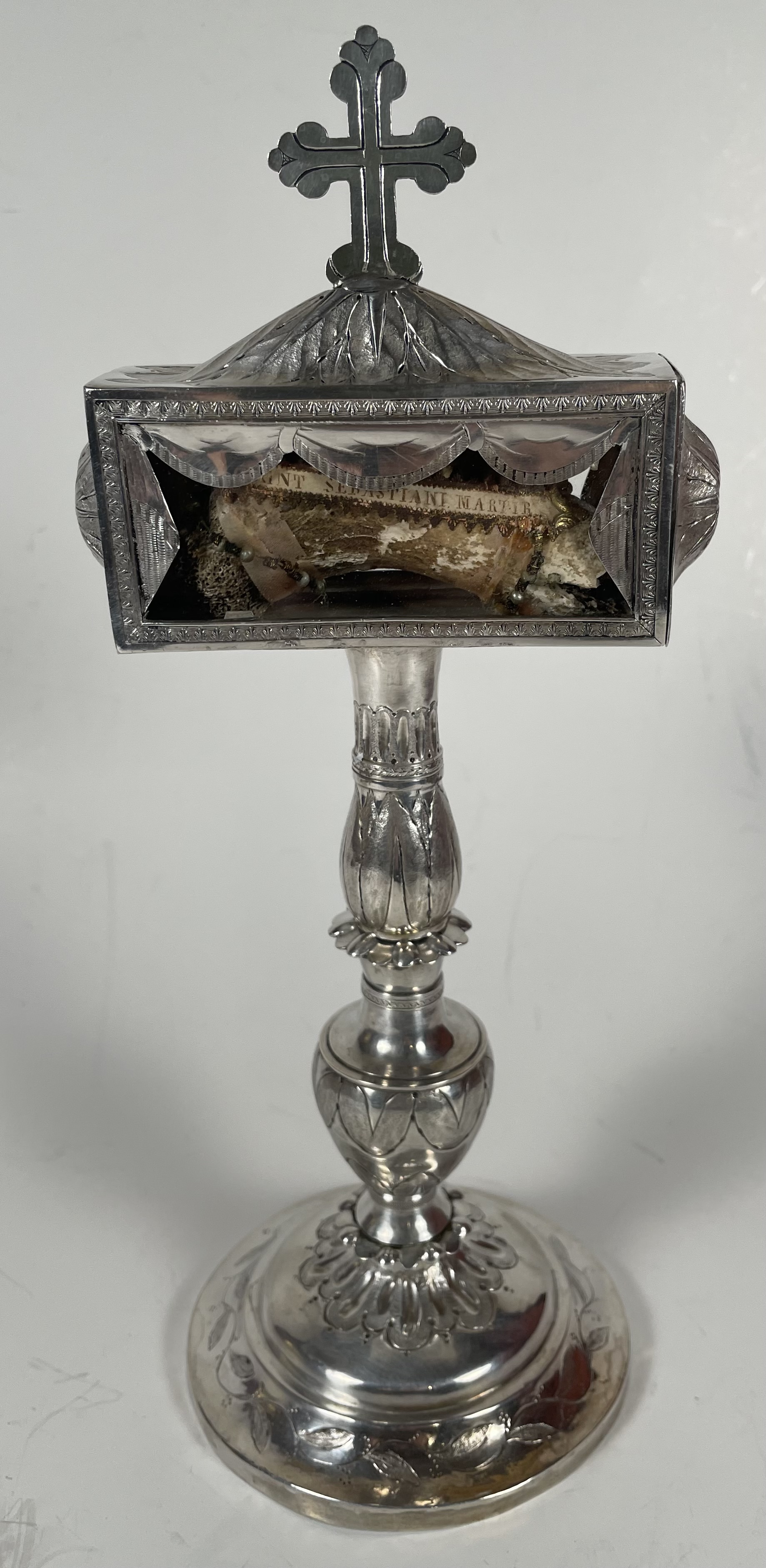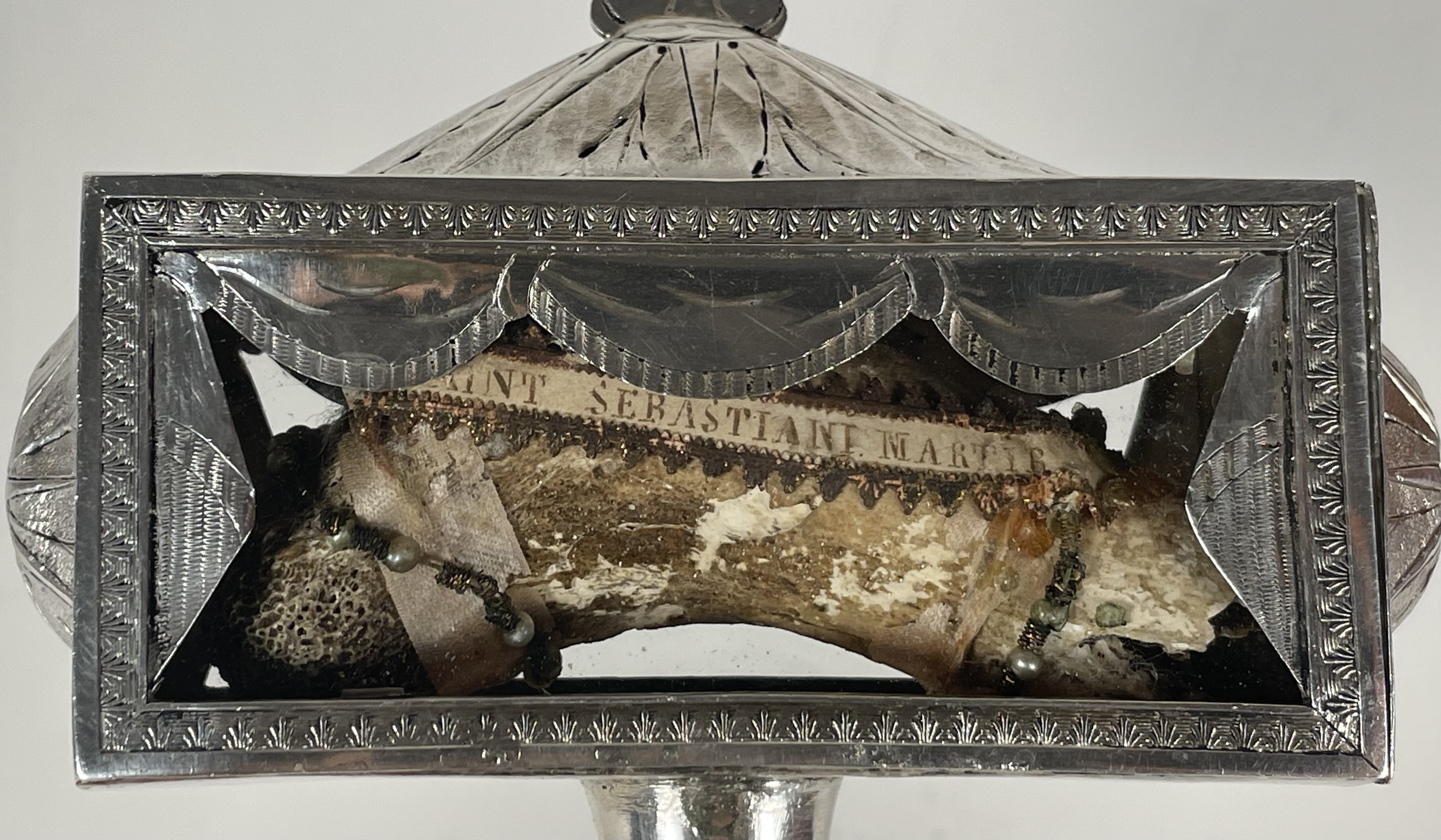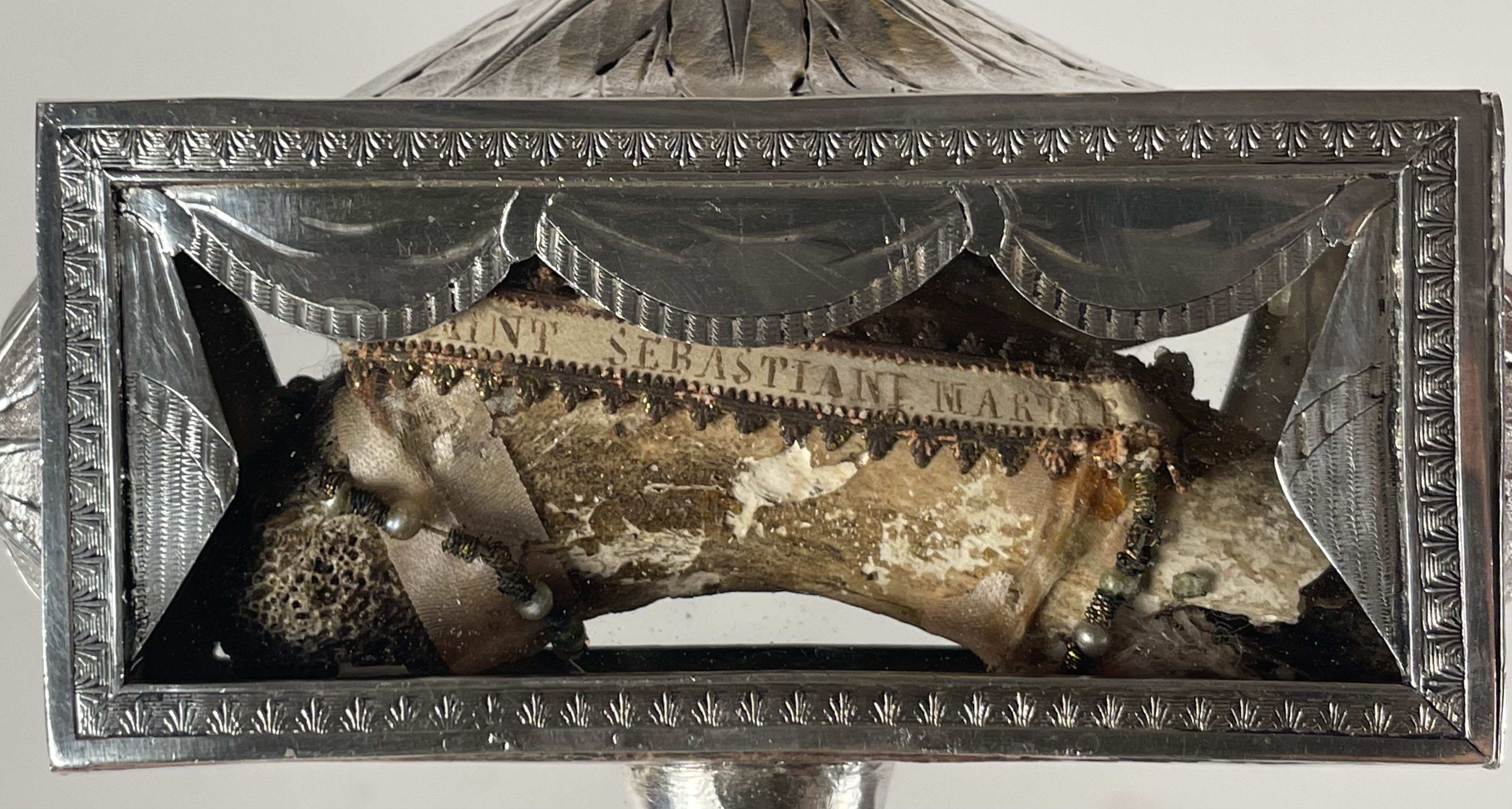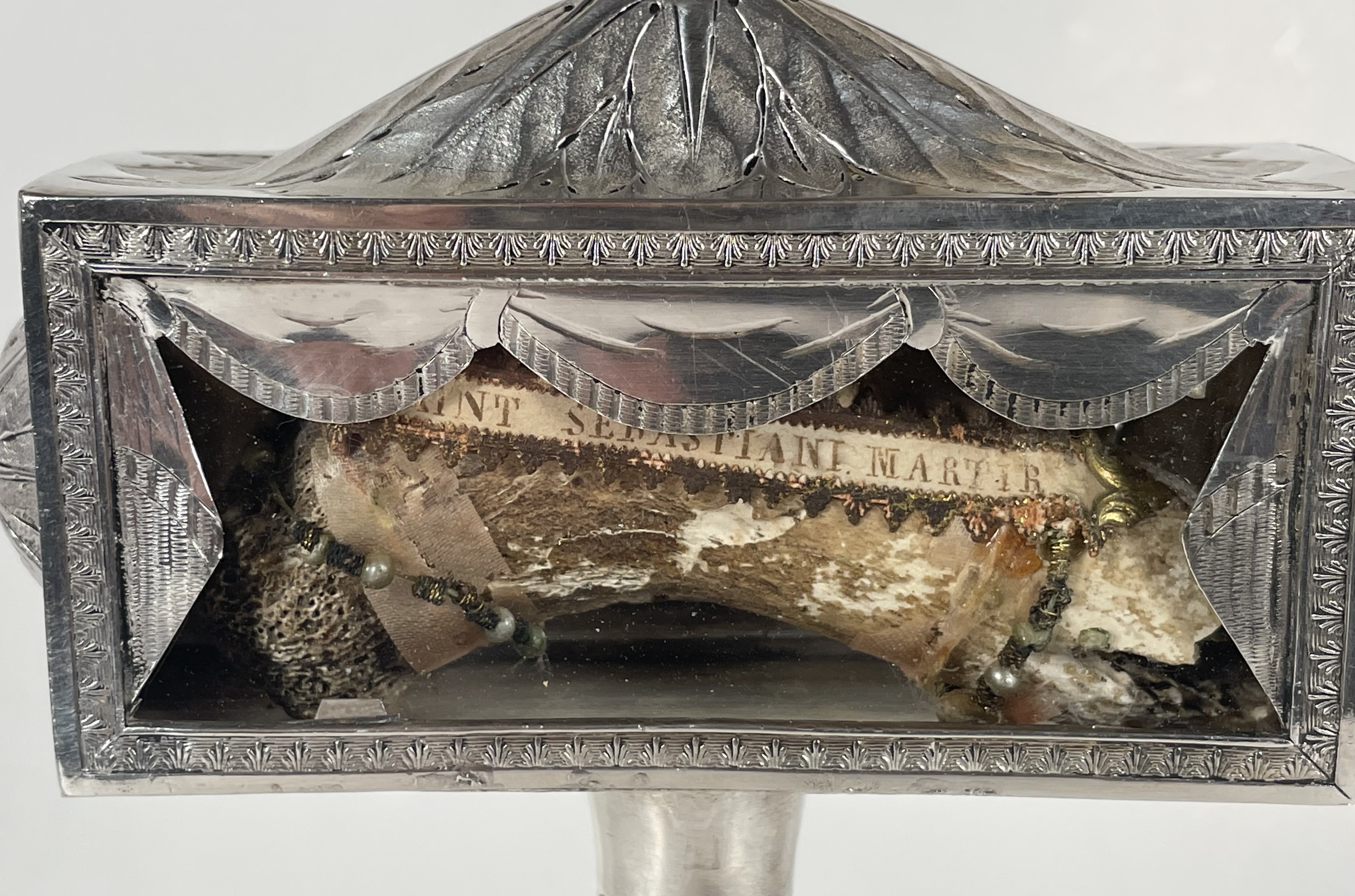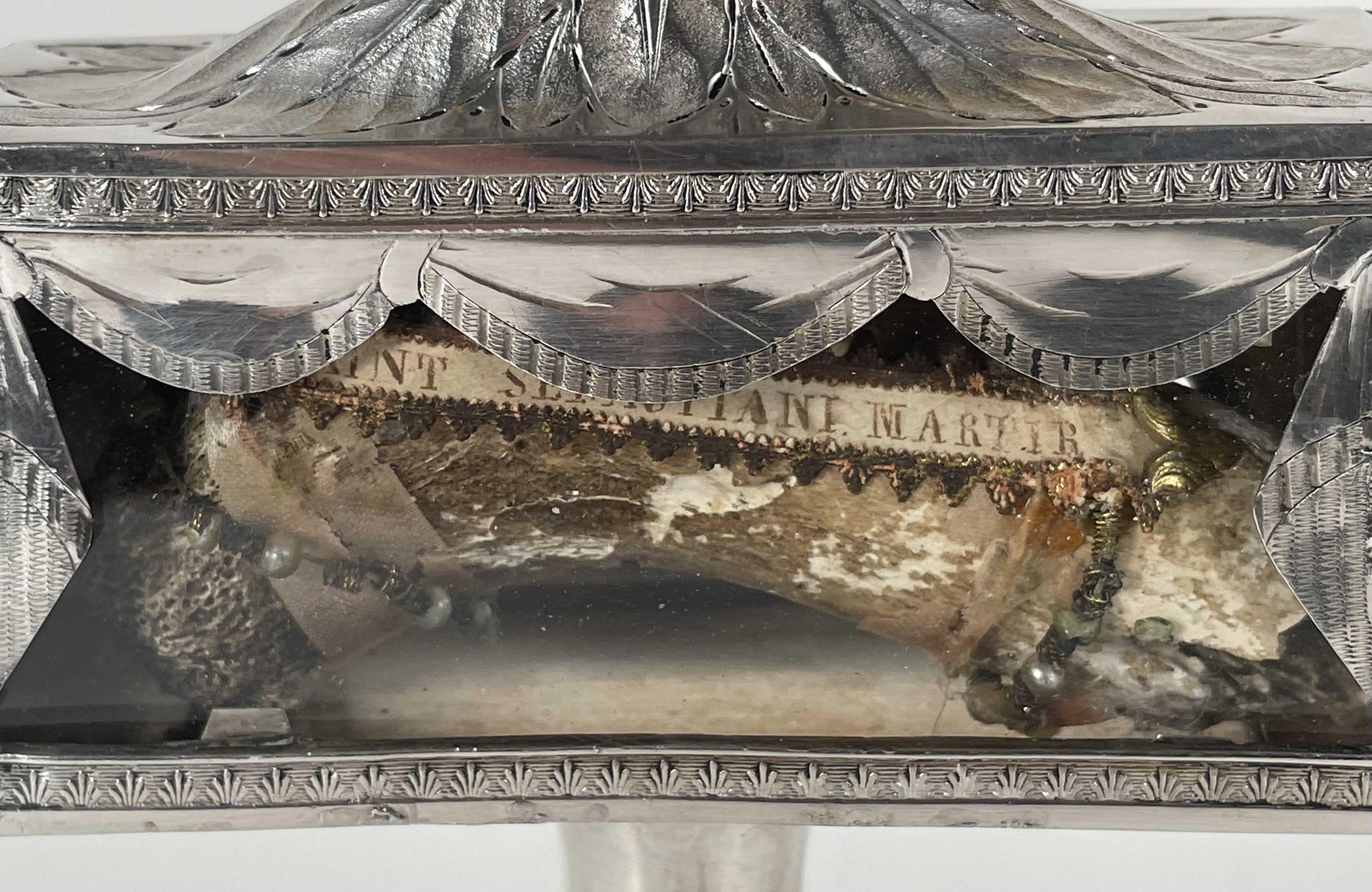 Spectacular silver reliquary monstrance housing the first-class ex ossibus (of the bone) relics of Saint Sebastian, Martyr. An extremely large precious relic measuring an incredible 8 cm (3 inches in length) is decorated by silver wire and pearls and affixed inside the reliquary monstrance and identified on a manuscript paper cedula label as S. Sebastiani Martir . On the back, the relic is certified by two perfectly preserved seals of red Spanish wax with a coat of arms of Monsignor Carlo Oppizzioni, Cardinal-Priest of San Bernardo alle Terme (1804) and the Archbishop of Bologna (1802 - 1831). The reliquary is hallmarked with French silver marks of Paris and Aude (Southern France) dating to the first third of the 19th century.