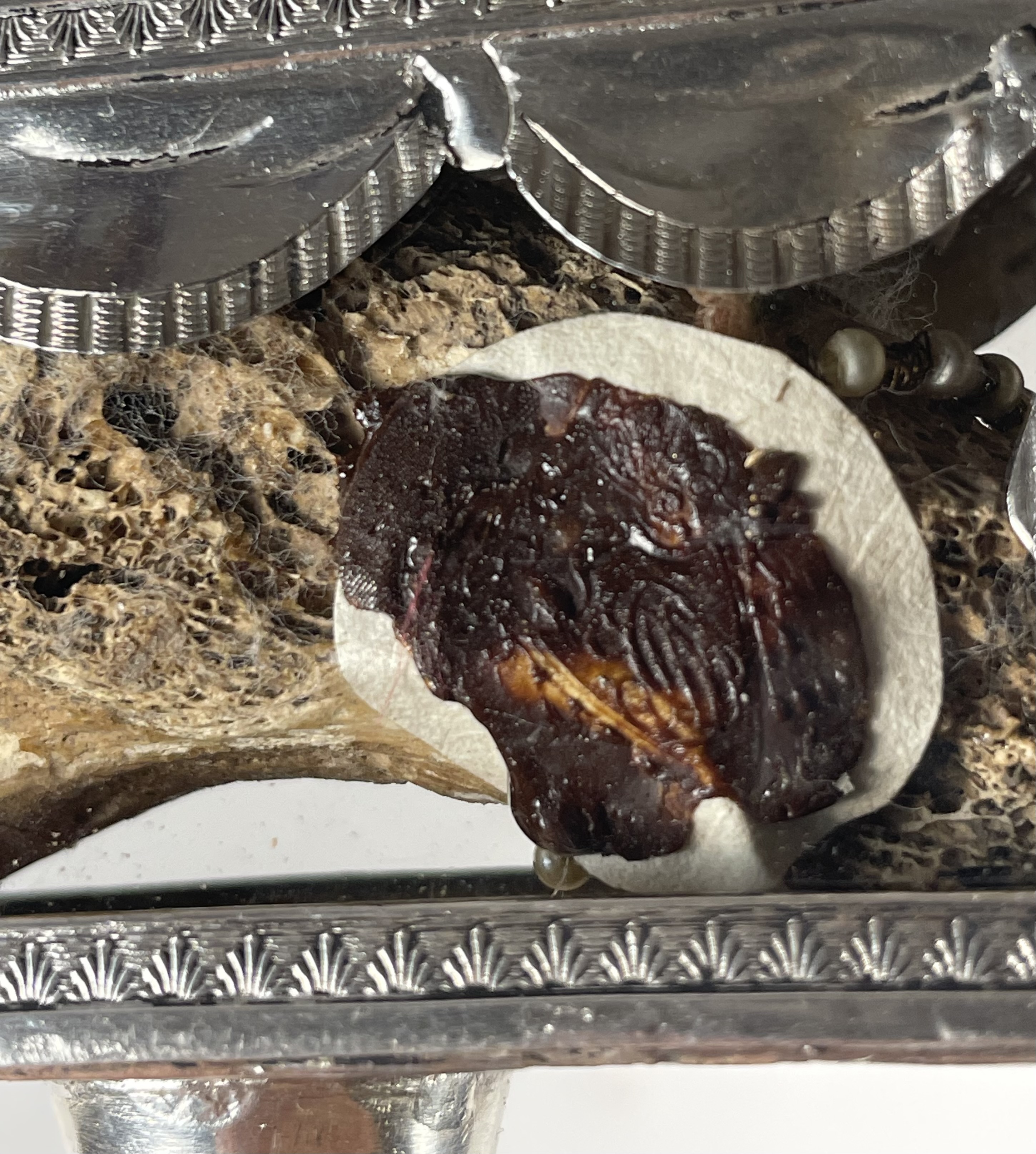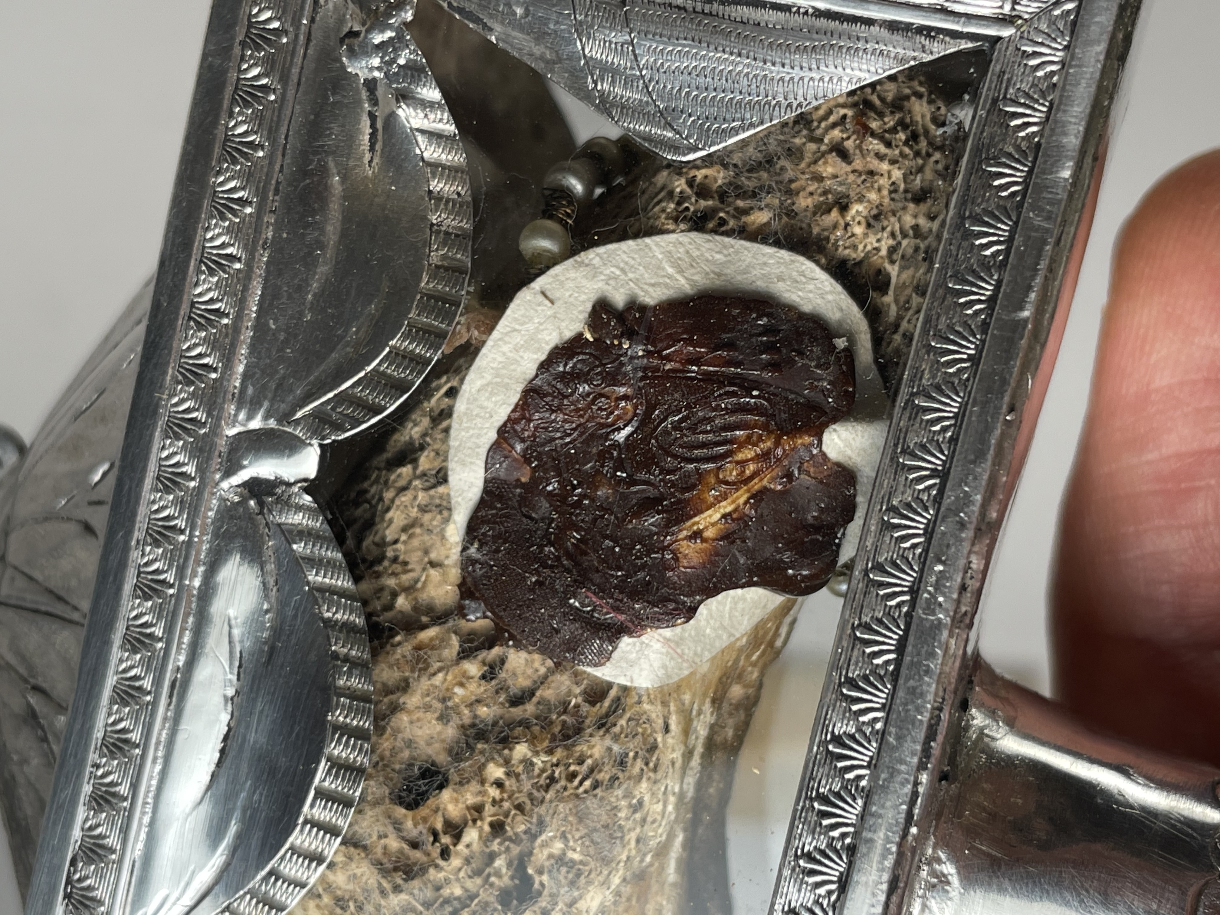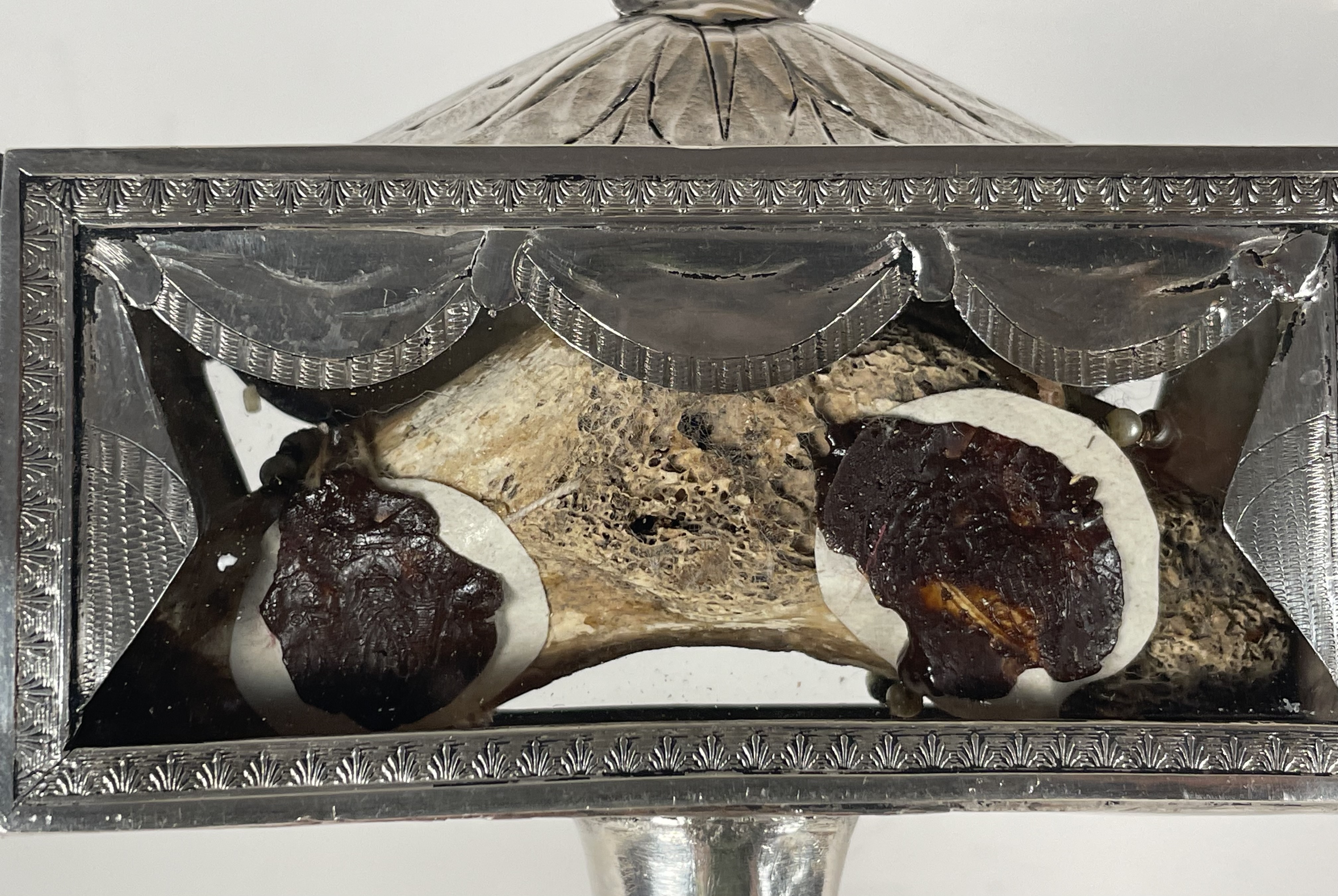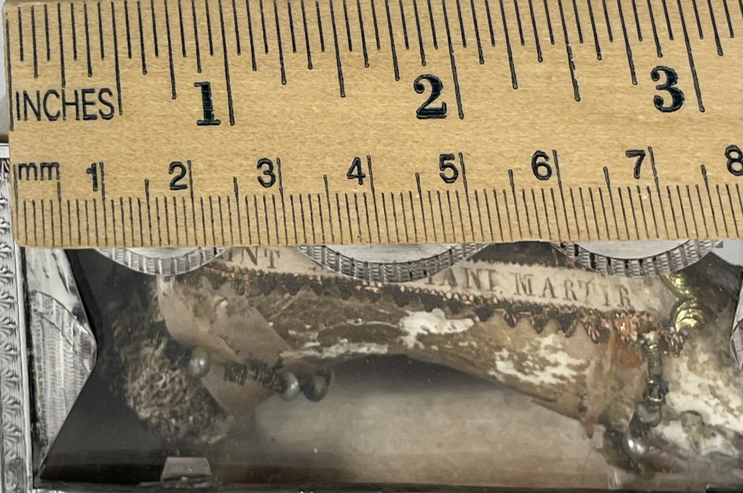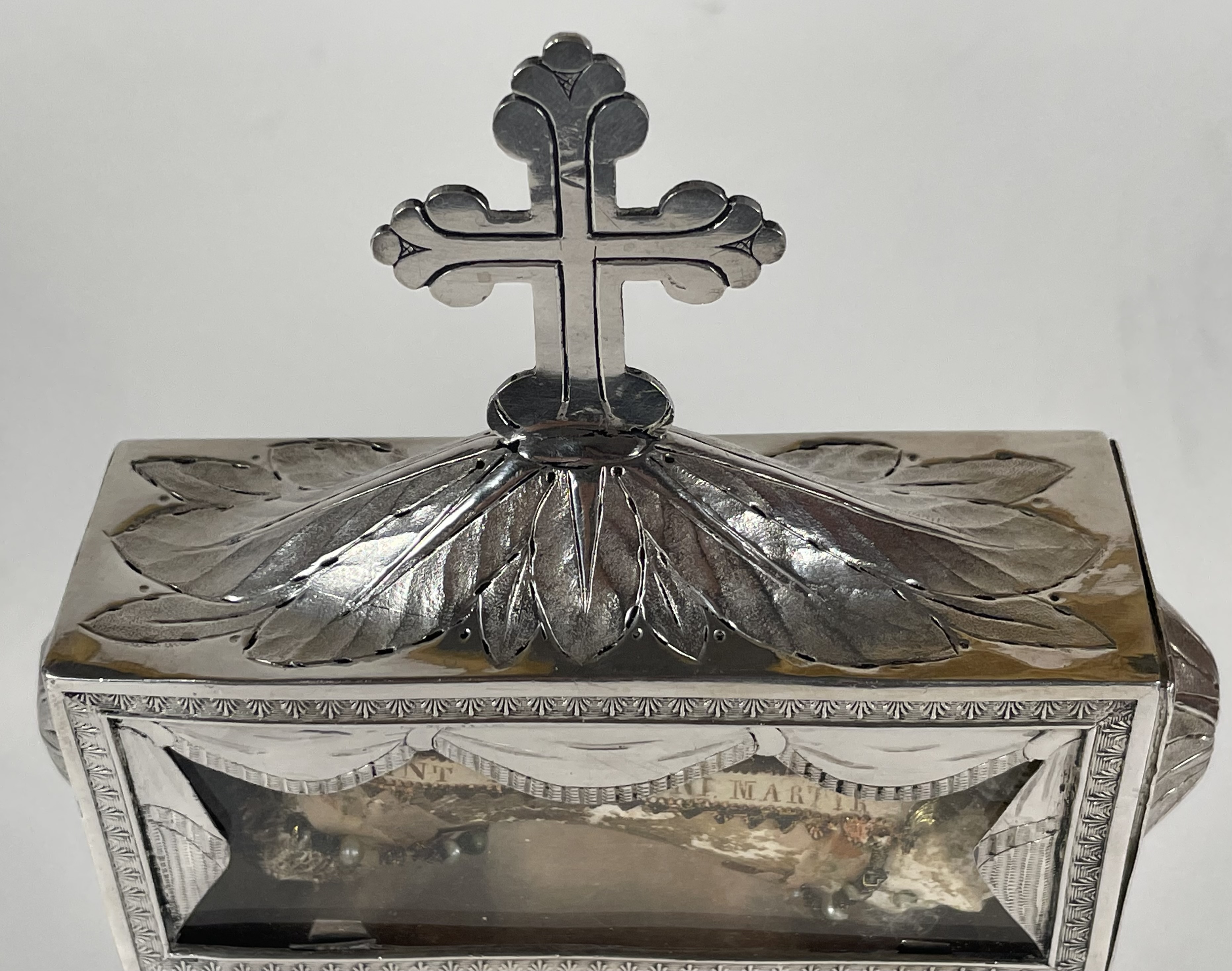 Spectacular silver reliquary monstrance housing the first-class ex ossibus (of the bone) relics of Saint Sebastian, Martyr. An extremely large precious relic measuring an incredible 8 cm (3 inches in length) is decorated by silver wire and pearls and affixed inside the reliquary monstrance and identified on a manuscript paper cedula label as S. Sebastiani Martir . On the back, the relic is certified by two perfectly preserved seals of red Spanish wax with a coat of arms of Monsignor Carlo Oppizzioni, Cardinal-Priest of San Bernardo alle Terme (1804) and the Archbishop of Bologna (1802 - 1831). The reliquary is hallmarked with French silver marks of Paris and Aude (Southern France) dating to the first third of the 19th century.