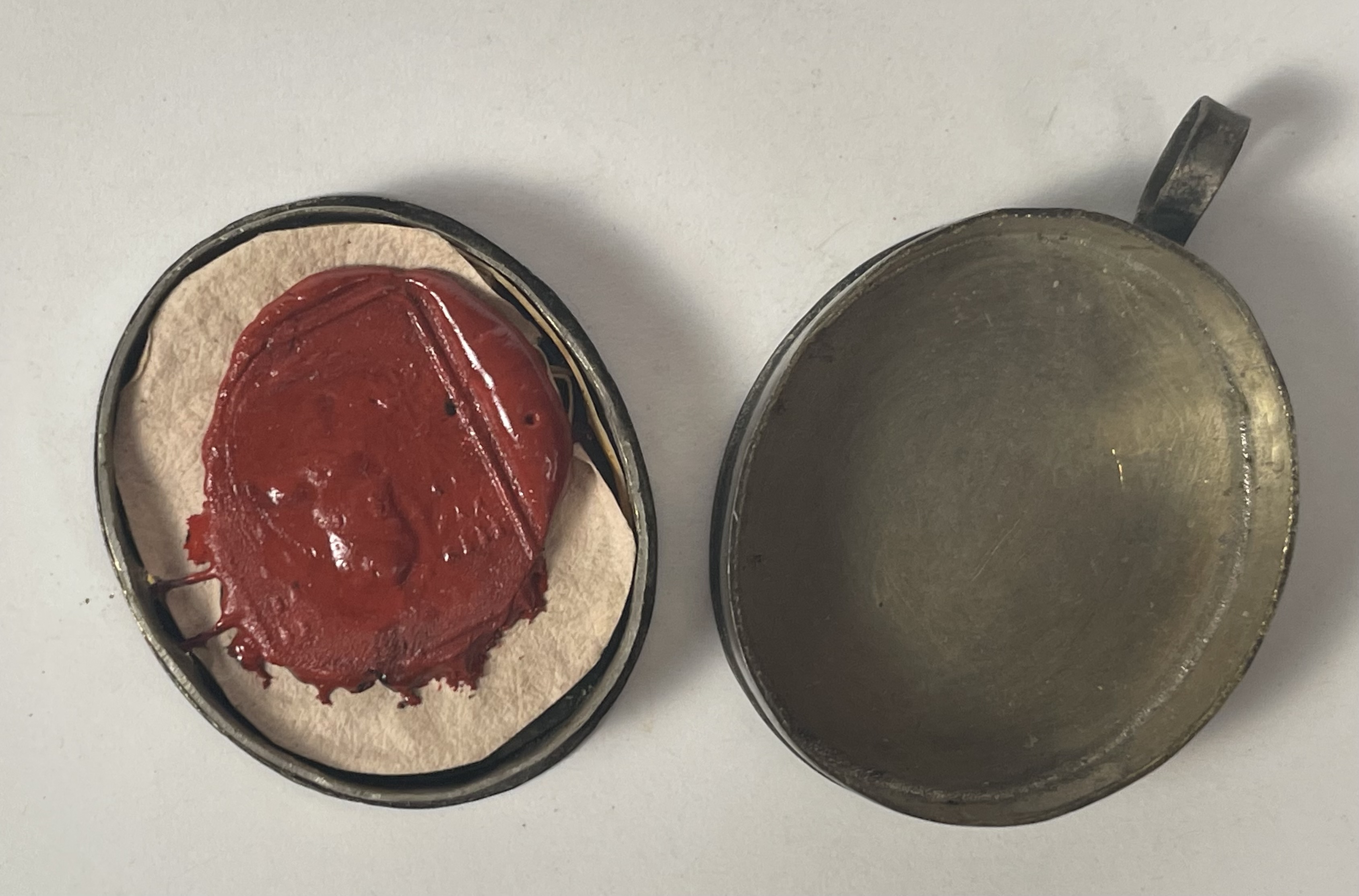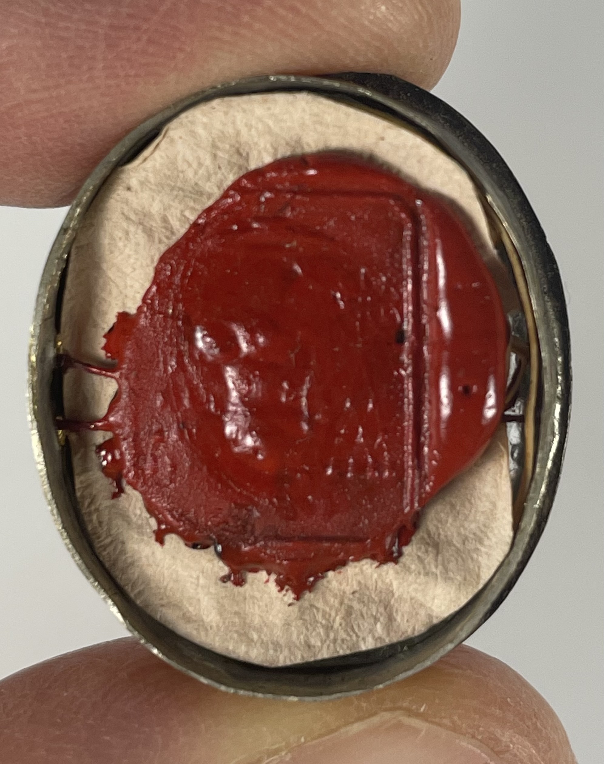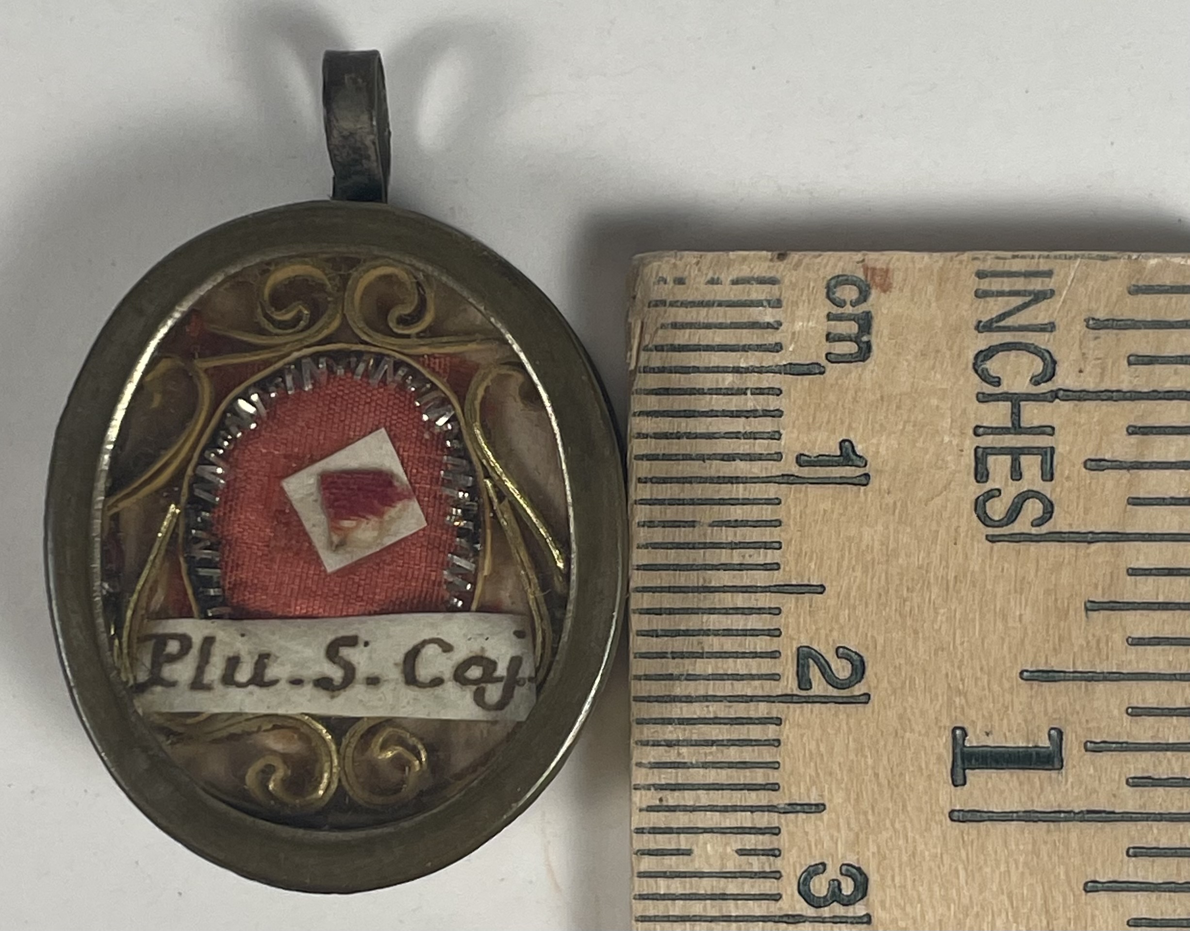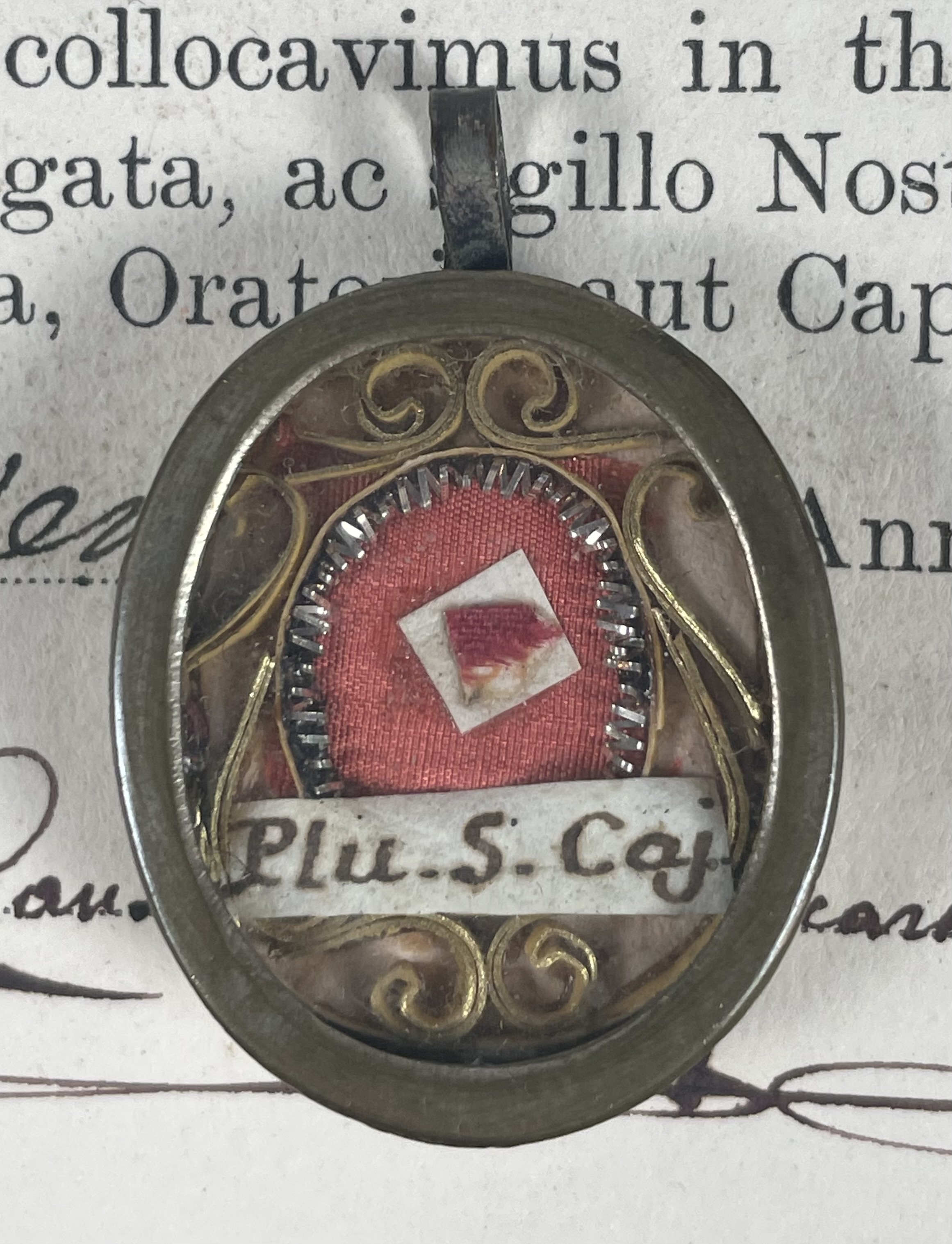Oval glass-fronted silvered brass reliquary theca housing the second-class ex pluviali  (of a cape) relic of Saint Gaetano dei Conti di Thiene. The relic is affixed to a red silk ground surrounded by gilt paperolle and silver wire ornamentation and identified in Latin on a manuscript cedula label as Plu.S. Caj.  (of a cape of Saint Gaetano).  On the back, under a protective cap, the theca is secured with a seal of red Spanish wax bearing an imprint of a coat of arms of Father Guido Maria Conforti (†1931), Bishop of Parma, Italy (1907-1831), who himself was canonized in 2011. The relic is accompanied by the original matching authentics document issued and sealed by Bishop Conforti in 1910.