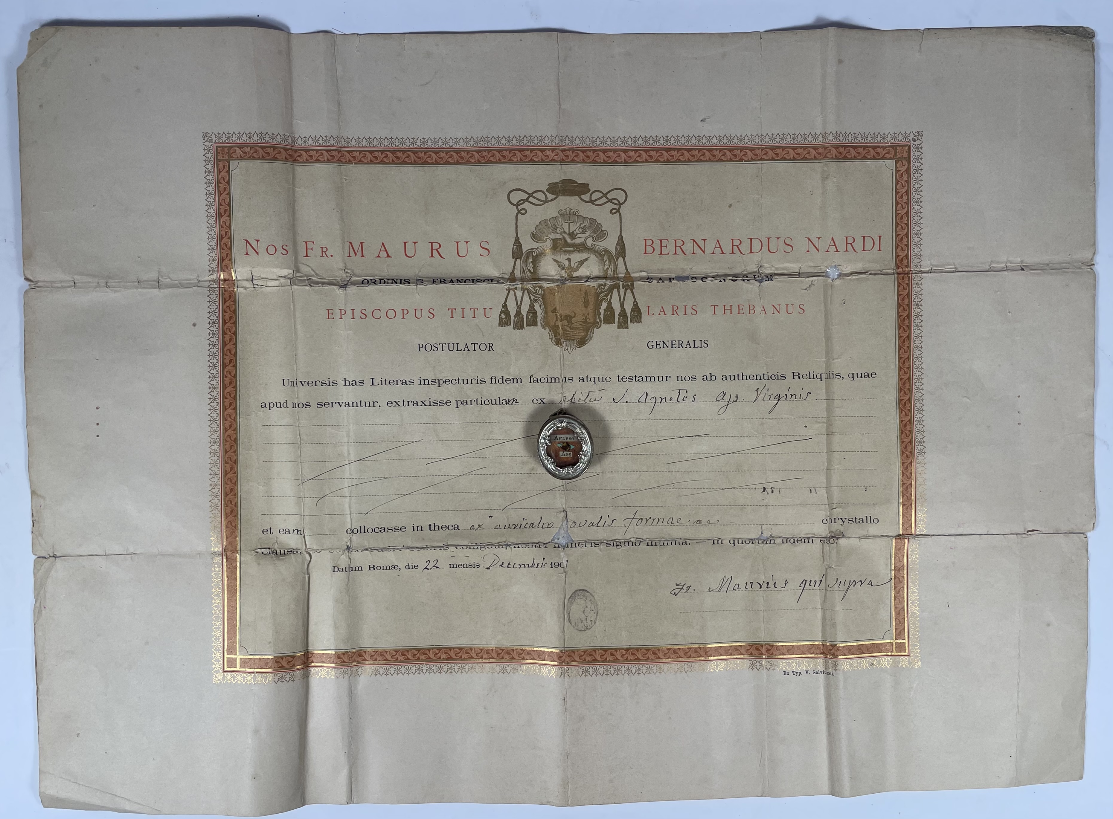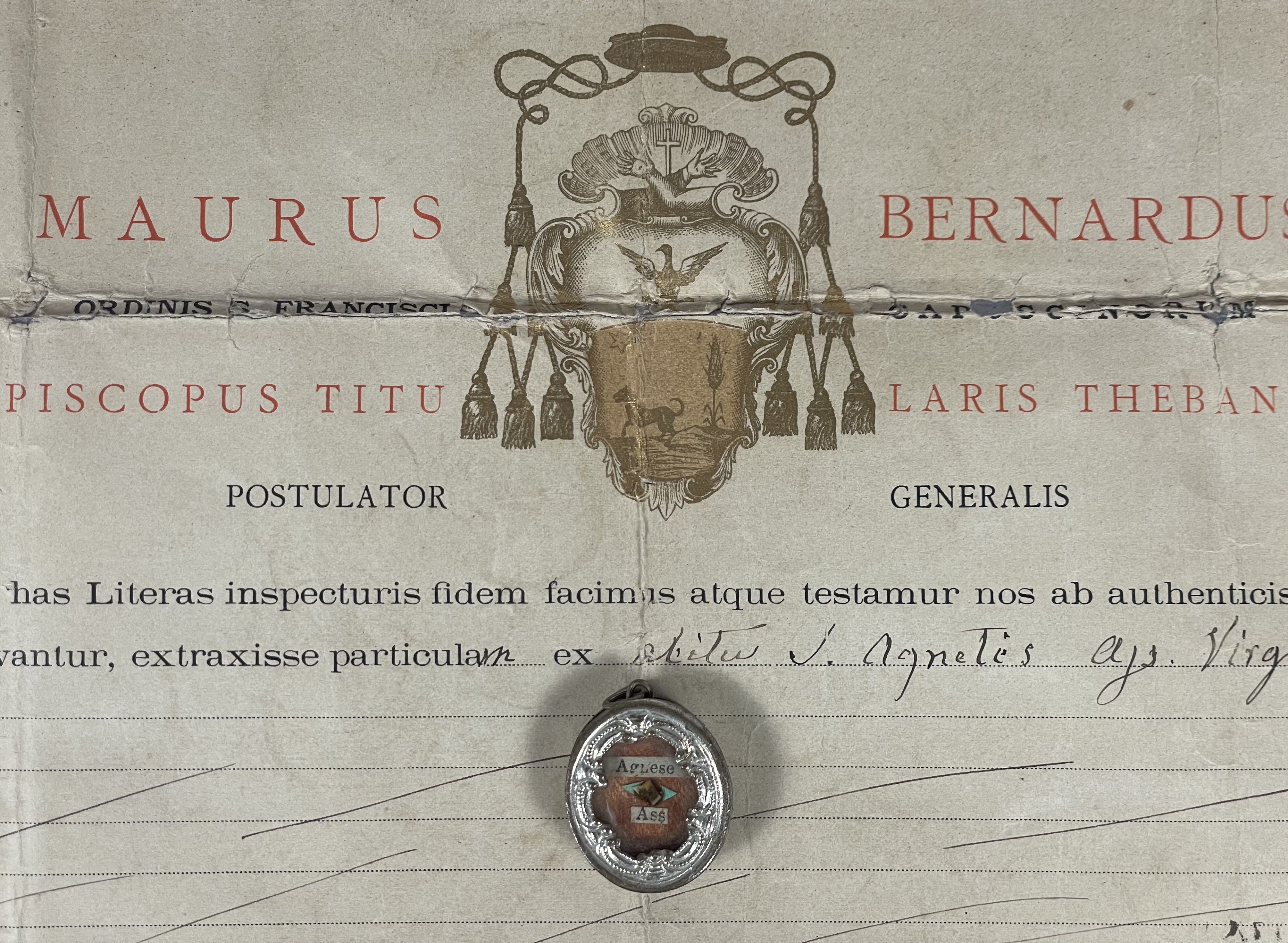 Saint Agnes of Assisi (†1253) was a younger sister of St. Clare of Assisi and one of the first abbesses of the Order of Poor Ladies (now the Poor Clares). Her eldest sister Clare, inspired by the example of Francis of Assisi, left their father's home in secret to become a follower of Francis. Sixteen days later, Agnes ran off to the Church of St. Angelo di Panzo where Francis had brought her sister, resolved to share Clare's life of poverty and penance. Angry at the loss of two of his daughters, their father sent his brother Monaldo and several relatives and armed followers to the monastery to force Agnes, if persuasion failed, to return home. They dragged Agnes out of the monastery by her hair, striking and kicking her repeatedly. Agnes' body reportedly became so heavy that her assailants dropped her in a field nearby. Agnes' relatives, purportedly realizing that something divine protected her, allowed the sisters to remain together. Francis himself cut her hair and gave her the religious habit, in recognition of Agnes' dedication. Francis later established a cloister for Clare and Agnes at the rural chapel of San Damiano, where they were soon joined by other noblewomen of the city, and the Order of Poor Ladies, later known as the Poor Clares, began, with Clare as its abbess. In 1221, a group of Benedictine nuns in Monticelli near Florence asked to become Poor Ladies. Agnes was chosen to lead the new community. She later went on to establish other communities of the order, including those of Mantua, Venice, and Padua. Agnes was said to be very virtuous, and as abbess she ruled with a benevolent kindness, knowing how to make the practice of virtue appealing to her sisters. She was canonized in 1753, the year of her 500th anniversary and her feast day is celebrated on 16 November.