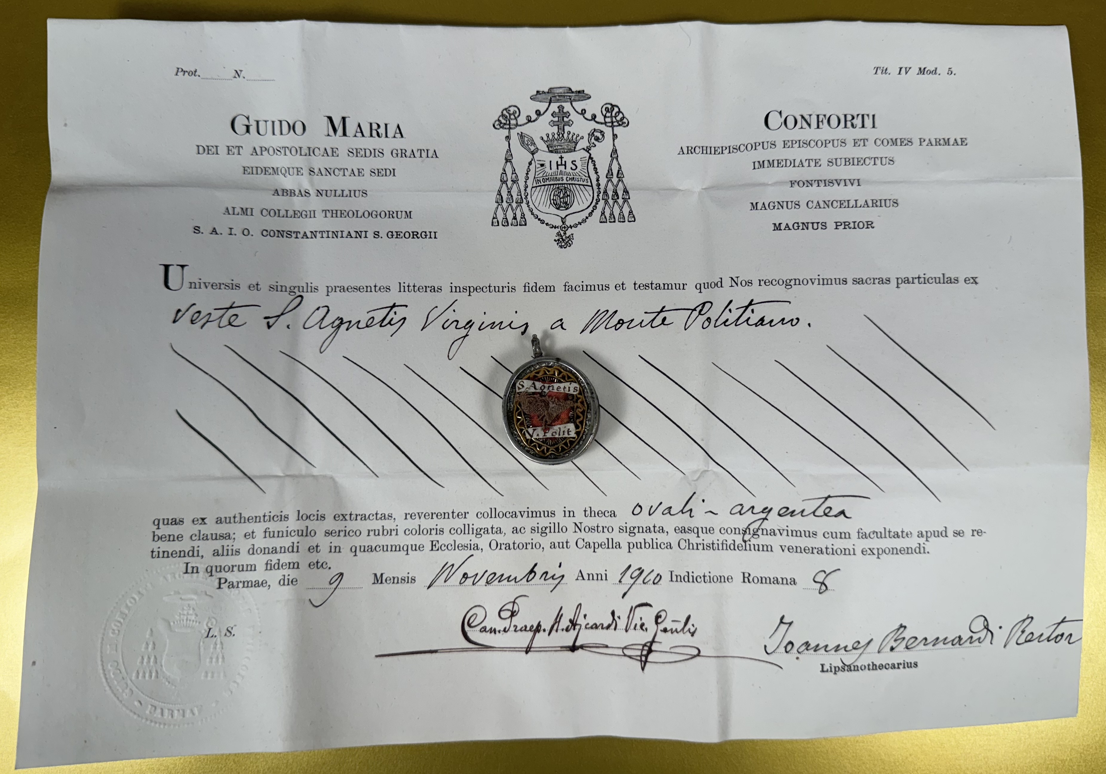 Saint Agnes of Montepulciano (†1317)was a Dominican prioress in medieval Tuscany, who was known as a miracle worker during her lifetime and is honored as a saint by the Catholic Church. In 1288 Agnes, despite her youth at only 20 years of age, was noted for her devotion to the Blessed Sacrament and deep life of prayer, and was elected as the prioress of the community there she gained a reputation for performing miracles; people suffering from mental and physical ailments seemed cured by her presence. She was reported to have "multiplied loaves", creating many from a few on numerous occasions, recalling the Gospel miracle of the loaves and fishes. In 1306, Agnes was recalled to head the monastery in Montepulciano. Agnes reached a high degree of contemplative prayer and is said to have been favored with many visions. After her return, she proceeded to build a church, Santa Maria Novella in Florence, to honor the Blessed Mother, as she felt she had been commanded to do in a mystical vision several years earlier. She also had a vision of Dominic Guzman, under the inspiration of which she led the nuns of her monastery to embrace the Rule of St. Augustine as members of the Dominican Order. When Agnes died at the age of 49, The Dominican friars attempted to obtain balsam to embalm her body. It was found, however, to be producing a sweet odor on its own, and her limbs remained supple. When her body was moved years after her death to the monastery church, it was found to be incorrupt. Her tomb became the site of pilgrimages. Agnes was canonized by Pope Benedict XIII in 1726. Her feast day is celebrated within the Dominican Order on 20 April.