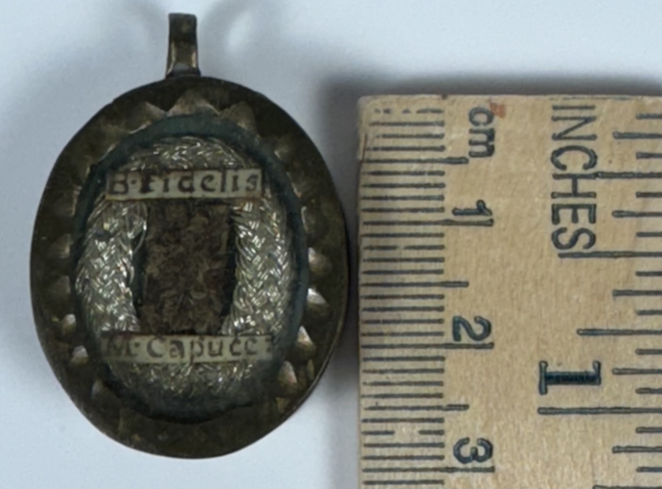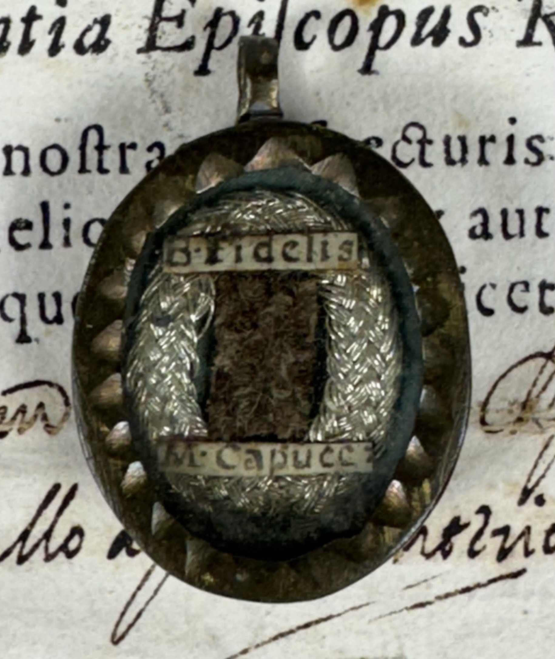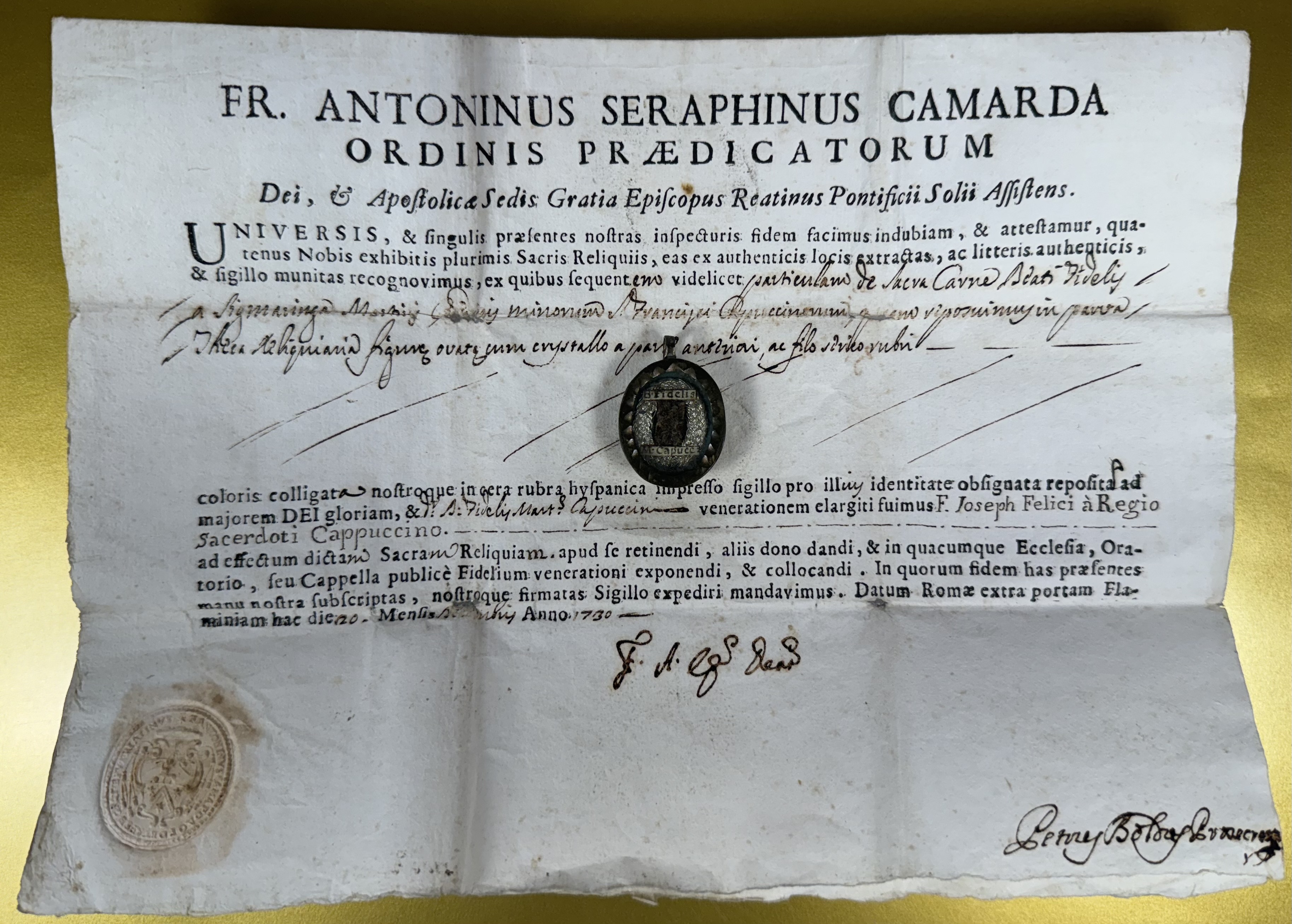 Oval glass-fronted brass pendant reliquary theca housing the first-class ex carne (of the flesh) pre-canonization relic of Saint Fidelis of Sigmaringen. A substantial relic is affixed to the center of the theca surrounded by silver wire ornamentation and identified in Latin on a typeset cedula label as B. Fidelis // M. Capucc: (the Blessed Fidelis, Martyr & Capuccin). On the back, under a protective cap, the theca is secured with a seal of red Spanish wax bearing an imprint of a coat of arms of Father Antonino Serafino Camarda O.P. (†1754), Bishop of Rieti, Italy (1724-1754). The relic is accompanied by the original matching authentics document issued and sealed by the order of Monsignor de Vignoli in 1730.