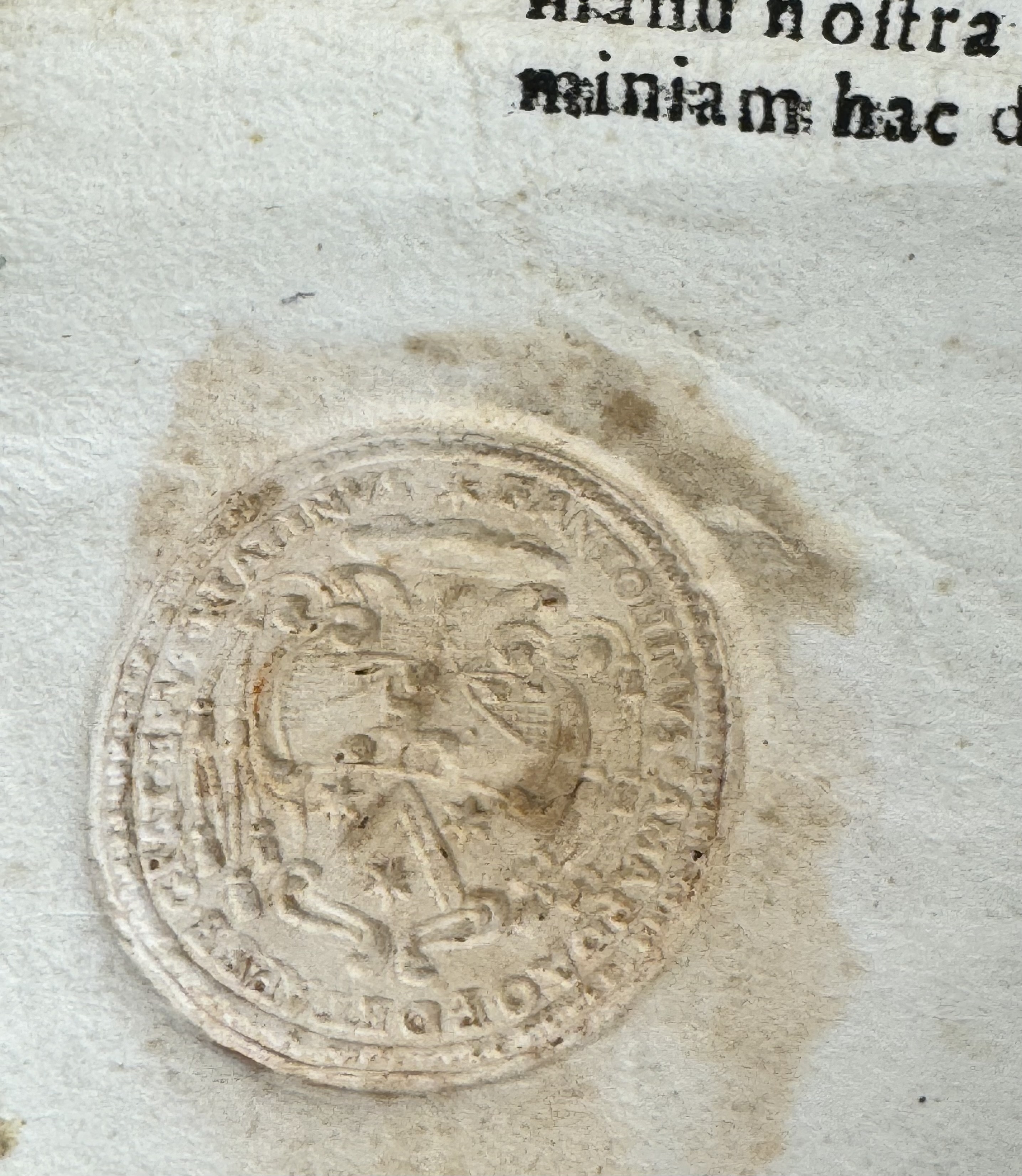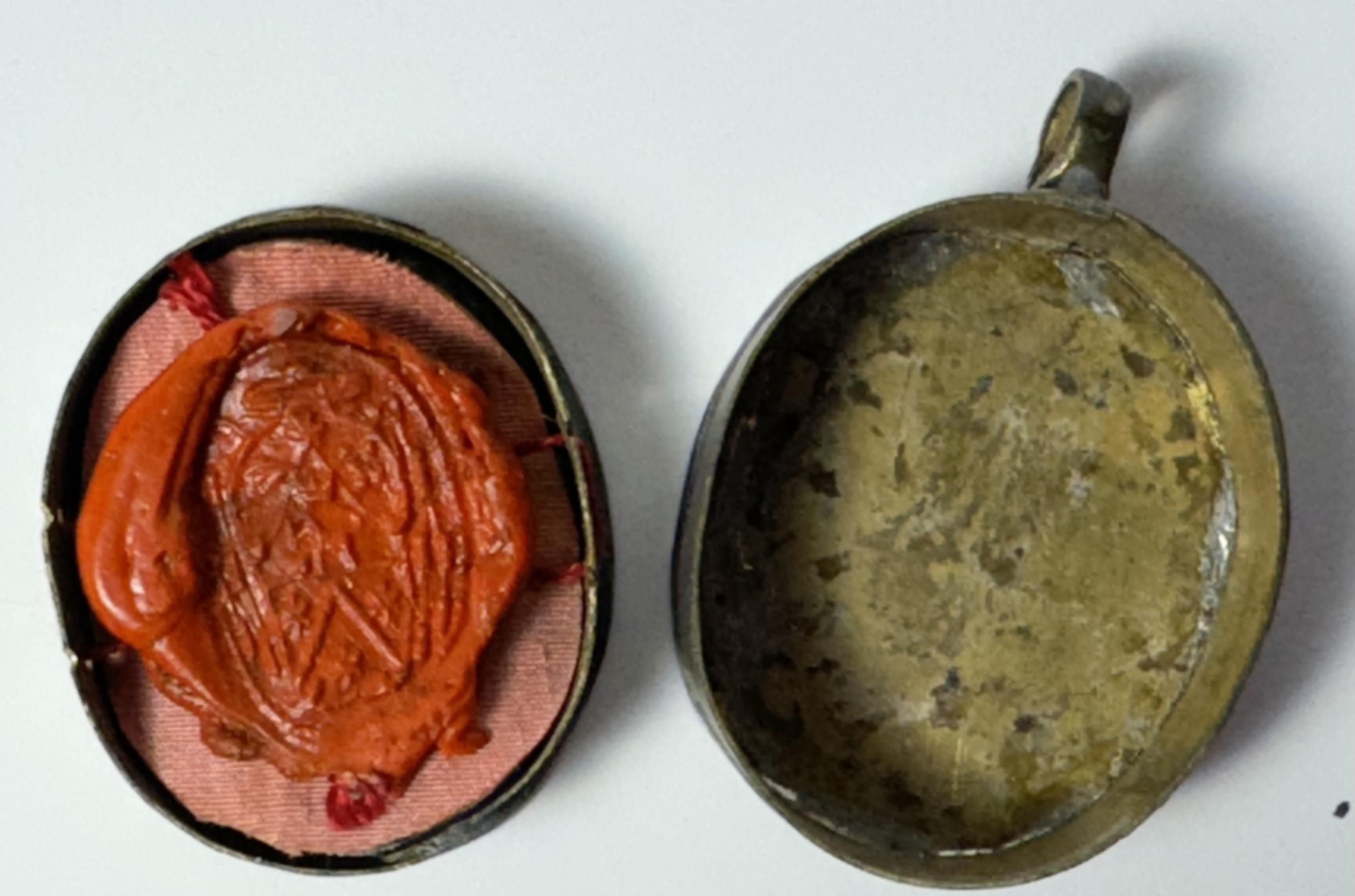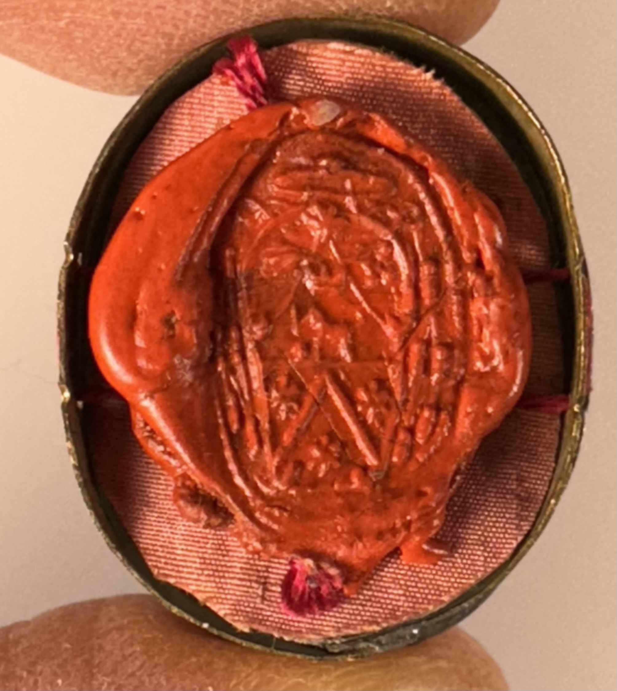 Oval glass-fronted brass pendant reliquary theca housing the first-class ex carne (of the flesh) pre-canonization relic of Saint Fidelis of Sigmaringen. A substantial relic is affixed to the center of the theca surrounded by silver wire ornamentation and identified in Latin on a typeset cedula label as B. Fidelis // M. Capucc: (the Blessed Fidelis, Martyr & Capuccin). On the back, under a protective cap, the theca is secured with a seal of red Spanish wax bearing an imprint of a coat of arms of Father Antonino Serafino Camarda O.P. (†1754), Bishop of Rieti, Italy (1724-1754). The relic is accompanied by the original matching authentics document issued and sealed by the order of Monsignor de Vignoli in 1730.