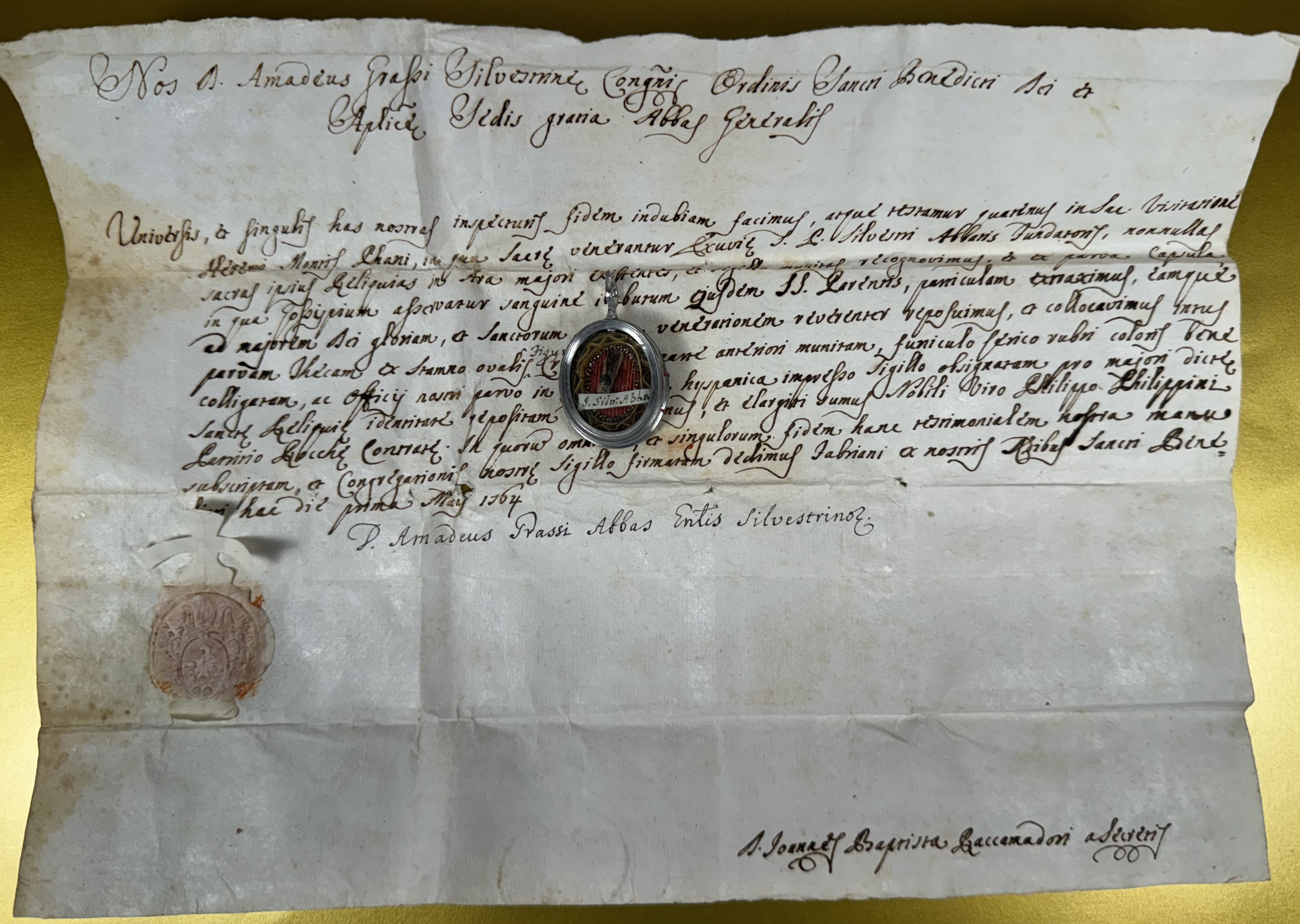 Saint Silvestro Guzzolini (†1267) was an Italian Catholic priest and the founder of the Silvestrine Order. He served as a canon in Osimo but respectful rebukes of his bishop's inappropriate conduct led him to leave for a hermitage before the bishop could strip him of his position. He remained in his hermitage with a determination to found a religious congregation and based it upon the Order of Saint Benedict after having a dream of Benedict of Nursia. His order received papal approval from Pope Innocent IV which allowed his order to expand across Italian cities to a significant degree. His beatification was confirmed in the 1260s after his death in 1267, and he was later canonized in 1598 as a saint.