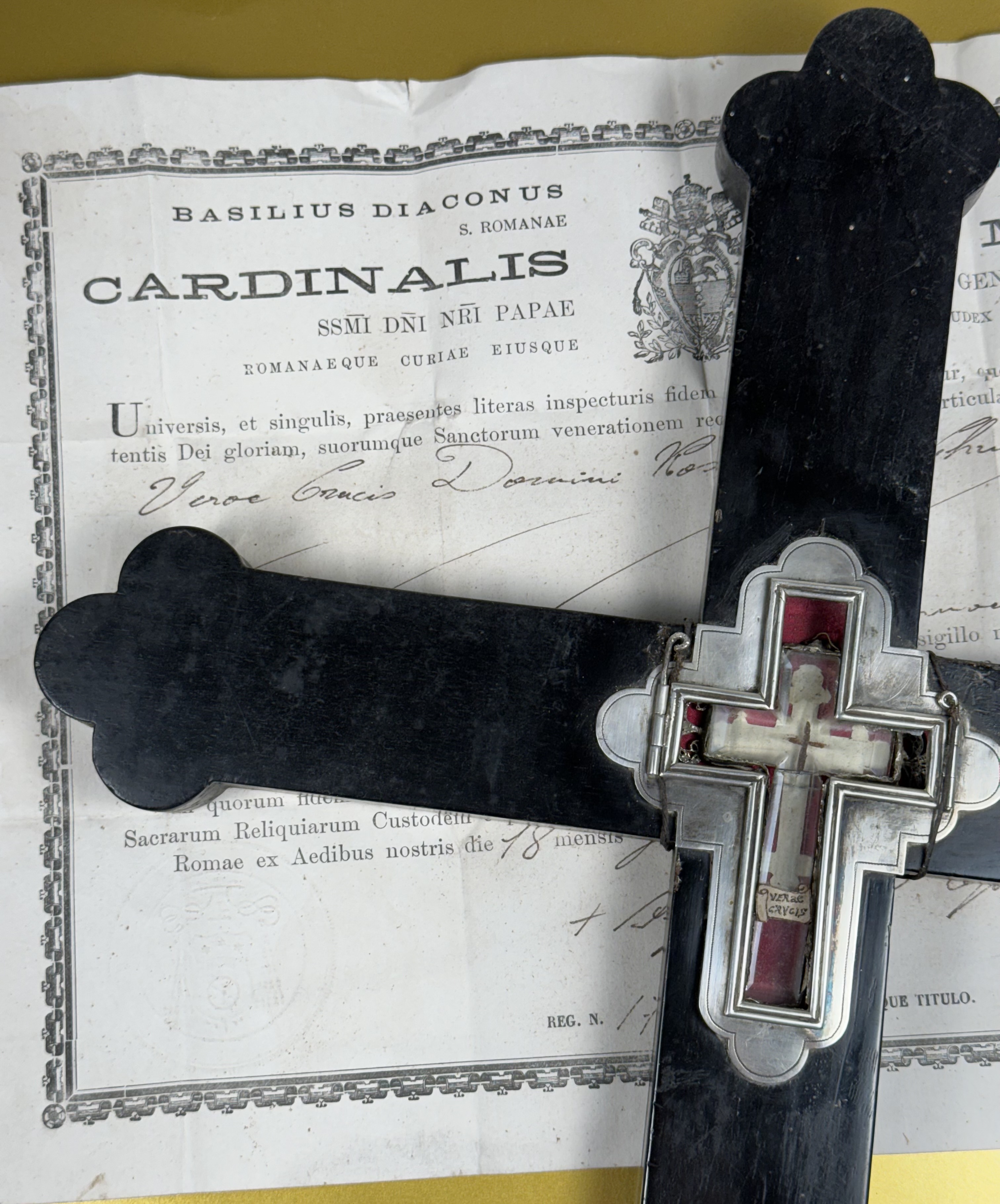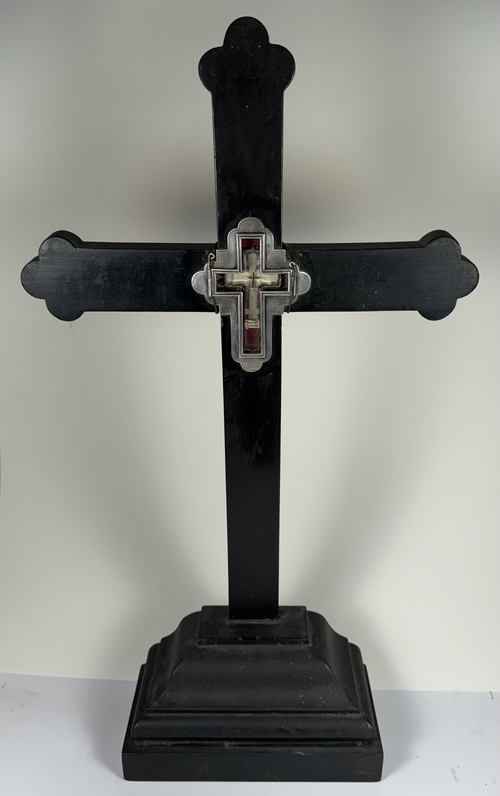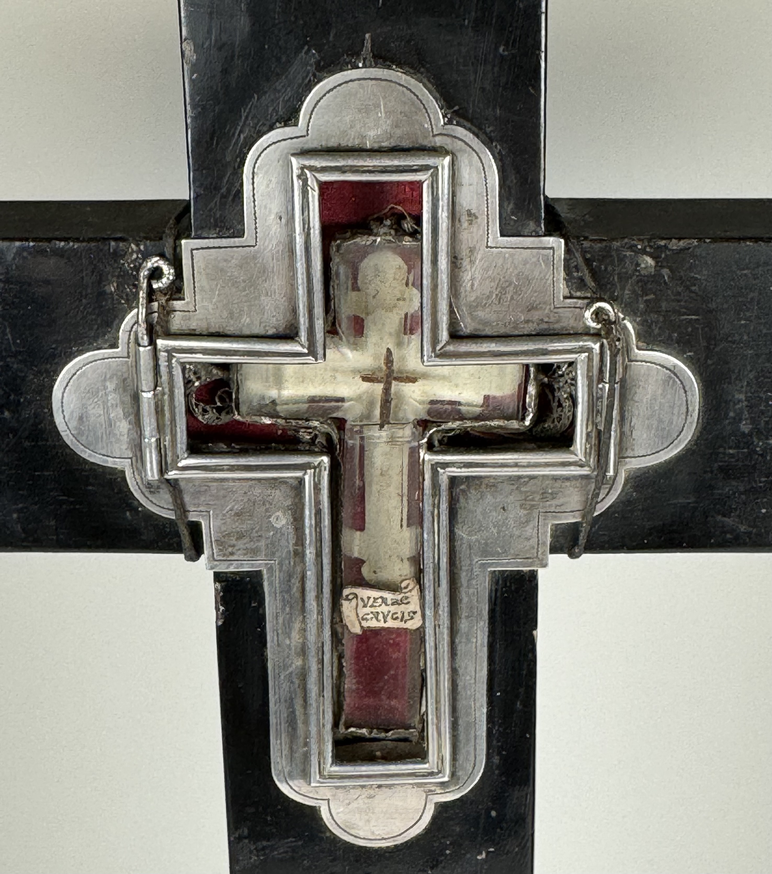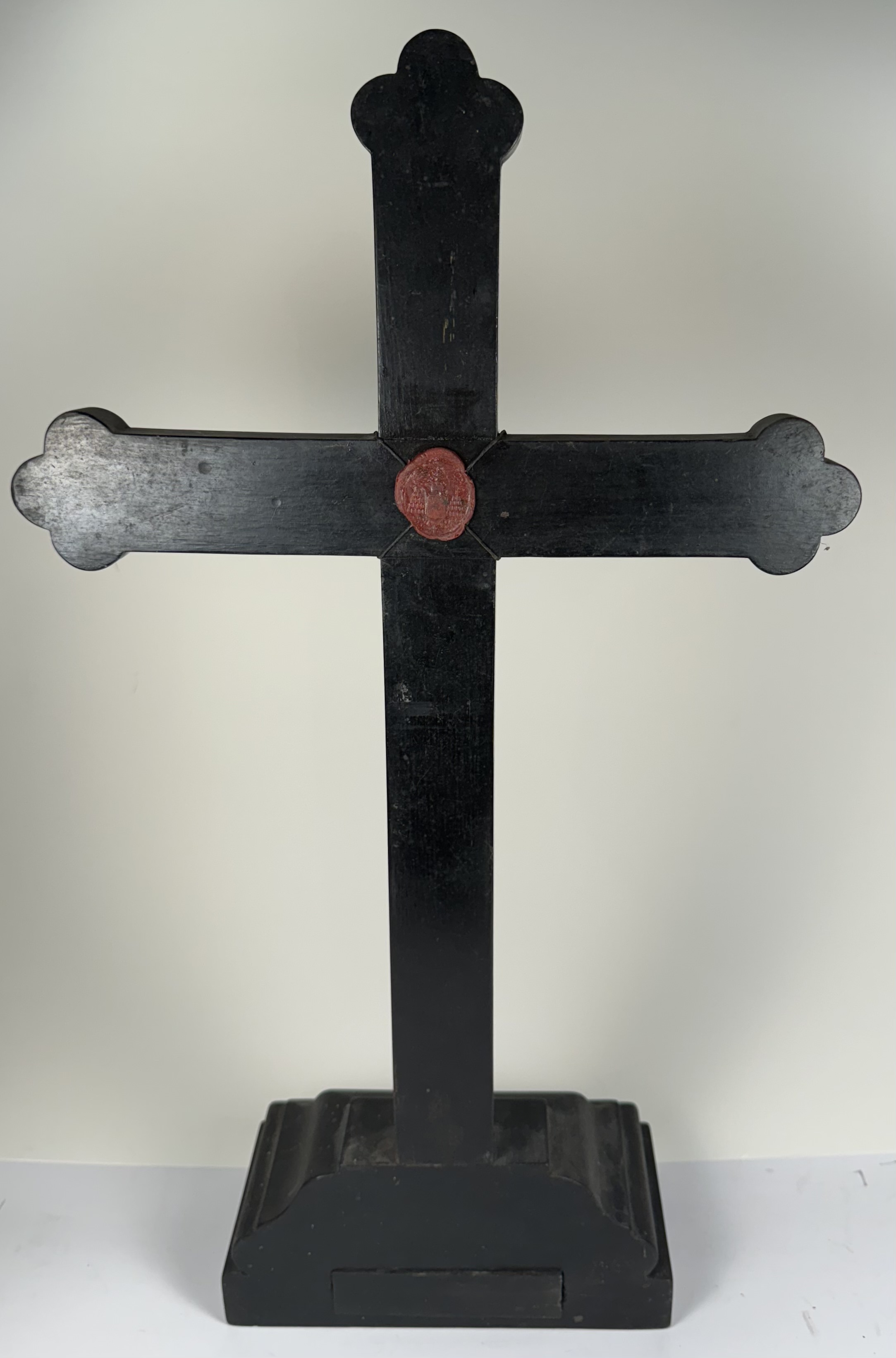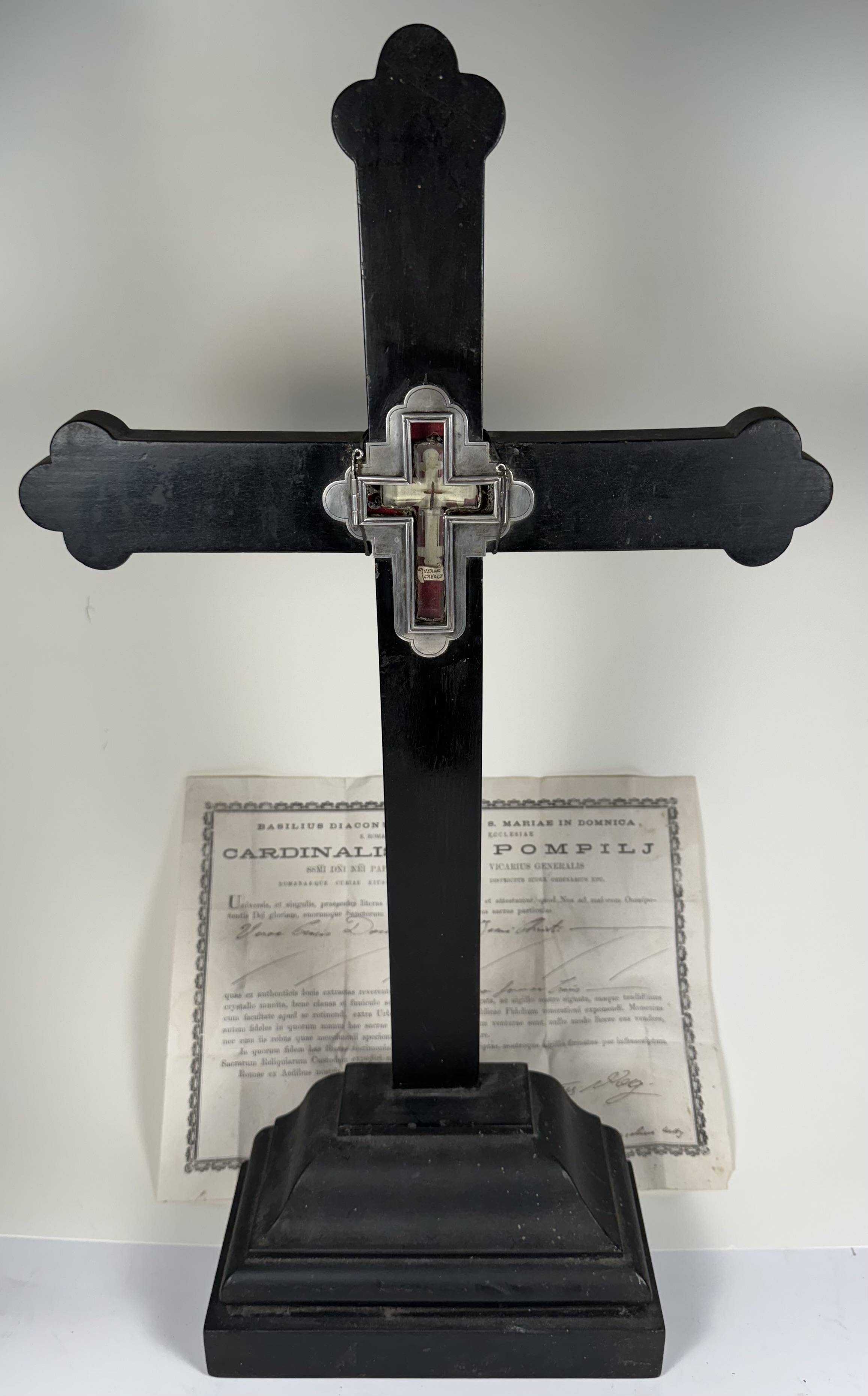 Large French cruciform reliquary monstrance made of lacquered wood with a solid silver center cavity's framing housing a theca with particles from the wood from the True Cross of Jesus ChristThe relics are displayed inside of a double-crystal theca placed in the center of the reliquary and identified in Latin on a manuscript cedula label as Verae Crvsis (The True Cross). On its back, the cross is secured by an undisturbed seal of red Spanish wax with an imprint of a coat of arms of an unidentified Roman Catholic Cardinal. On the back, the base of the monstrance has a hidden compartment that reveals the original matching authentics documents issued by Cardinal Basilio Pompili (†1931), the Vicar General of Rome (1913–1931).