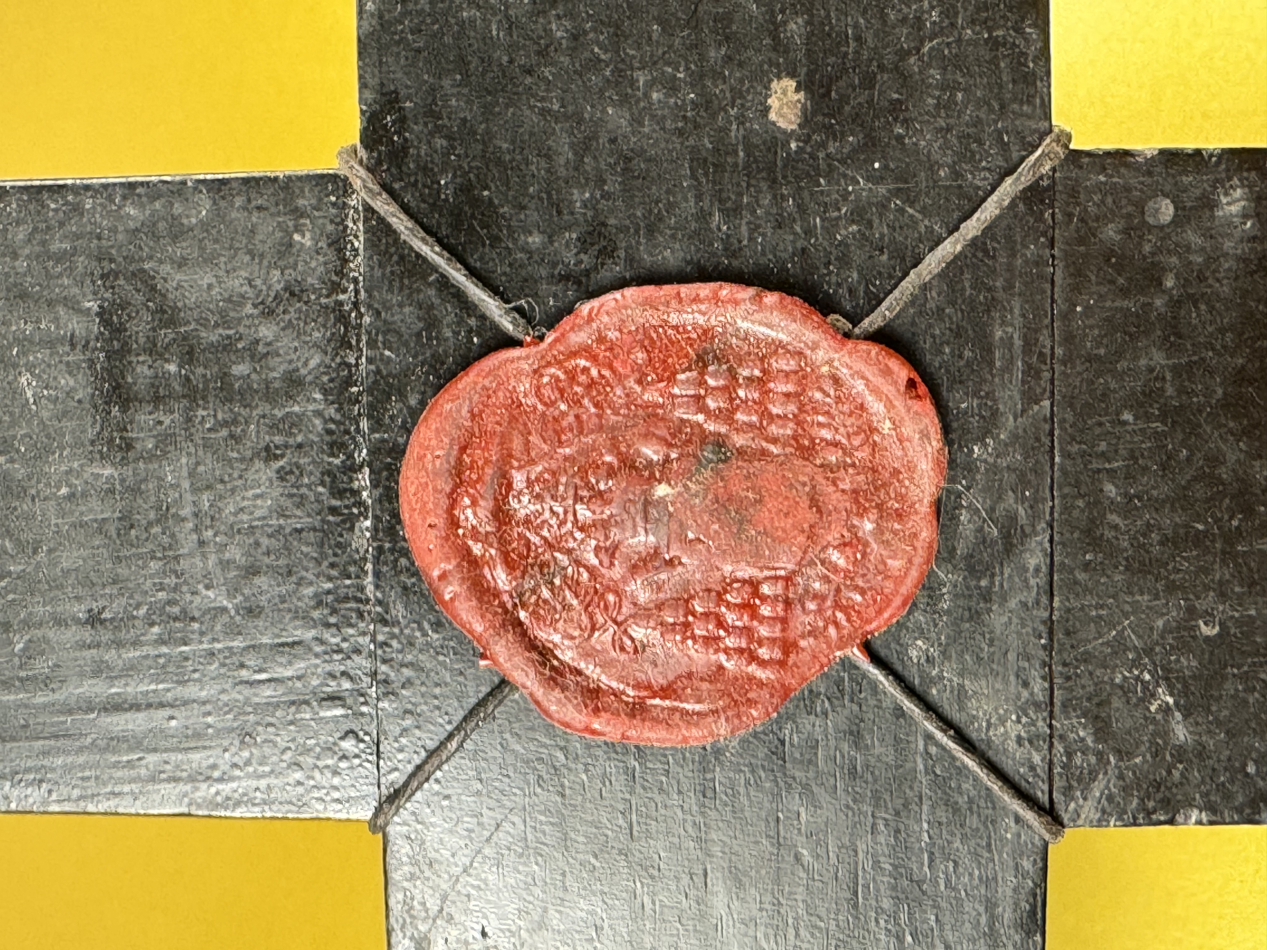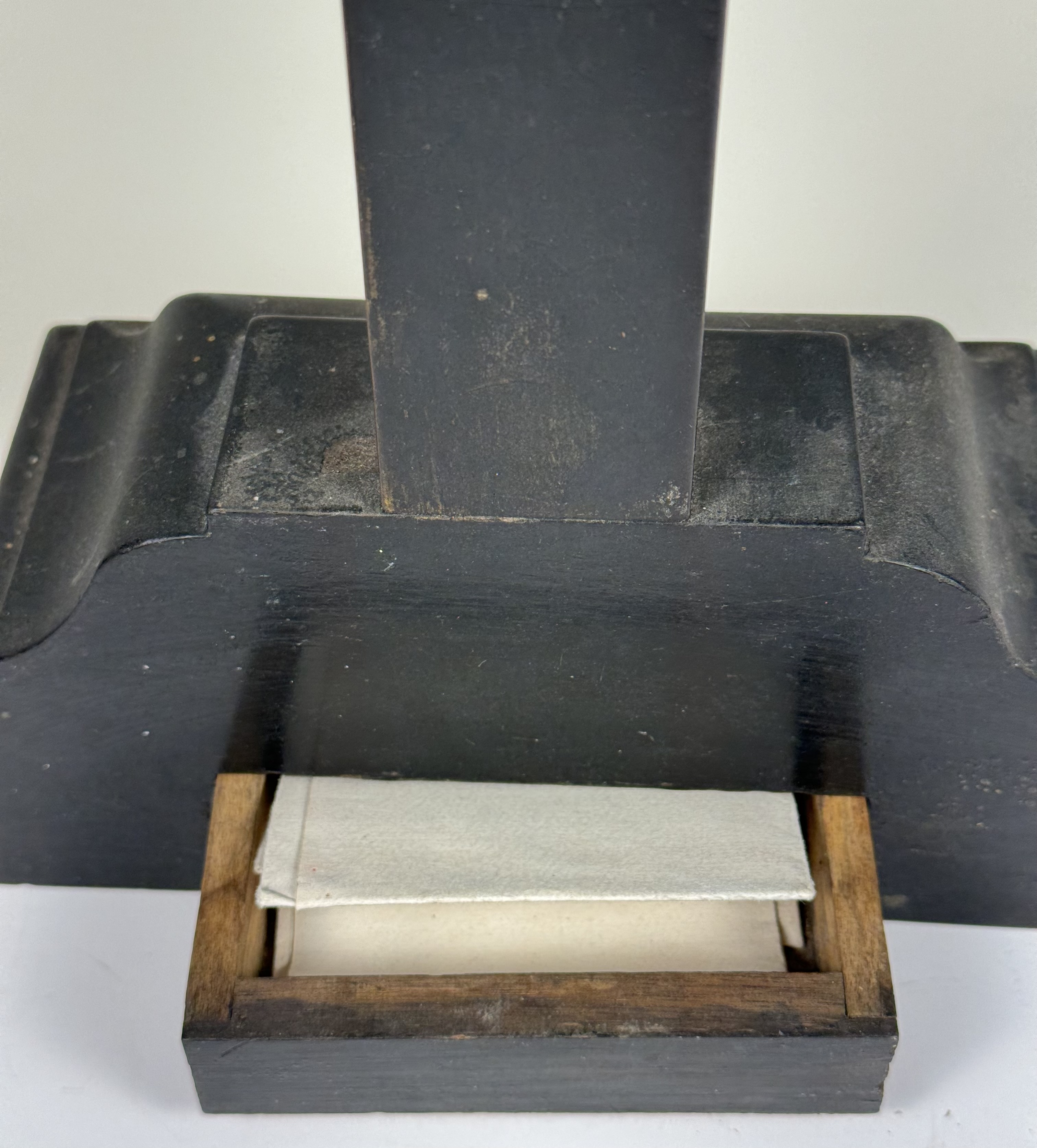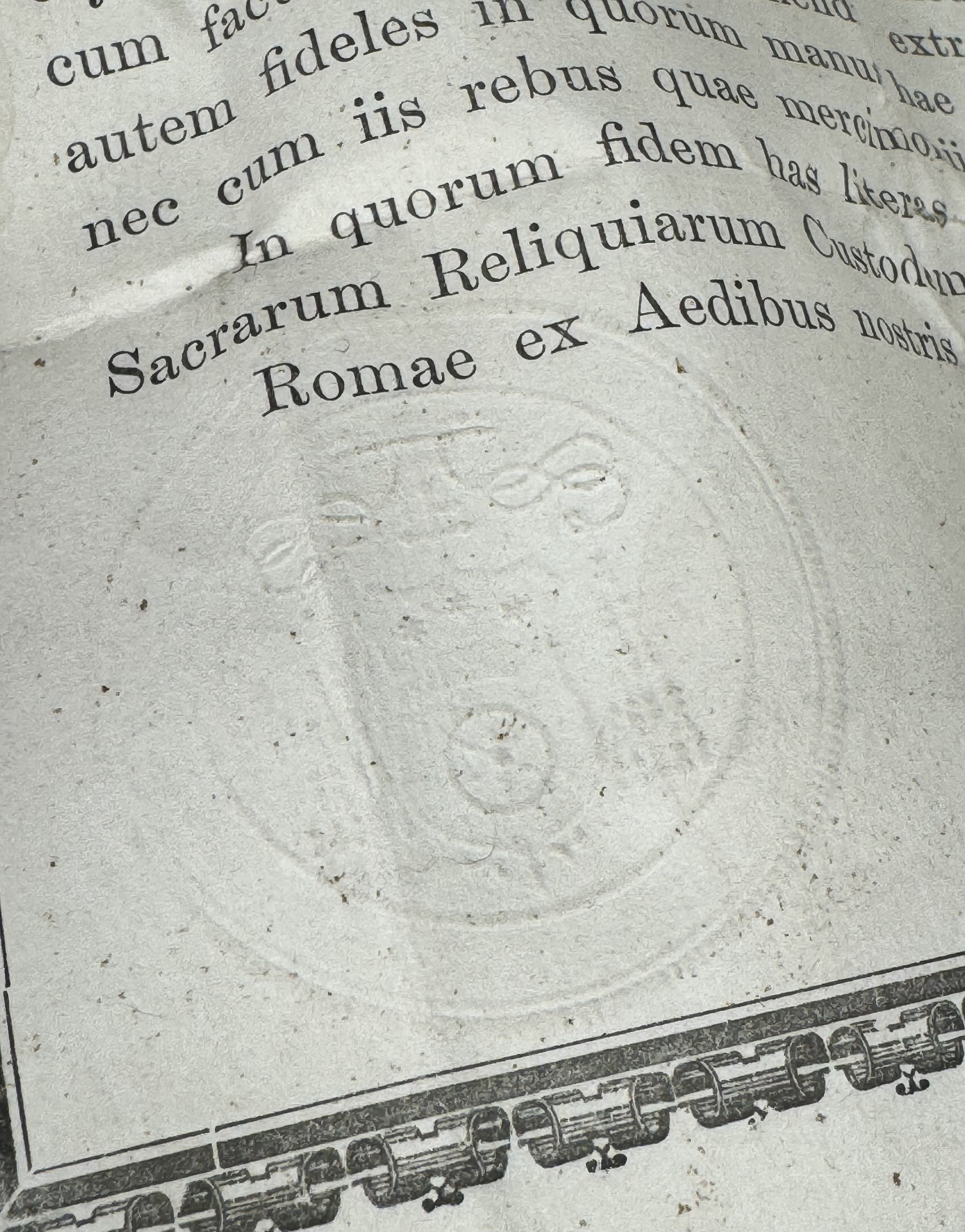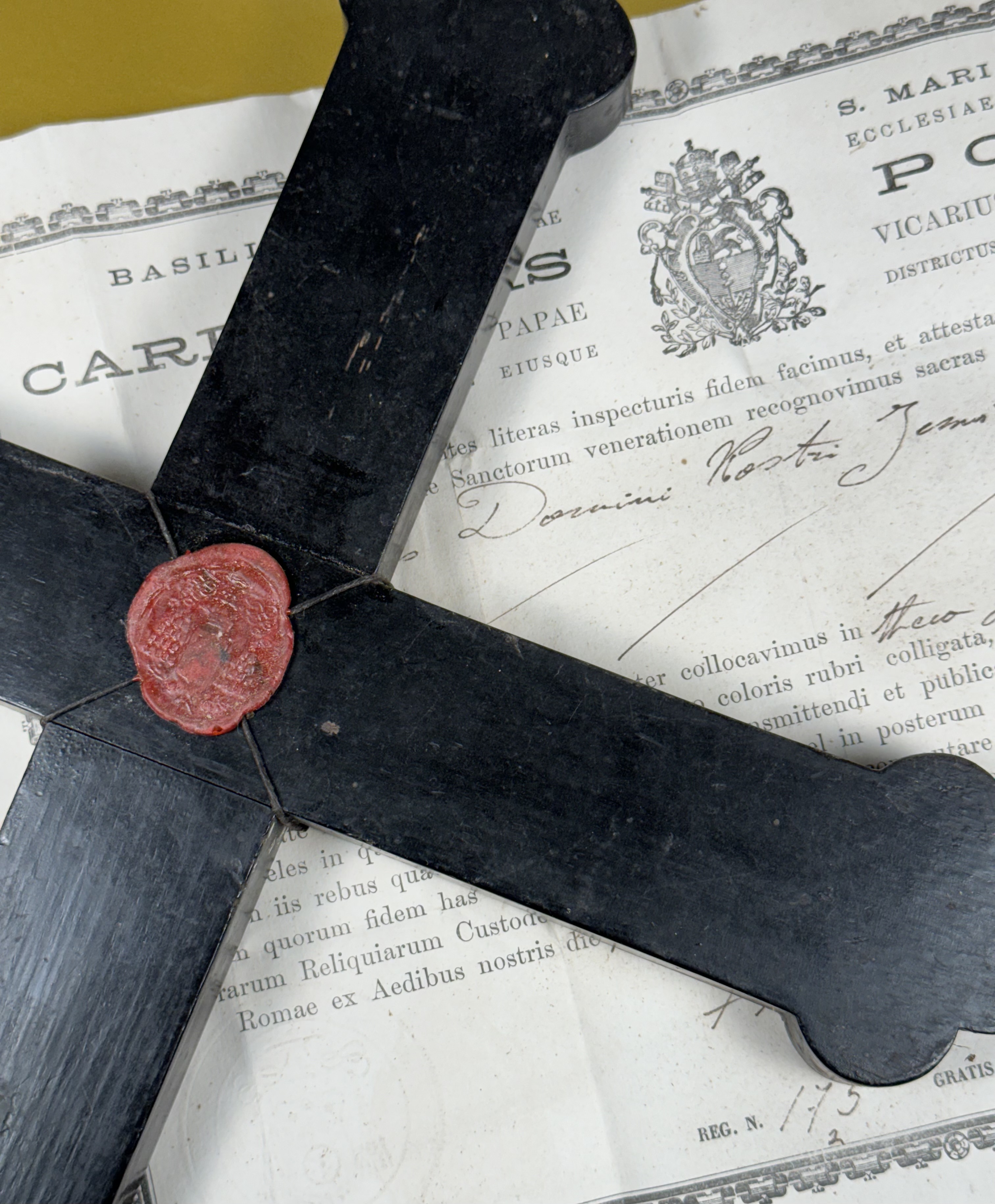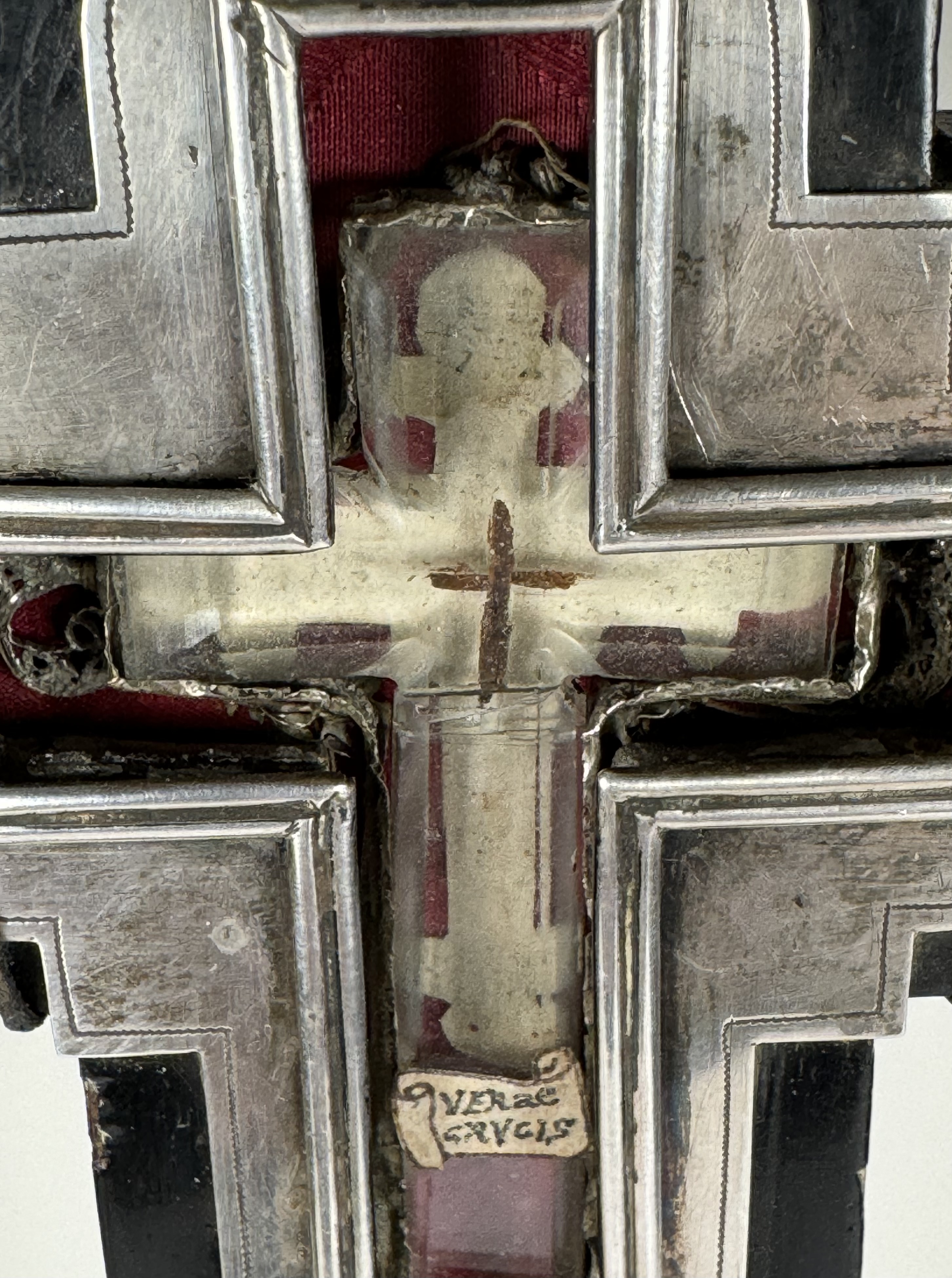 Large French cruciform reliquary monstrance made of lacquered wood with a solid silver center cavity's framing housing a theca with particles from the wood from the True Cross of Jesus ChristThe relics are displayed inside of a double-crystal theca placed in the center of the reliquary and identified in Latin on a manuscript cedula label as Verae Crvsis (The True Cross). On its back, the cross is secured by an undisturbed seal of red Spanish wax with an imprint of a coat of arms of an unidentified Roman Catholic Cardinal. On the back, the base of the monstrance has a hidden compartment that reveals the original matching authentics documents issued by Cardinal Basilio Pompili (†1931), the Vicar General of Rome (1913–1931).
