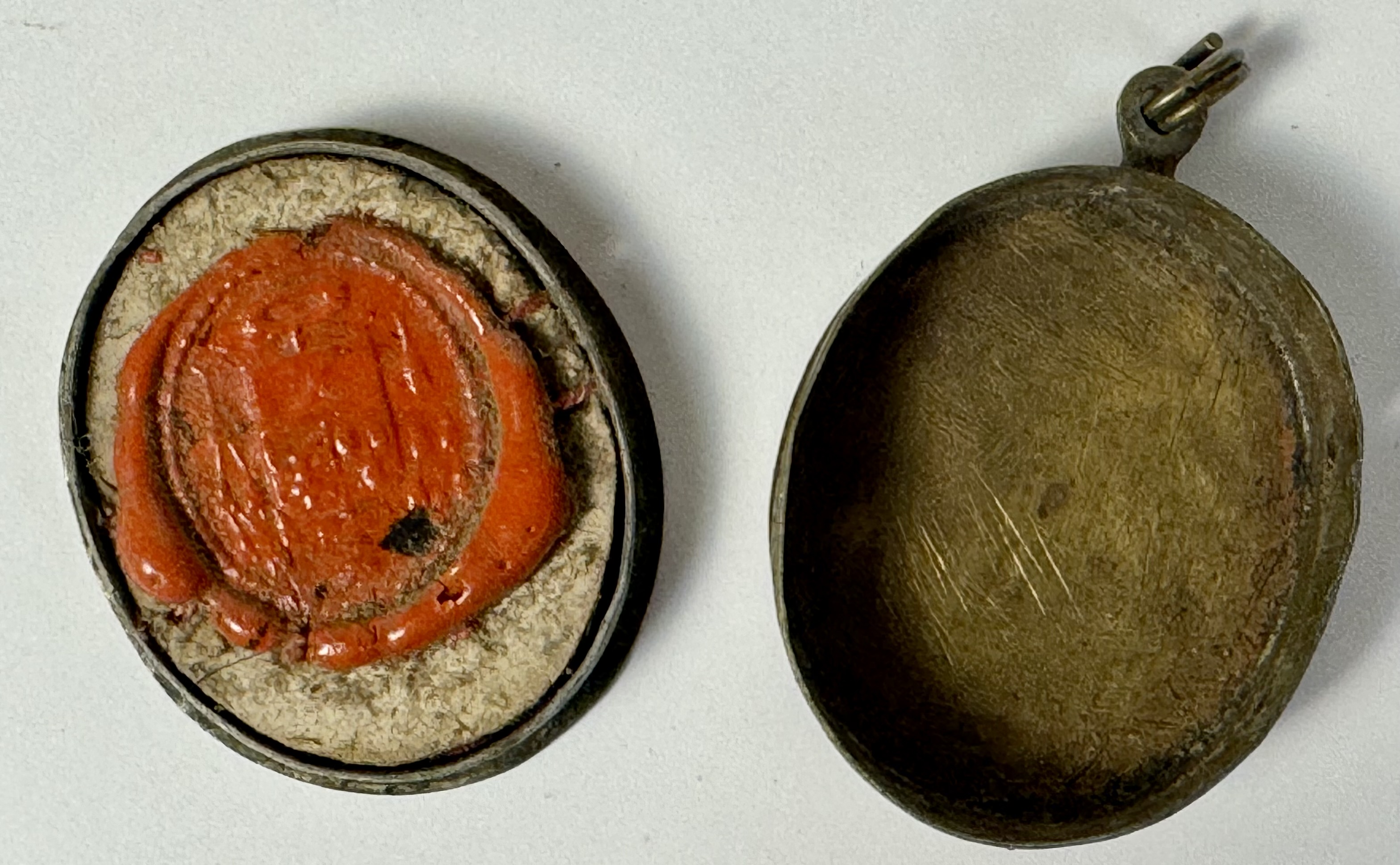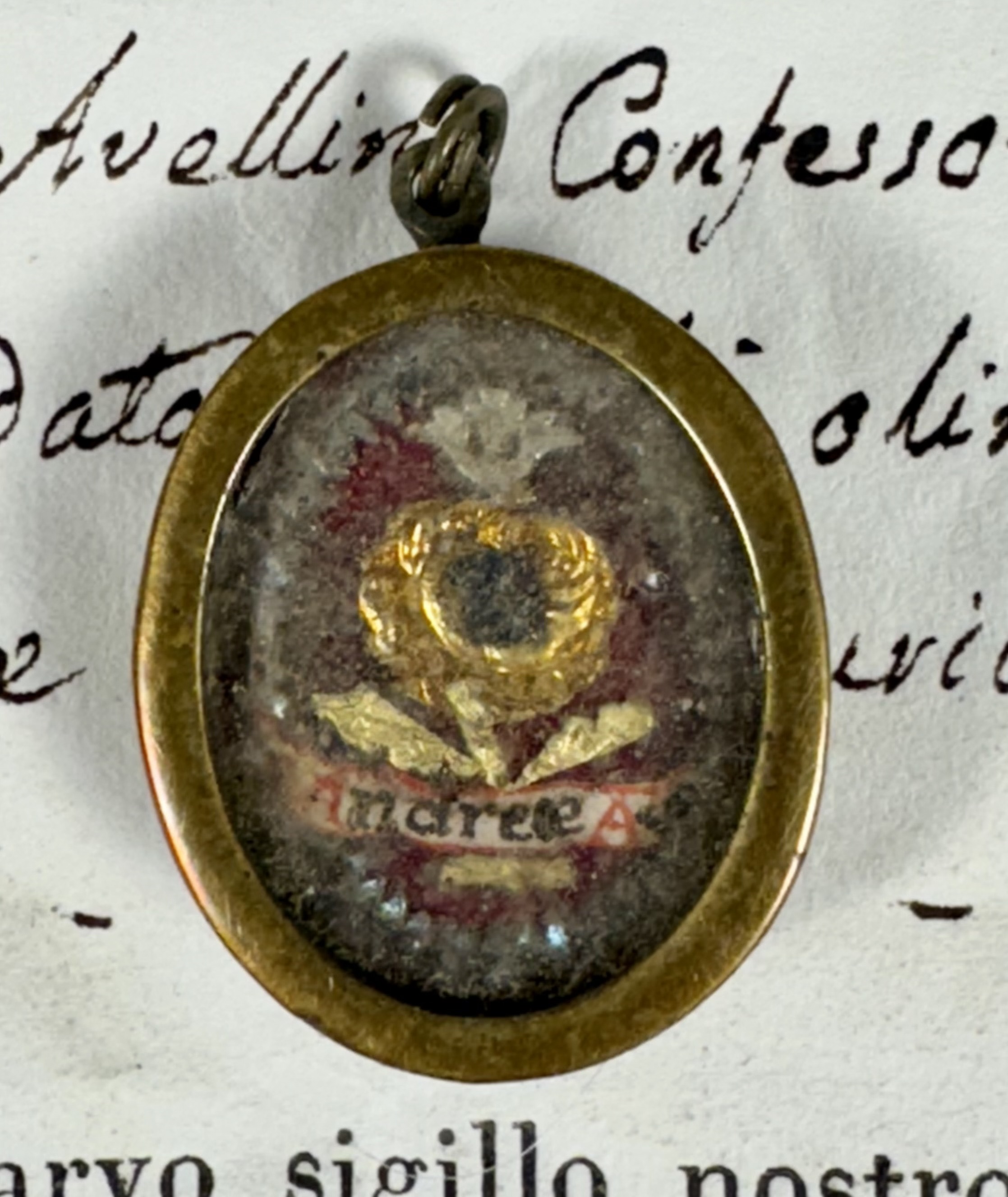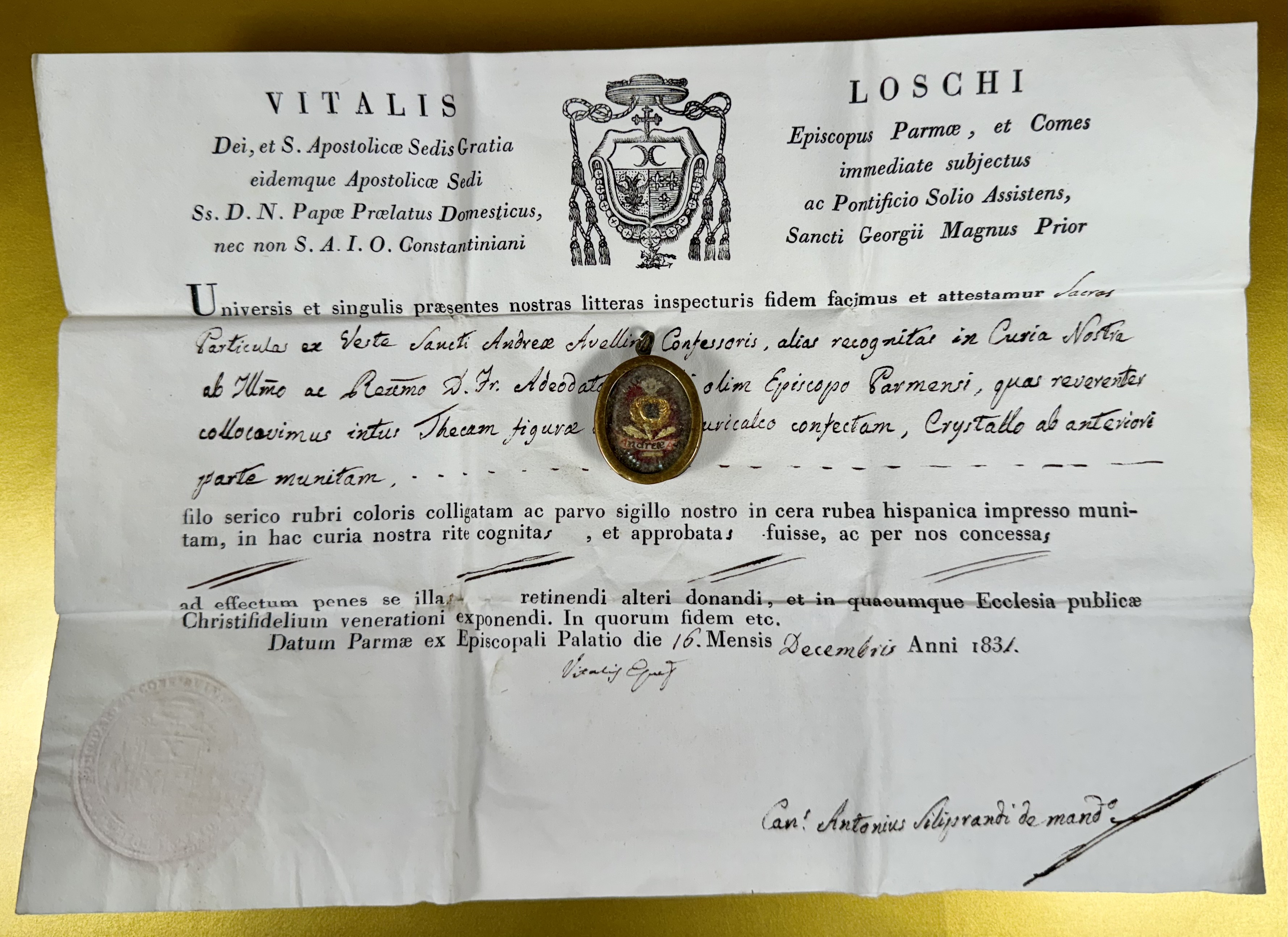 Oval glass-fronted brass pendant reliquary theca housing the second-class ex veste (of the vestments) relic of Saint Andrew Avellino. The relic is affixed to a silk ground surrounded by gilt and silvered paper ornamentation and identified in Latin on a manuscript cedula label as S. Andreae Av. (Saint Andrew Avellino). On the back, under a protective cap, the theca is secured with a seal of red Spanish wax bearing an imprint of a coat of arms of Father Vitale Loschi (†1842), Bishop of Parma, Italy (1831-1842). The relic is accompanied by the original matching authentics document issued and sealed by the order of Bishop Loschi in 1831.