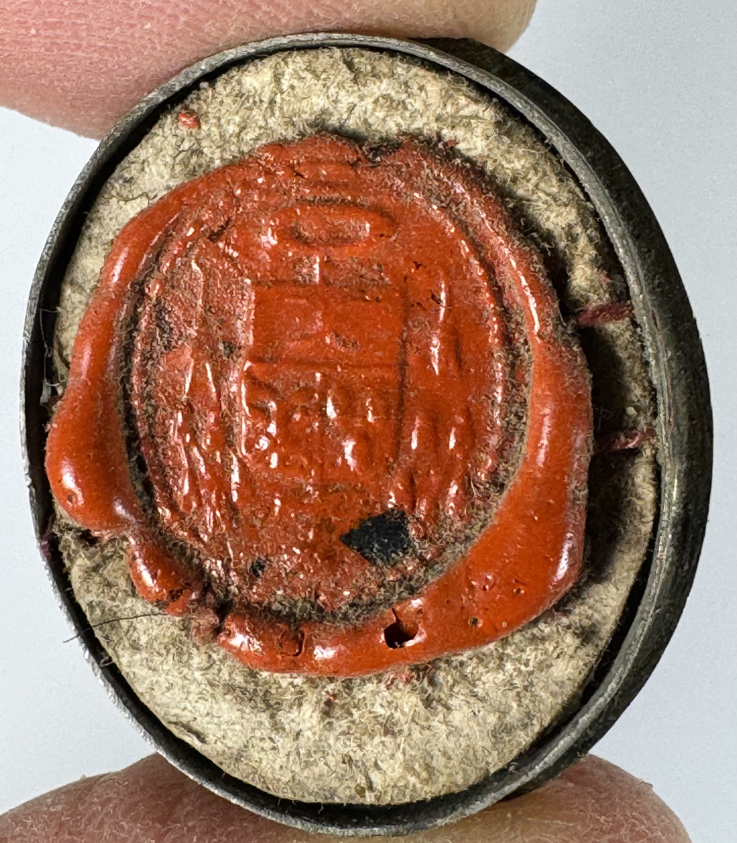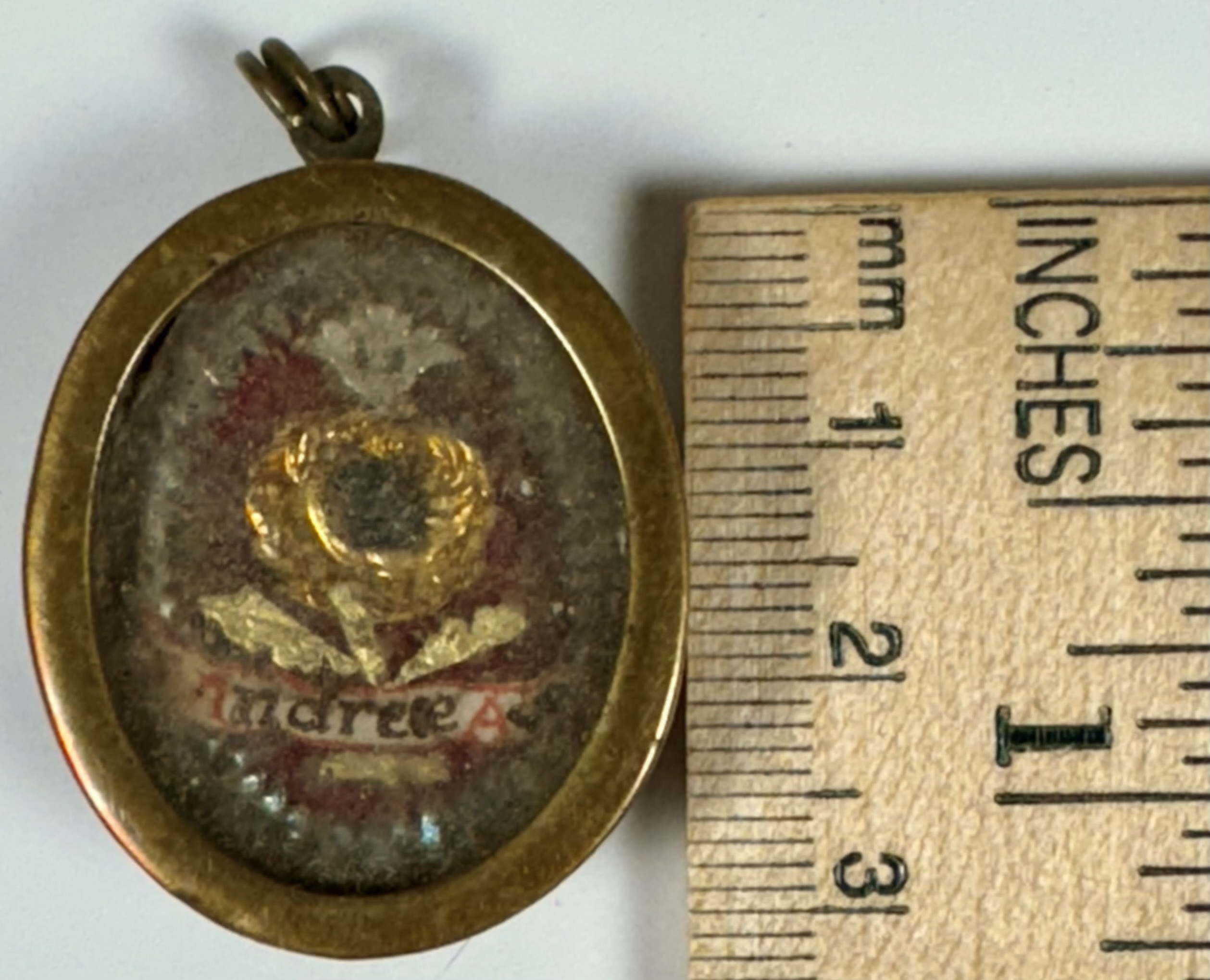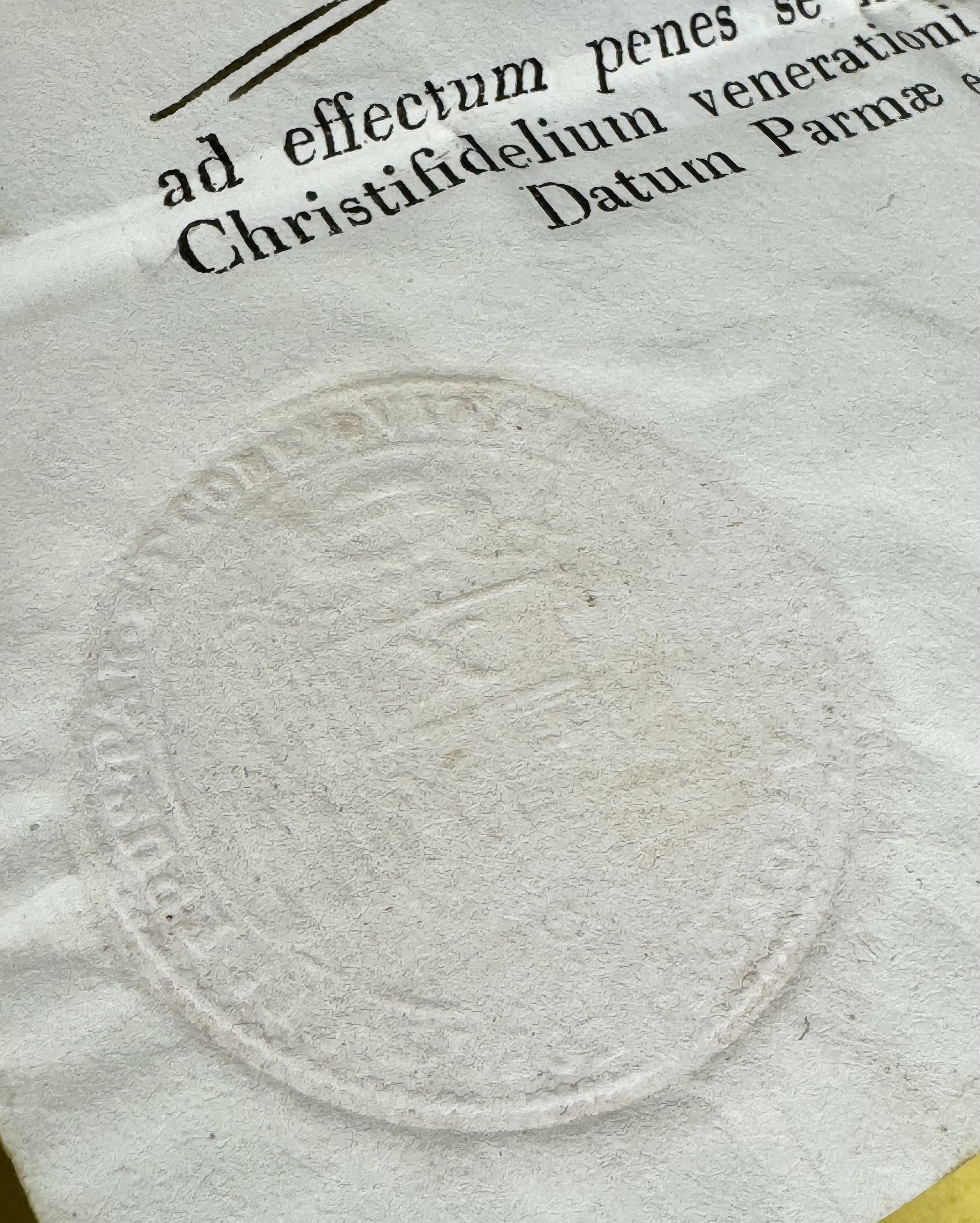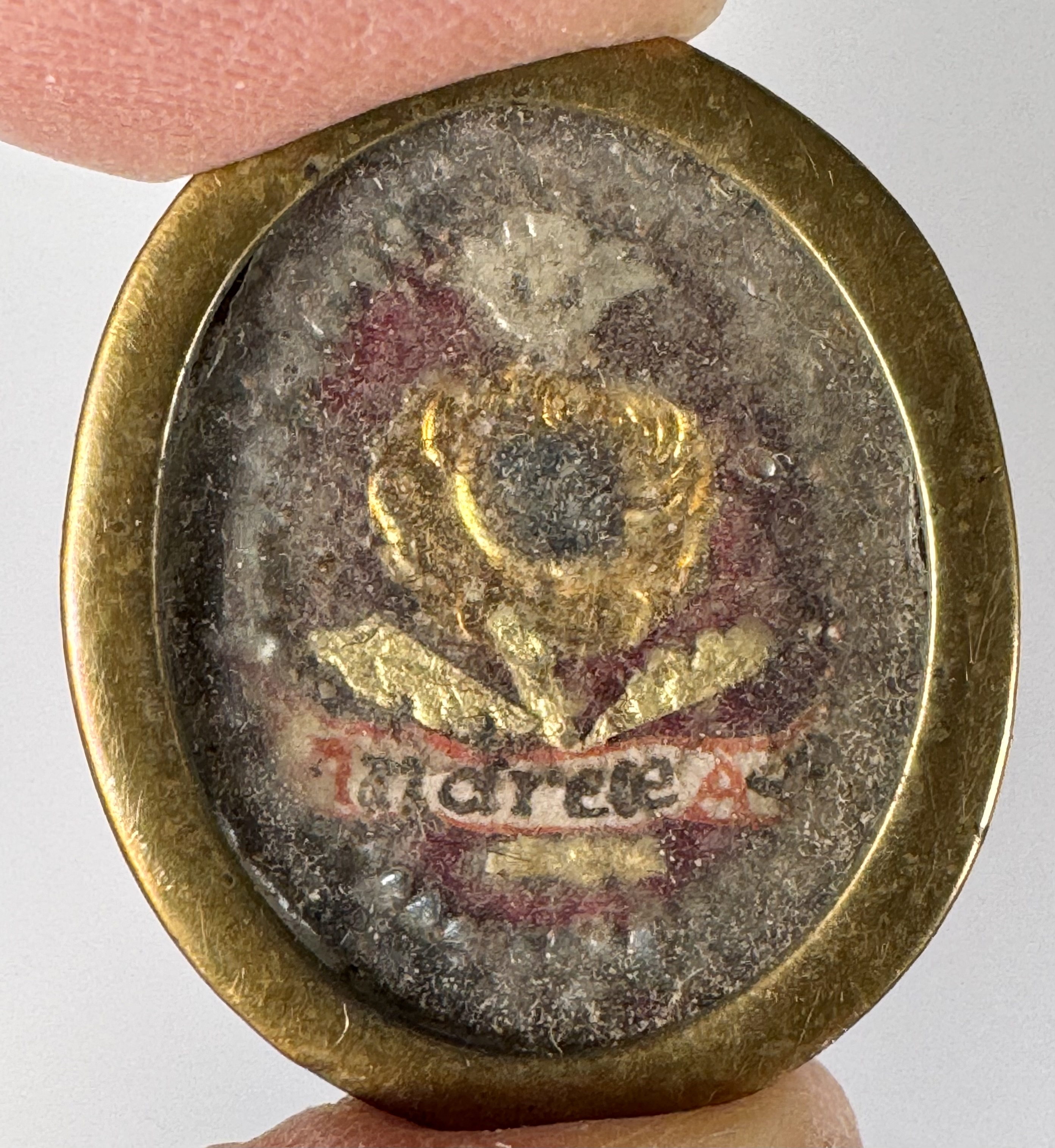 Oval glass-fronted brass pendant reliquary theca housing the second-class ex veste (of the vestments) relic of Saint Andrew Avellino. The relic is affixed to a silk ground surrounded by gilt and silvered paper ornamentation and identified in Latin on a manuscript cedula label as S. Andreae Av. (Saint Andrew Avellino). On the back, under a protective cap, the theca is secured with a seal of red Spanish wax bearing an imprint of a coat of arms of Father Vitale Loschi (†1842), Bishop of Parma, Italy (1831-1842). The relic is accompanied by the original matching authentics document issued and sealed by the order of Bishop Loschi in 1831.