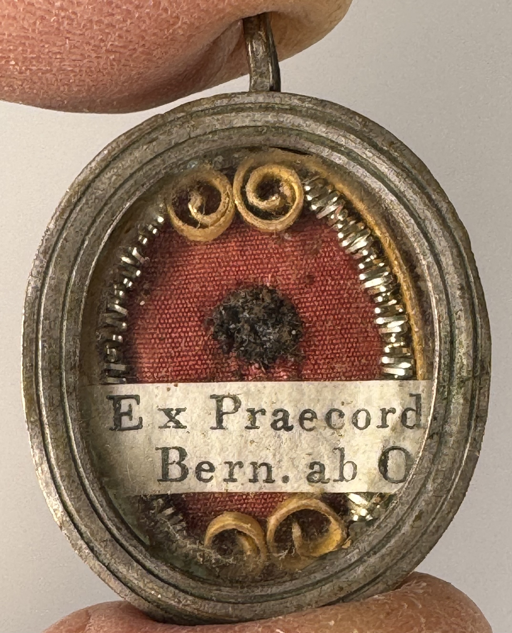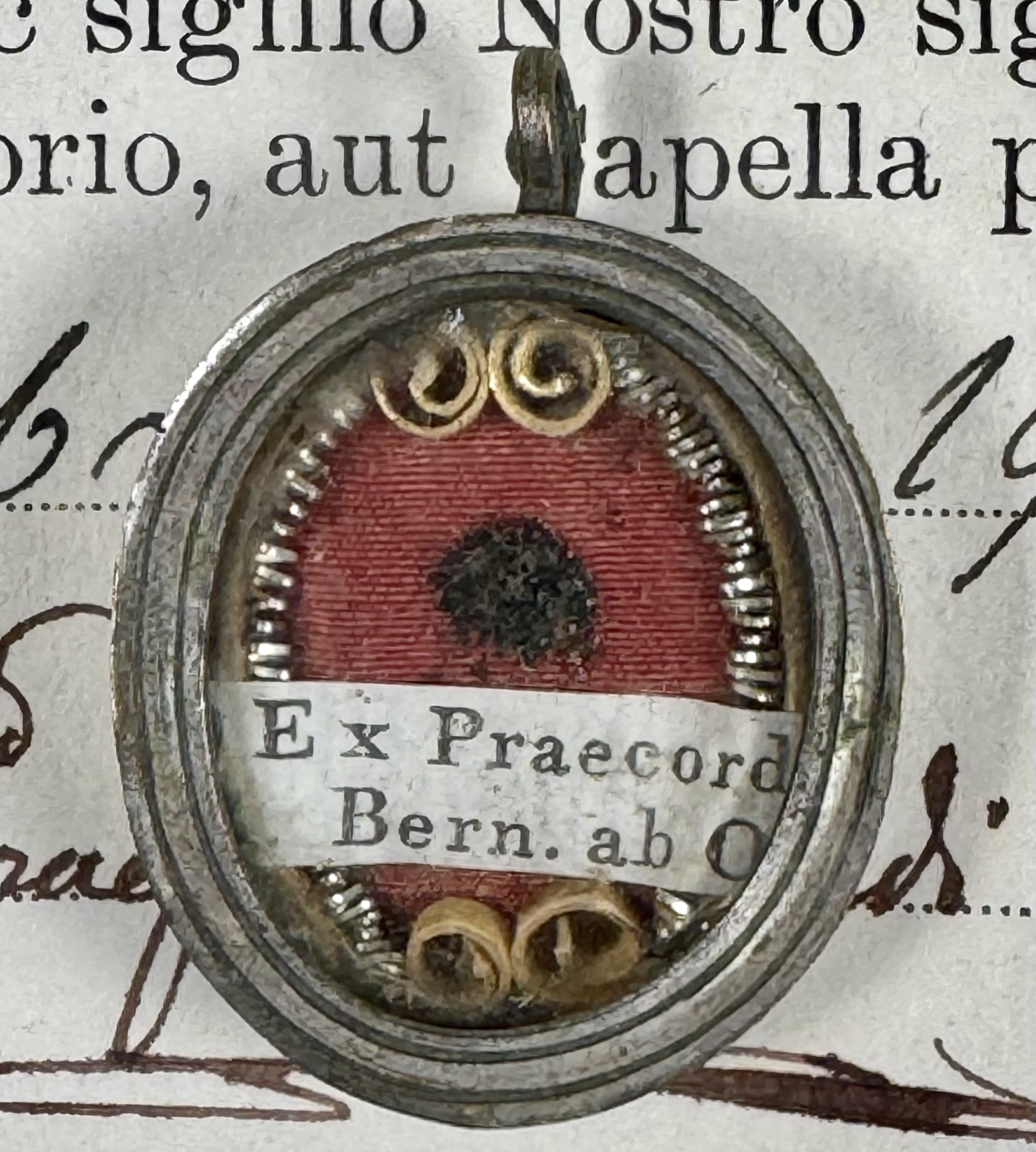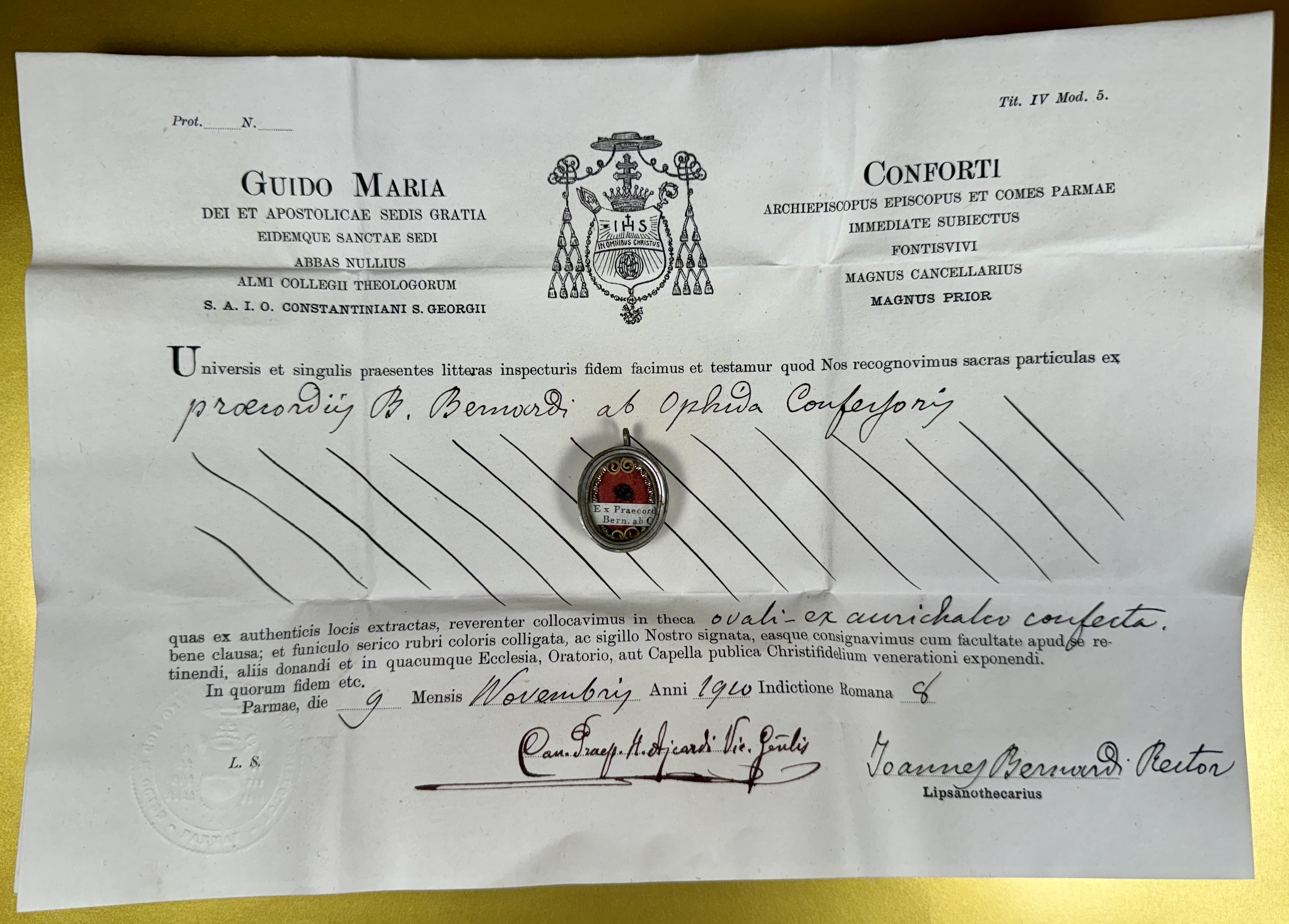Oval glass-fronted silvered brass pendant reliquary theca housing the first-class ex praecordis (of the inner organs) relic of the Blessed Bernard of Offida. The relic is affixed to the red silk ground surrounded by gilt silver wire ornamentation and identified in Latin on a typeset cedula label as Ex Praecordi // B. Bern. ab. O. (of the inner organs of the Blessed Bernard, Abbot of Offida). On the back, under a protective cap, the theca is secured with a seal of red Spanish wax bearing an imprint of a coat of arms of Archbishop St. Guido Maria Conforti (†1931), Bishop of Parma, Italy (1907-1931), who himself was canonized as a Saint in 2011 by Pope John Paul II on account of his life of heroic virtue. The relic is accompanied by the original matching authentics document issued and sealed by the order of Monsignor Conforti in 1910.