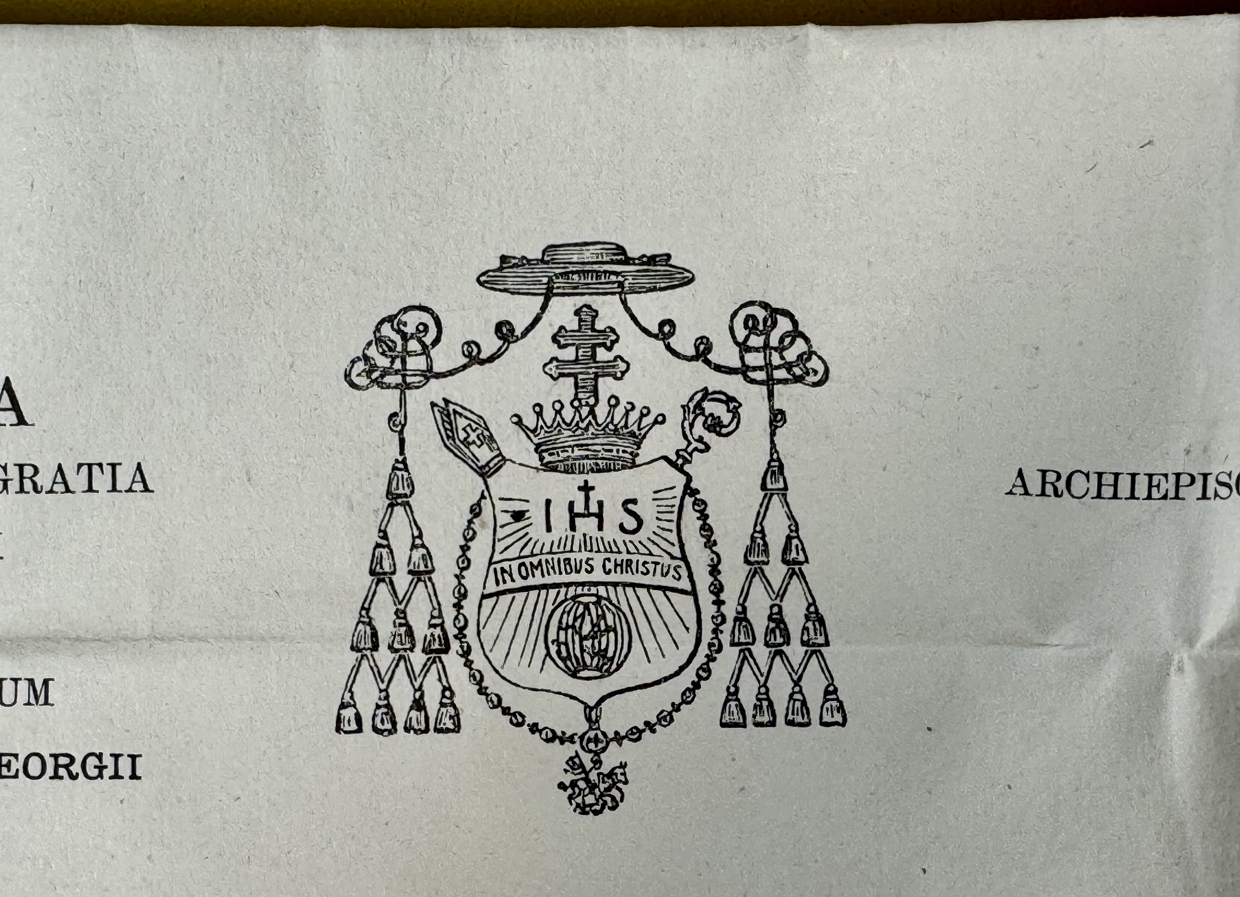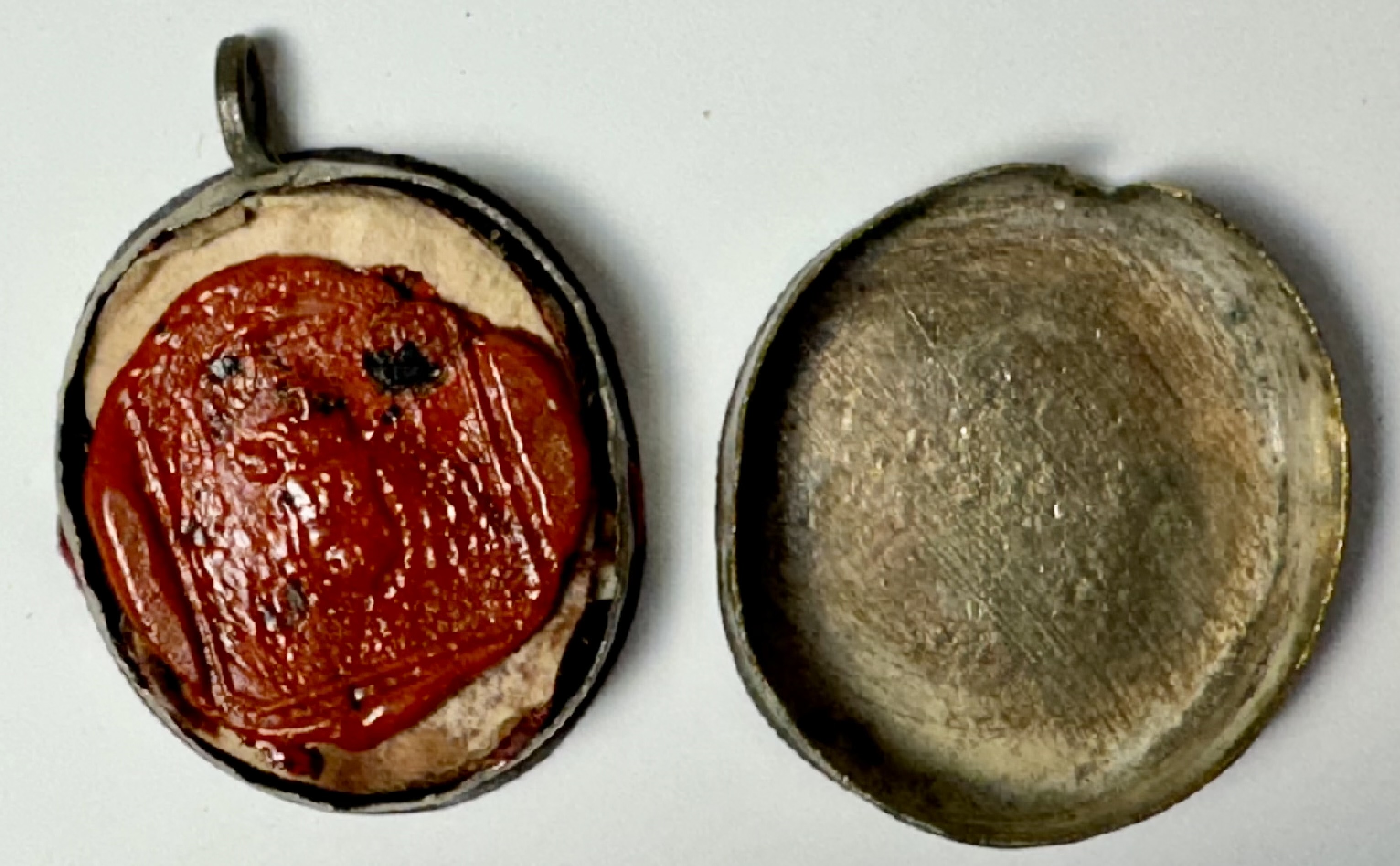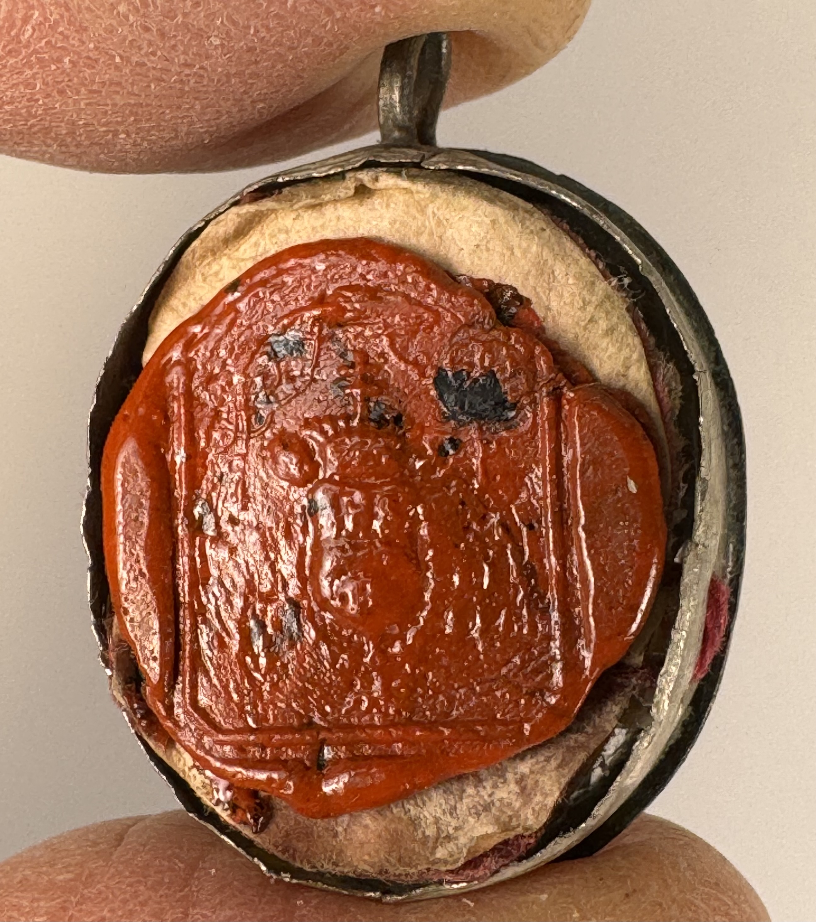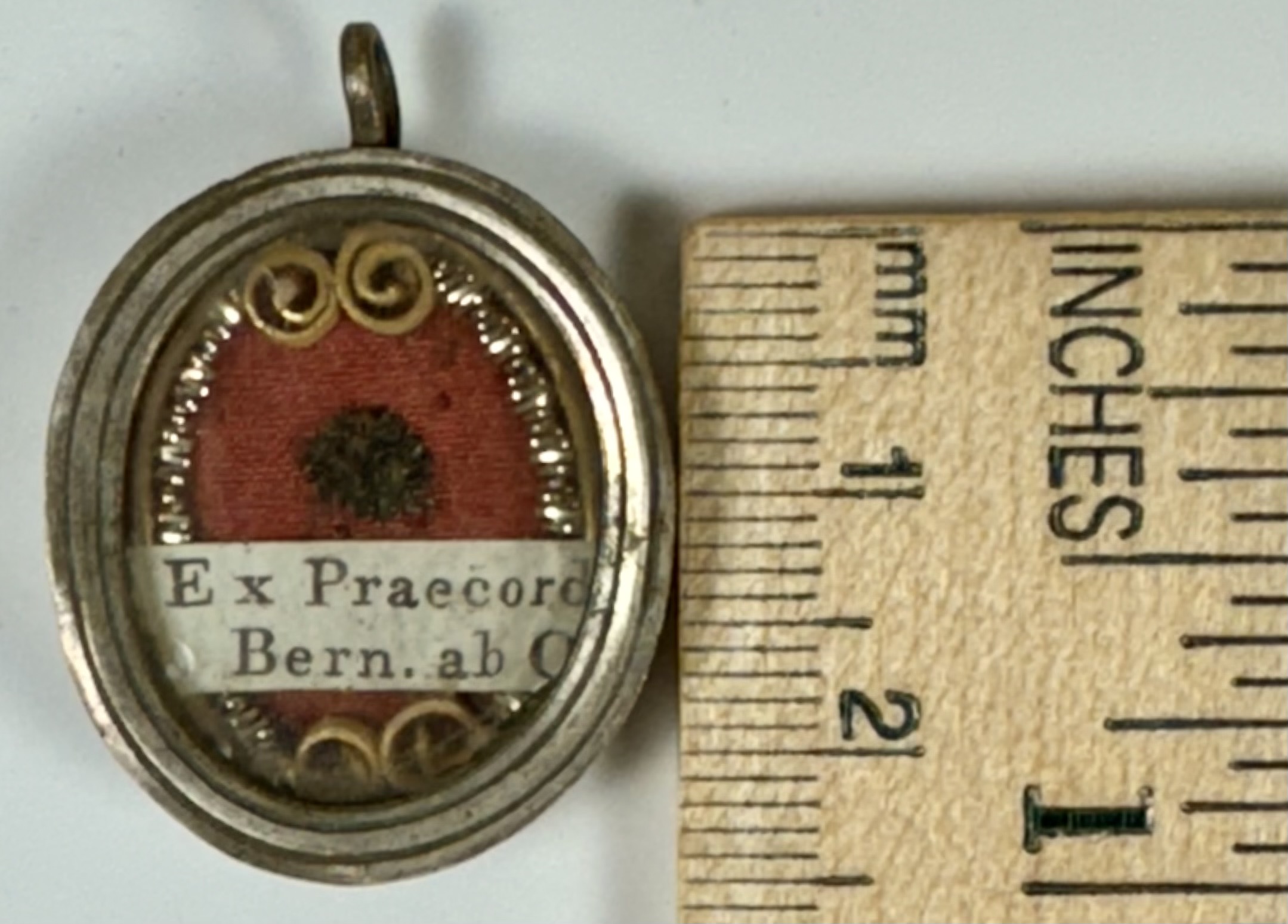 Oval glass-fronted silvered brass pendant reliquary theca housing the first-class ex praecordis (of the inner organs) relic of the Blessed Bernard of Offida. The relic is affixed to the red silk ground surrounded by gilt silver wire ornamentation and identified in Latin on a typeset cedula label as Ex Praecordi // B. Bern. ab. O. (of the inner organs of the Blessed Bernard, Abbot of Offida). On the back, under a protective cap, the theca is secured with a seal of red Spanish wax bearing an imprint of a coat of arms of Archbishop St. Guido Maria Conforti (†1931), Bishop of Parma, Italy (1907-1931), who himself was canonized as a Saint in 2011 by Pope John Paul II on account of his life of heroic virtue. The relic is accompanied by the original matching authentics document issued and sealed by the order of Monsignor Conforti in 1910.
