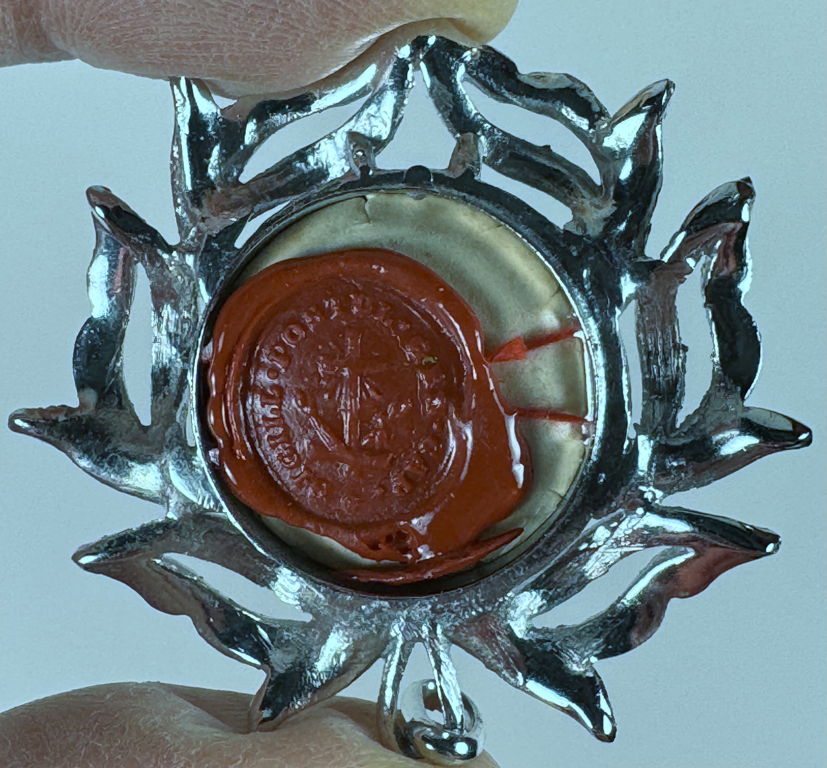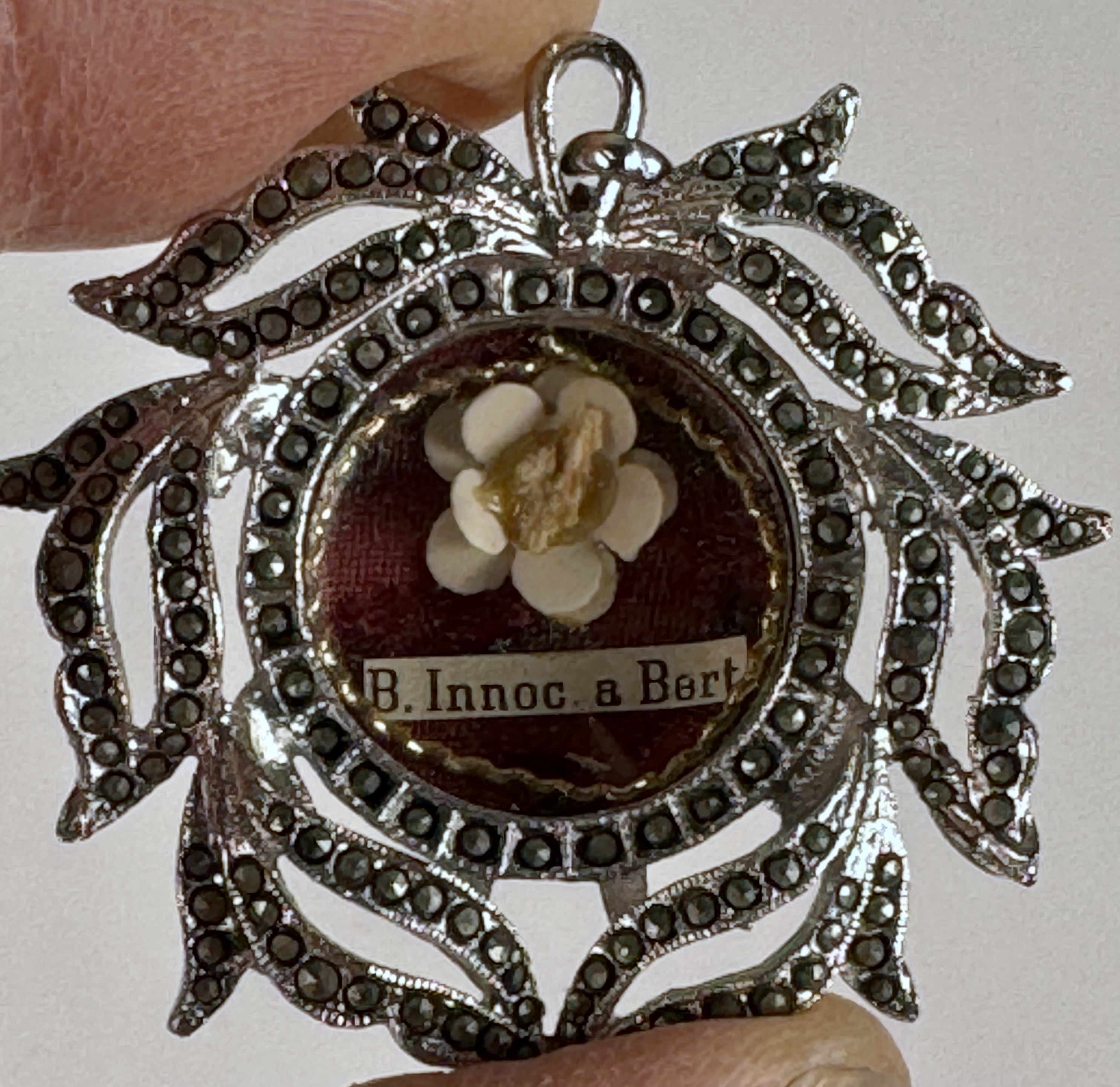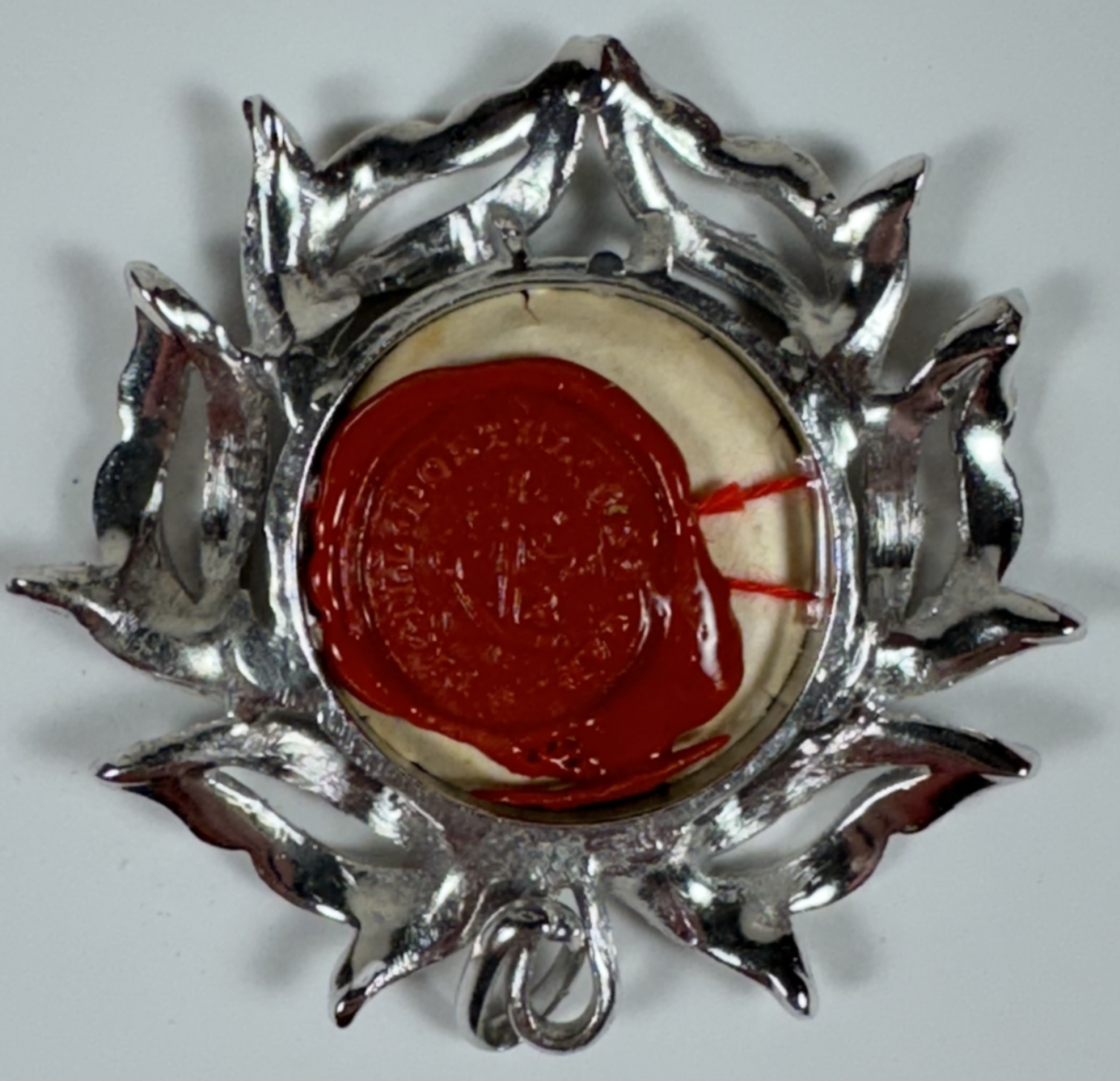 Fancy round glass-fronted white-metal pendant reliquary theca housing the first-class ex ossibus (of the bone) relic of the Blessed Innocenzo da Berzo.  The relic is affixed to a ground of red silk, surrounded by gilt silver wire ornamentation and identified in Latin on a fancy manuscript cedula label as B. Innoc. a Bert. (Blessed Innocenzo da Berzo). On the back, the theca is secured with a seal of red Spanish wax bearing an imprint of a coat of arms of the Postulator General of the Order of Friars Minor.