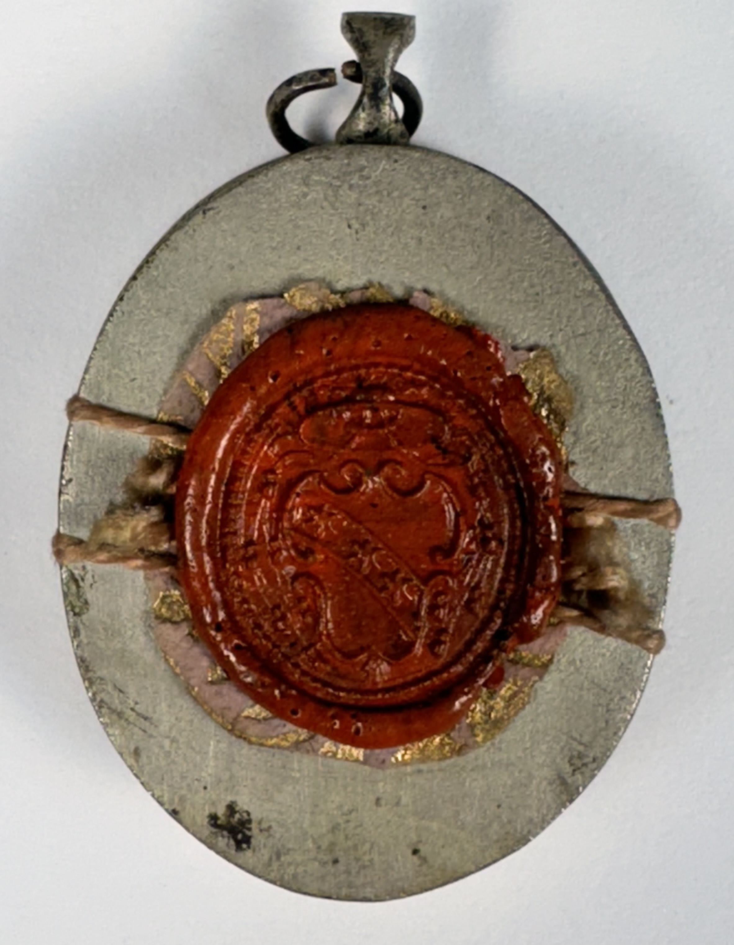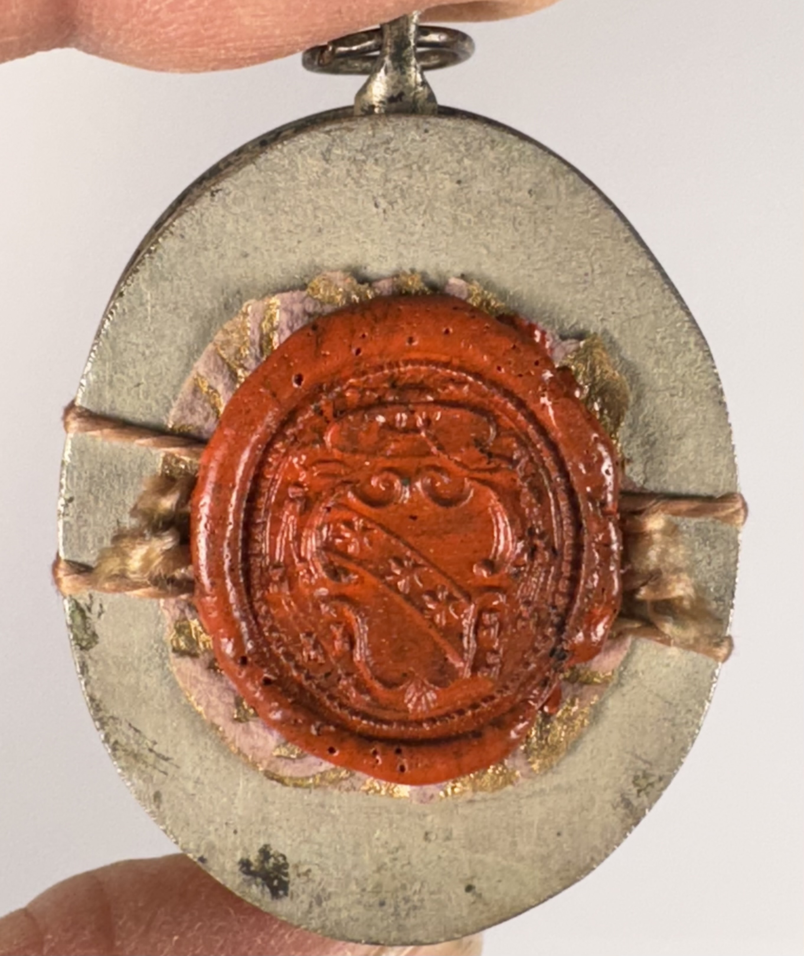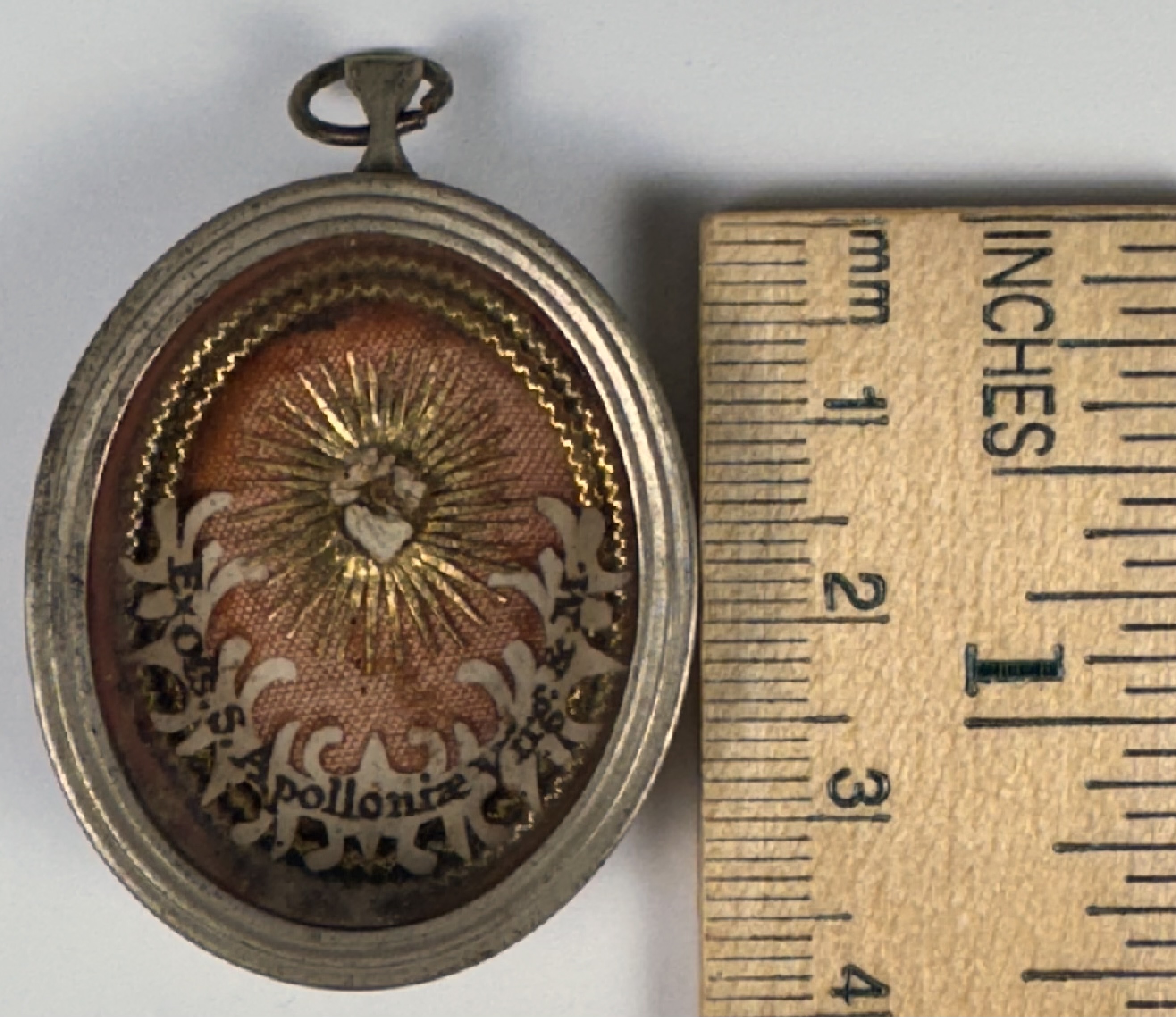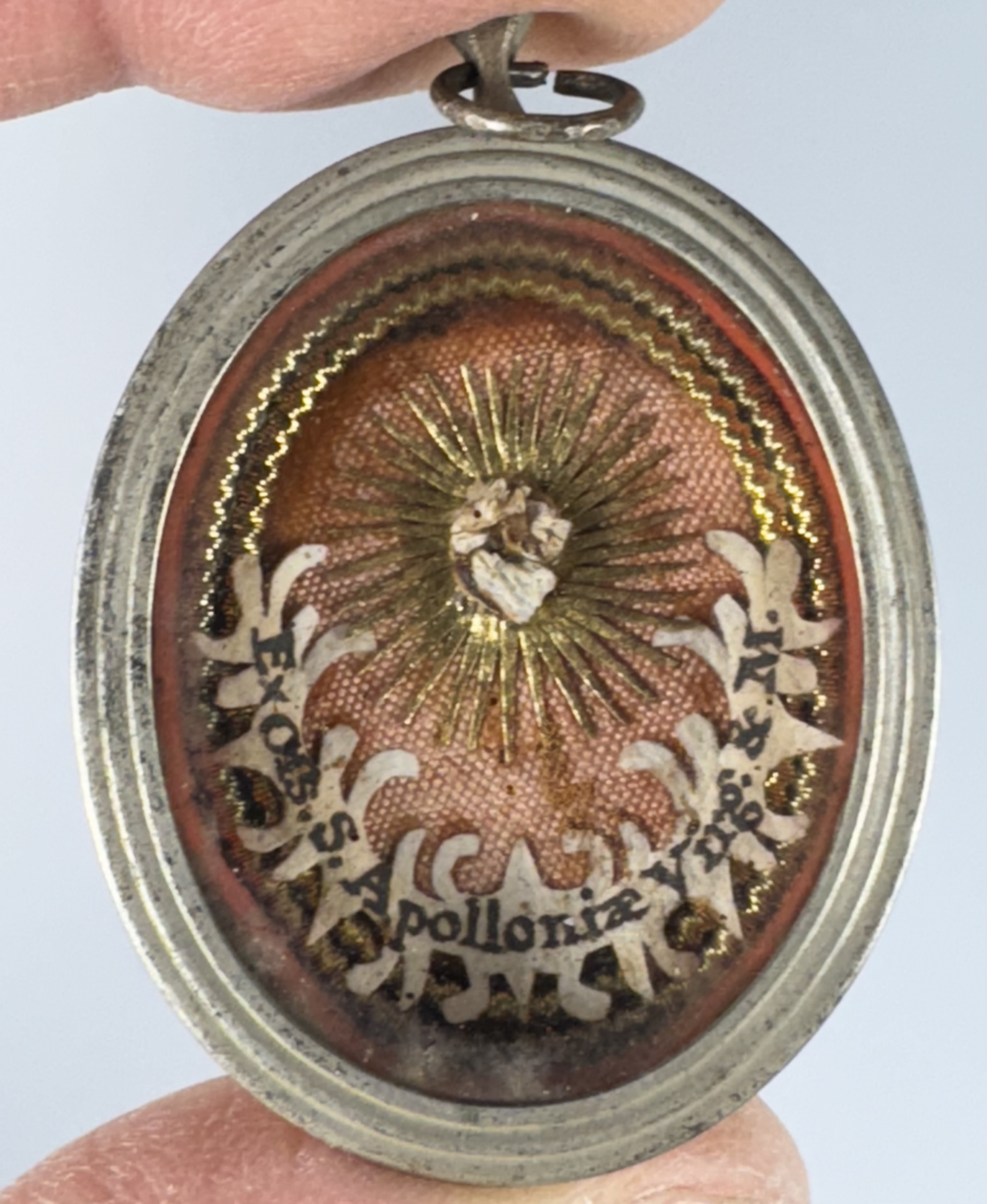 Oval glass-fronted silver pendant reliquary theca housing the first-class ex ossibus (of the bone) relic of Saint Apollonia of Alexandria. A sizable relic is affixed to a gilt-paper starburst on a ground of salmon-colored silk, surrounded by silver wire ornamentation and identified in Latin on a fancy manuscript cedula label as Ex Oss. S. Apolloniae V. & M. (of the bone of St. Apollonia, Virgin and Martyr). On the back, the theca is secured with a seal of red Spanish wax bearing an imprint of a coat of arms of Fr. Francesco Maria Ginori (†1775), Bishop of Fiesole, Italy (1736–1775).