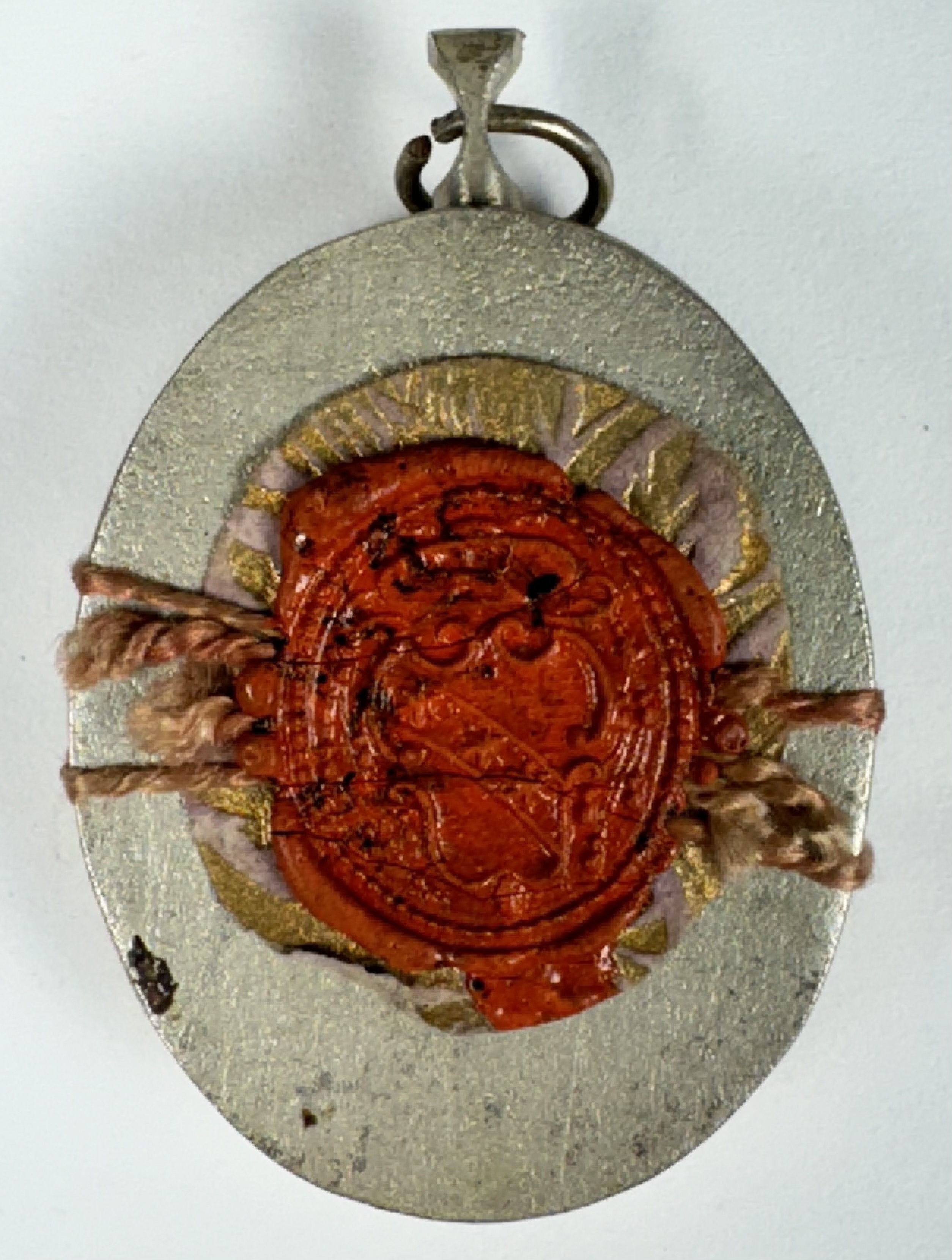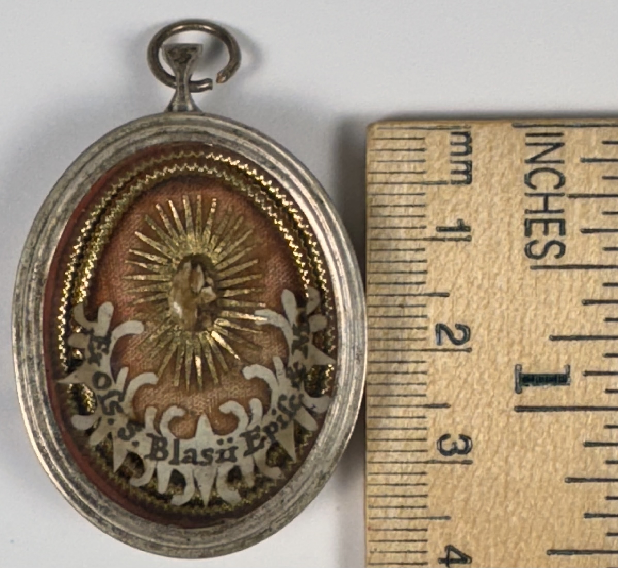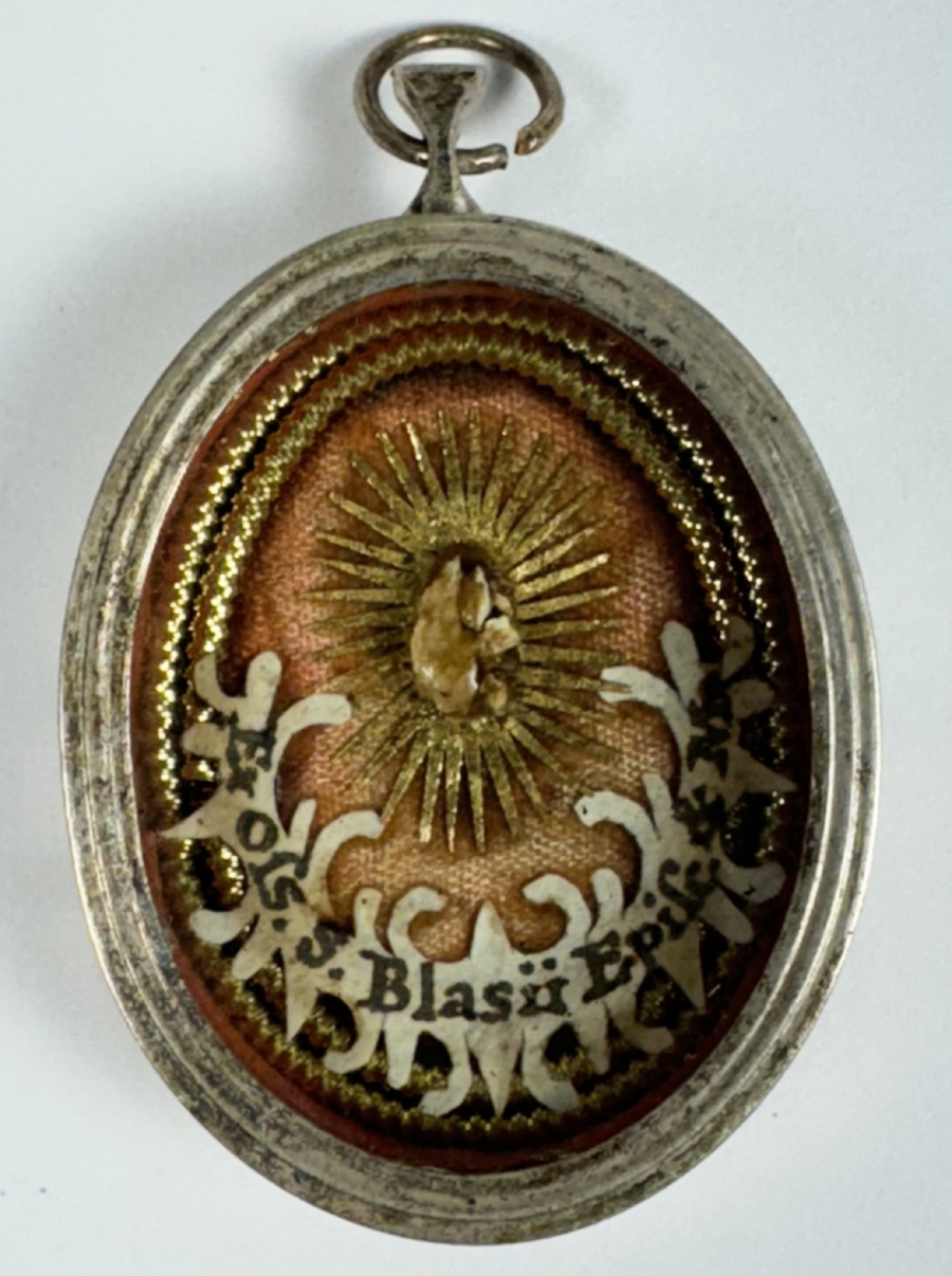 Oval glass-fronted silver pendant reliquary theca housing the first-class ex ossibus (of the bone) relic of Saint Blaise. A sizable relic is affixed to a gilt-paper starburst on a ground of salmon-colored silk, surrounded by silver wire ornamentation and identified in Latin on a fancy manuscript cedula label as Ex Oss. S. Blasii, Episc. & M. (of the bone of St. Blaise, Bishop & Martyr). On the back, the theca is secured with a seal of red Spanish wax bearing an imprint of a coat of arms of Fr. Francesco Maria Ginori (†1775), Bishop of Fiesole, Italy (1736–1775).