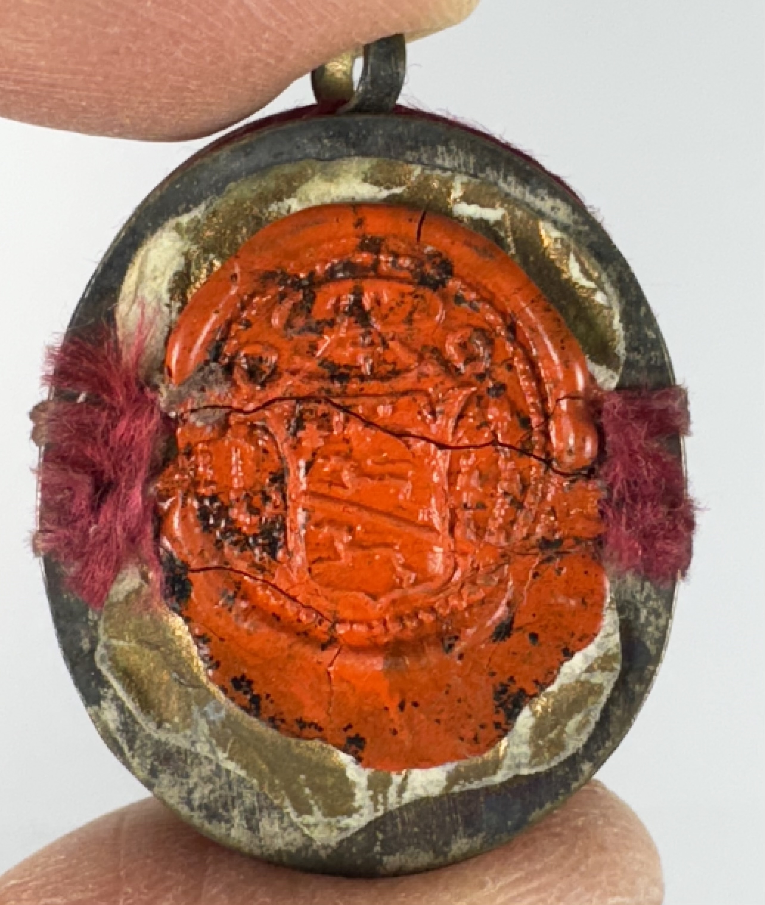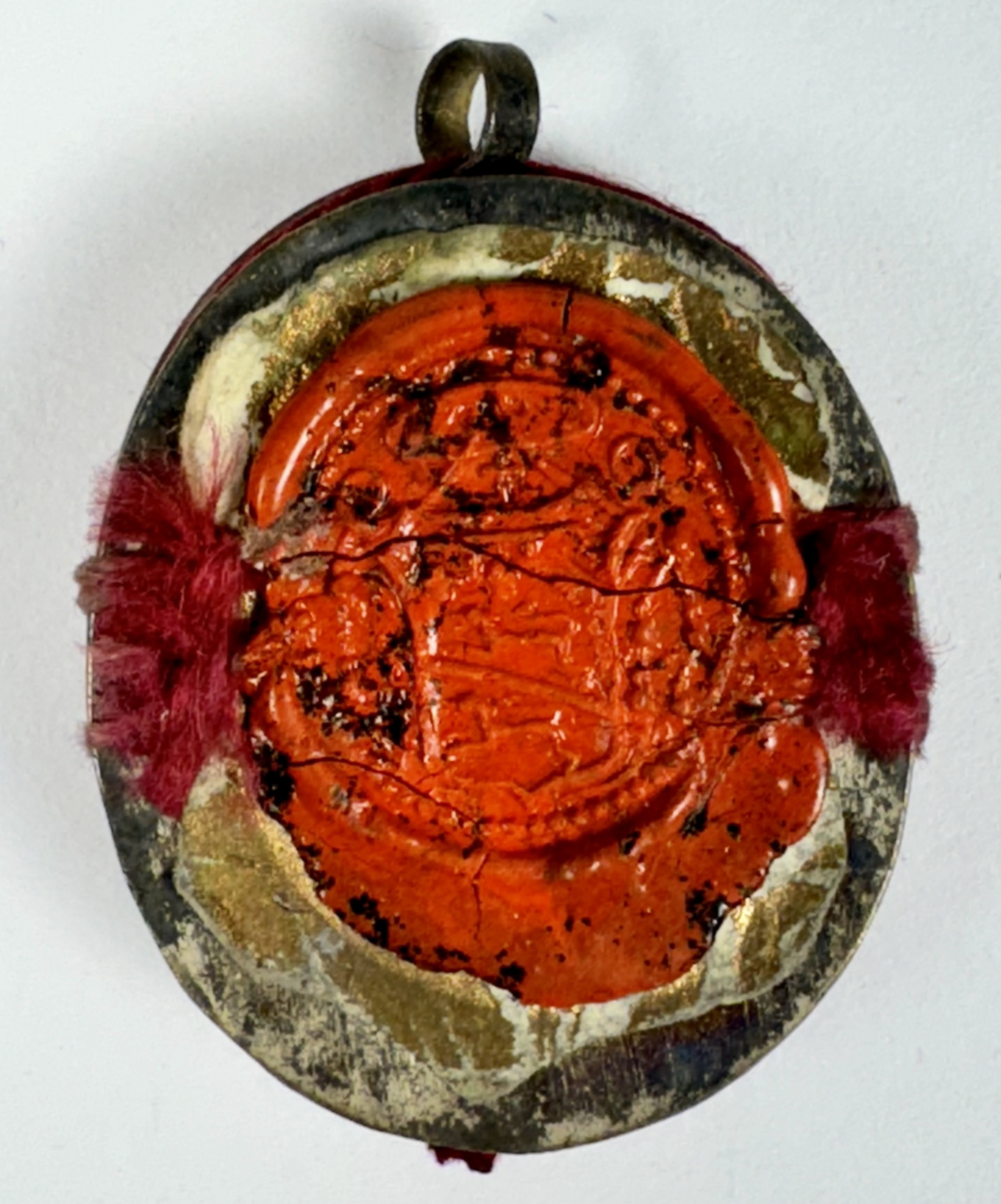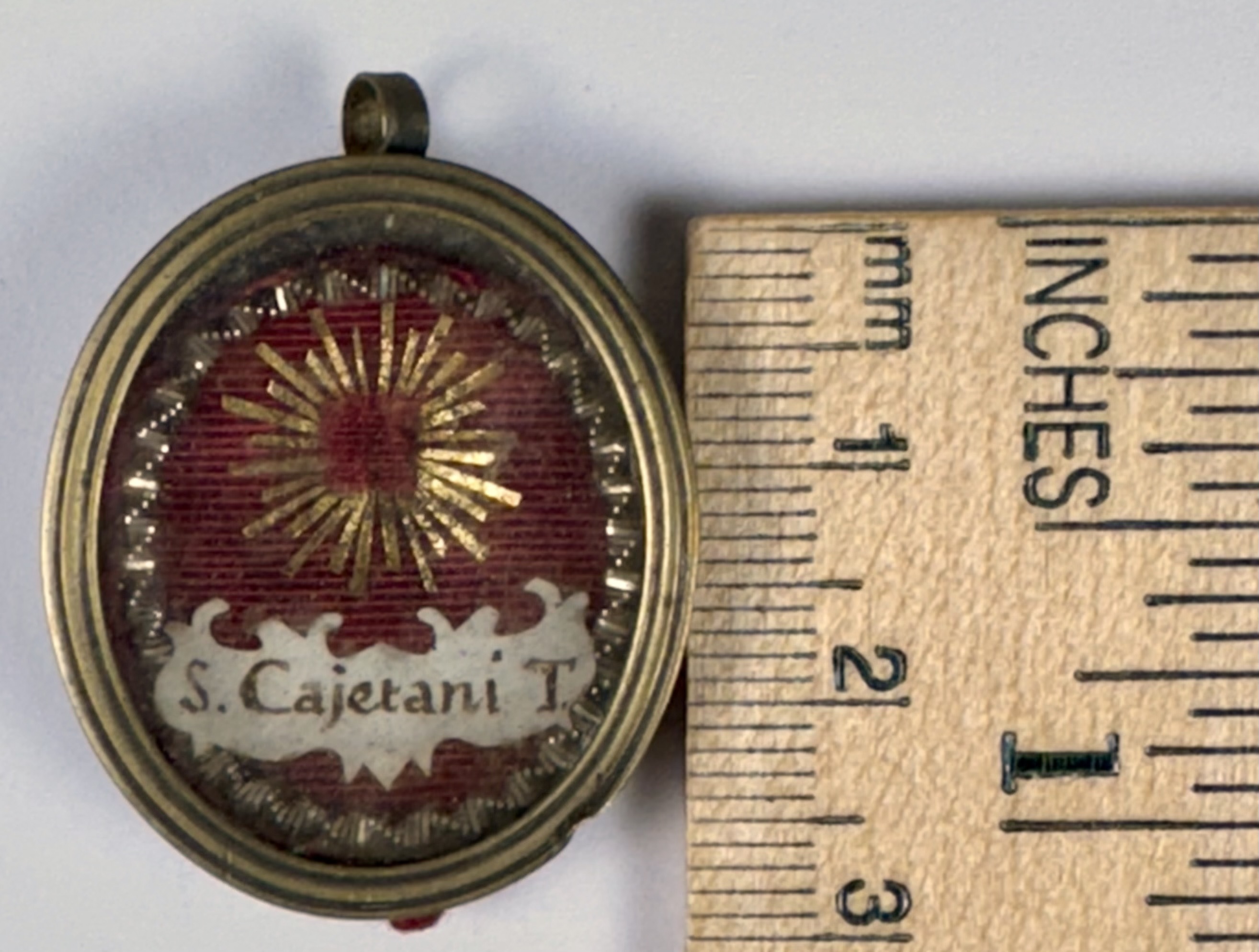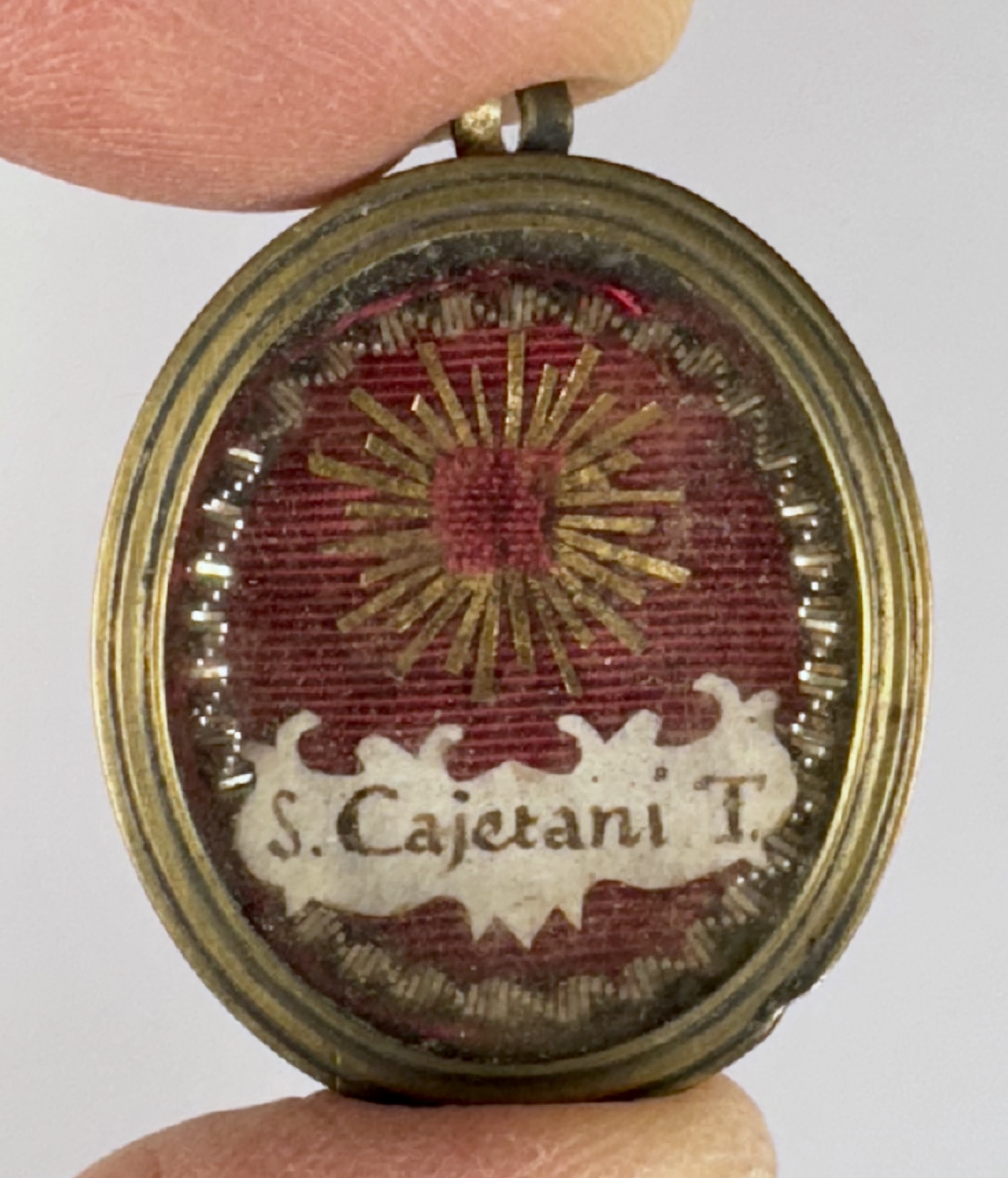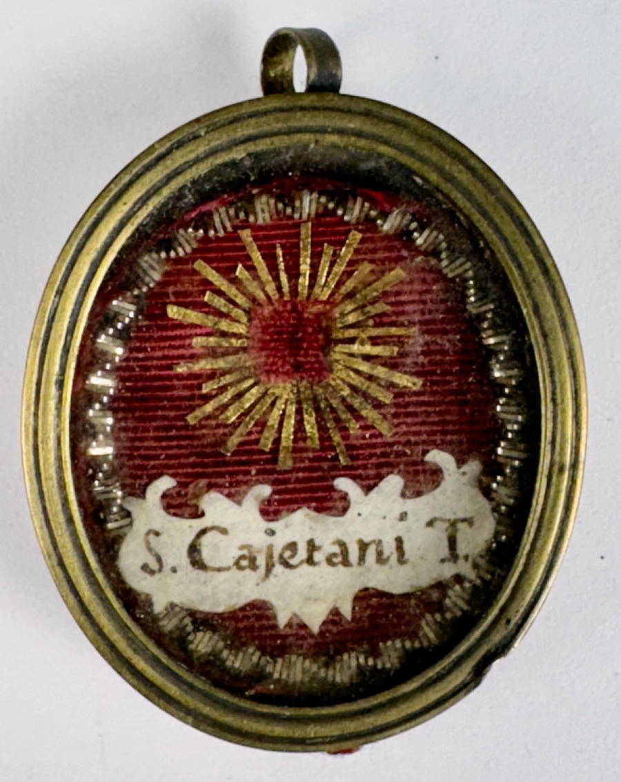 Oval glass-fronted silvered brass pendant reliquary theca housing the second-class relic of St. Gaetano dei Conti di Thiene.  A substantial relic is affixed to a gilt-paper starburst on a ground of red-colored silk, surrounded by silver wire ornamentation, and identified in Latin on a fancy manuscript cedula label as S. Cajetani T.(St. Gaetano [dei Conti di] Thiene). On the back, the theca is secured with a seal of red Spanish wax bearing an imprint of a coat of arms of Francesco Gaetano Incontri (†1781), the Archbishop of Florence (p. 1741-1781), Italy.