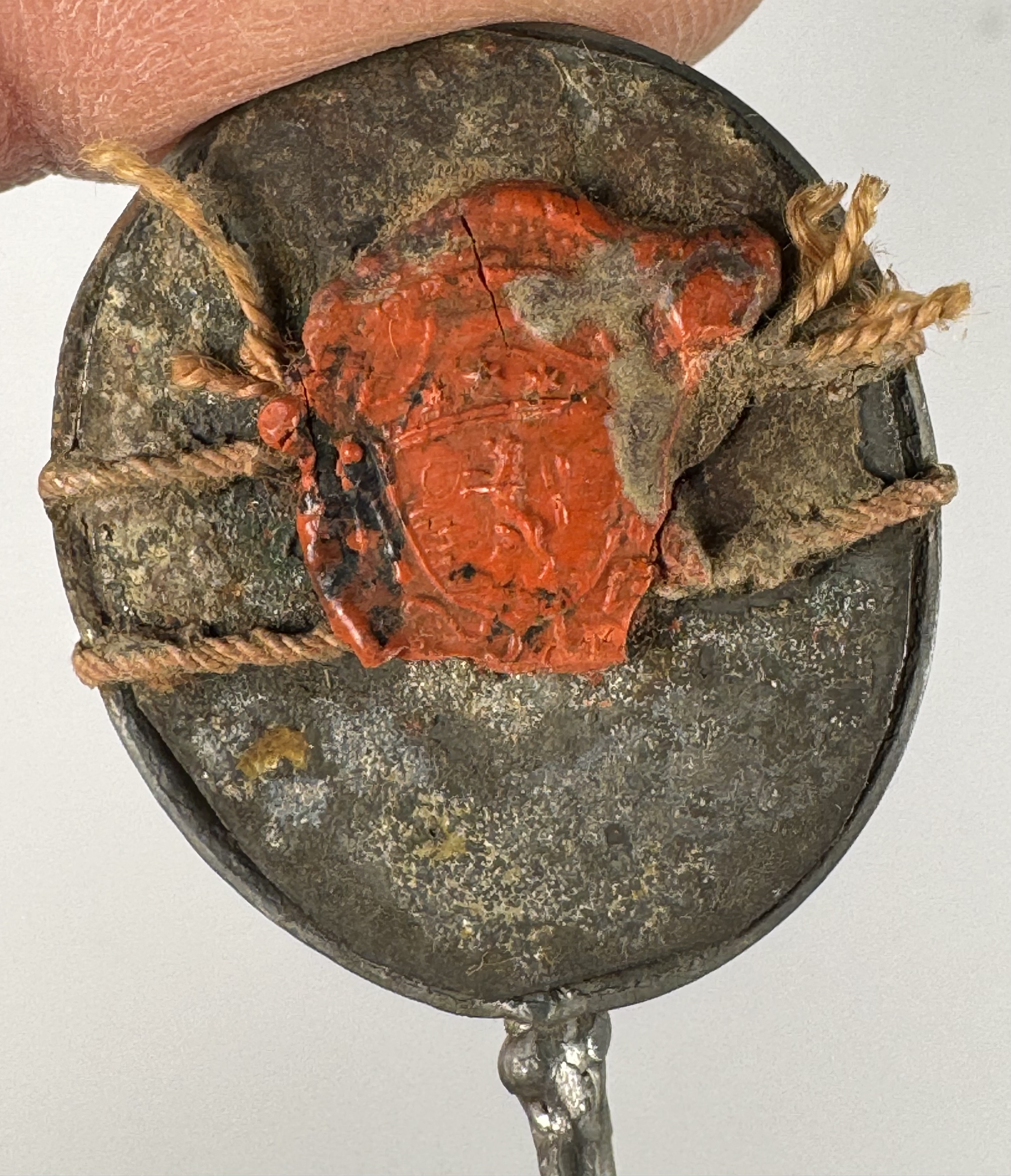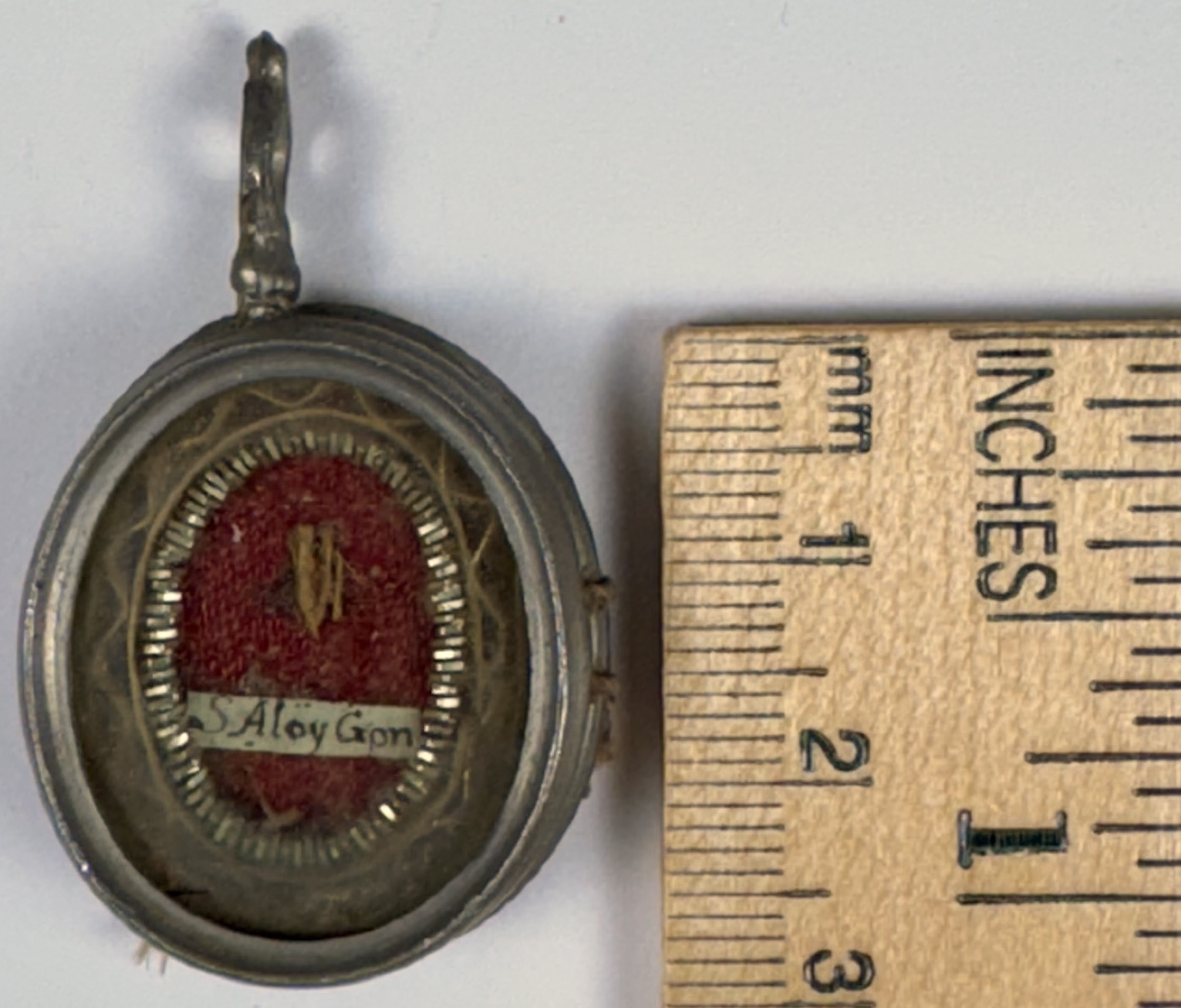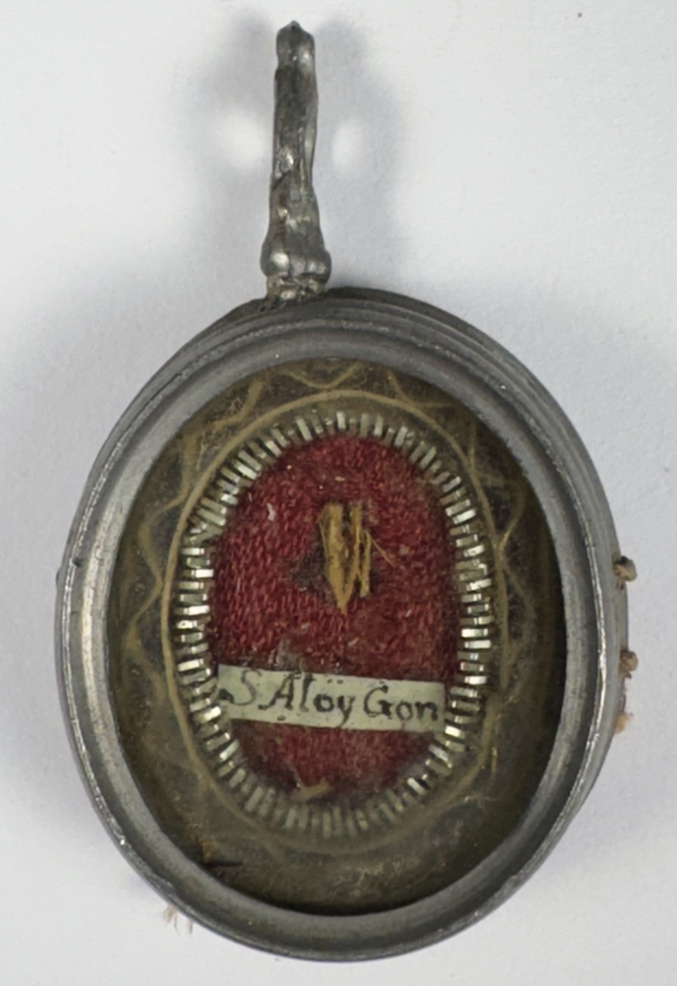 Oval glass-fronted white-metal pendant reliquary theca housing a precious relic of Saint Aloysius Gonzaga.  The relic is affixed to a ground of red-colored silk, surrounded by silver wire and gilt paperolle ornamentation, and identified in Latin on a manuscript cedula label as S. Aloy. Gon.(Saint Aloysius Gonzaga). On the back, the theca is secured with a seal of red Spanish wax bearing an imprint of a coat of arms of Fr. Michele Seri-Molini (†1888), Bishop of Osimo e Cingoli, Italy (1871–1888).
