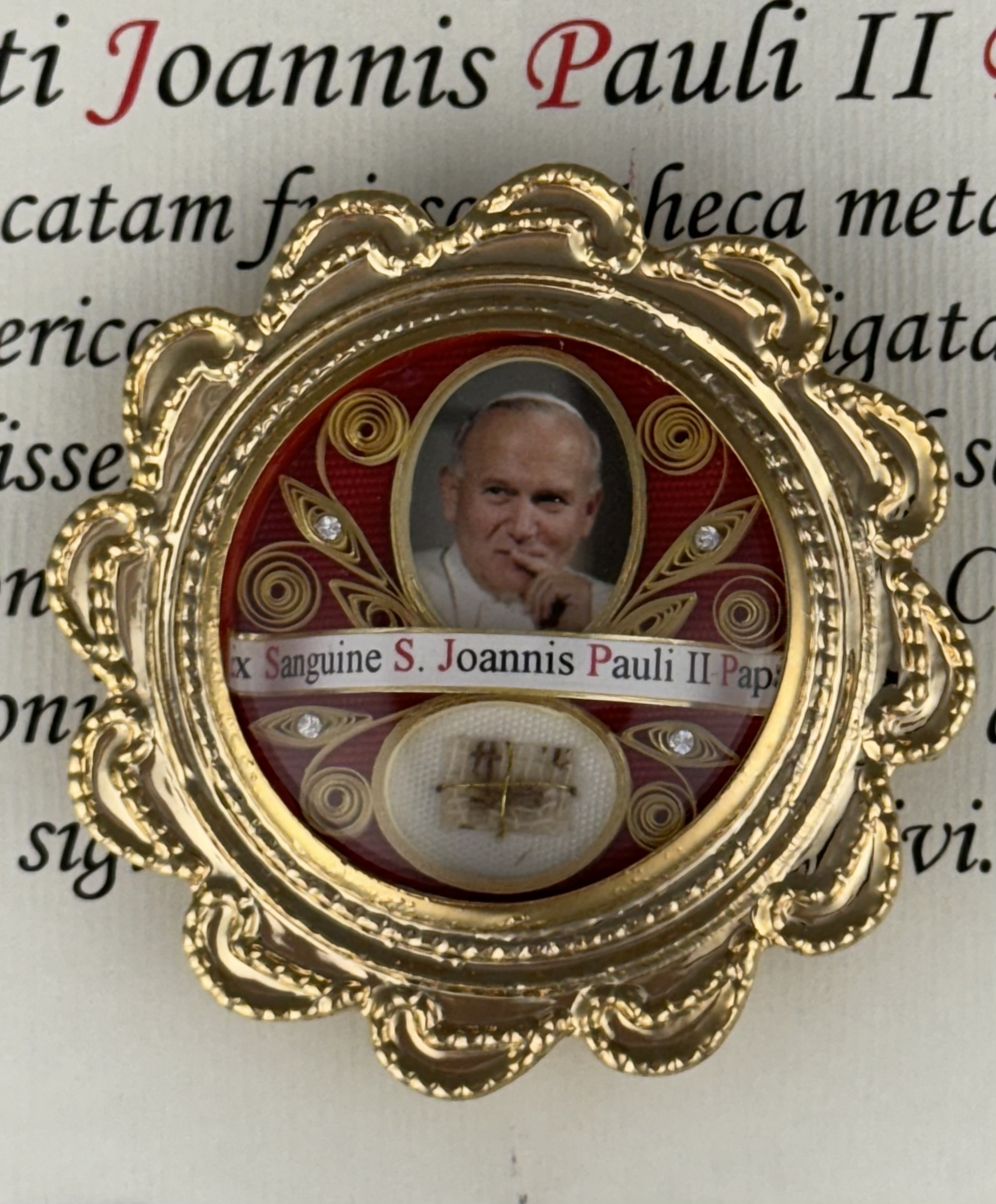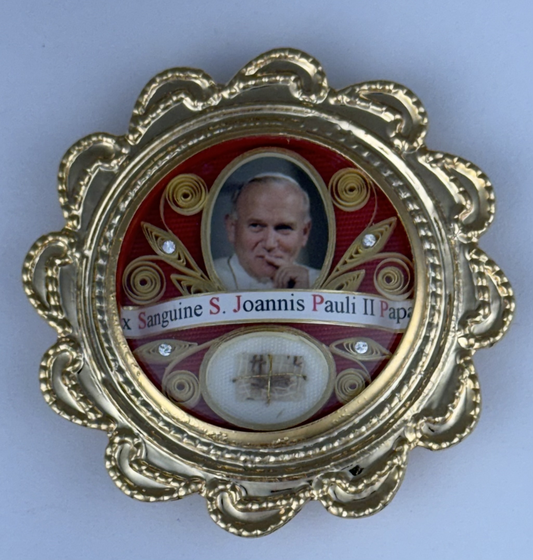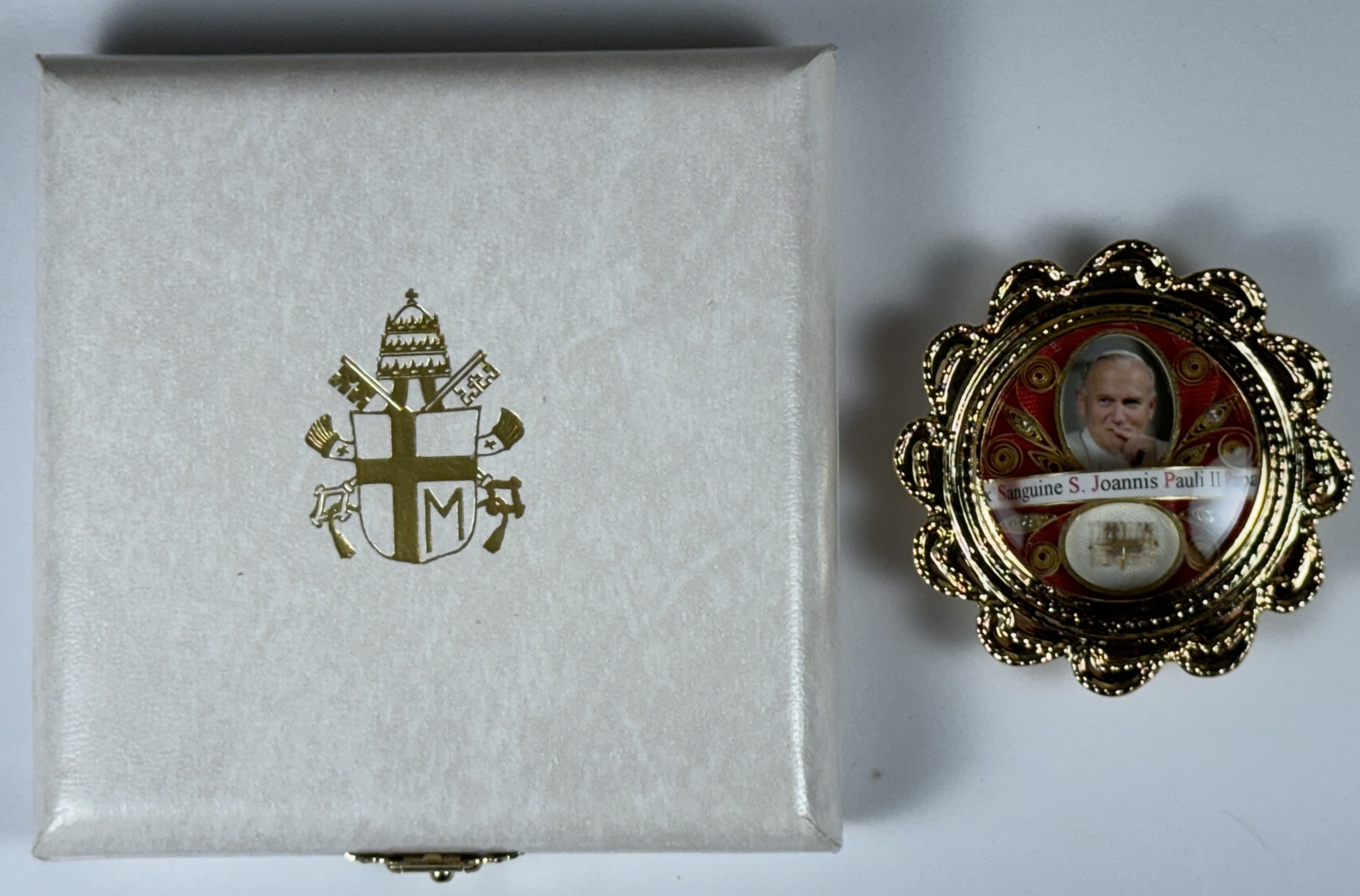 Rare round gilt metal reliquary theca housing the first-class ex sanguine (of the blood) relic of Saint Pope John Paul II. A significant relic is affixed to a red silk ground surrounded by gilt paperolle ornamentation, four crystals and a color portrait of the Saint and identified in Latin on a bi-color typeset cedula label as Ex Sanguine S. Joannis Pauli II Papae. (of the blood of Saint Pope John Paul II).  On the back, under a protective cap, the theca is secured with a seal of red Spanish wax bearing an imprint of a coat of arms of the Postulator General of the Cause for Canonization of  Pope John Paul II. The relic comes in the original case of issue embellished with a coat of arms of Saint Pope John Paul II and is accompanied by an original matching authentics document issued on April 27th of 2014 (the day of his canonization) and signed by Monsignor Slawomir Oder, Postulator General of the Cause for Canonization of  Pope John Paul II.