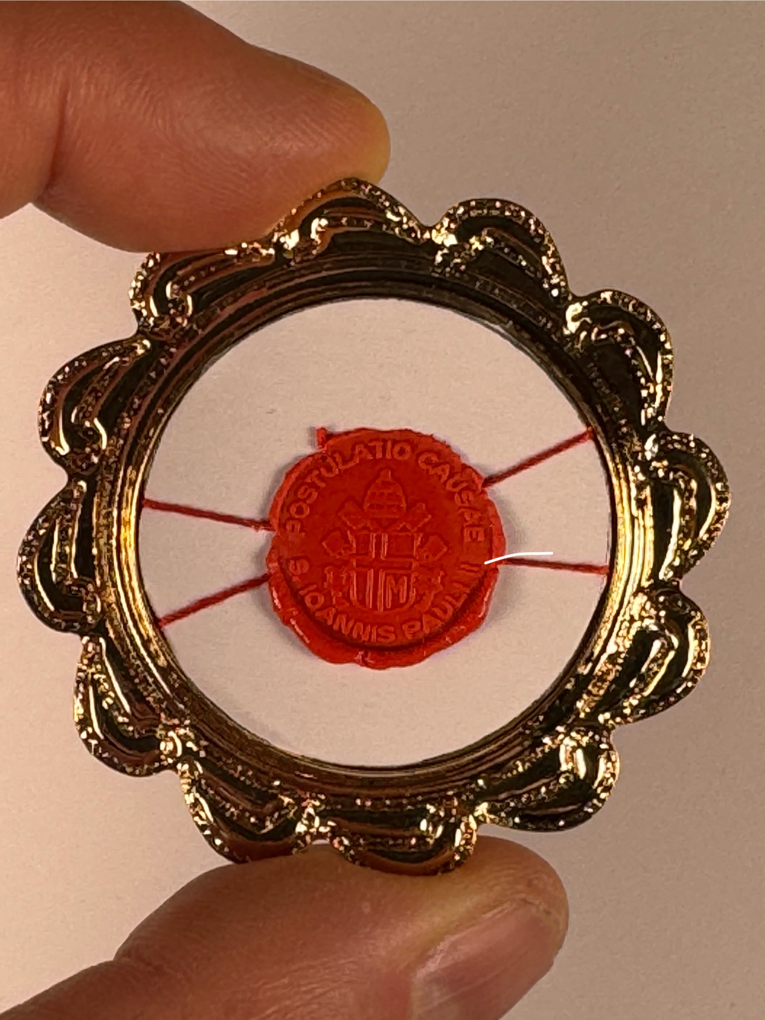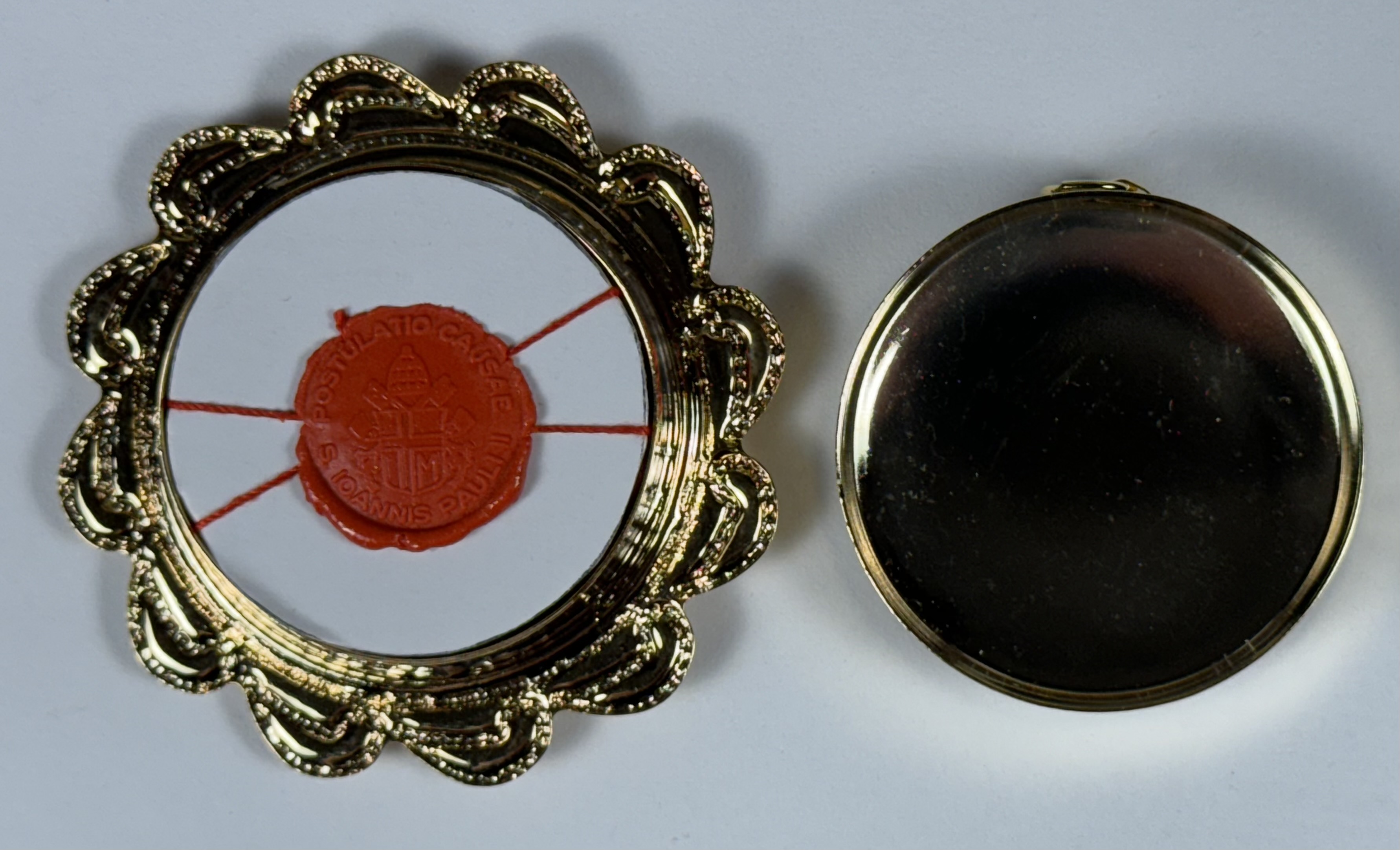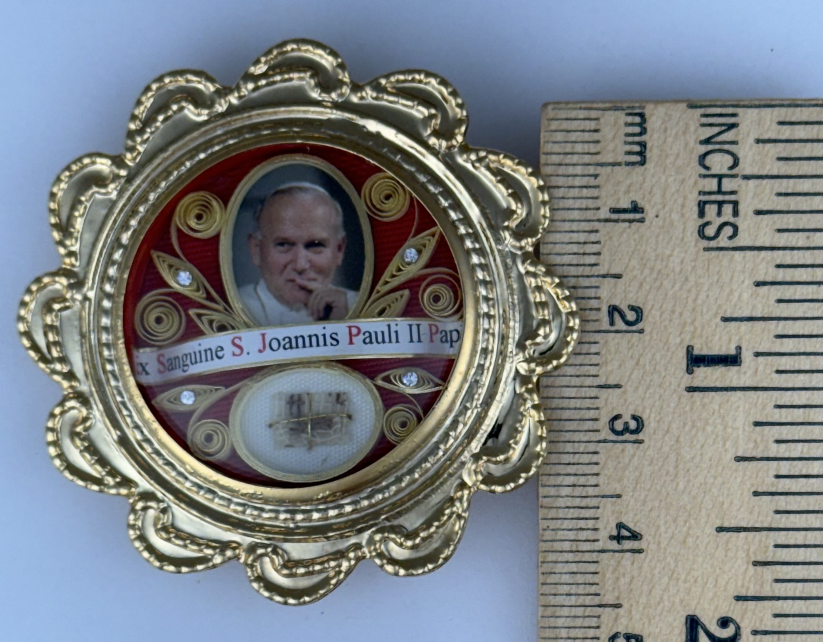 Rare round gilt metal reliquary theca housing the first-class ex sanguine (of the blood) relic of Saint Pope John Paul II. A significant relic is affixed to a red silk ground surrounded by gilt paperolle ornamentation, four crystals and a color portrait of the Saint and identified in Latin on a bi-color typeset cedula label as Ex Sanguine S. Joannis Pauli II Papae. (of the blood of Saint Pope John Paul II).  On the back, under a protective cap, the theca is secured with a seal of red Spanish wax bearing an imprint of a coat of arms of the Postulator General of the Cause for Canonization of  Pope John Paul II. The relic comes in the original case of issue embellished with a coat of arms of Saint Pope John Paul II and is accompanied by an original matching authentics document issued on April 27th of 2014 (the day of his canonization) and signed by Monsignor Slawomir Oder, Postulator General of the Cause for Canonization of  Pope John Paul II.
