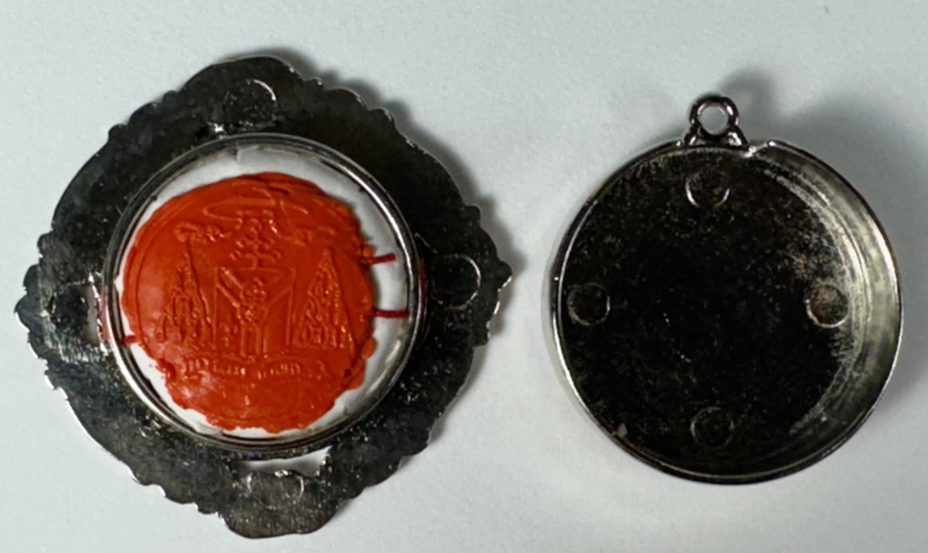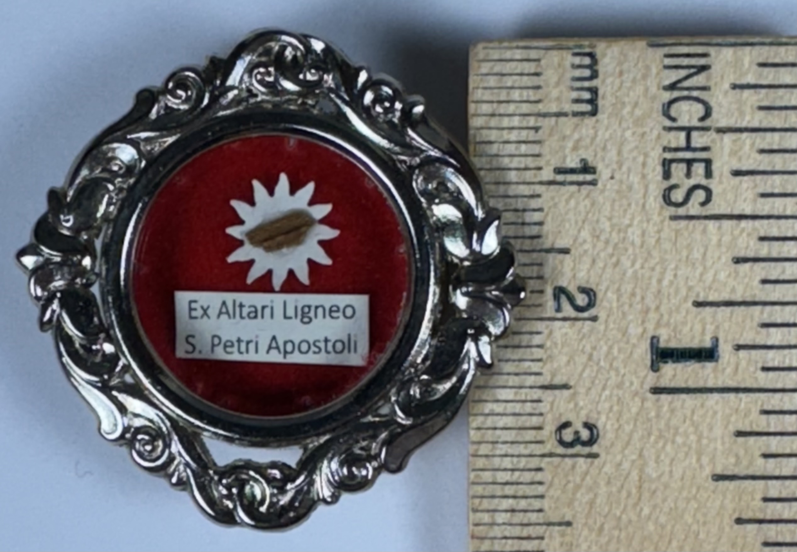Round white-metal reliquary theca housing extremely rare precious relic of the wood from the Altar, Saint Peter, the Apostle preached from during his lifetime. A relic is affixed to a paper starburst on the red silk ground and identified in Latin on a typeset cedula label as Ex Altari Ligneo S. Petri Apostoli. (of the wood of the Altar of the Saint Peter, the Apostle). On the back, under a protective cap, the theca is secured with a seal of red Spanish wax bearing an imprint of a coat of arms of Archbishop Washington Cruz C.P. (born 25 May 1946) Archbishop of Goiânia, Brazil. The theca is accompanied by the matching authentics document issued and signed by Monsignor Cruz on June 29th, 2004, the day of the liturgical Feast of Saints Peter and Paul.