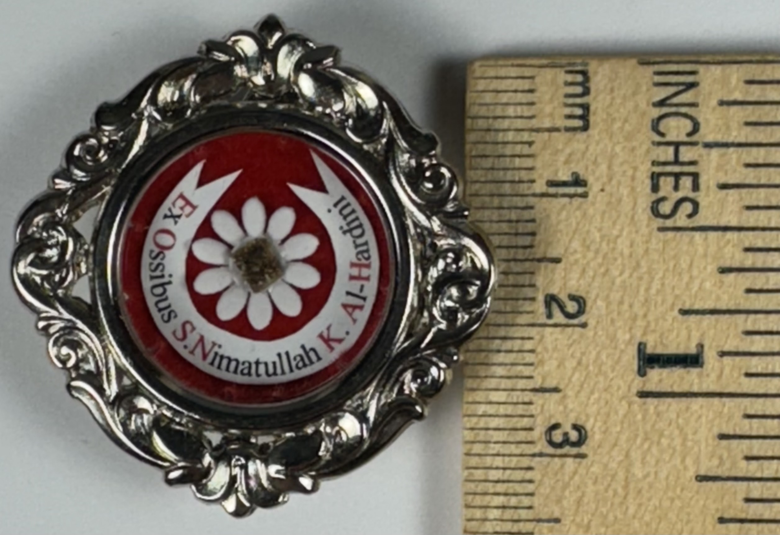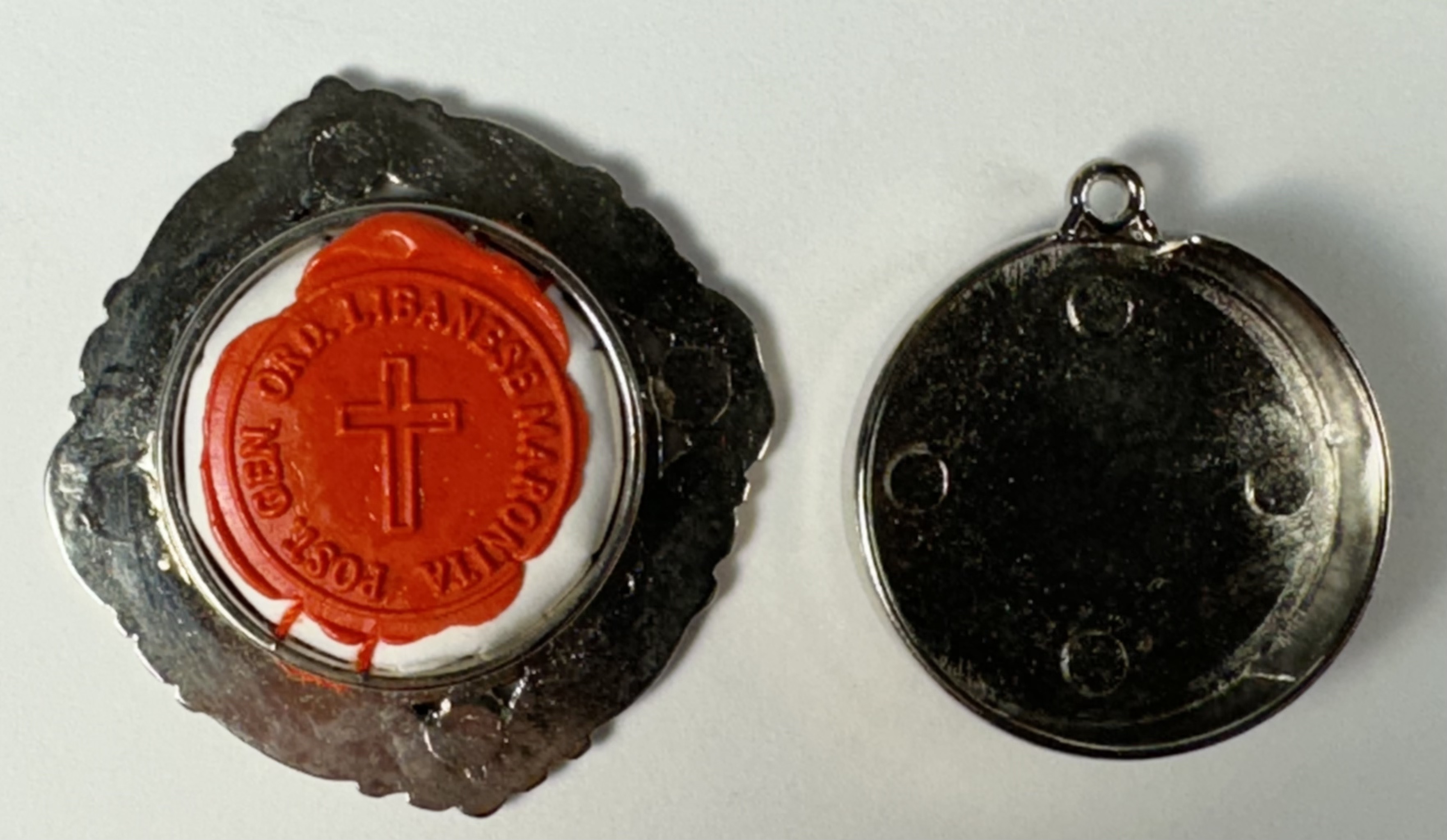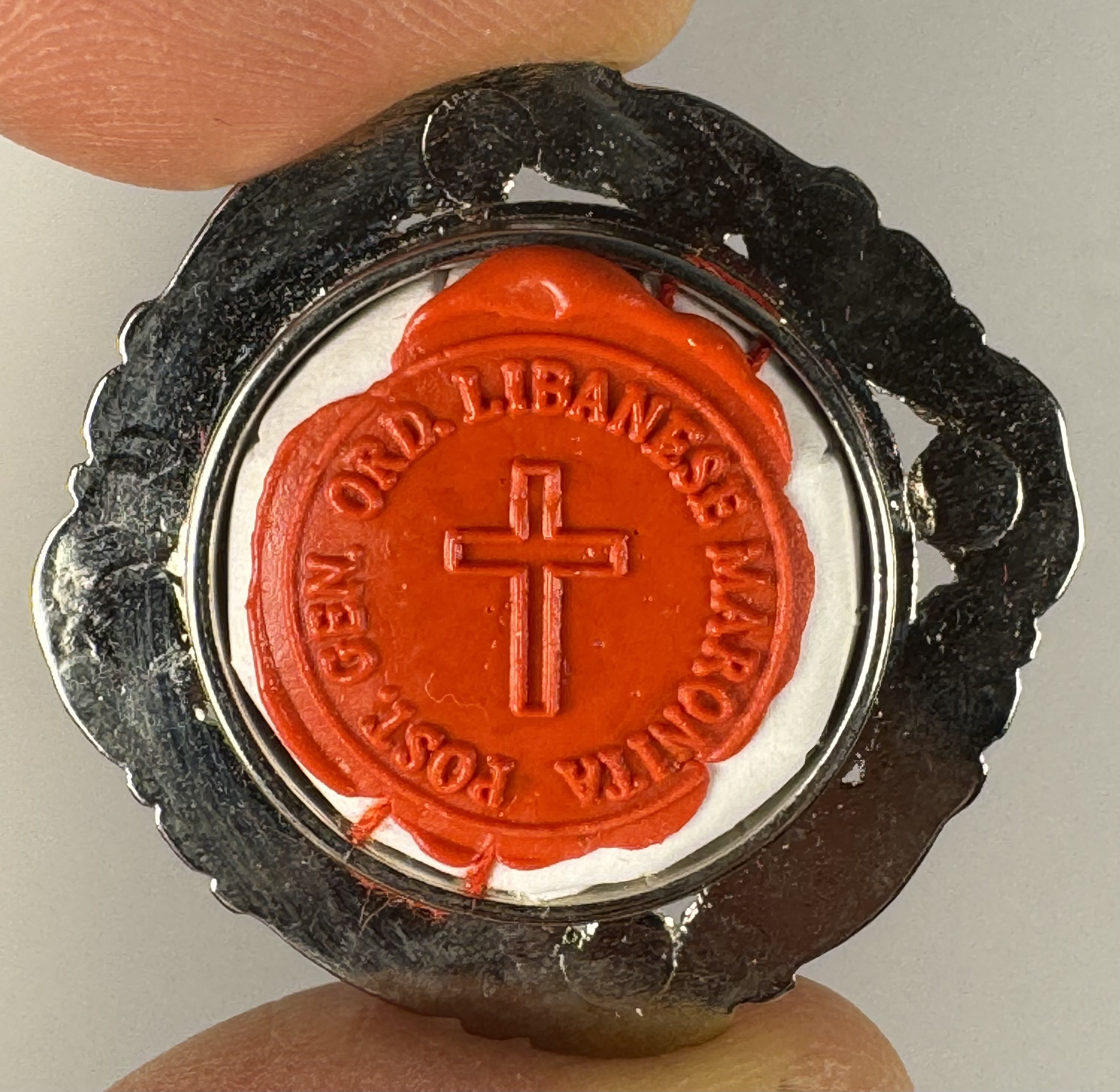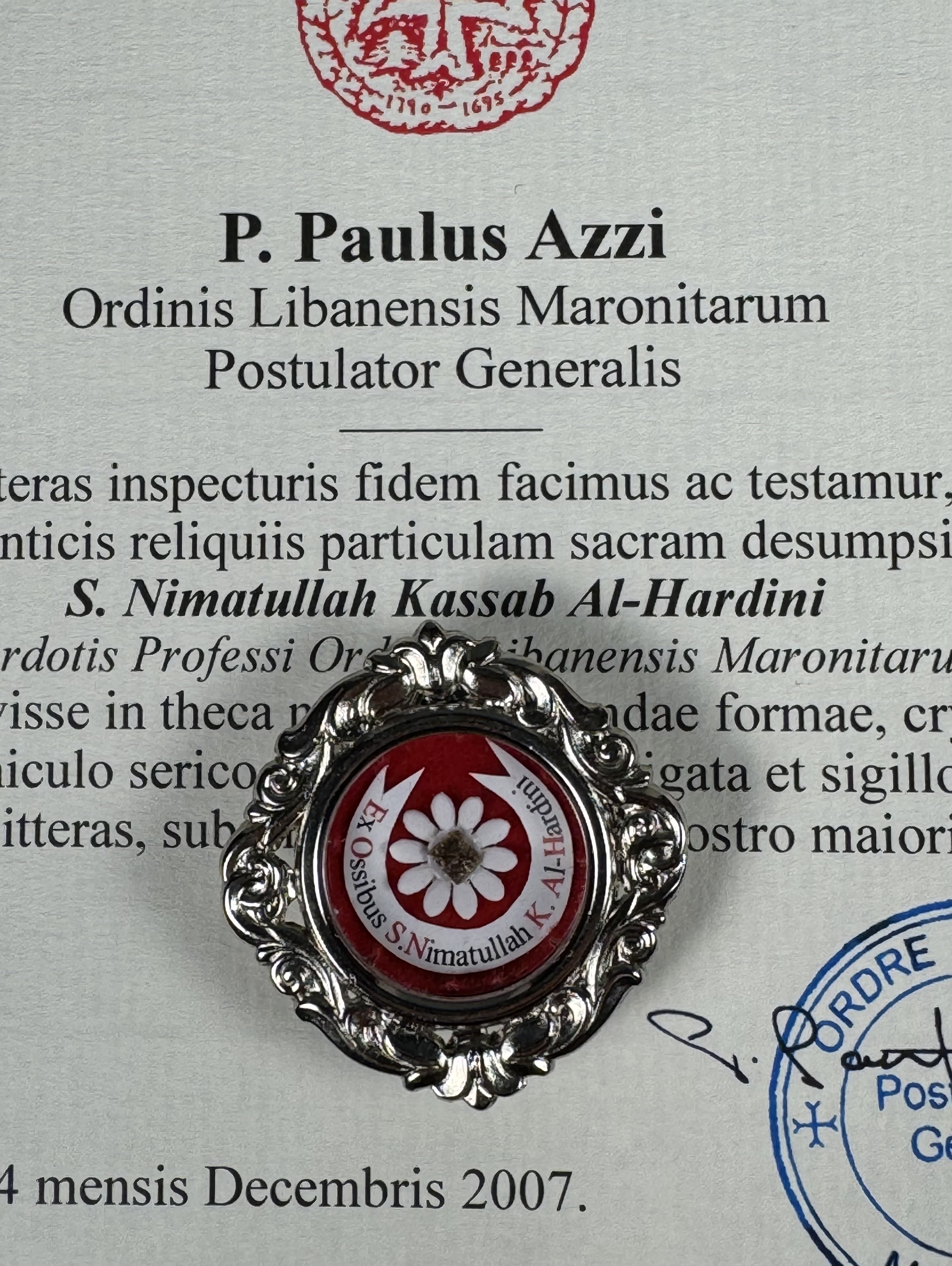 Rare round white-metal reliquary theca housing the first-class ex ossibus (of the bone) relic of a Maronite Saint Nimatullah Kassab Al-Hardini. A relic is affixed to a petalled-flower-shaped paper on a red silk ground and identified in Latin on a bi-color typeset cedula label as Ex Ossibus S. Nimatullah K. Al-Hardini (of the bone of Saint Nimatullah Kassab Al-Hardini). On the back, under a protective cap, the theca is secured with a seal of red Spanish wax bearing an imprint of a coat of arms of the Postulator General of the Lebanese Maronite Order. The theca is accompanied by the matching authentics document issued and signed by the Postulator General on December 14th, 2007 (the day of his Feast).