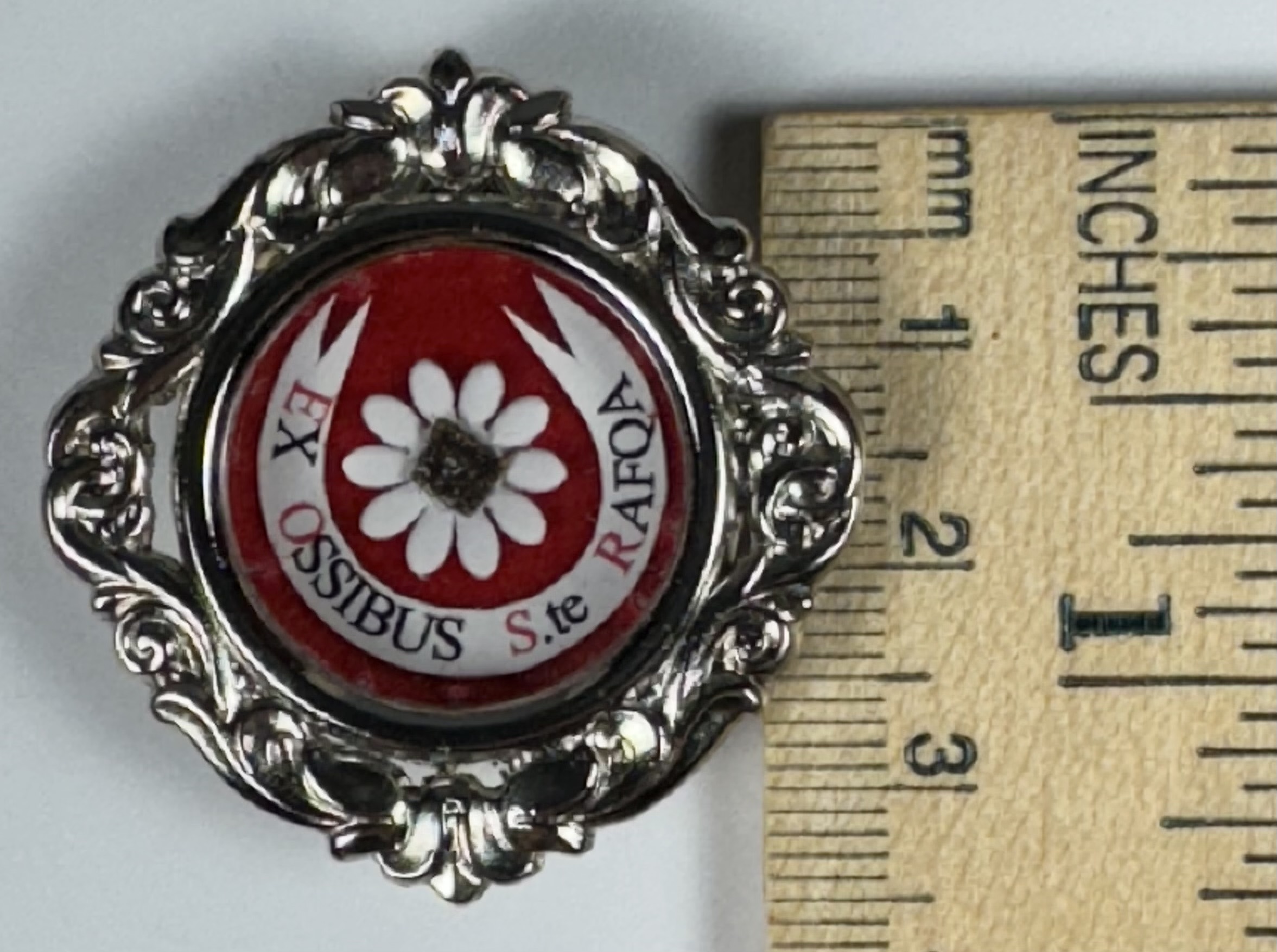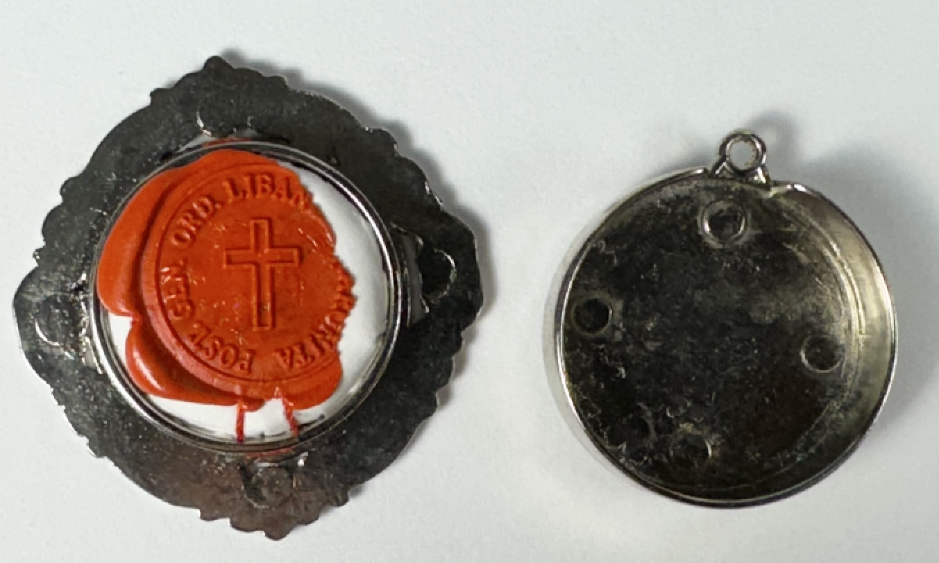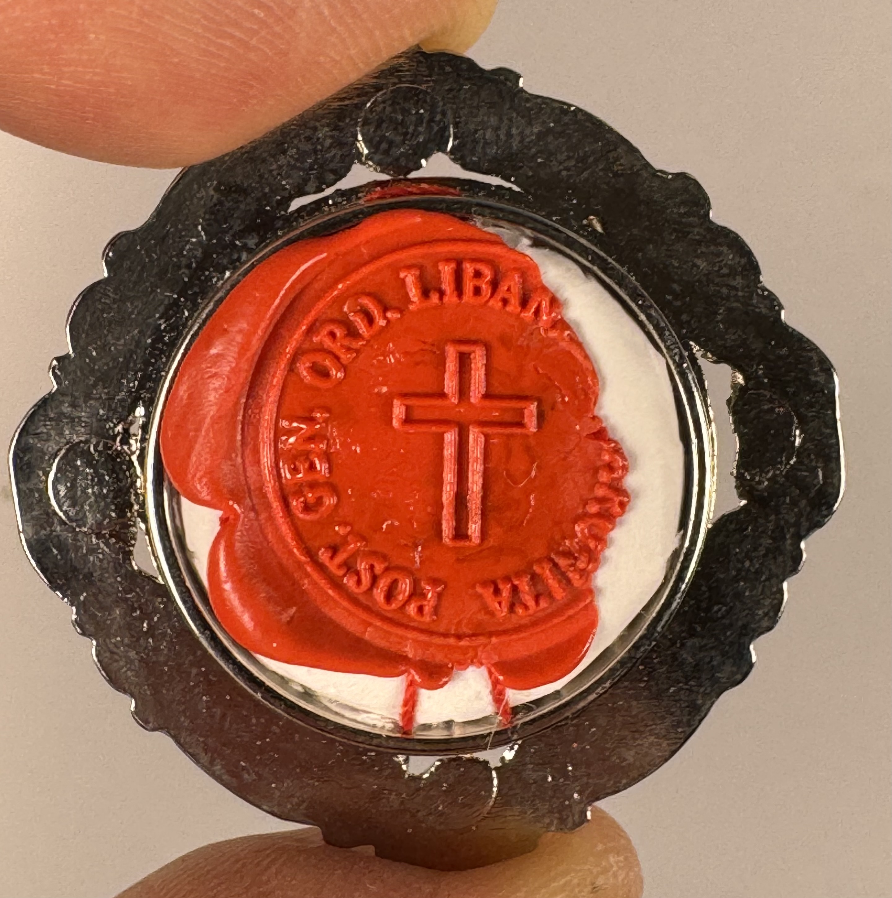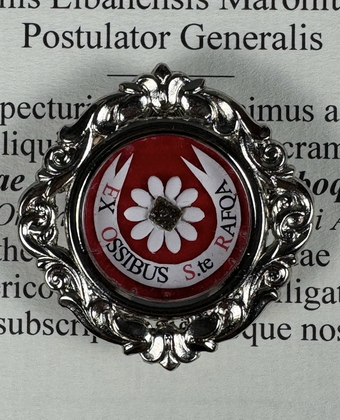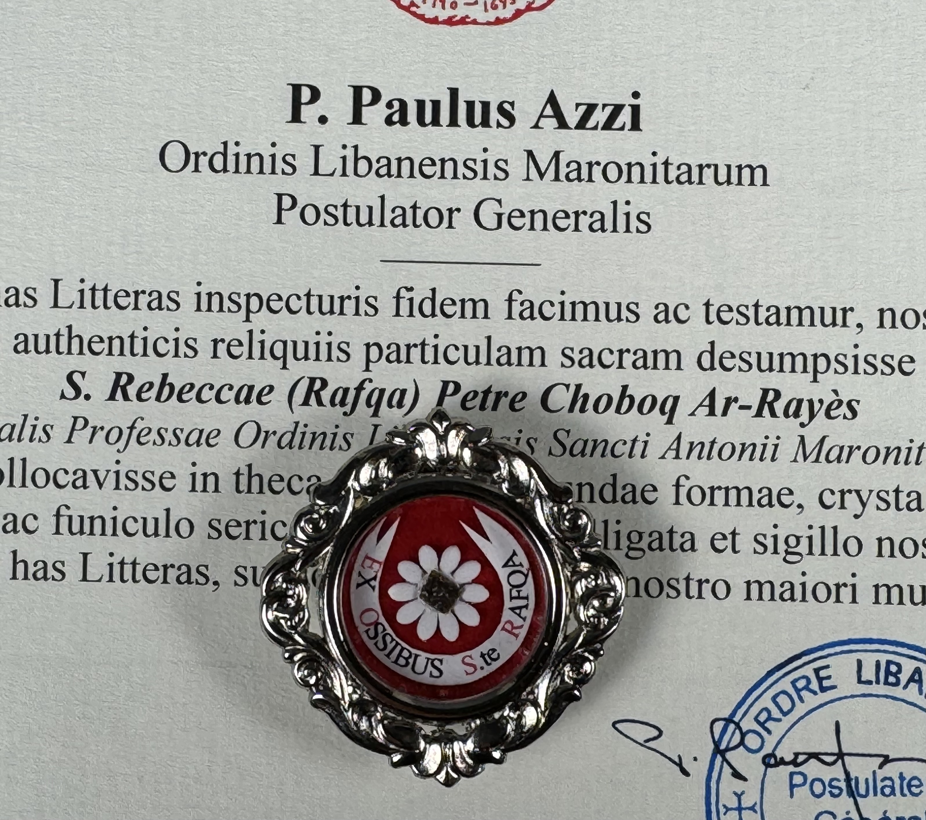 Rare round white-metal reliquary theca housing the first-class ex ossibus (of the bone) relic of a Maronite Saint Rafqa Pietra Chobok. A relic is affixed to a petalled-flower-shaped paper on a red silk ground and identified in Latin on a bi-color typeset cedula label as Ex Ossibus Ste. Rafqa (of the bone of Saint Rafqa). On the back, under a protective cap, the theca is secured with a seal of red Spanish wax bearing an imprint of a coat of arms of the Postulator General of the Lebanese Maronite Order. The theca is accompanied by the matching authentics document issued and signed by the Postulator General on June 10th, 2005 (the anniversary day of her canonization).