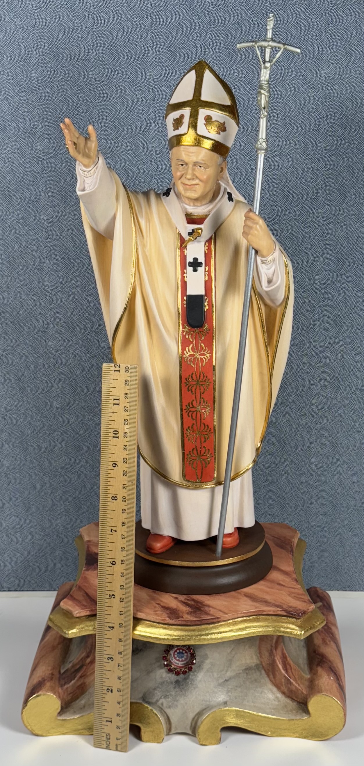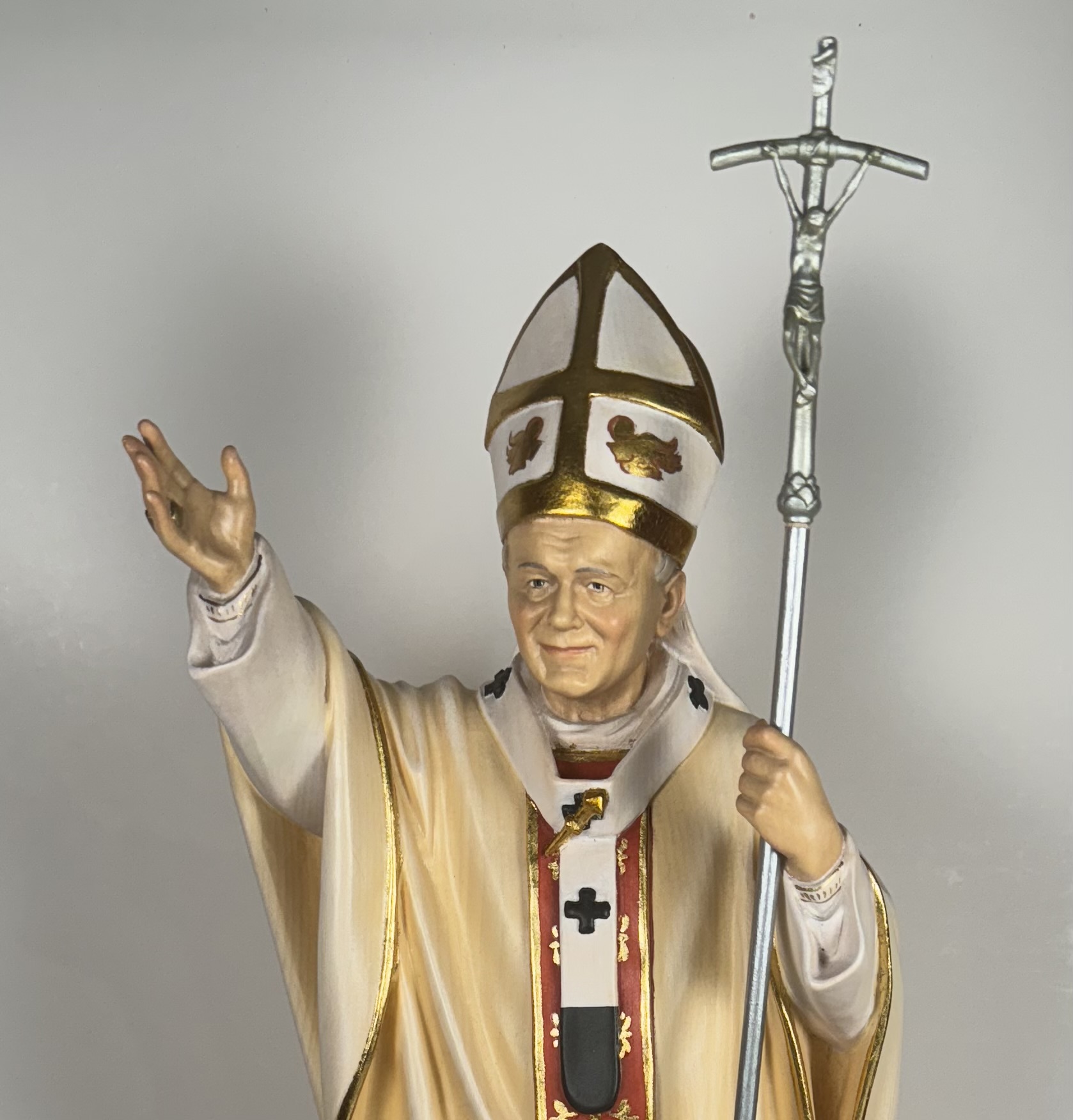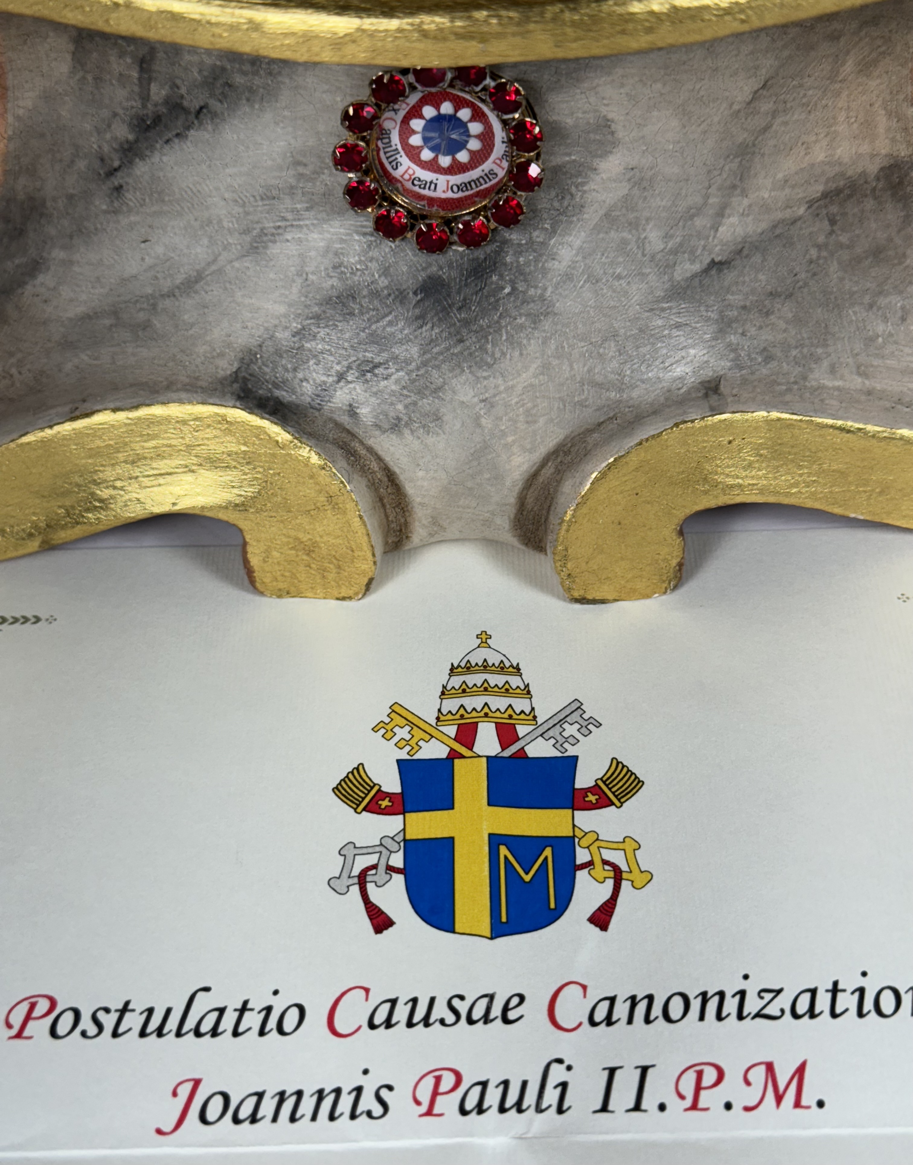 Extremely rare realistically rendered hand-painted wooden reliquary statue housing the first-class ex capillis (of the hair) pre-canonization relic of Saint Pope John Paul II. A relic, comprised of several small strands of hair, is housed in a round, removable red crystal encrusted brass theca inserted into the base of the statue. Inside the theca, the precious relics are affixed to a red silk ground and identified in Latin on a bi-color typeset cedula label as Ex Capillis Beati Joannis Pauli II Papae. (of the hair of the Blessed Pope John Paul II).  On the back, under a protective cap, the theca is secured with a seal of red Spanish wax bearing an imprint of a coat of arms of the Postulator General of the Cause for Canonization of  Pope John Paul II. The reliquary statue is accompanied by an original matching authentics document issued on May 1st 2011 (the day of his beatification) and signed by Monsignor Slawomir Oder, Postulator General of the Cause for Canonization of  Pope John Paul II.
