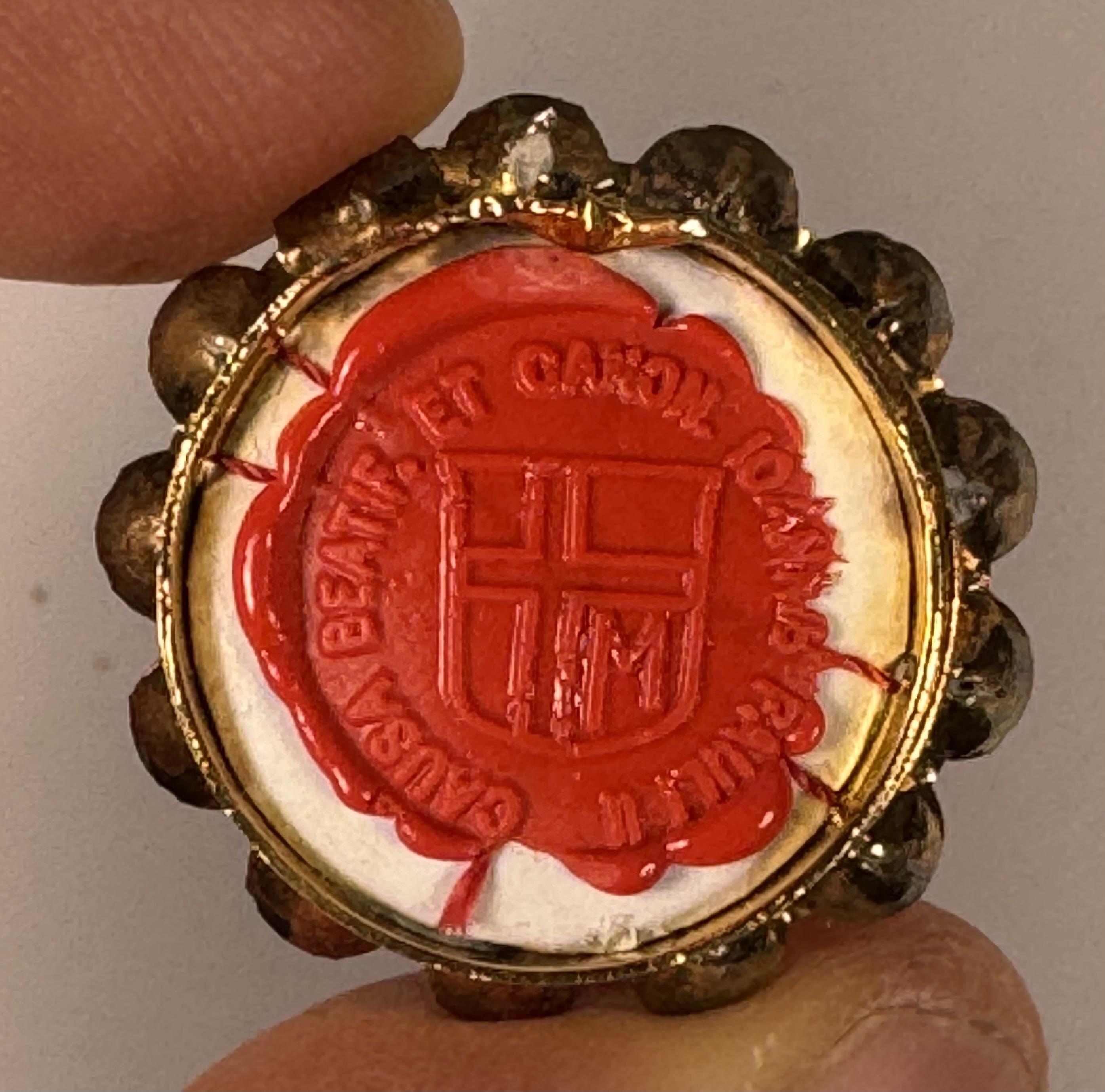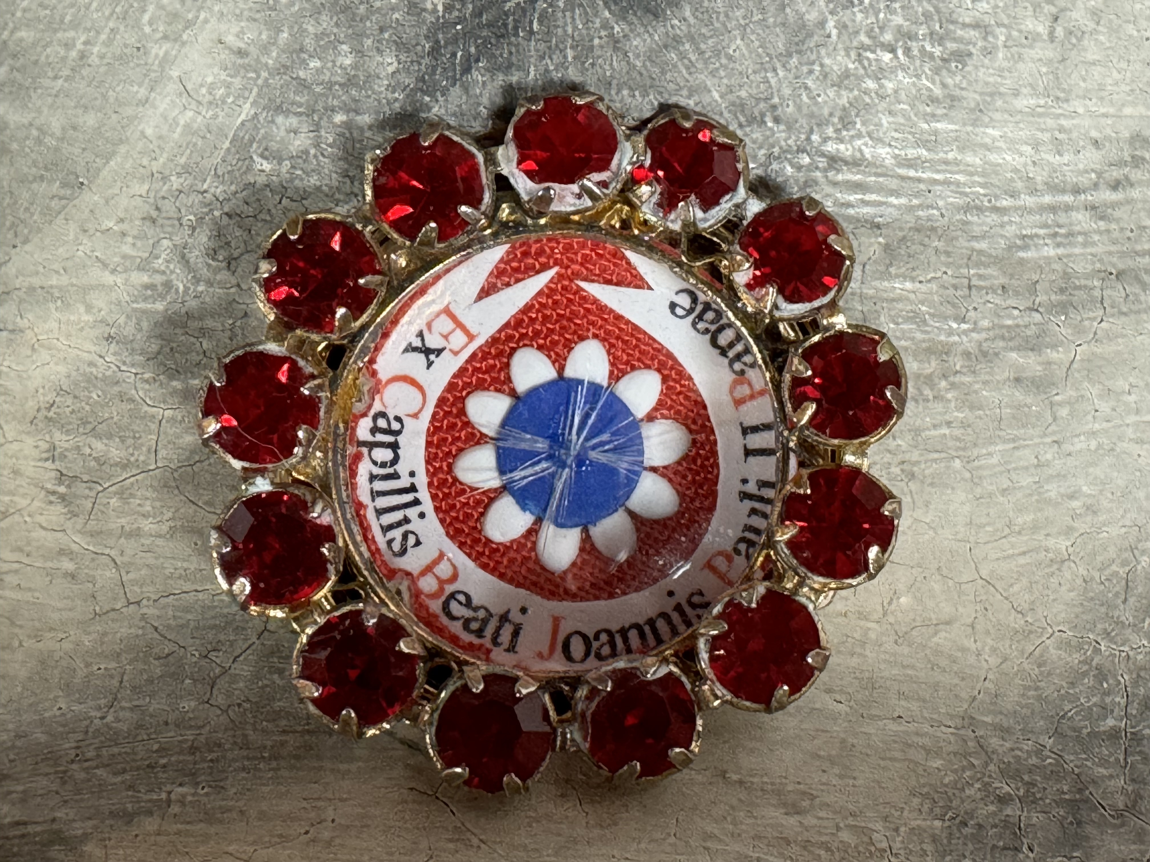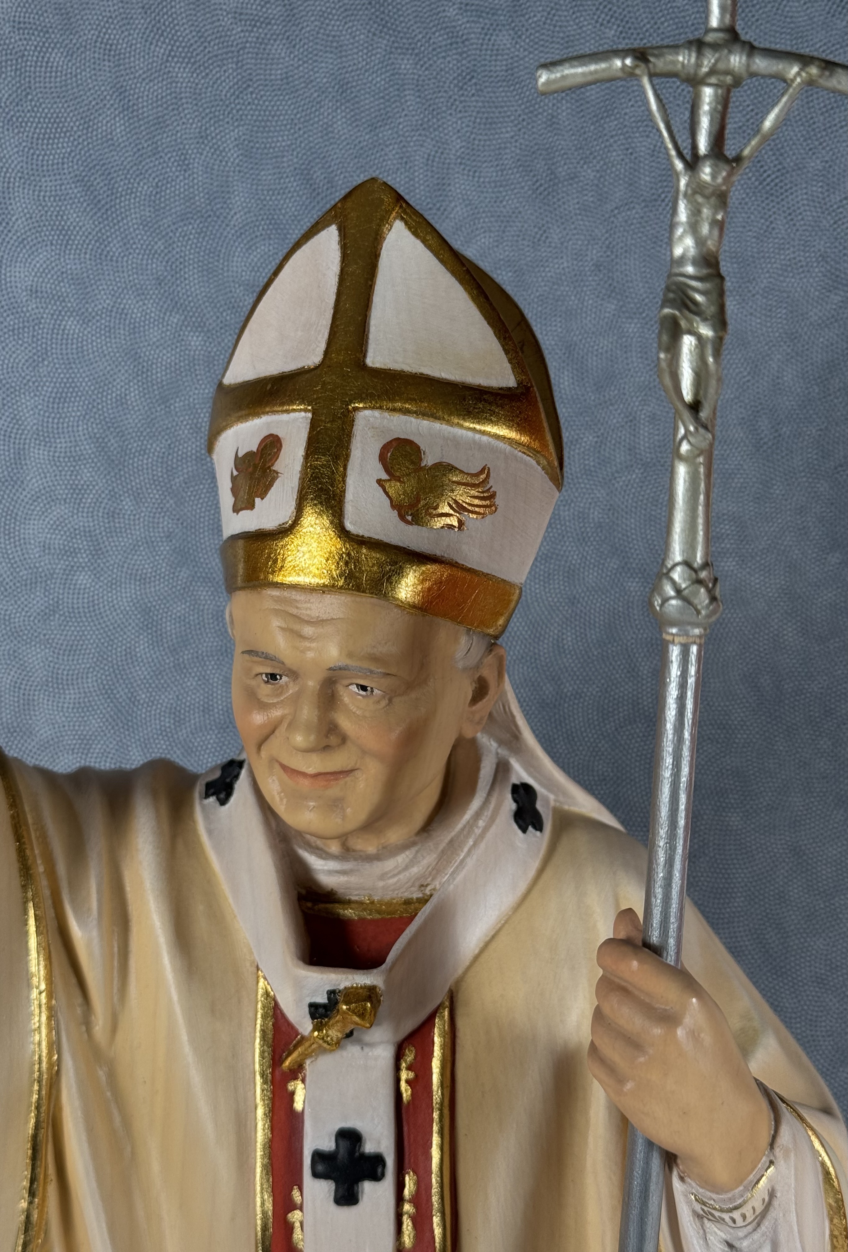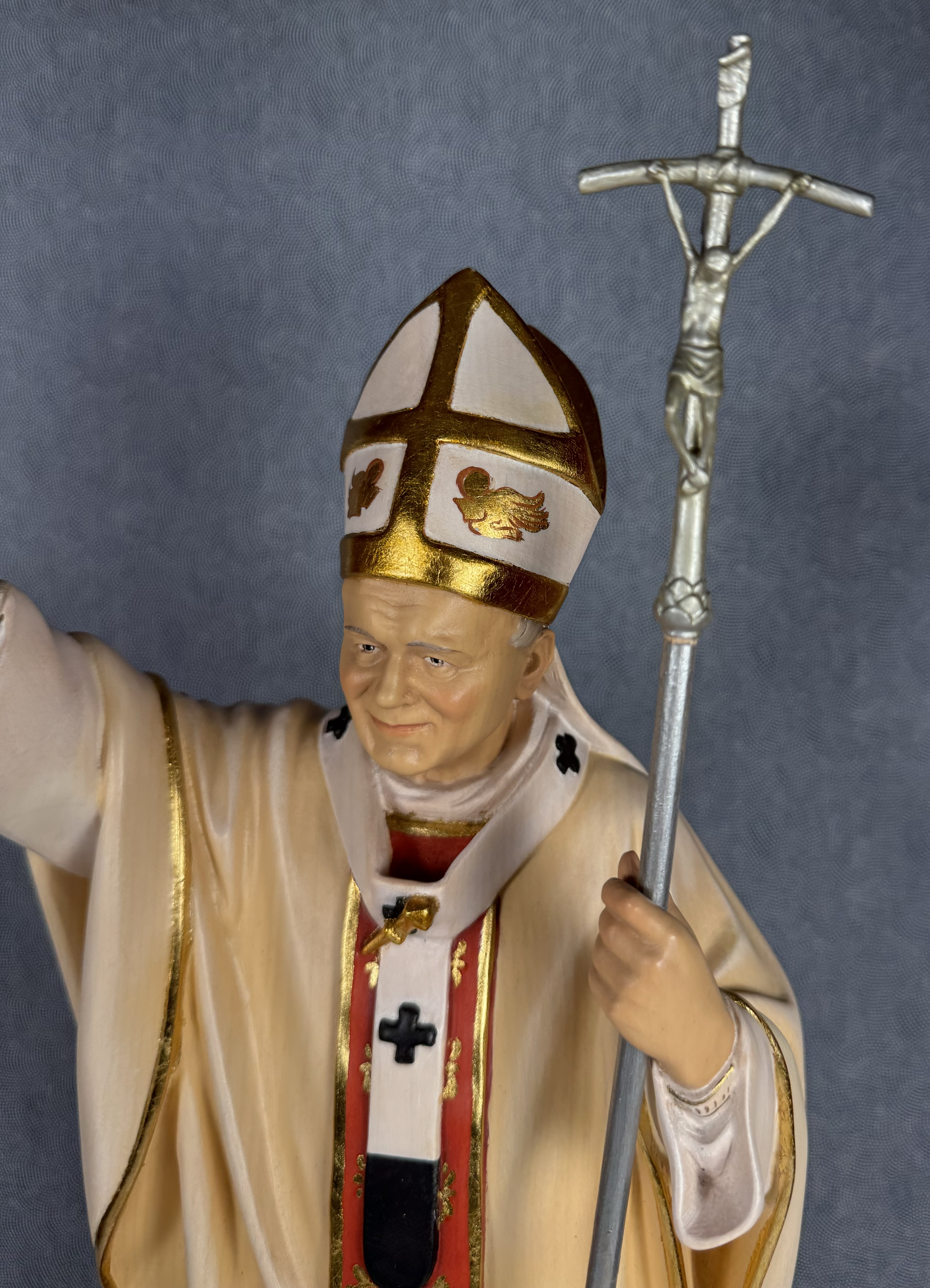 Extremely rare realistically rendered hand-painted wooden reliquary statue housing the first-class ex capillis (of the hair) pre-canonization relic of Saint Pope John Paul II. A relic, comprised of several small strands of hair, is housed in a round, removable red crystal encrusted brass theca inserted into the base of the statue. Inside the theca, the precious relics are affixed to a red silk ground and identified in Latin on a bi-color typeset cedula label as Ex Capillis Beati Joannis Pauli II Papae. (of the hair of the Blessed Pope John Paul II).  On the back, under a protective cap, the theca is secured with a seal of red Spanish wax bearing an imprint of a coat of arms of the Postulator General of the Cause for Canonization of  Pope John Paul II. The reliquary statue is accompanied by an original matching authentics document issued on May 1st 2011 (the day of his beatification) and signed by Monsignor Slawomir Oder, Postulator General of the Cause for Canonization of  Pope John Paul II.