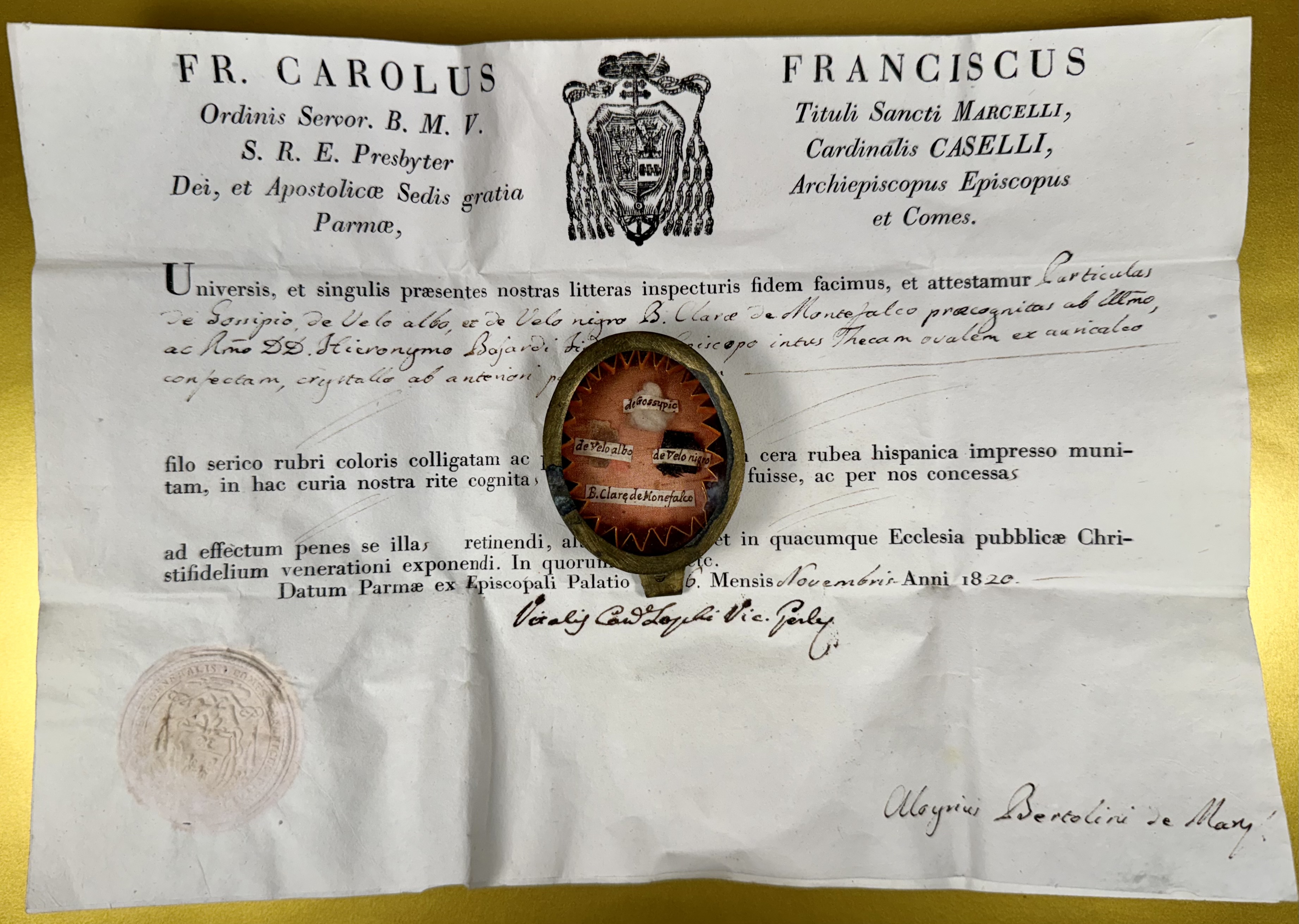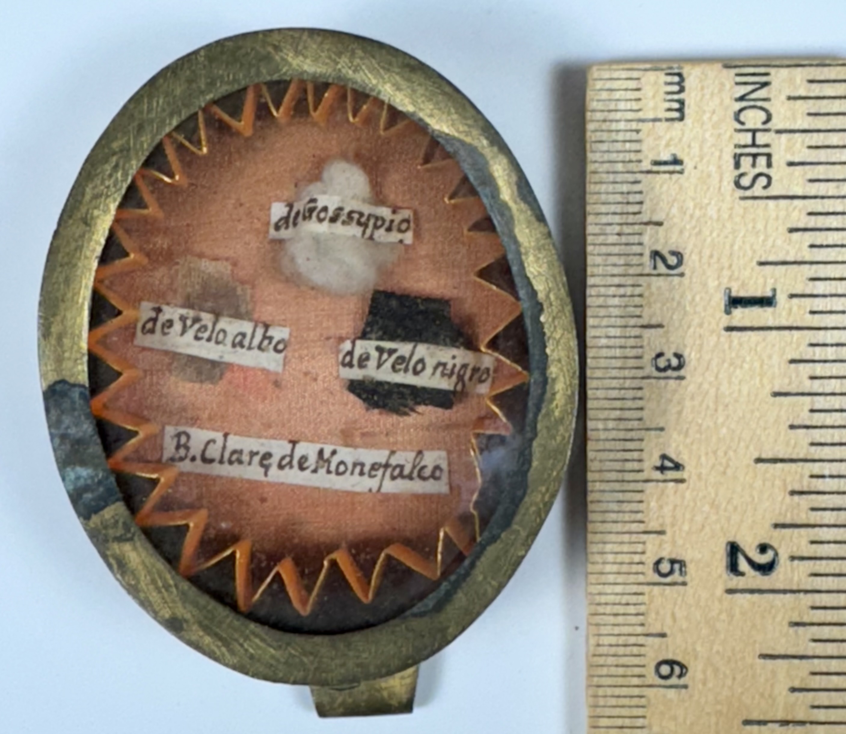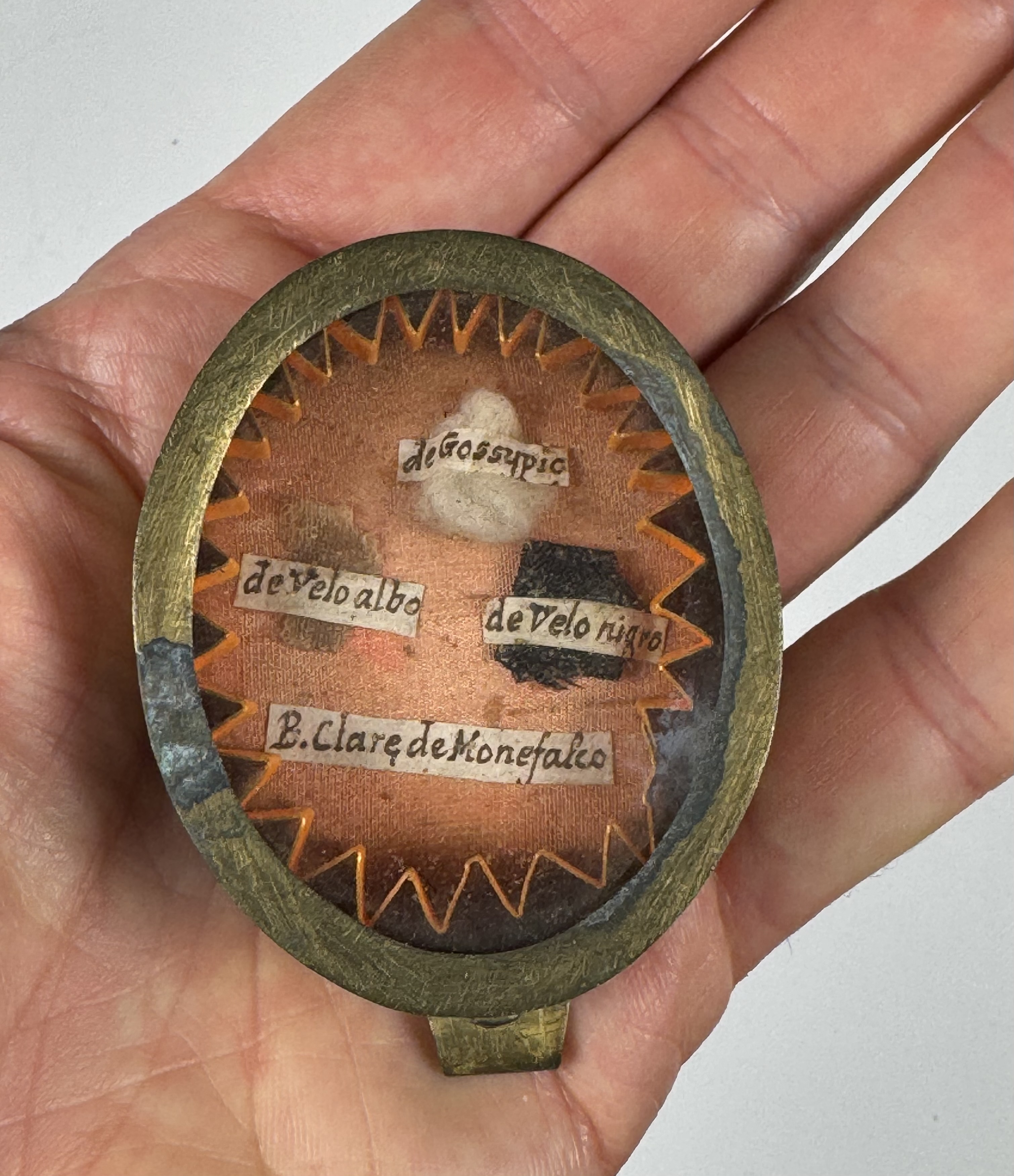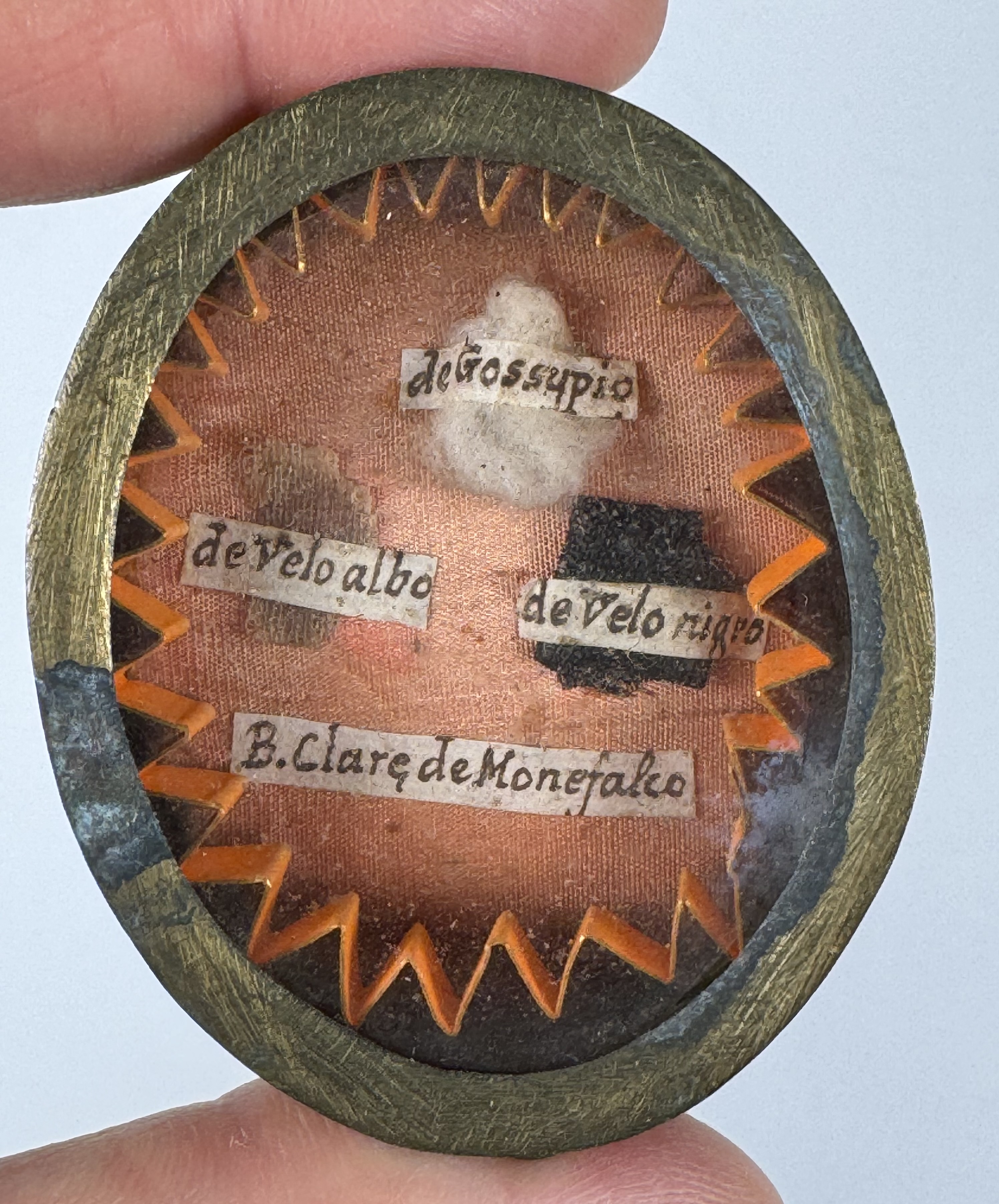 Saint Clare of Montefalco (†1308), also called Saint Clare of the Cross, was an Augustinian nun and abbess. Before becoming a nun, Clare was a member of the Third Order of St. Francis (Secular). In 1294, during the celebration of the Epiphany, she fell into ecstasy and remained in that state for several weeks. Since she was unable even to eat during this period, the other nuns sustained Clare's life by feeding her sugar water. During this time, Clare reported having a vision in which she saw herself being judged in front of God. Immediately following Clare's death, her heart was removed from her body, and upon inspection, it was reported that symbols of Christ's passion, a crucifix, and a scourge were found within her heart. She was beatified in 1737 and canonized by Pope Leo XIII on December 8, 1881. Her feast is commemorated on August 17.