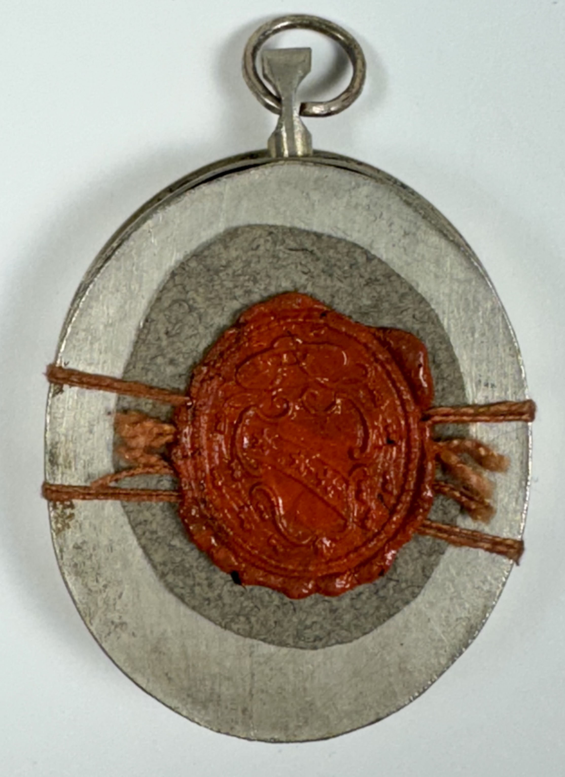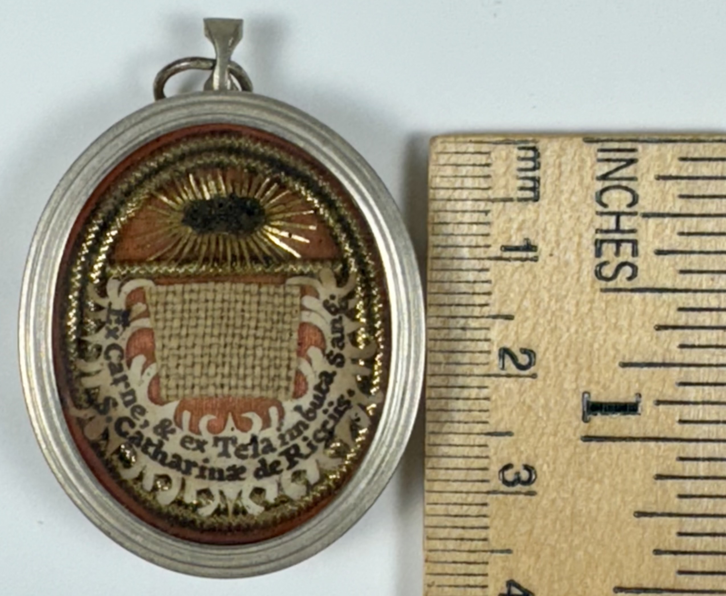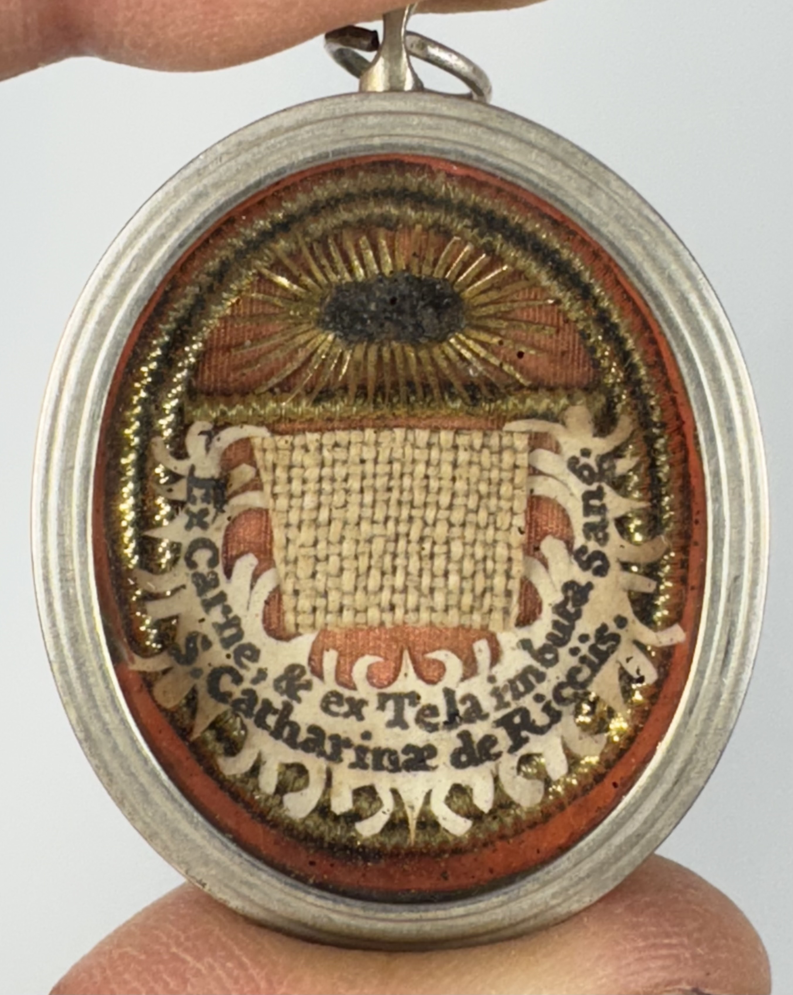 Oval glass-fronted silver pendant reliquary theca housing the first-class ex carne (of the flesh) and ex tela imbuta sanguine (of the cloth soaked in blood) relics of Saint Catherine de' Ricci. The relics are affixed to a gilt paper starburst on a ground of salmon-colored silk, surrounded by silver wire ornamentation, and identified in Latin on a fancy manuscript cedula label as ex carne & ex tela imbuta sang. / S. Catahrinae de Ricciis,(of the flesh and of the cloth soaked in blood of Saint Catherine de' Ricci). On the back, the theca is secured with a seal of red Spanish wax bearing an imprint of a coat of arms of Fr. Francesco Maria Ginori (†1775), Bishop of Fiesole, Italy (1736–1775).