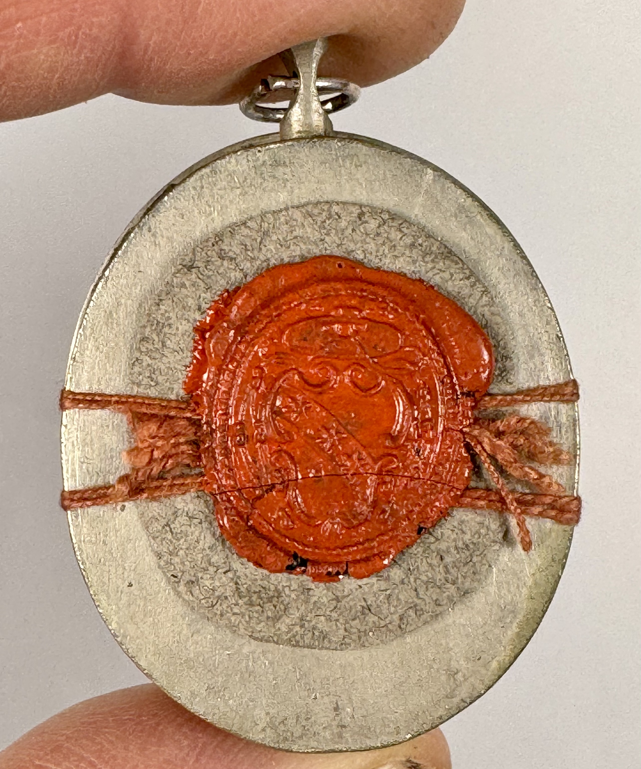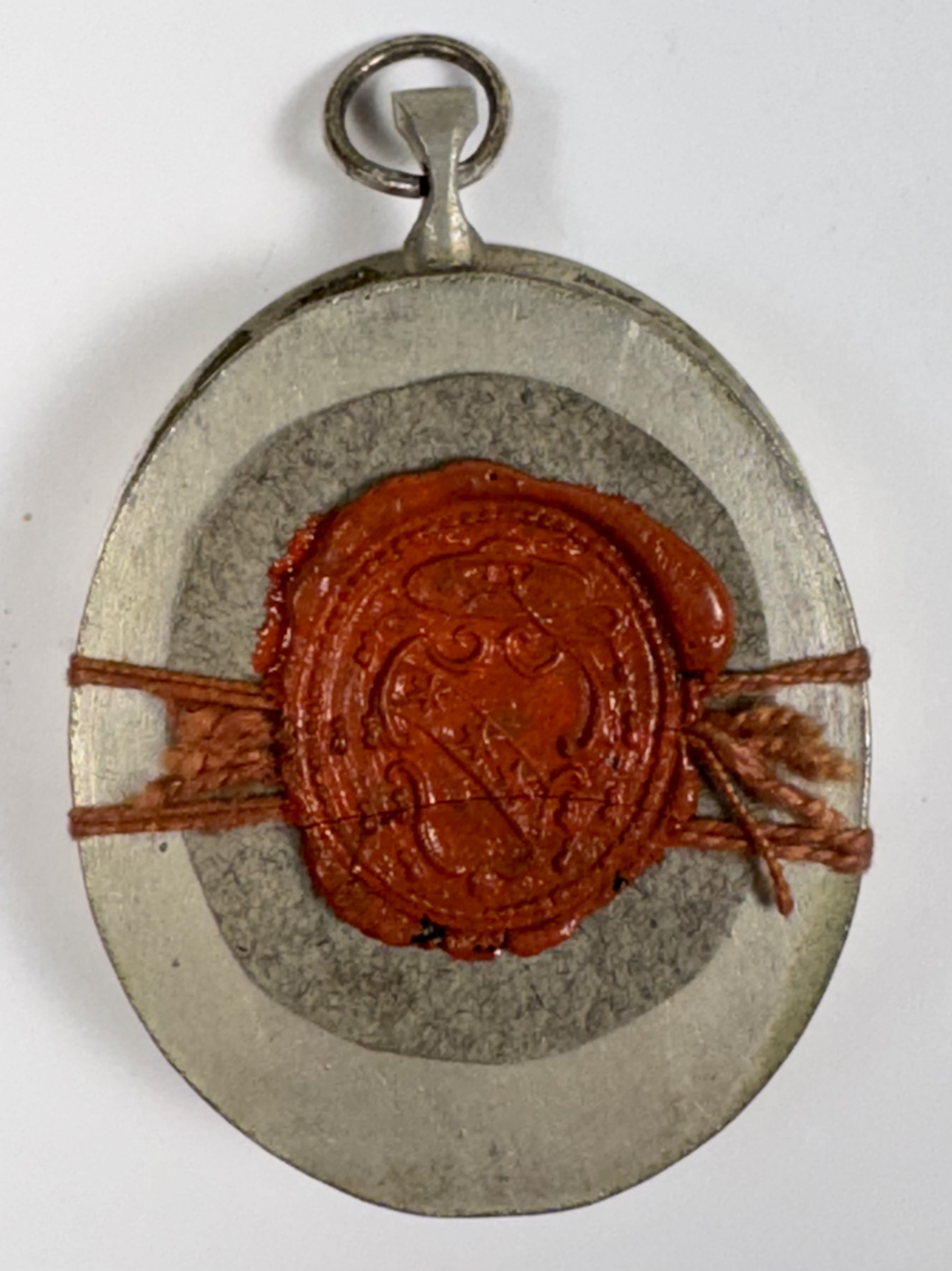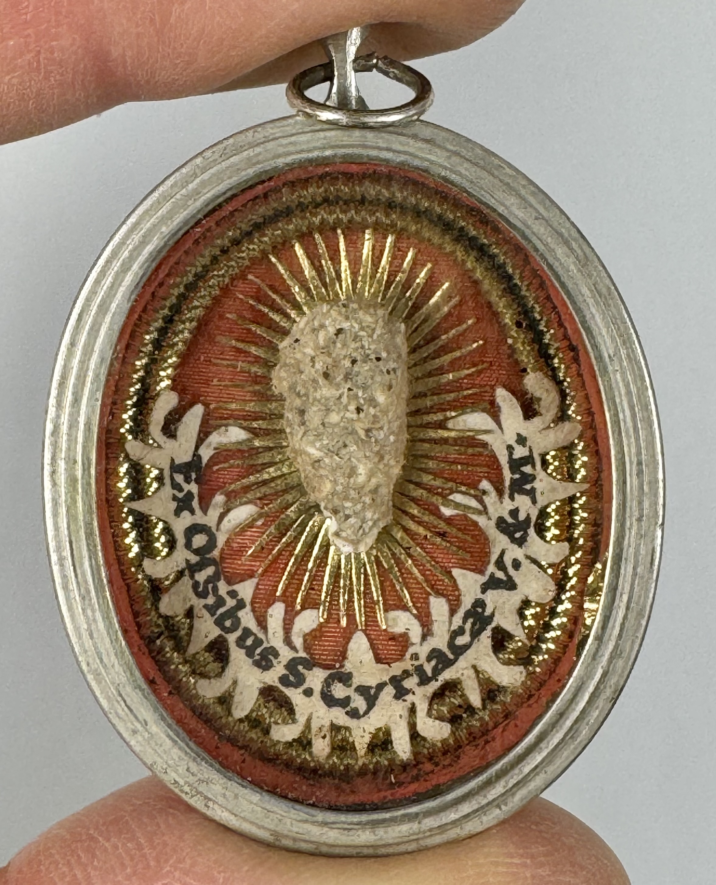 Oval glass-fronted silvered silver pendant reliquary theca housing the first-class ex ossibus (of the bone) relic of Saint Cyriaca, Martyr. The relics are affixed to a gilt paper starburst on a salmon-colored silk ground, surrounded by silver wire ornamentation, and identified in Latin on a fancy manuscript cedula label as Ex Ossibus S. Cyriacae V. & M. (of the bone of Saint Cyriaca, Virgin & Martyr). On the back, the theca is secured with a seal of red Spanish wax bearing an imprint of a coat of arms of Fr. Francesco Maria Ginori (†1775), Bishop of Fiesole, Italy (1736–1775).