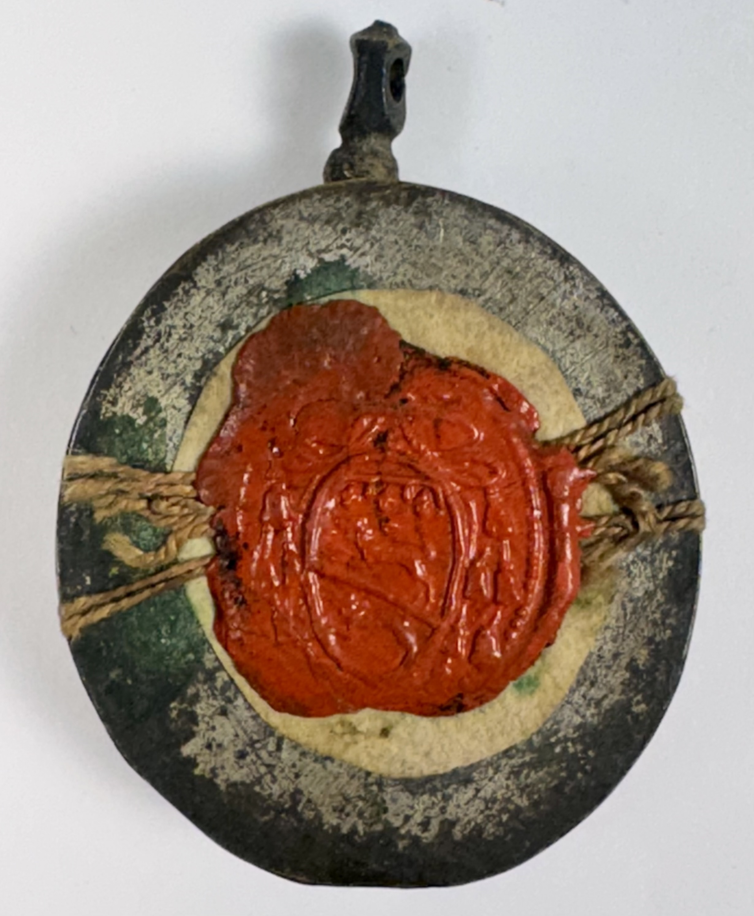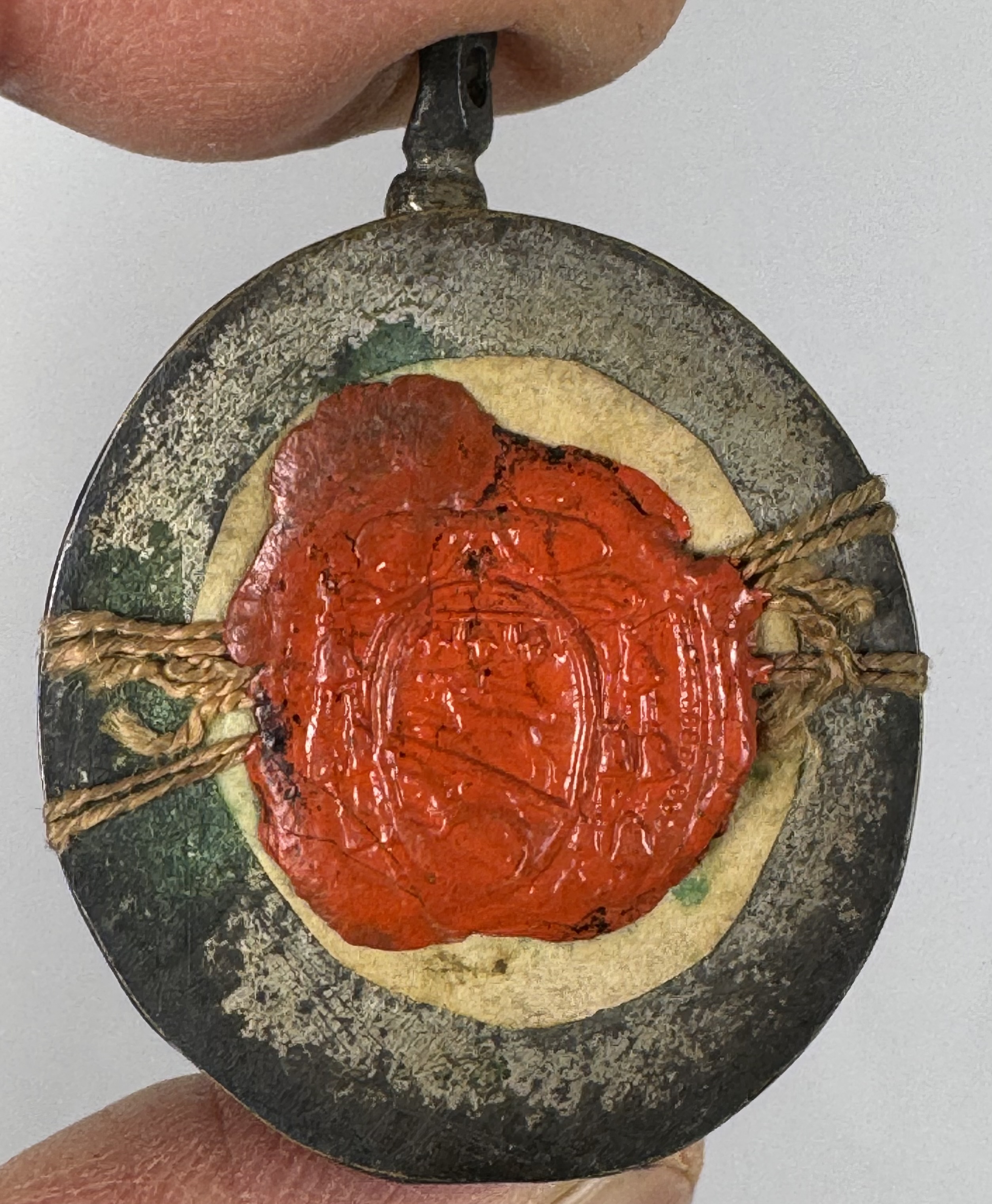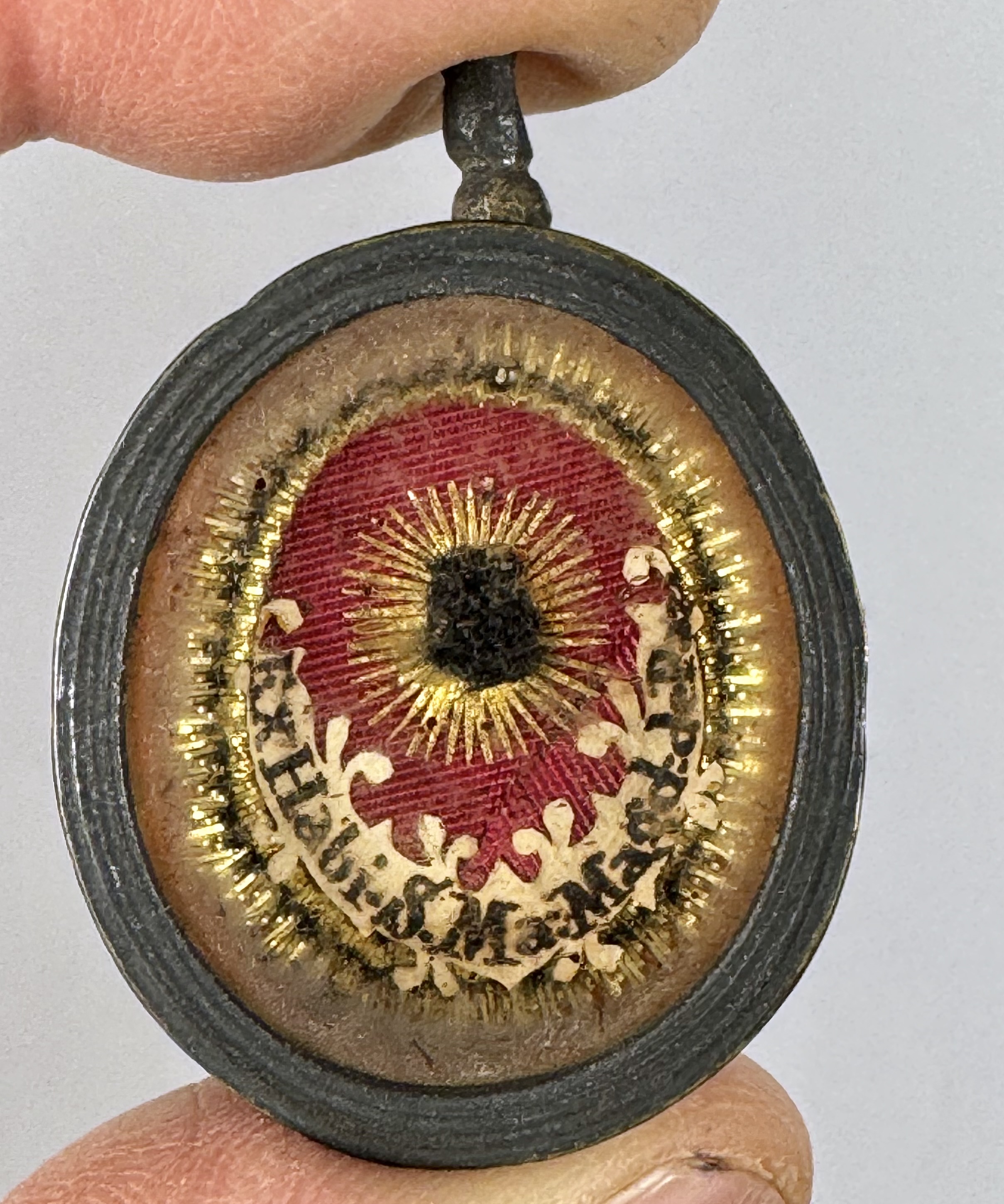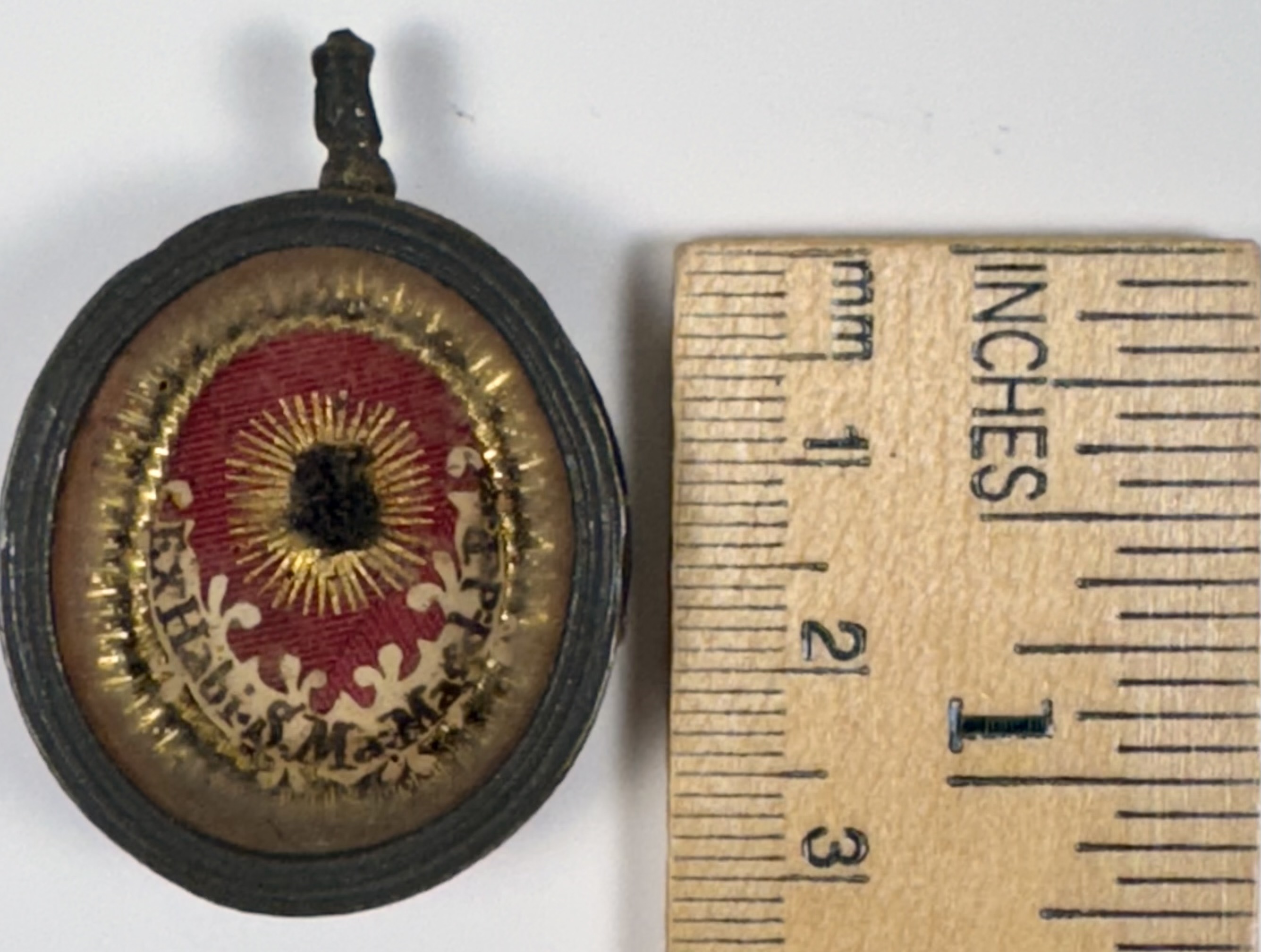 Oval glass-fronted brass pendant reliquary theca housing the second-class ex habito (of the habit) relic of Saint Mary Magdalene de' Pazzi. The relic is affixed to a gilt paper starburst on a red silk ground, surrounded by silver wire ornamentation, and identified in Latin on a fancy manuscript cedula label as Ex Habi. S. Ma: Magd: de Pazzi (of the habit of Saint Mary Magdalene de' Pazzi). On the back, the theca is secured with a seal of red Spanish wax bearing an imprint of a coat of arms of Fr. Francesco Gaetano Incontri (†1781), the Archbishop of Florence, Italy (p. 1741-1781).