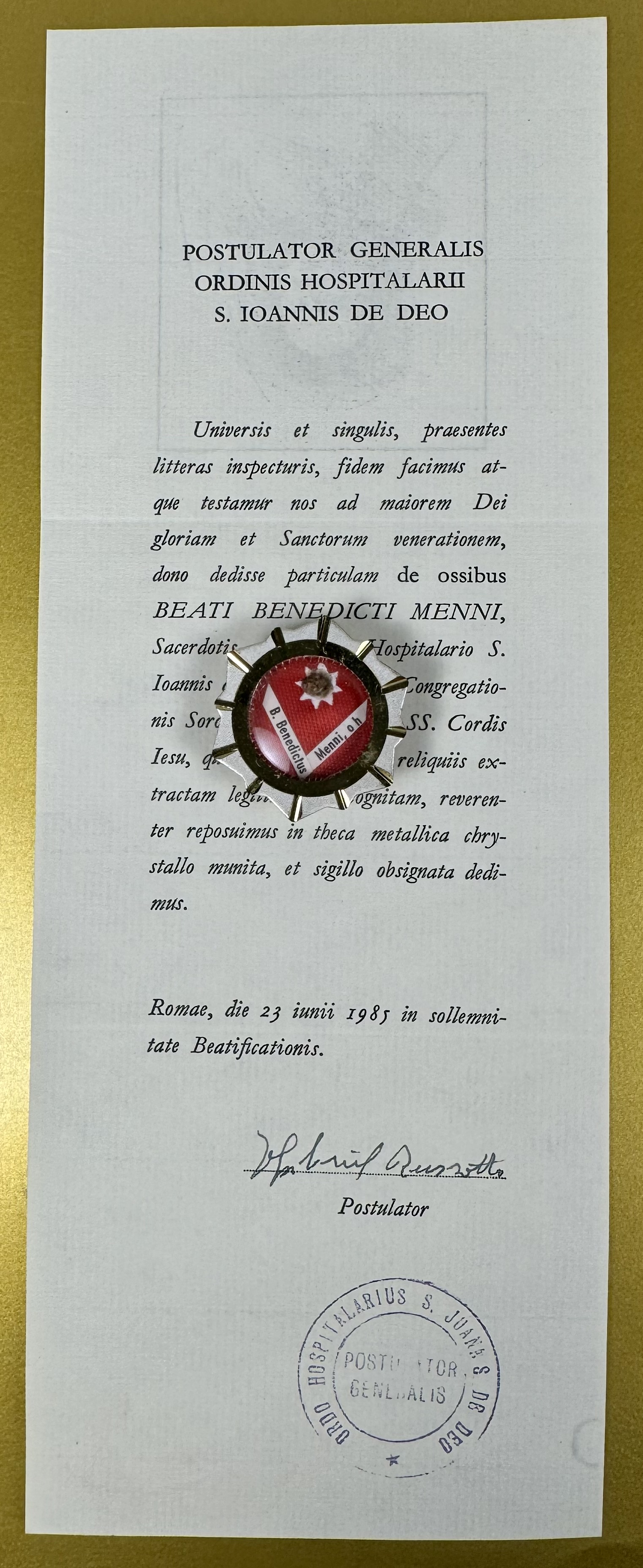 Saint Benedict Menni (†1914) was an Italian Roman Catholic priest and a professed member of the Order of the Brothers Hospitallers of Saint John of God who he went on to establish a religious congregation of women known as the Sisters Hospitaller of the Sacred Heart of Jesus and based upon the one of which he was a member. He worked for the elderly, those who were abandoned and aided polio victims and those with mental health problems. He was beatified on 23 June 1985 by Pope John Paul II and canonized in 1999 after the recognition of two miracles attributed to his intercession. His order continues to flourish across the world in locations such as Spain and Italy. He is a patron saint of people with mental health issues, the sick, and volunteers. His Feast day is celebrated on April 24.