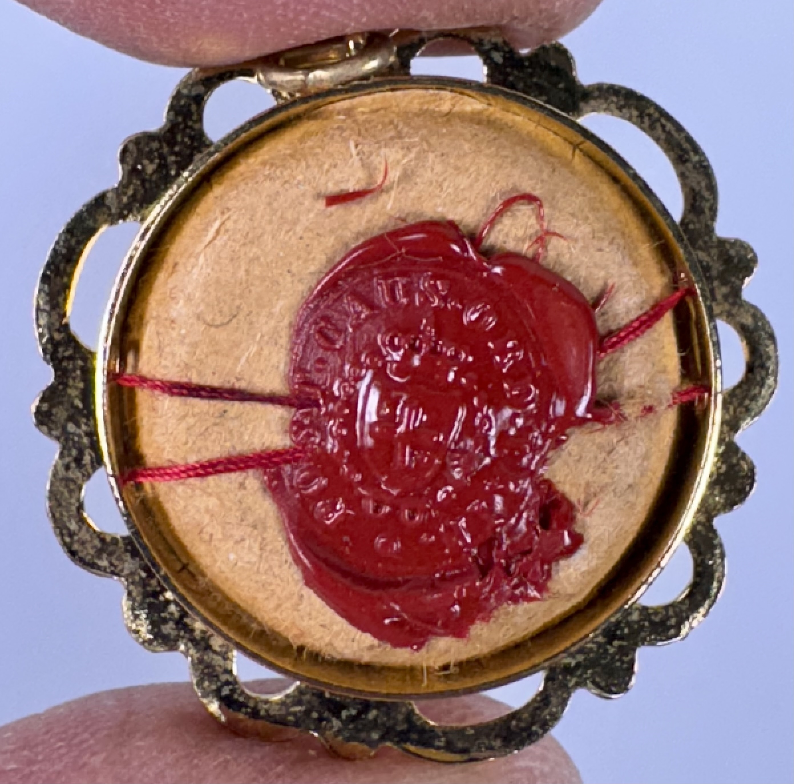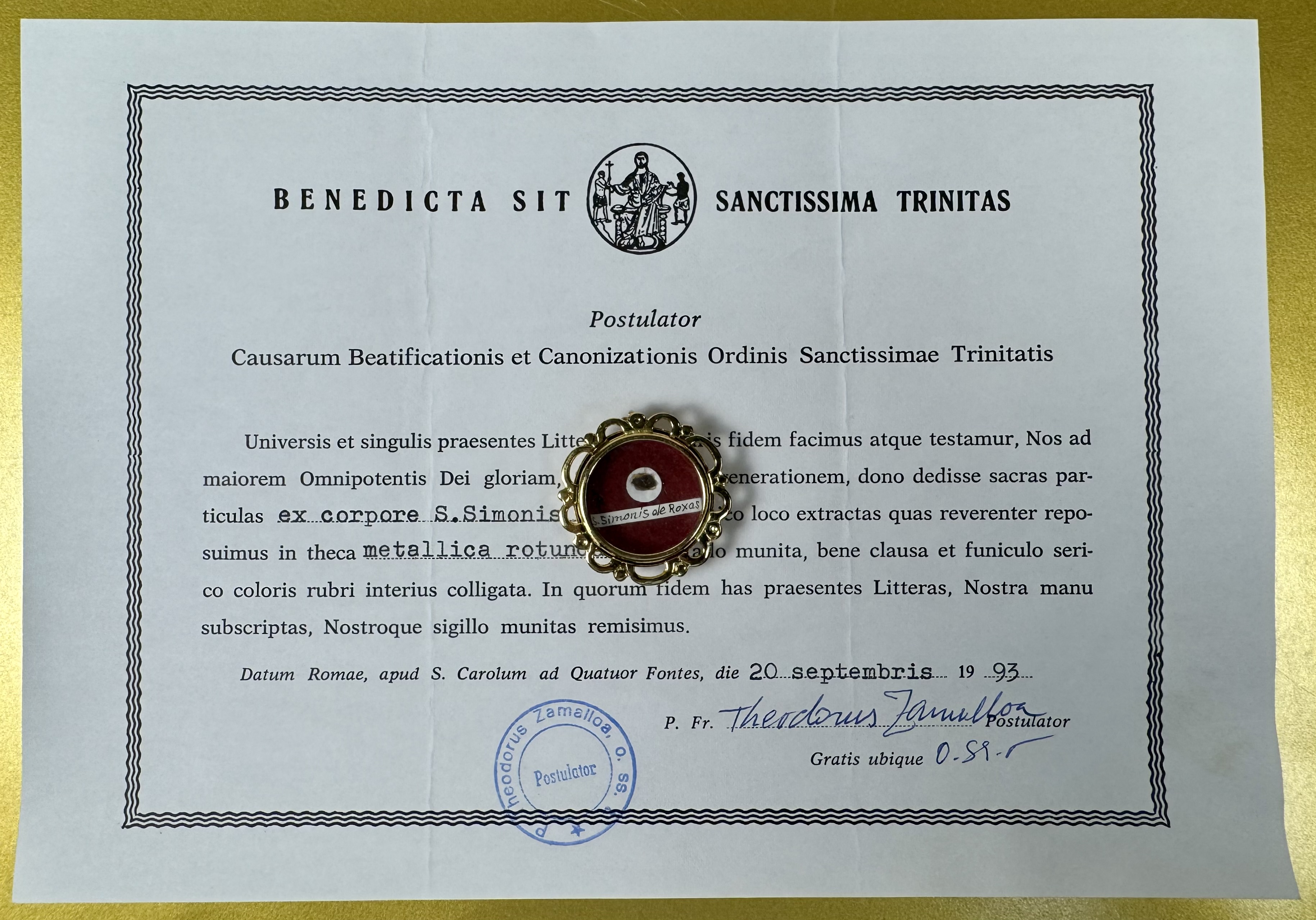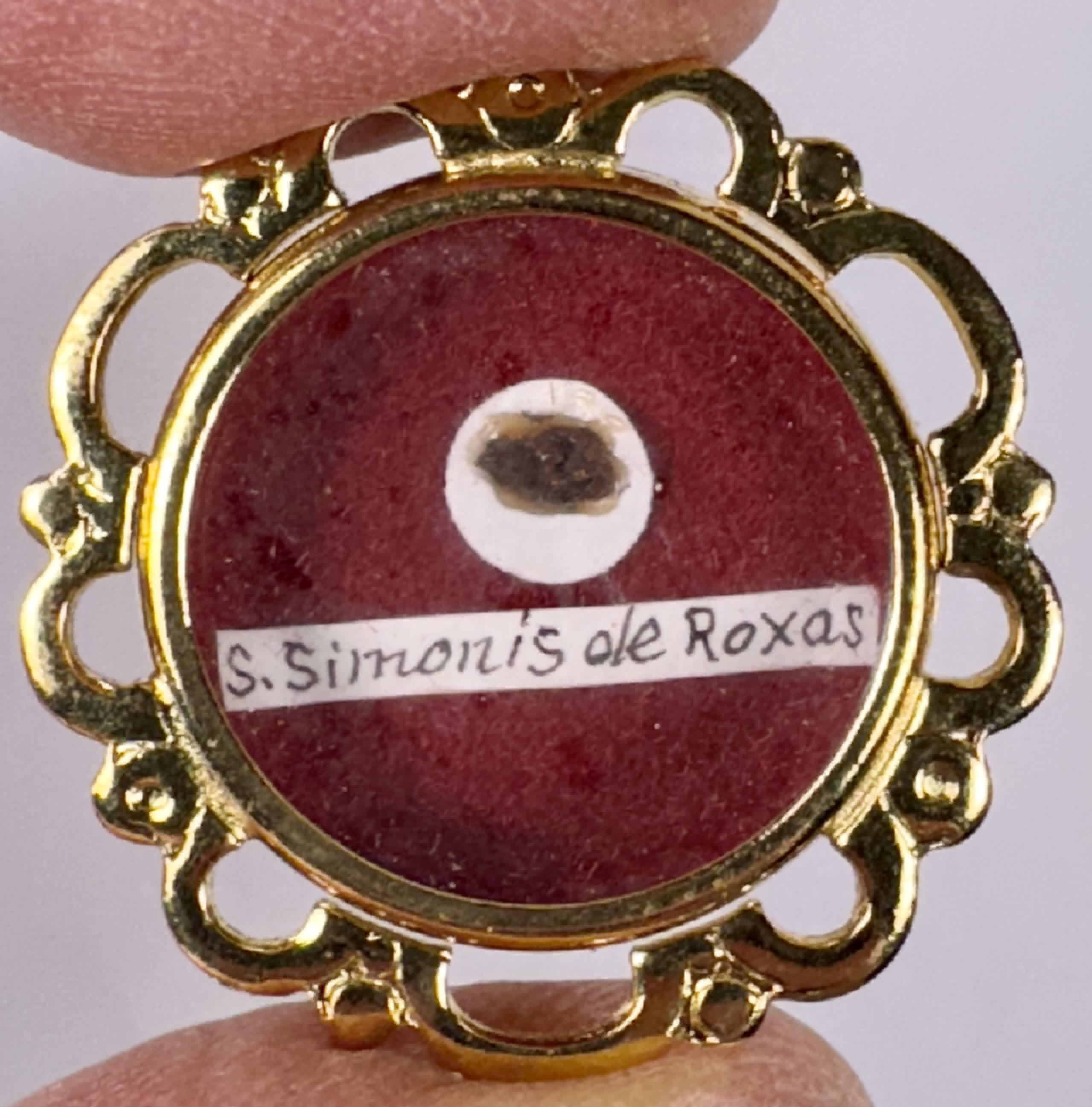 Round yellow-metal glass-fronted reliquary theca housing the first-class ex corpore (of the body) relic of Saint Simón de Rojas. The relic is affixed to a red silk ground and identified in Latin on a manuscript cedula label as S. Simonis de Roxas (Saint Simón de Rojas). On the back, under a protective cap, the theca is secured with a seal of red Spanish wax bearing an imprint of a coat of arms of the Order of the Most Holy Trinity. The reliquary is accompanied by the original matching authentics document issued by the Postulator General of the Order in 1993.