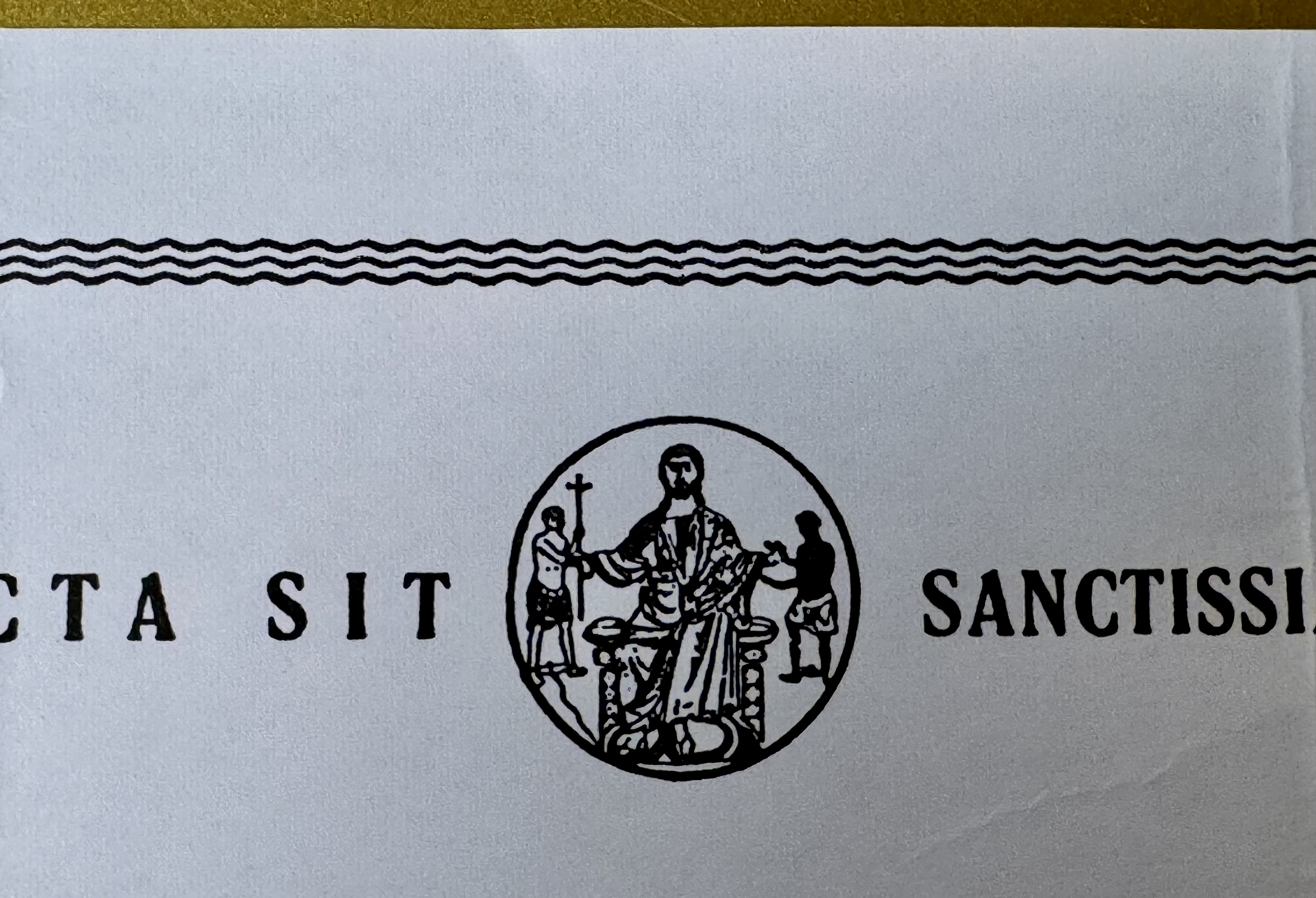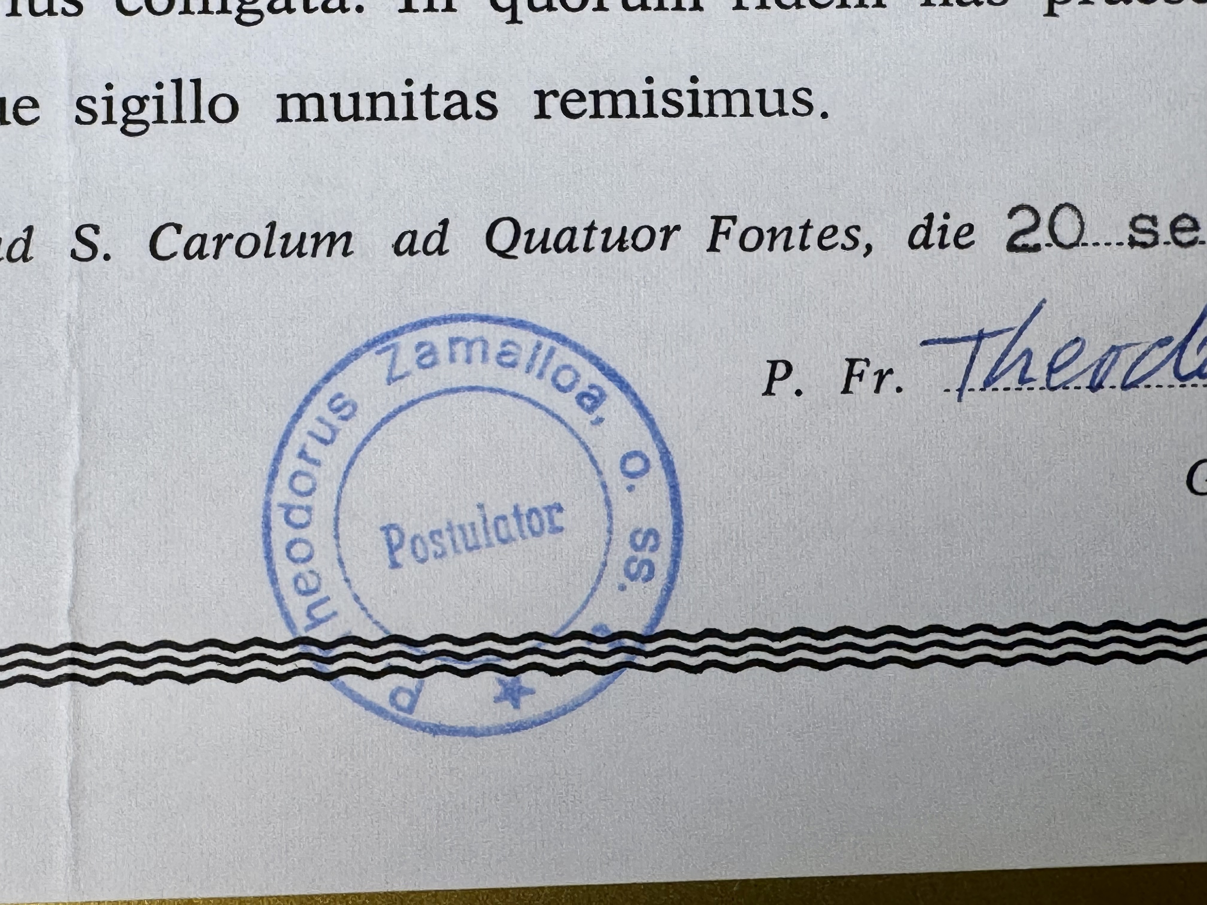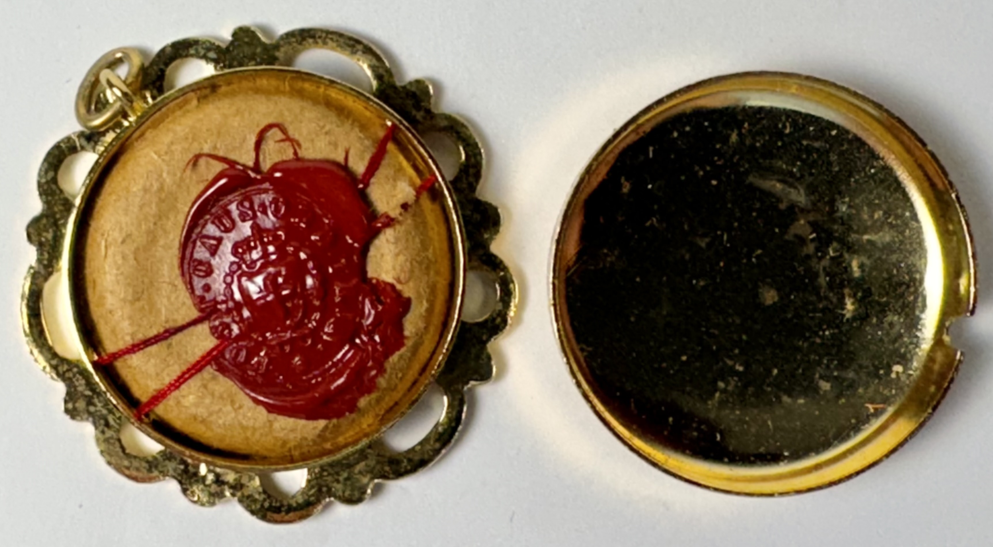 Round yellow-metal glass-fronted reliquary theca housing the first-class ex corpore (of the body) relic of Saint Simón de Rojas. The relic is affixed to a red silk ground and identified in Latin on a manuscript cedula label as S. Simonis de Roxas (Saint Simón de Rojas). On the back, under a protective cap, the theca is secured with a seal of red Spanish wax bearing an imprint of a coat of arms of the Order of the Most Holy Trinity. The reliquary is accompanied by the original matching authentics document issued by the Postulator General of the Order in 1993.