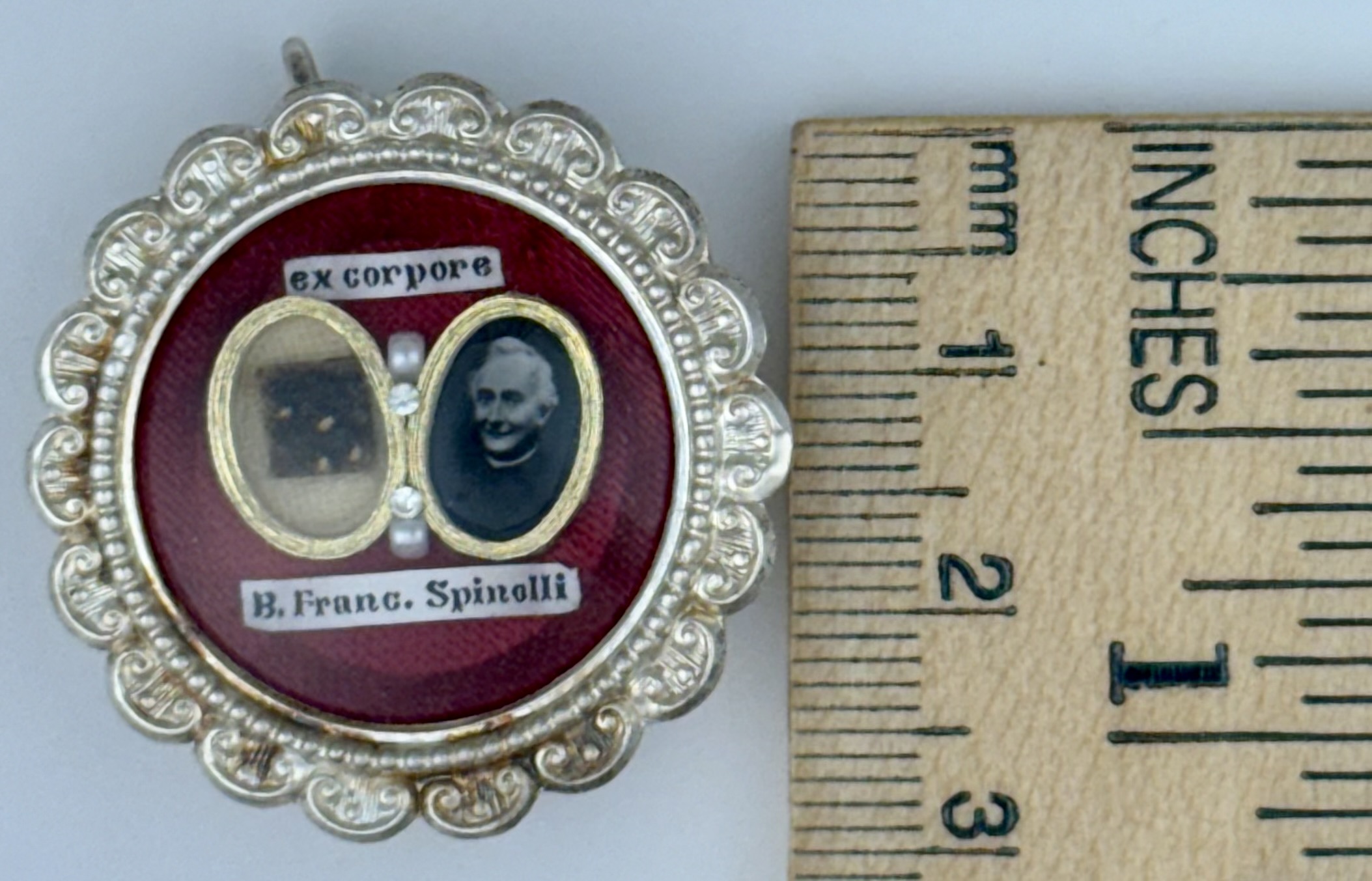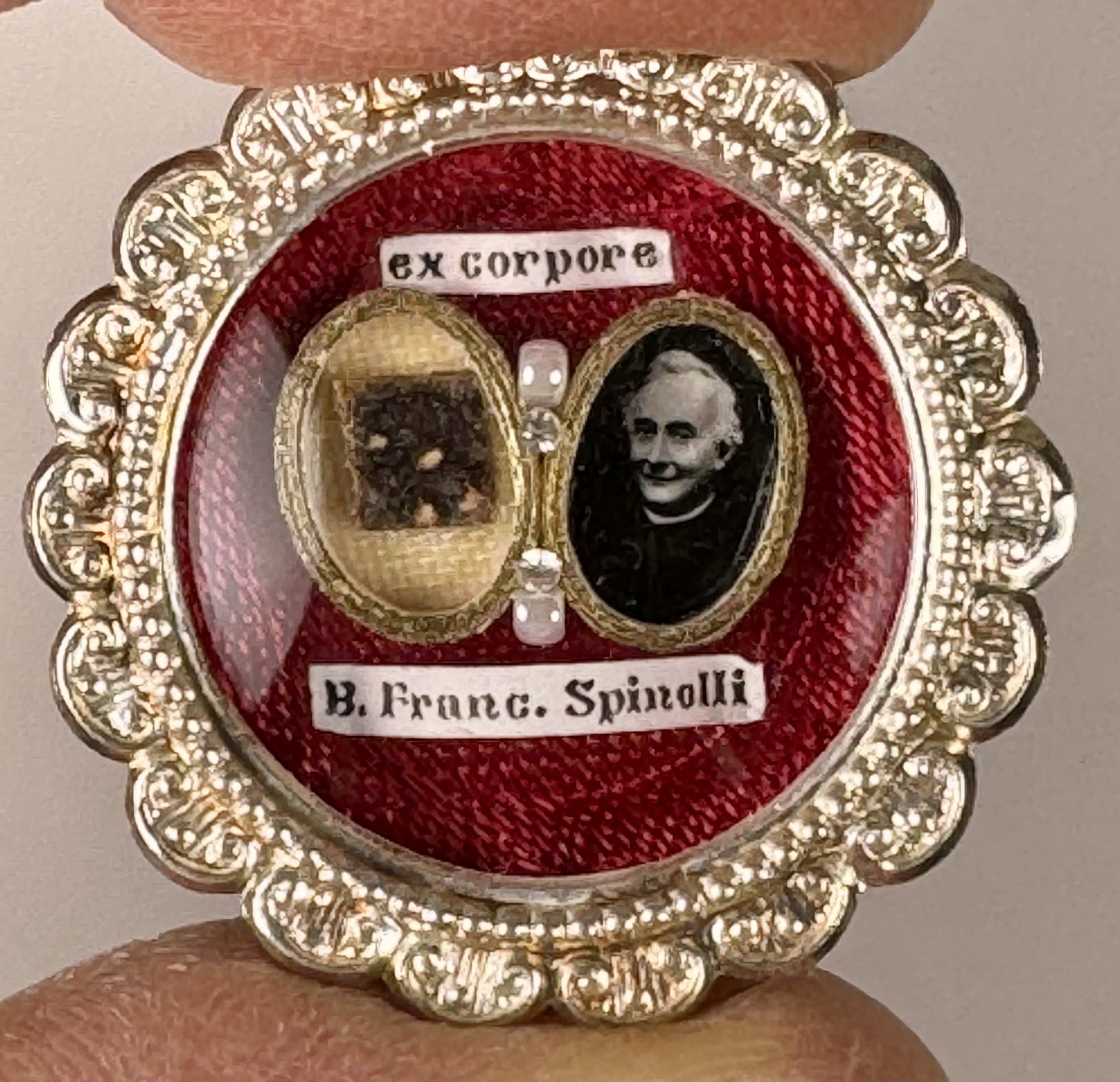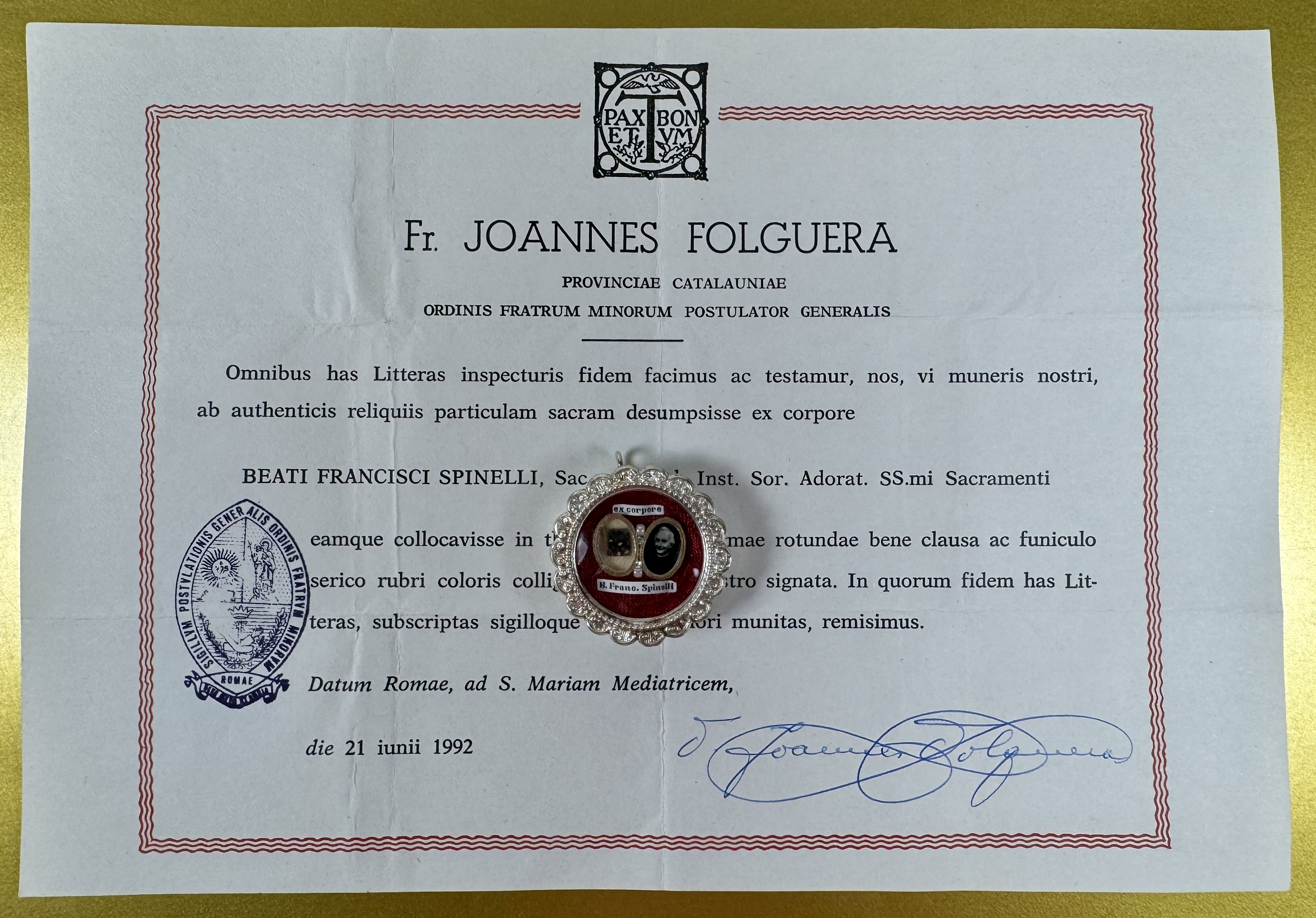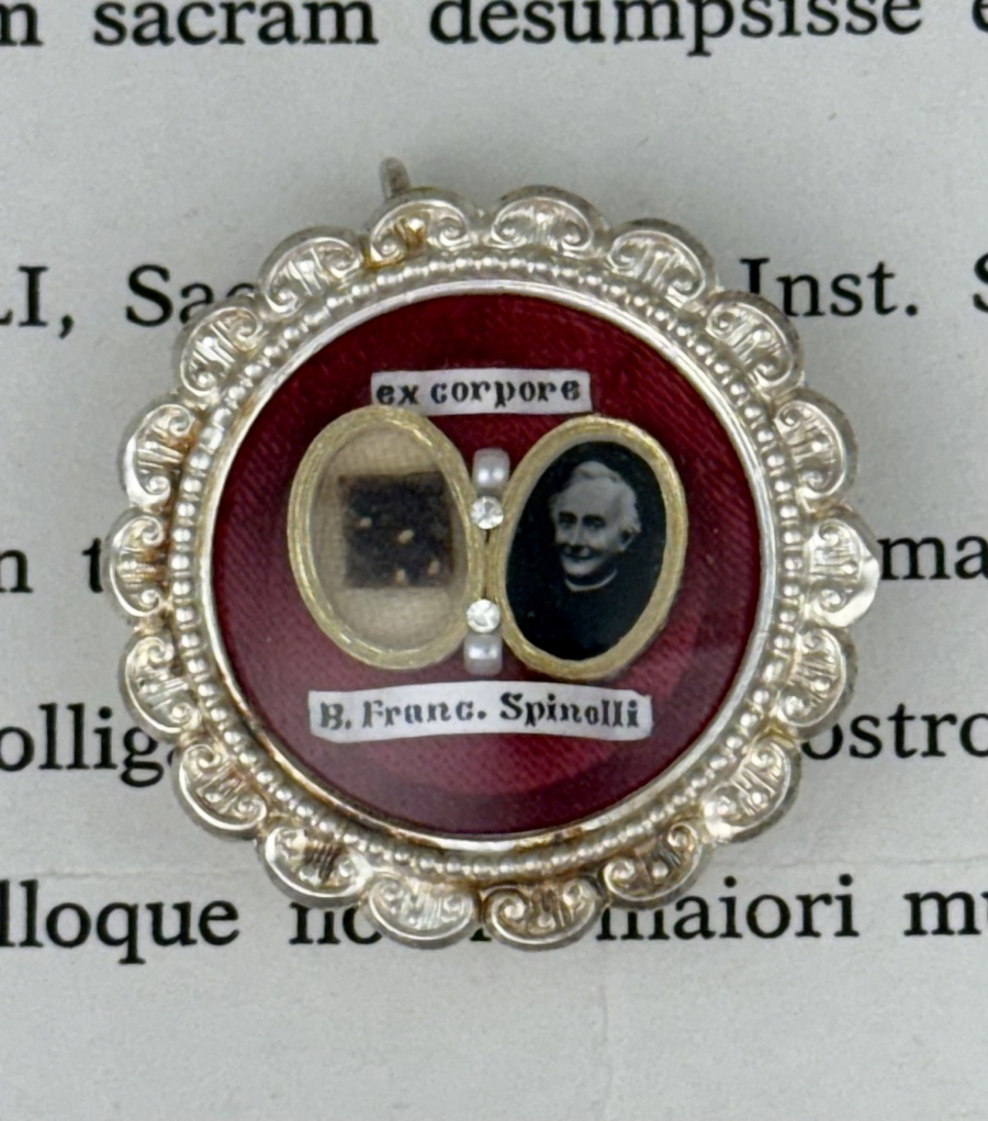 Saint Francesco Spinelli (†1913) was an Italian Roman Catholic priest and the founder of the Sisters Adorers of the Blessed Sacrament. Spinelli became close contemporaries of Geltrude Comensoli and Luigi Maria Palazzolo and had a previous collaboration with Comensoli in which the two established a religious institute in Bergamo. He was beatified on 21 June 1992 by Pope John Paul II and canonized on 14 October 2018 by Pope Francis.