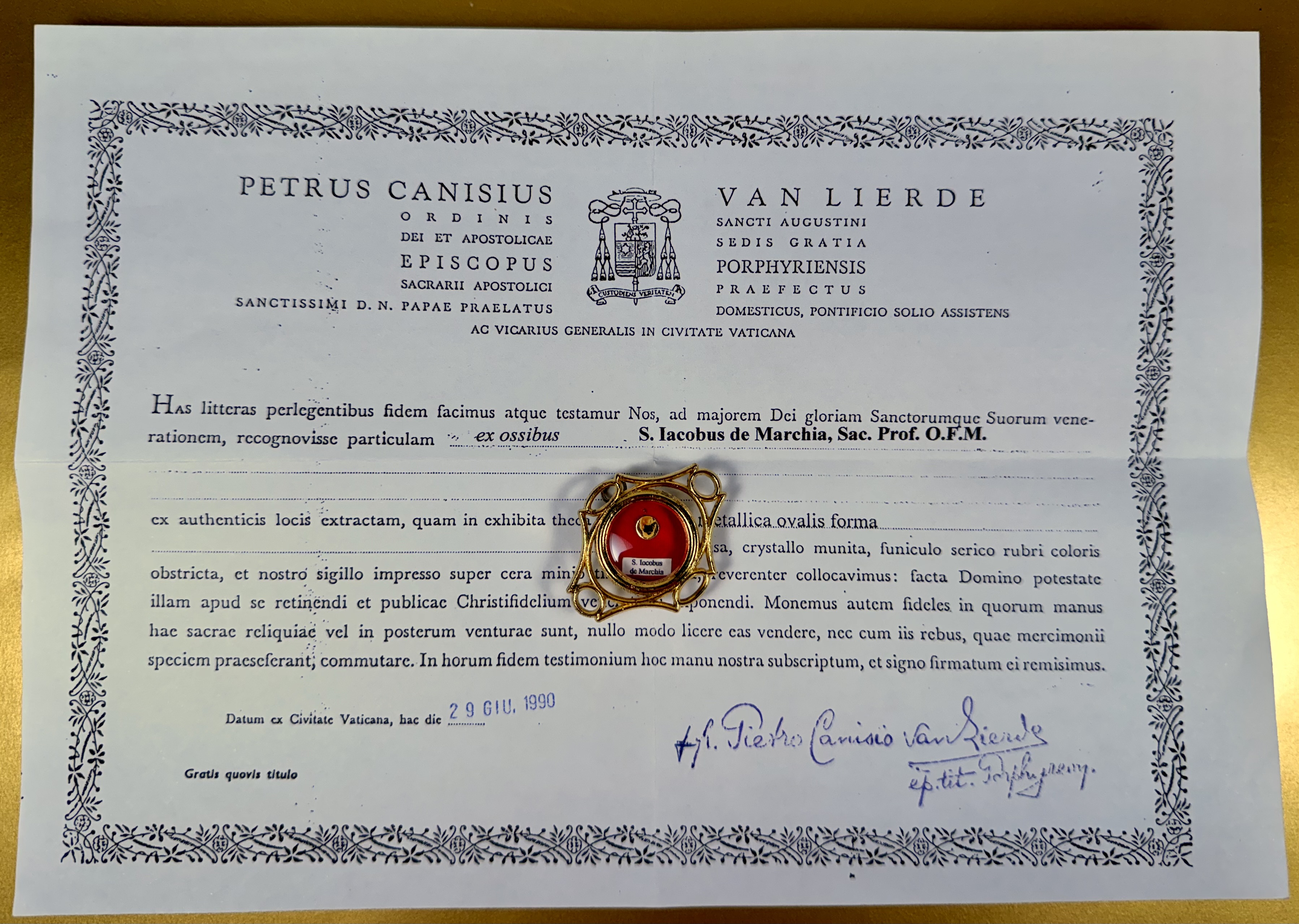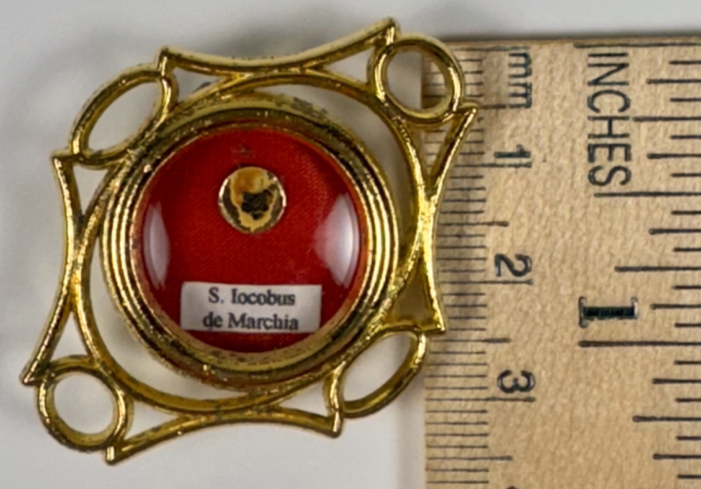 Saint James of the Marches (Jacob de Marchia, Italian: Giacomo della Marca) (†1476) was an Italian Friar Minor, preacher and writer, Papal legate, and Inquisitor. He carried on his spiritual labors, remarkable for the miracles he performed and the numerous conversions he wrought. James preached penance, combated heretics, and was on legations in Germany, Austria, Sweden, Denmark, Bohemia, Poland, Hungary, and Bosnia. He was also appointed inquisitor against the Fraticelli, a heretic sect that dissented from the Franciscans on the vow of poverty, among other things. In 1432–33, he was sent by the Papal Council as an Inquisitor to Bosnia. He combated the heresies he found there, which earned him the hostility of its ruler, King Tvrtko II, and even more of his wife, Queen Dorothea, whom James accused of trying to poison him. James was buried in Naples in the Franciscan church of Santa Maria La Nova, where his body remained until 2001. At the instigation of the provincial minister (Franciscan superior) of the Marches region, Ferdinando Campana, James's body was relocated to Monteprandone, where it remains incorrupt and visible to the public today. He was beatified by Pope Urban VIII in 1624, and canonized by Pope Benedict XIII in 1726. Naples venerates him as one of its patron saints. His liturgical feast day is observed by the Franciscan Order on 28 November.