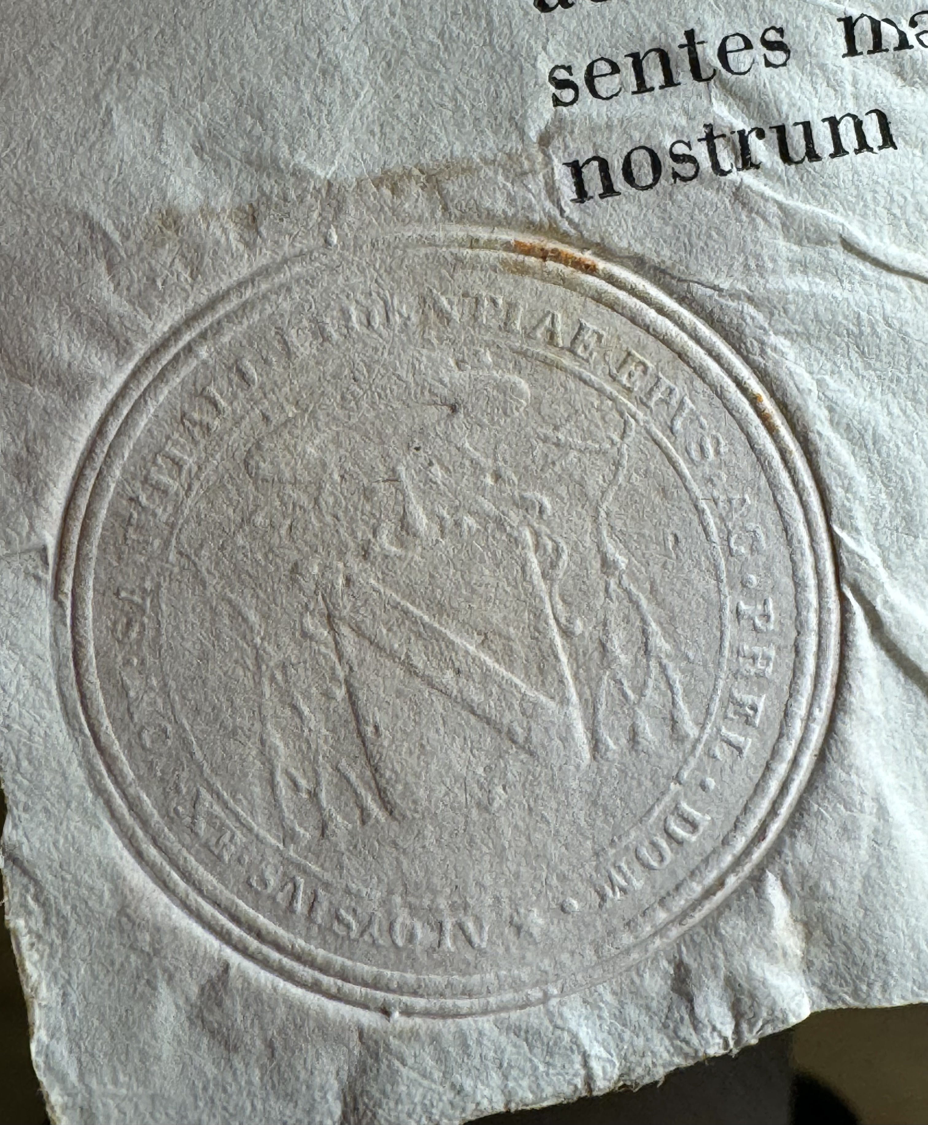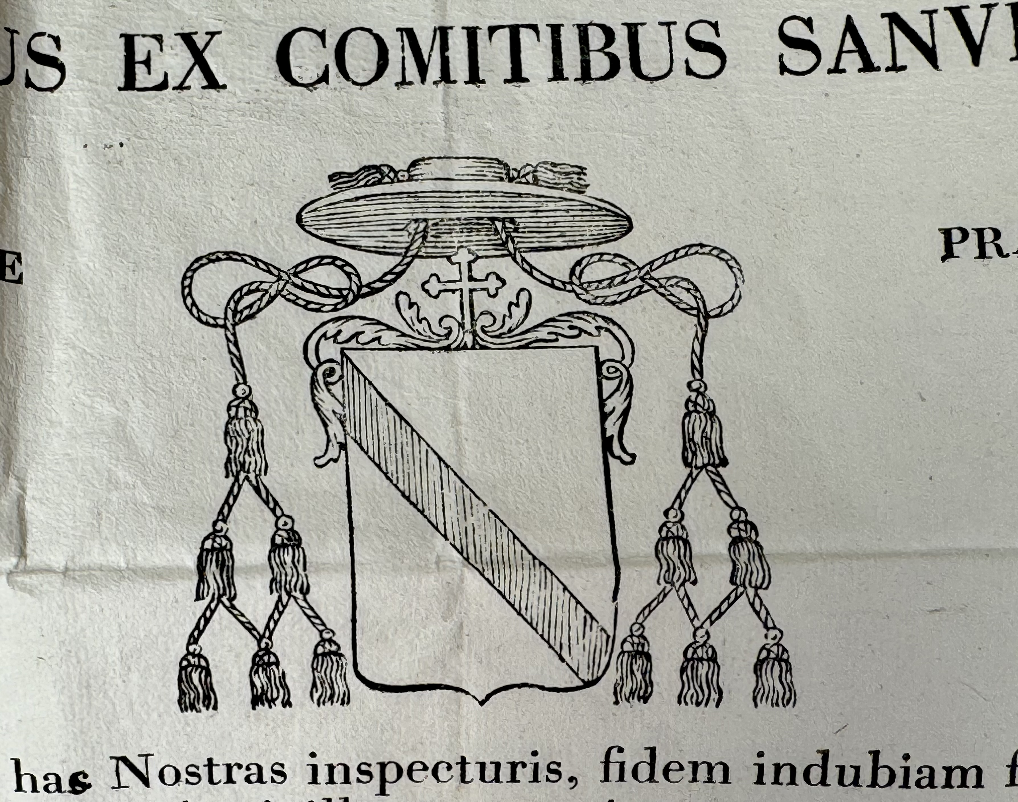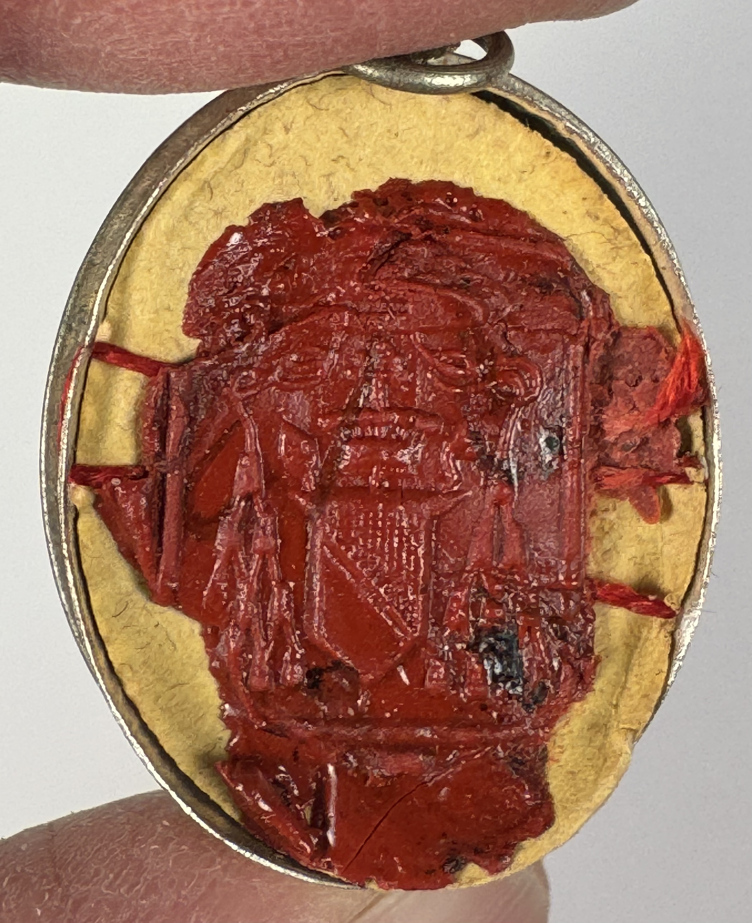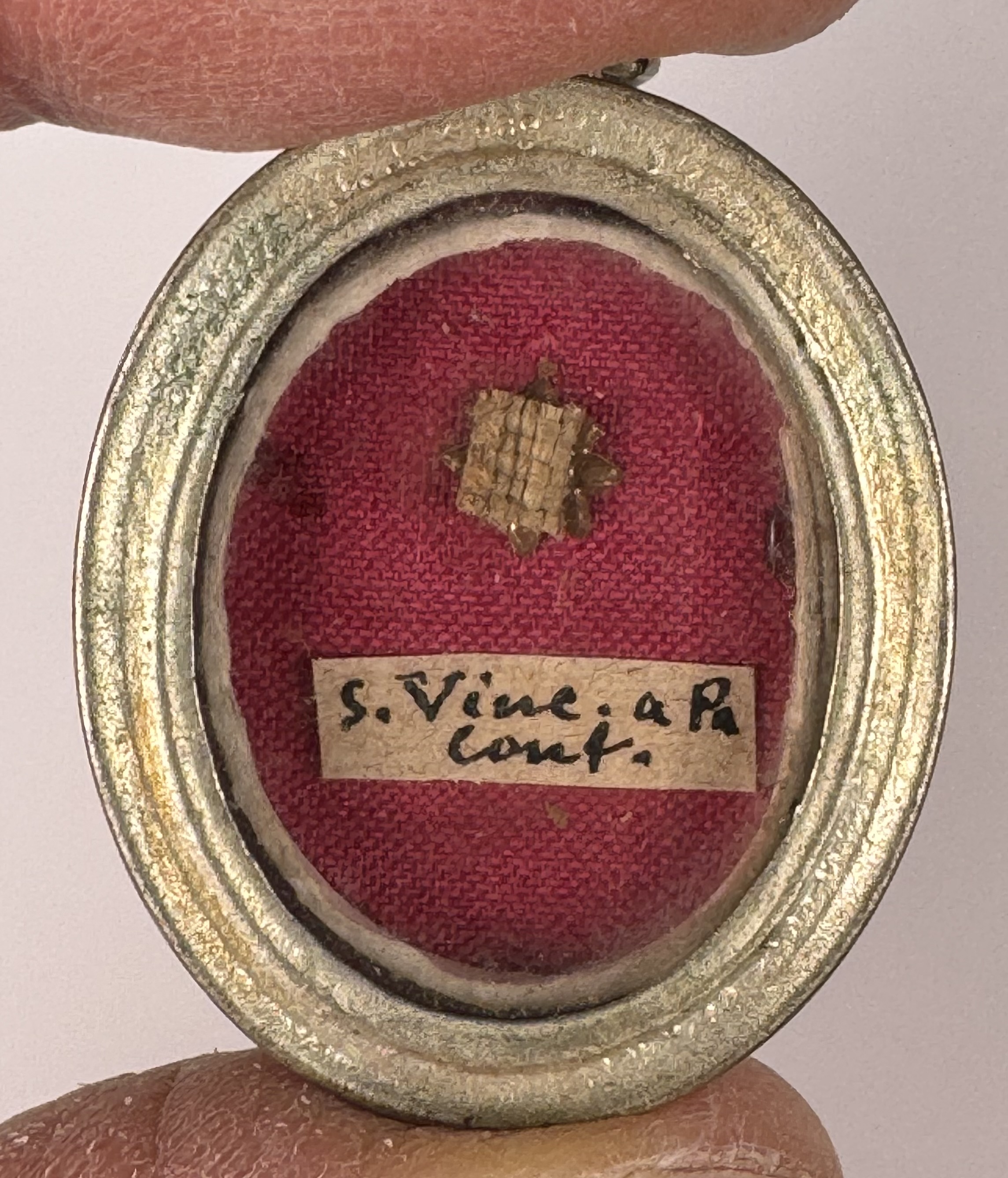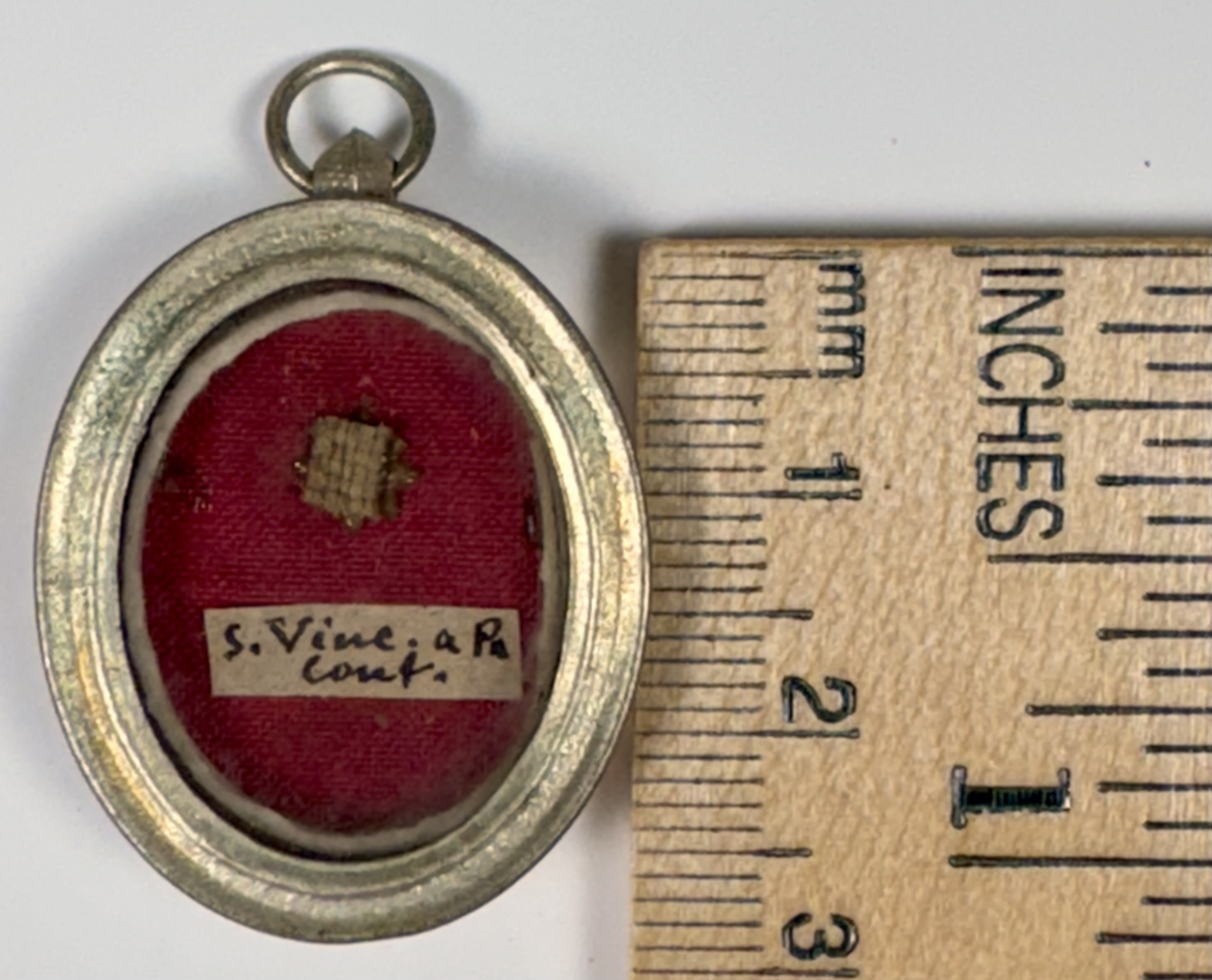 Oval glass-fronted silvered brass pendant reliquary theca housing the second-class ex habito (of the habit) relic of Saint Vincent de Paul. The relic is affixed to the red silk ground and identified in Latin on a manuscript cedula label as S. Vinc. a Pa Conf.(Saint Vincent de Paul, Confessor). On the back, under a protective cap, the theca is secured with a seal of red Spanish wax bearing an imprint of a coat of arms of FatherAloisioSan Vitale (†), Bishop of Piacenza. The relic is accompanied by the original matching authentics document issued and sealed by the order of Bishop San Vitale in 1820.