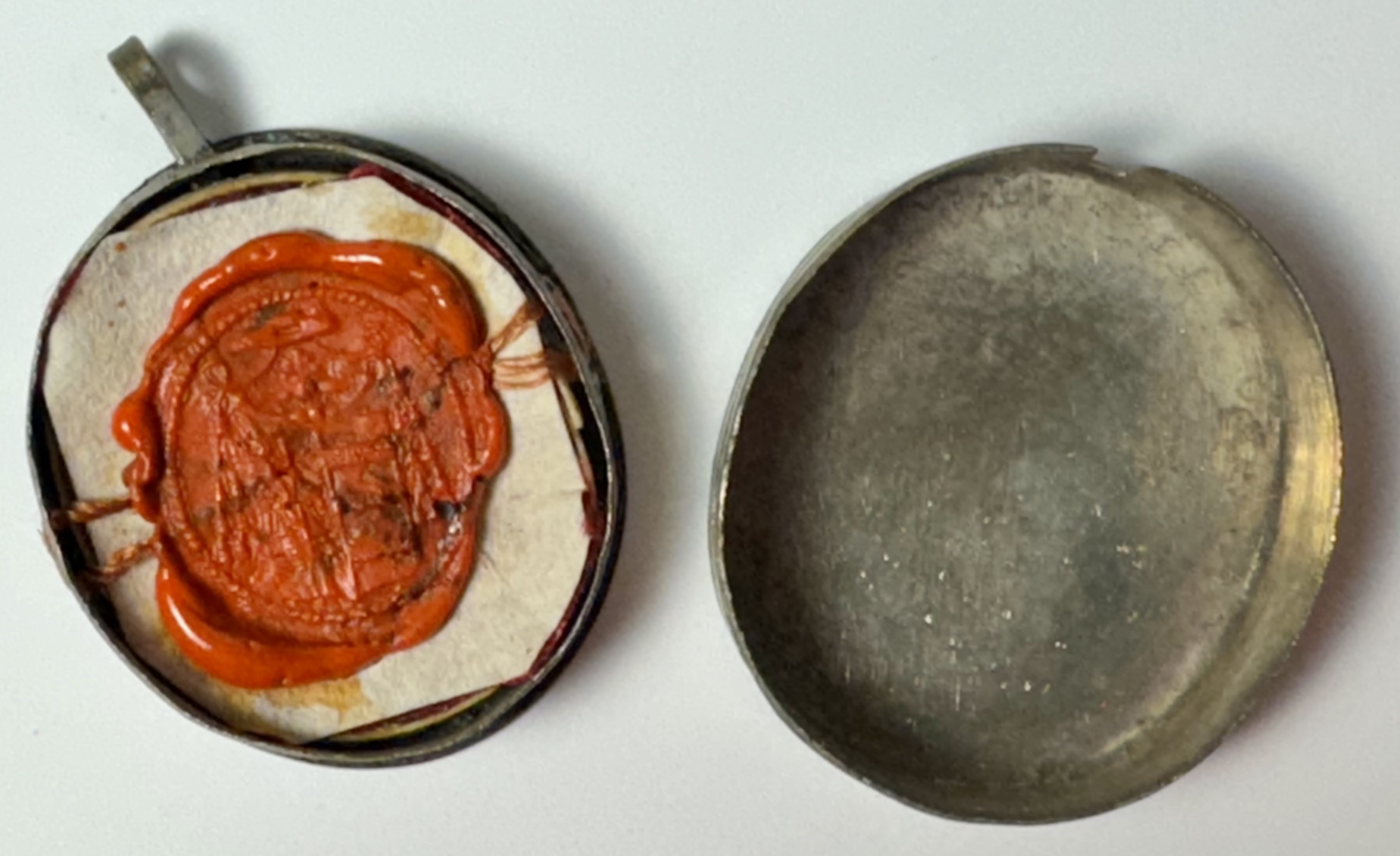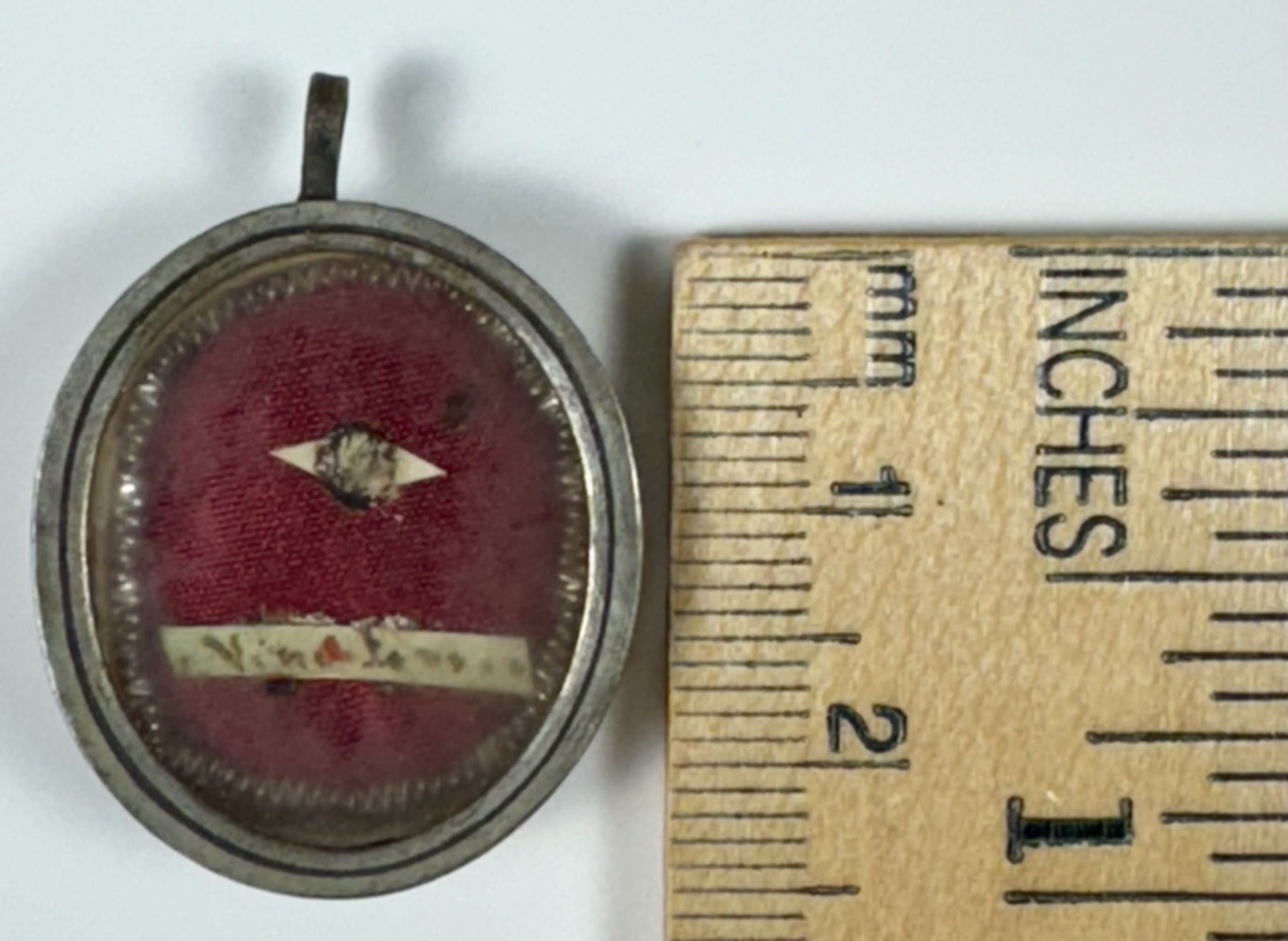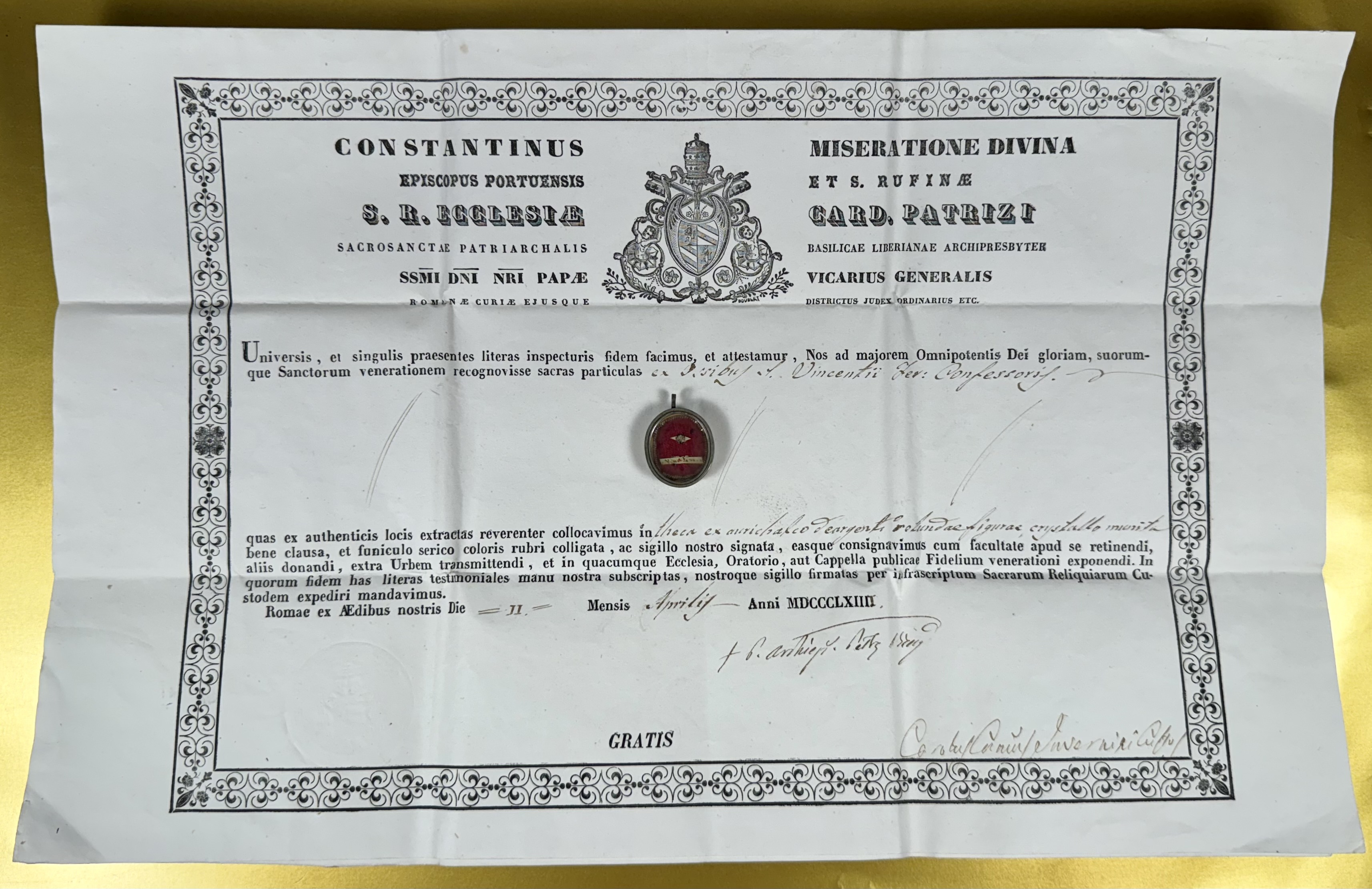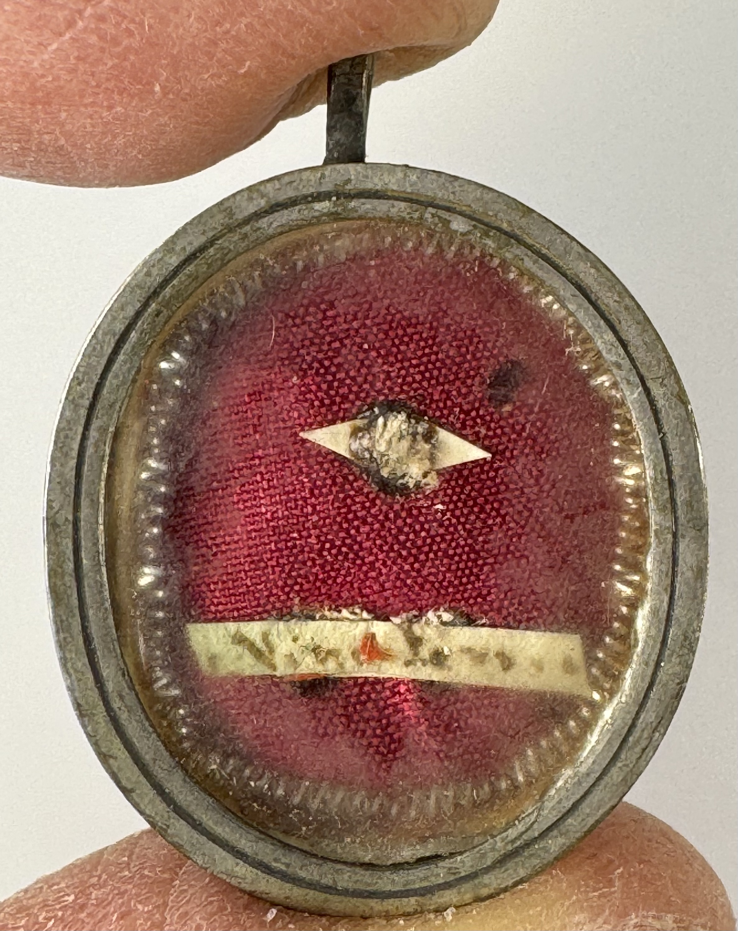 Oval glass-fronted silvered brass pendant reliquary theca housing the first-class ex ossibus (of the bone) relic of one of Saint Vincent Ferrer.  The relic is affixed to a red silk ground surrounded by gilt silver wire ornamentation and identified in Latin on a manuscript cedula label as S. Vinc a Ferr.(Saint Vincent Ferrer).  On the back, under a protective cap, the theca is secured with a seal of red Spanish wax bearing an imprint of a coat of arms of Monsignor Costantino Patrizi Naro (†1876), Dean of the College of Cardinals and the Vicar General of the Roman Curia. The relic is accompanied by the original matching authentics document issued and sealed by the order of Cardinal Naro in 1864.