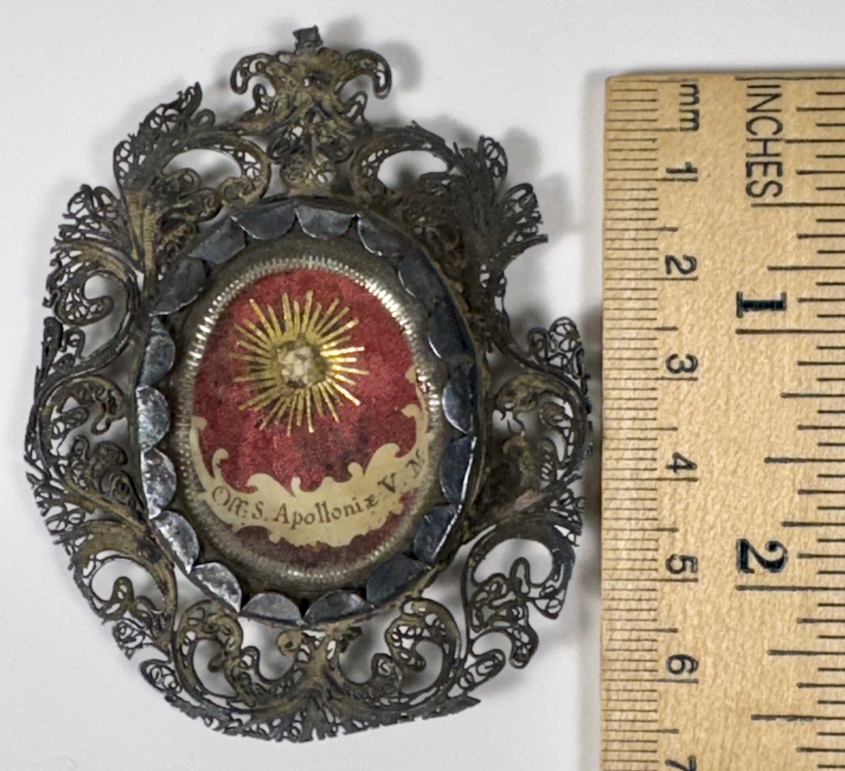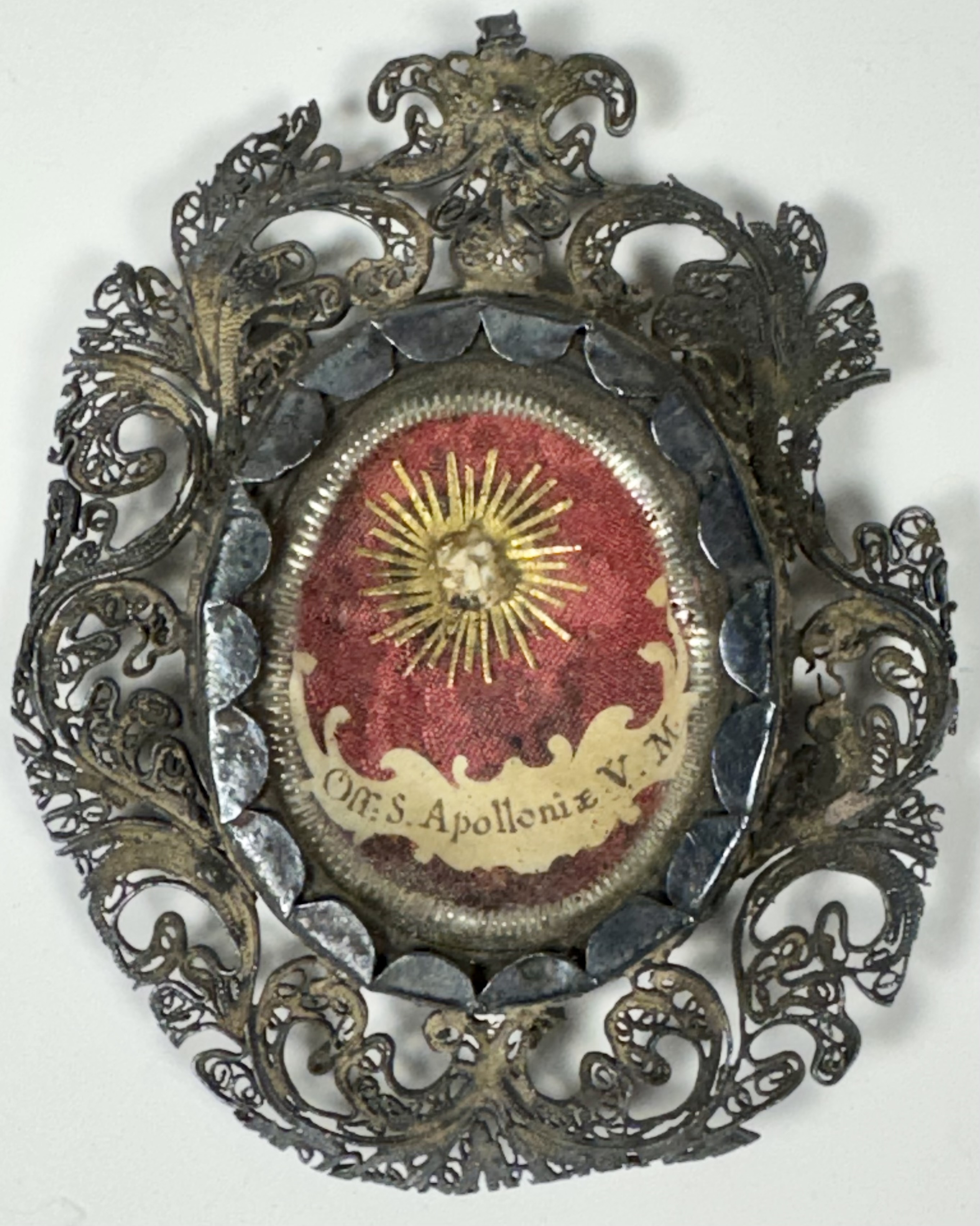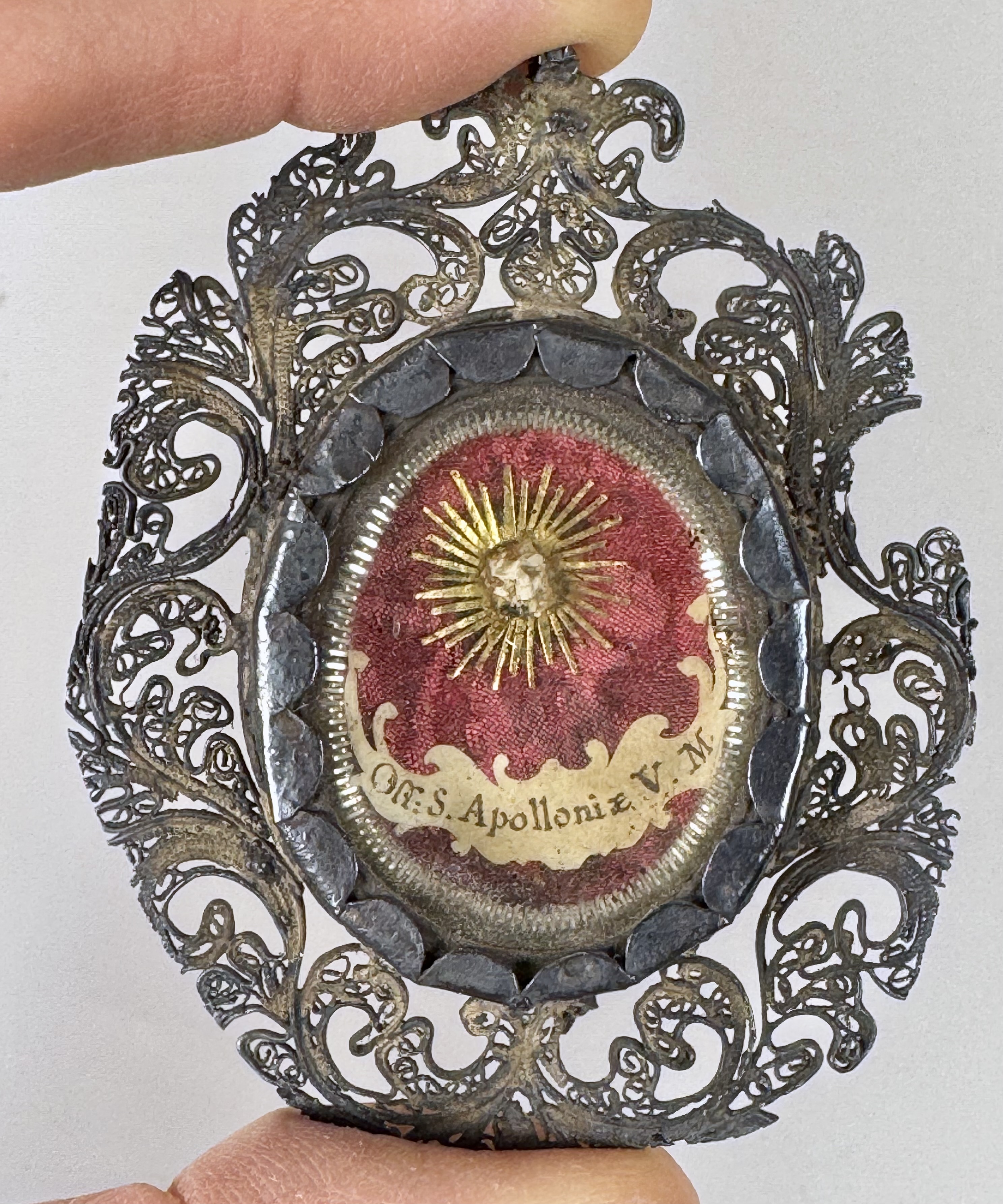 Fancy oval glass-fronted silver pendant reliquary theca surrounded by silver filigree ornamentation housing the first-class ex ossibus (of the bone) relic of Saint Apollonia of Alexandria. A sizable relic is affixed to a gilt-paper starburst on a ground of red silk, surrounded by silver wire ornamentation and identified in Latin on a fancy manuscript cedula label as Ex Oss. S. Apolloniae V. & M. (of the bone of St. Apollonia, Virgin and Martyr). On the back, the theca is secured with a seal of red Spanish wax bearing an imprint of a coat of arms of Fr. Francesco Maria Ginori (†1775), Bishop of Fiesole, Italy (1736–1775).