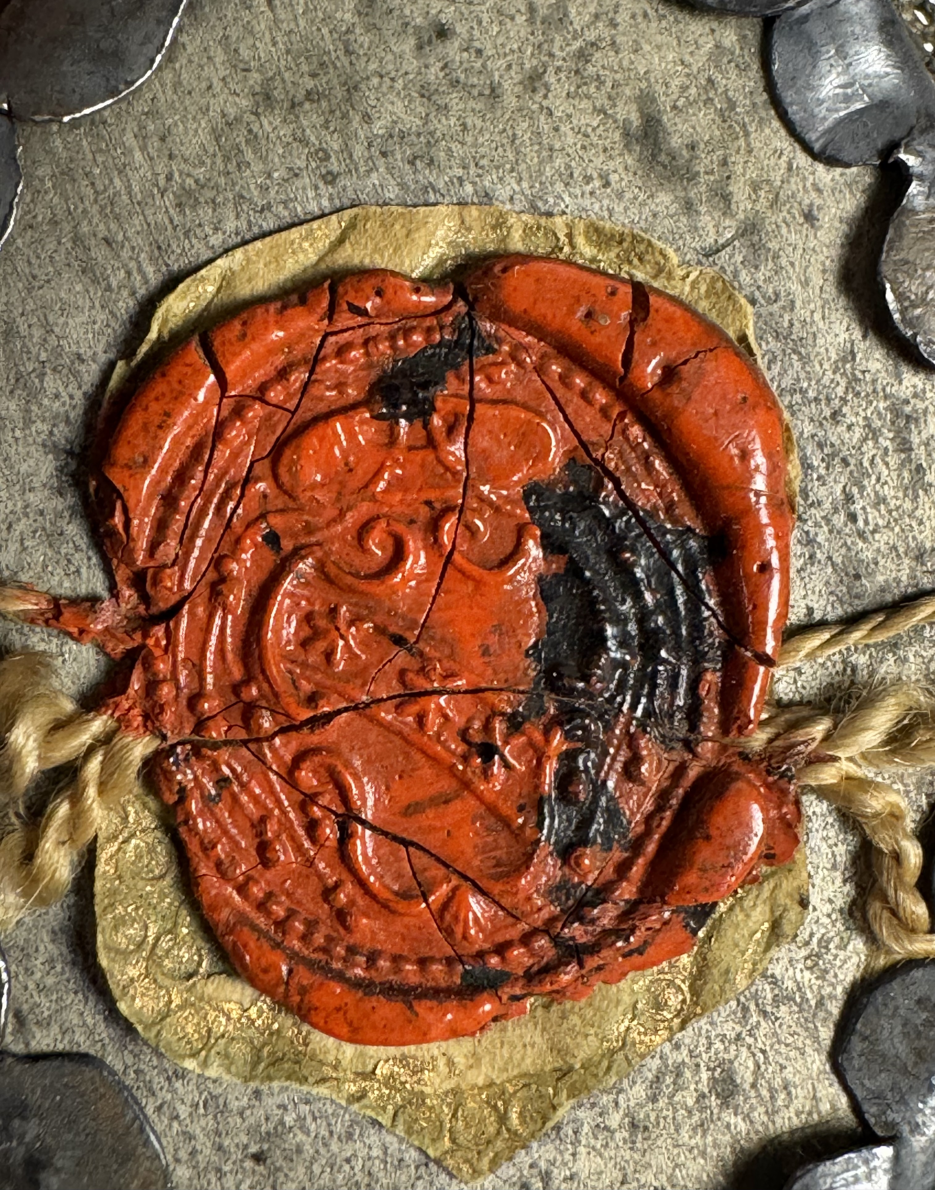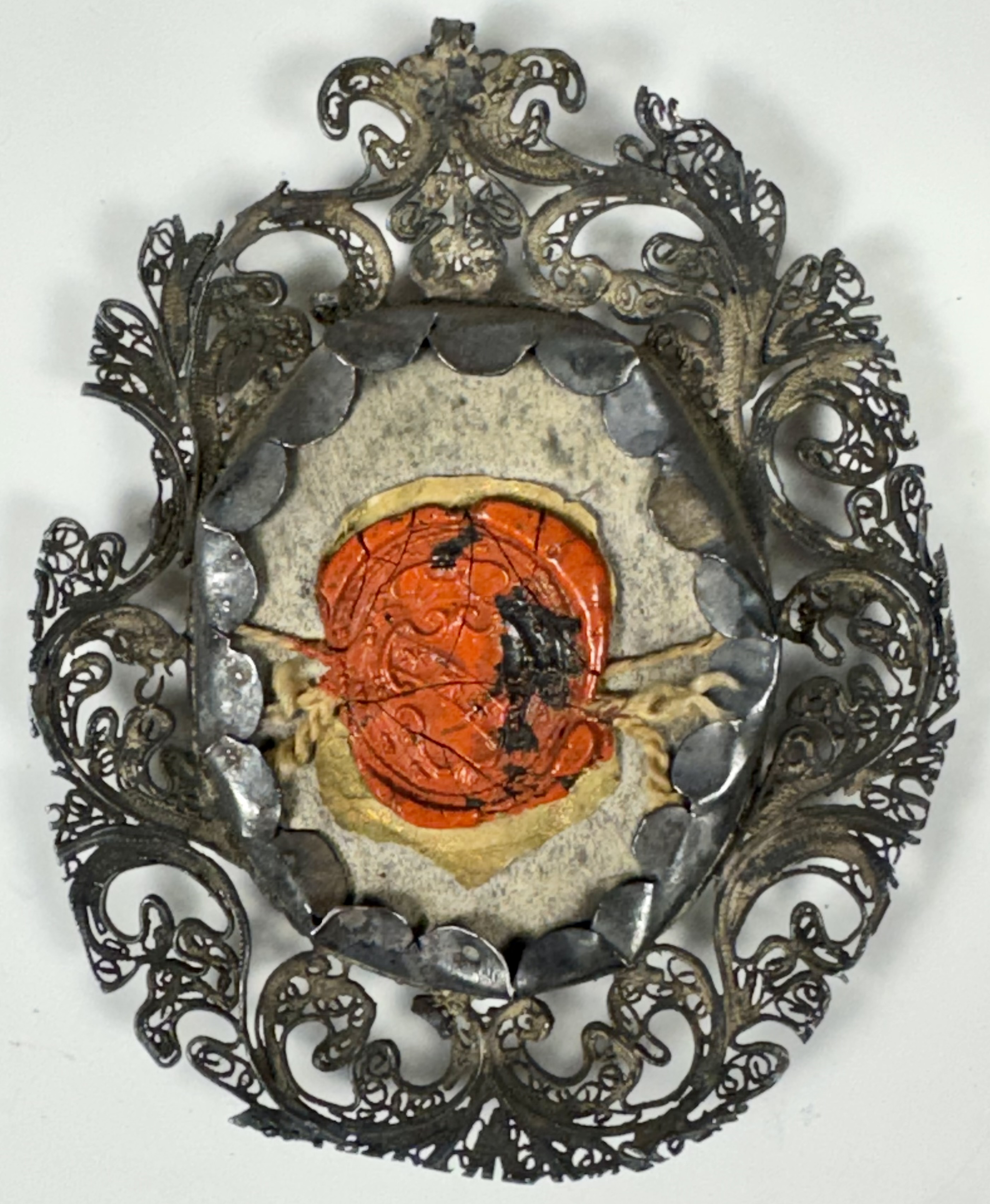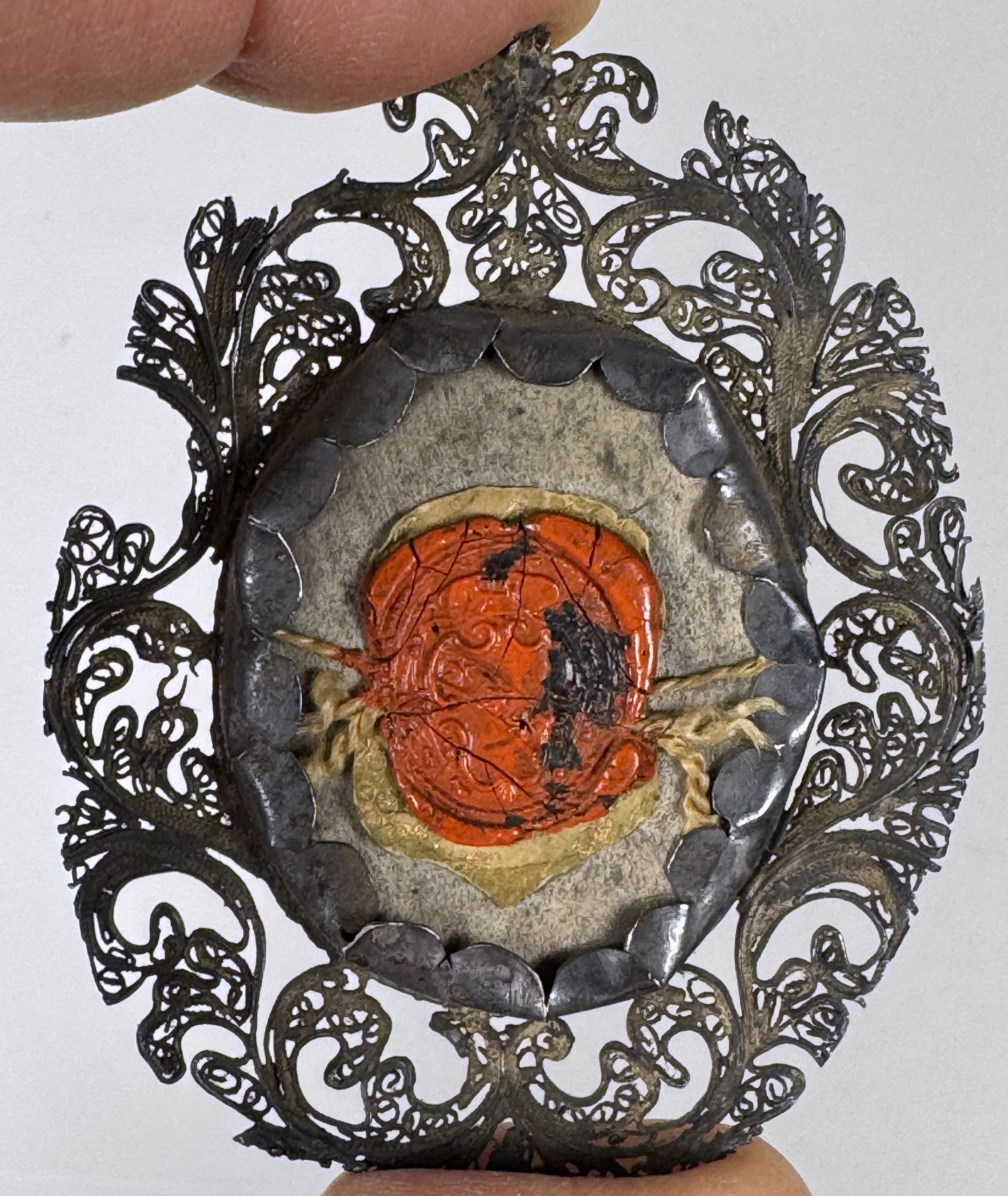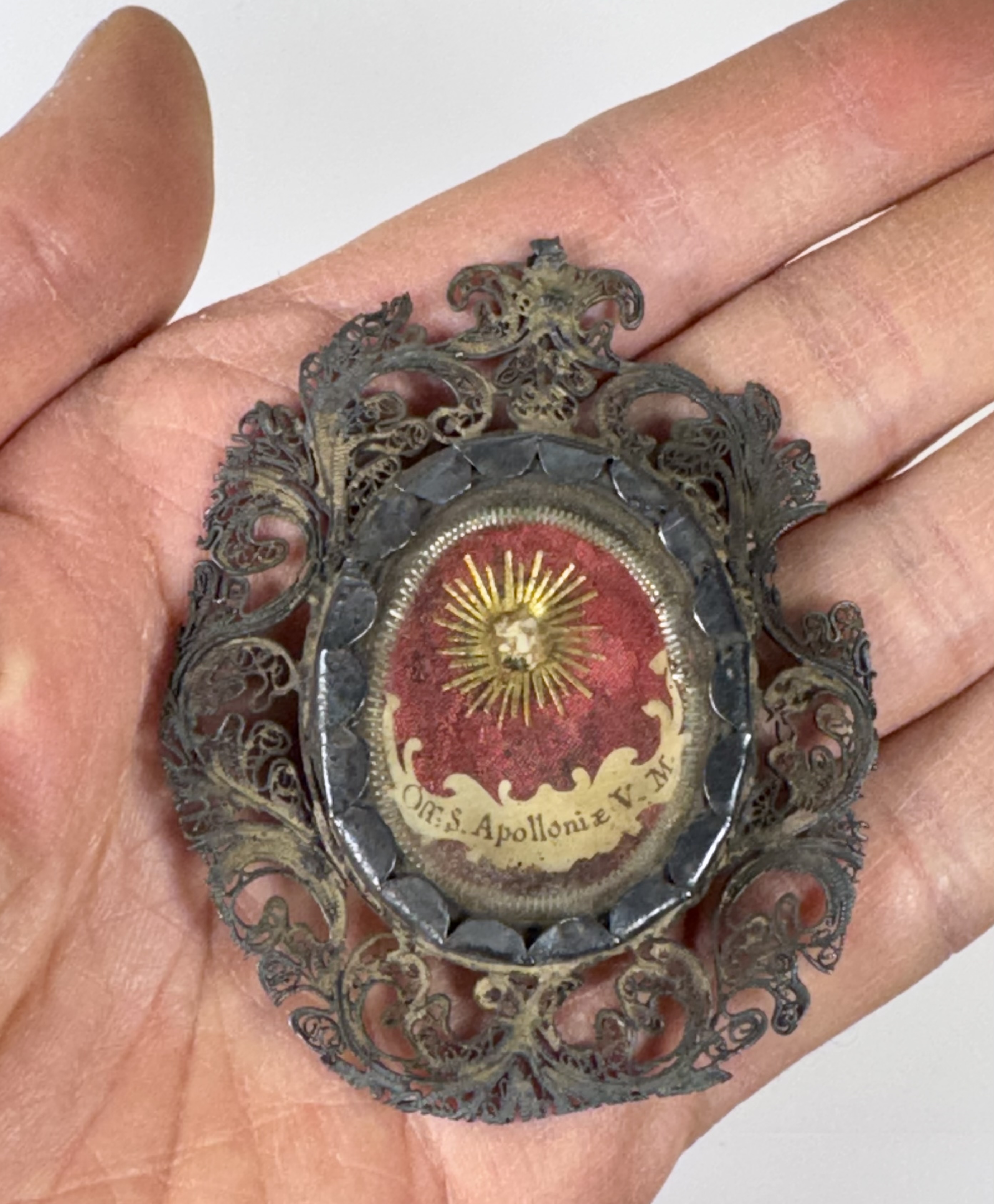 Fancy oval glass-fronted silver pendant reliquary theca surrounded by silver filigree ornamentation housing the first-class ex ossibus (of the bone) relic of Saint Apollonia of Alexandria. A sizable relic is affixed to a gilt-paper starburst on a ground of red silk, surrounded by silver wire ornamentation and identified in Latin on a fancy manuscript cedula label as Ex Oss. S. Apolloniae V. & M. (of the bone of St. Apollonia, Virgin and Martyr). On the back, the theca is secured with a seal of red Spanish wax bearing an imprint of a coat of arms of Fr. Francesco Maria Ginori (†1775), Bishop of Fiesole, Italy (1736–1775).