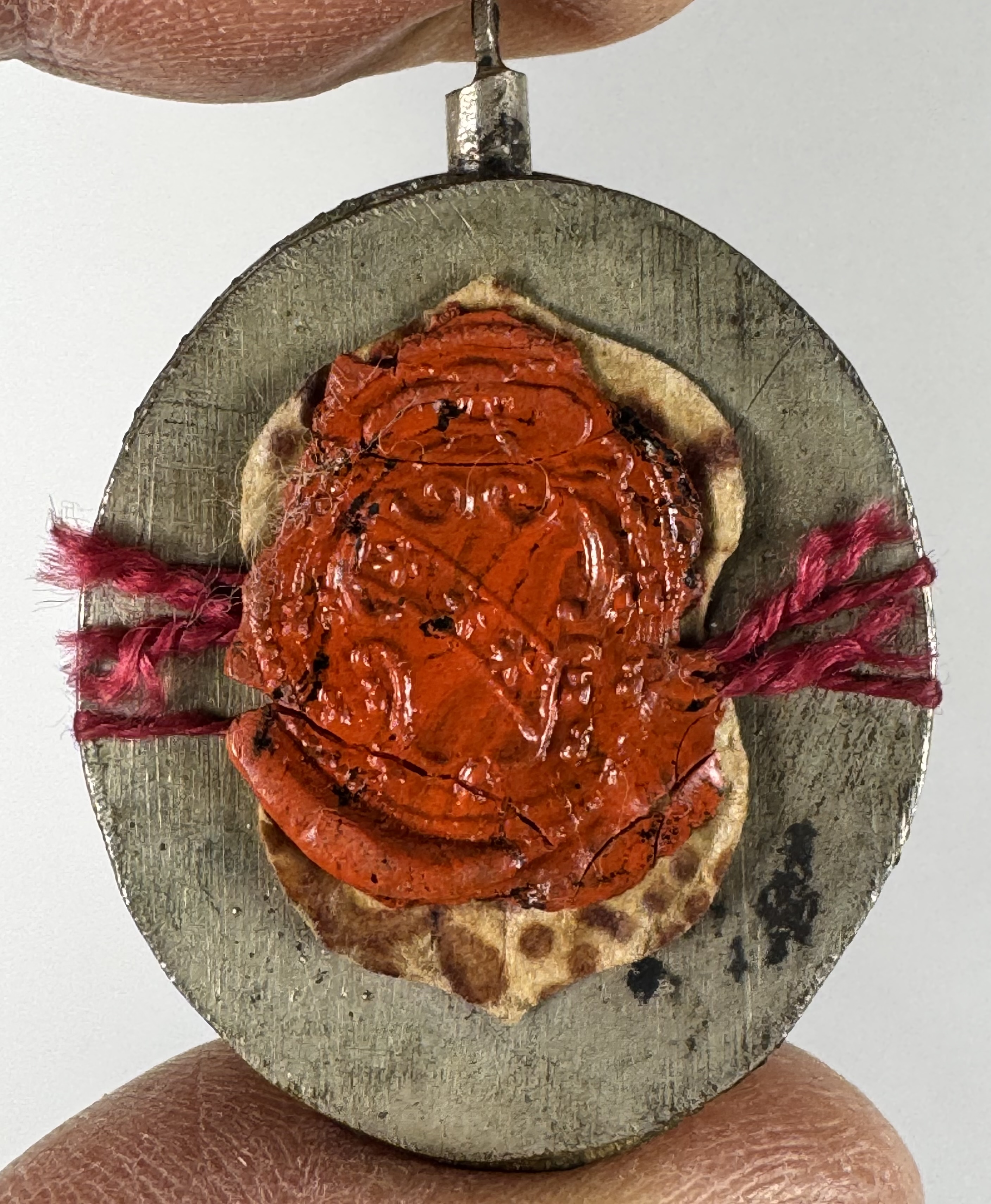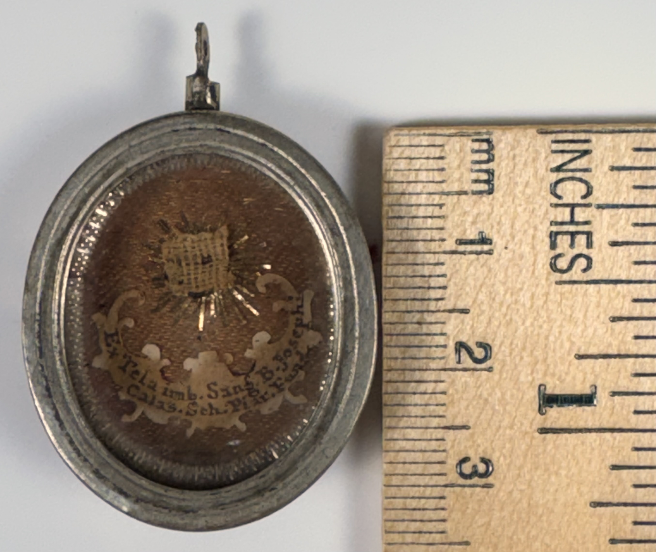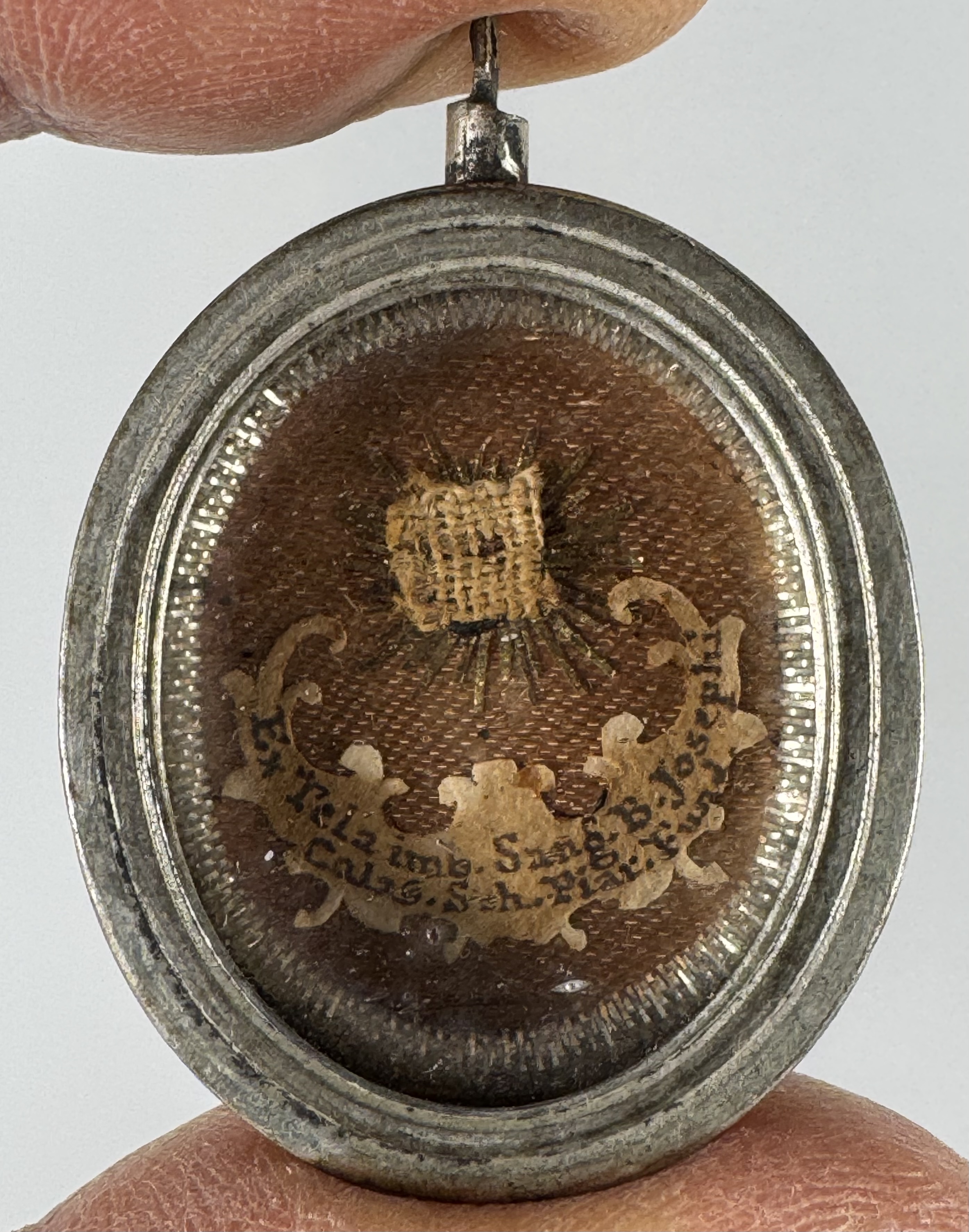 Oval glass-fronted silvered brass pendant reliquary theca housing first-class Ex tela imbuto sanguinis (of a cloth soaked in blood) pre-canonization relic of Saint Joseph Calasanz. A substantial relic is affixed to a silk ground, surrounded by silver wire ornamentation, and identified in Latin on a fancy manuscript cedula label as Ex tela imb. sang. B. Josephi // Calas. Sch. Piat Fund. (of the of a cloth soaked in the blood of Blessed Joseph Calasanz, Founder of the Pious Schools). On the back, the theca is secured with a perfectly preserved seal of red Spanish wax bearing an imprint of a coat of arms of Fr. Francesco Maria Ginori (†1775), Bishop of Fiesole, Italy (1736–1775).