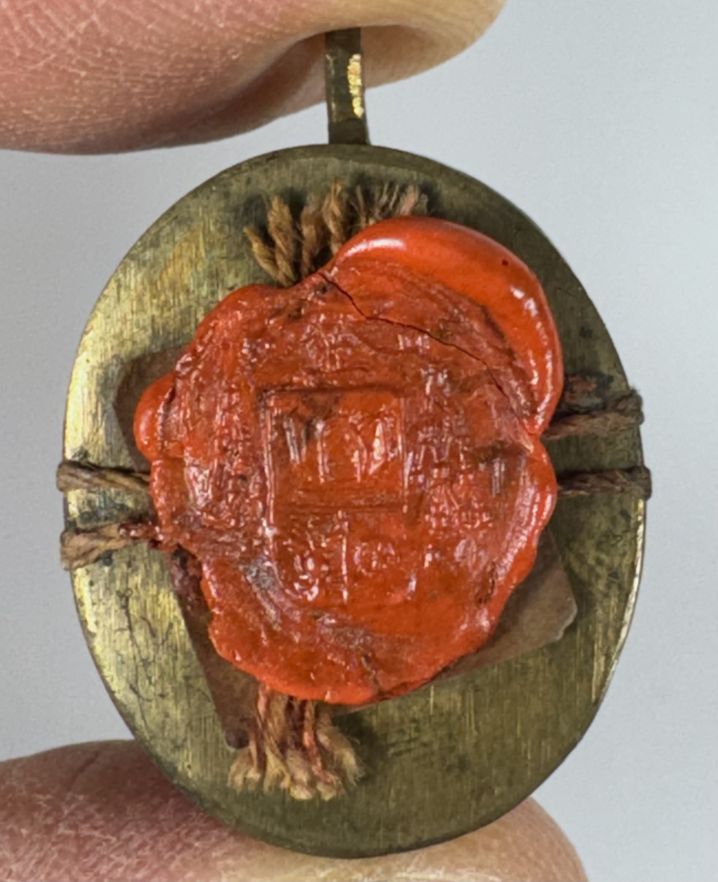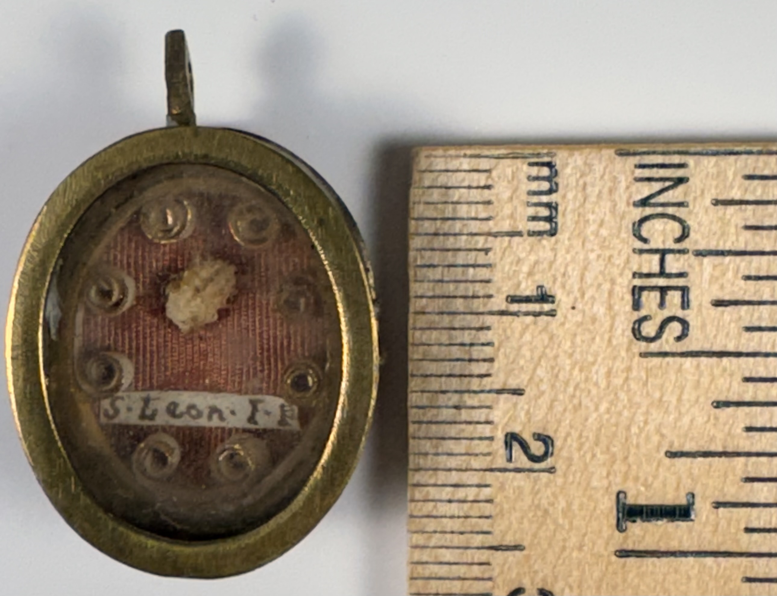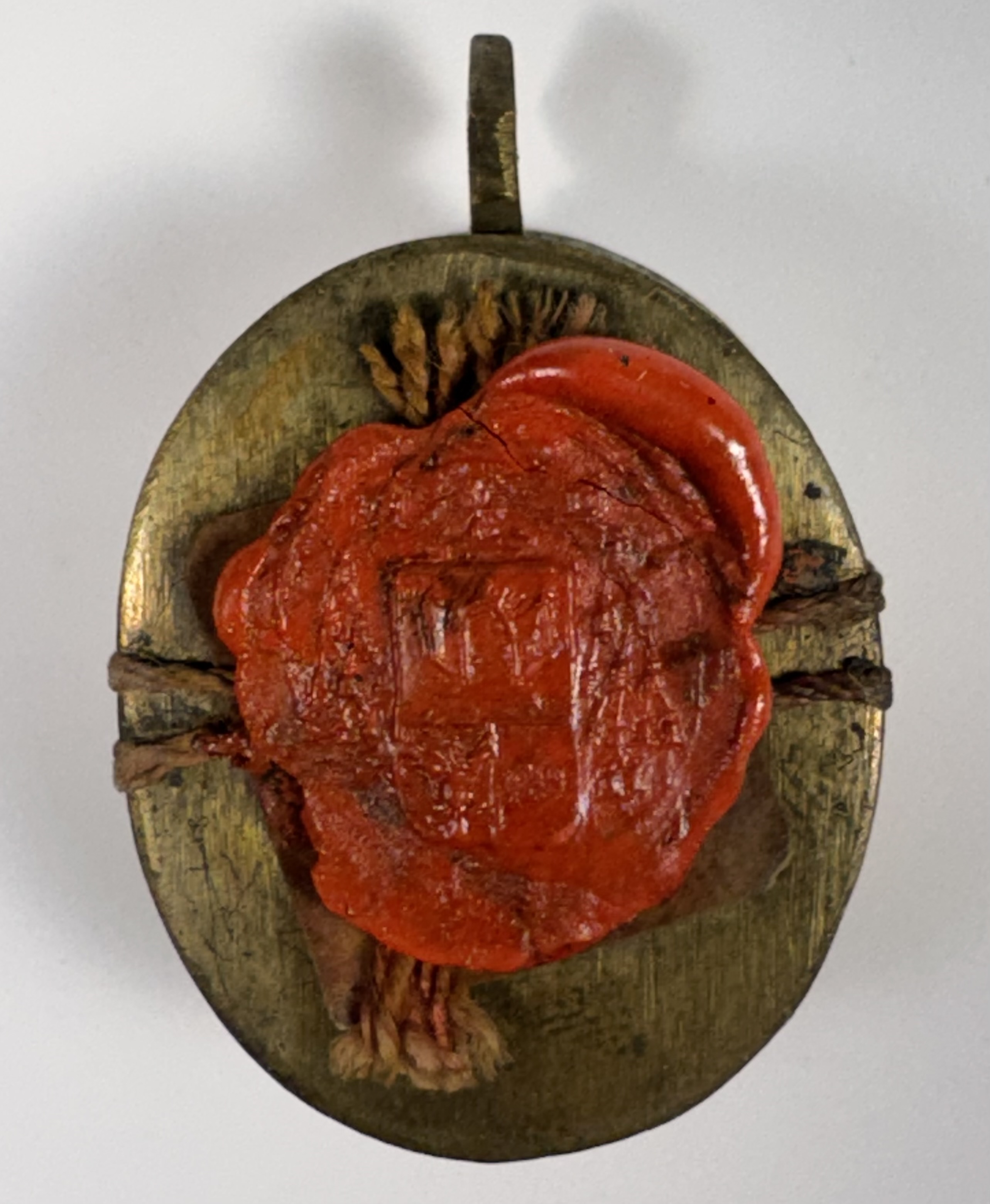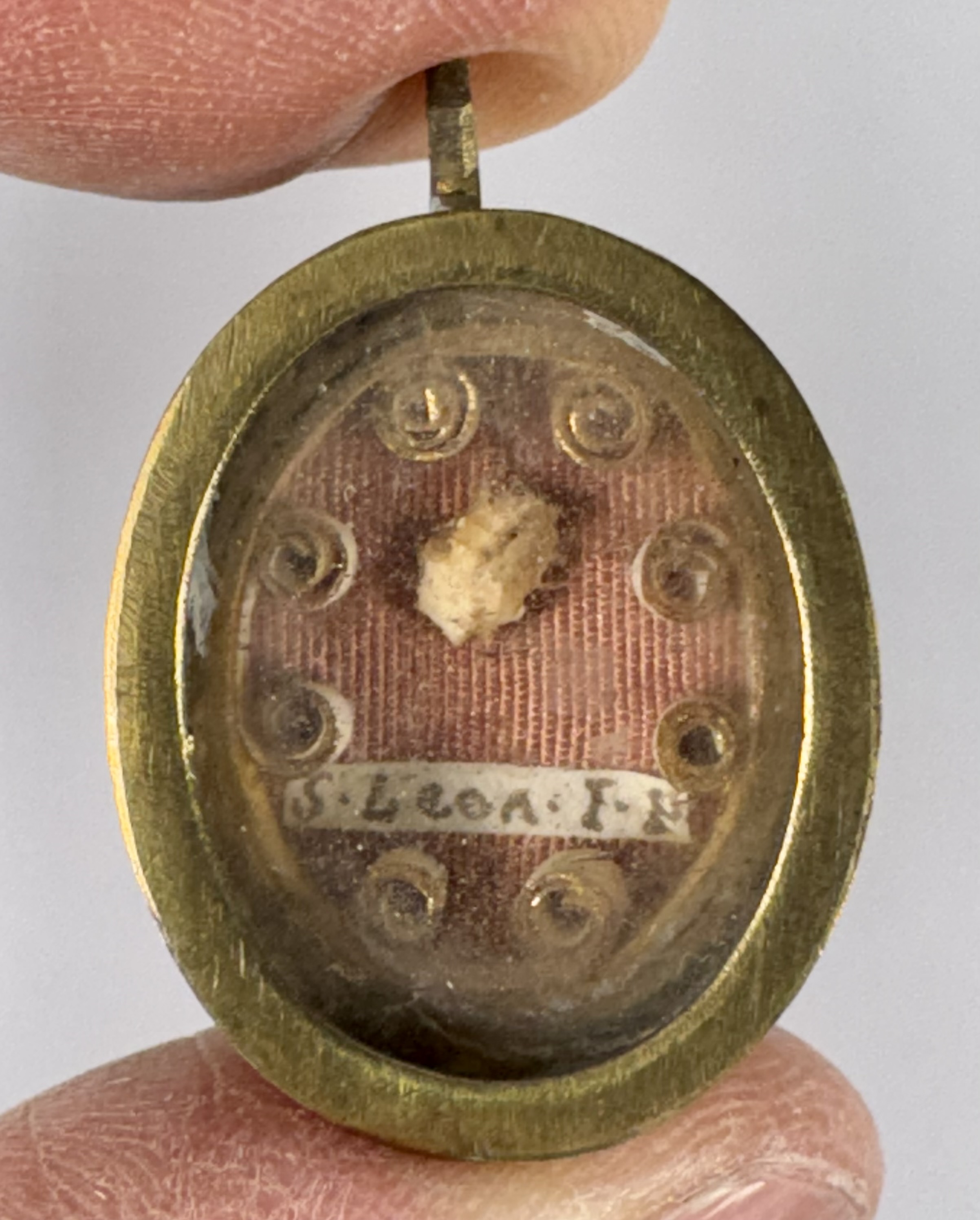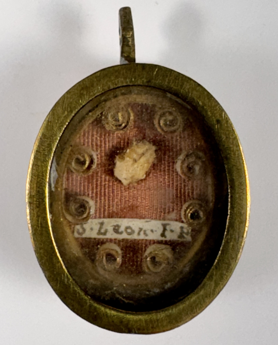 Oval glass-fronted brass pendant reliquary theca housing first-class ex ossibus (of the bone) relic of Saint Leonard of Port Maurice. The relic is affixed to a red silk ground, surrounded by gilt paperolle ornamentation, and identified in Latin on a manuscript cedula label as S. Leon. P. M. (Saint Leonard of Port Maurice). On the back, the theca is secured with a perfectly preserved seal of red Spanish wax bearing an imprint of a coat of an unidentified Roman Catholic Archbishop.