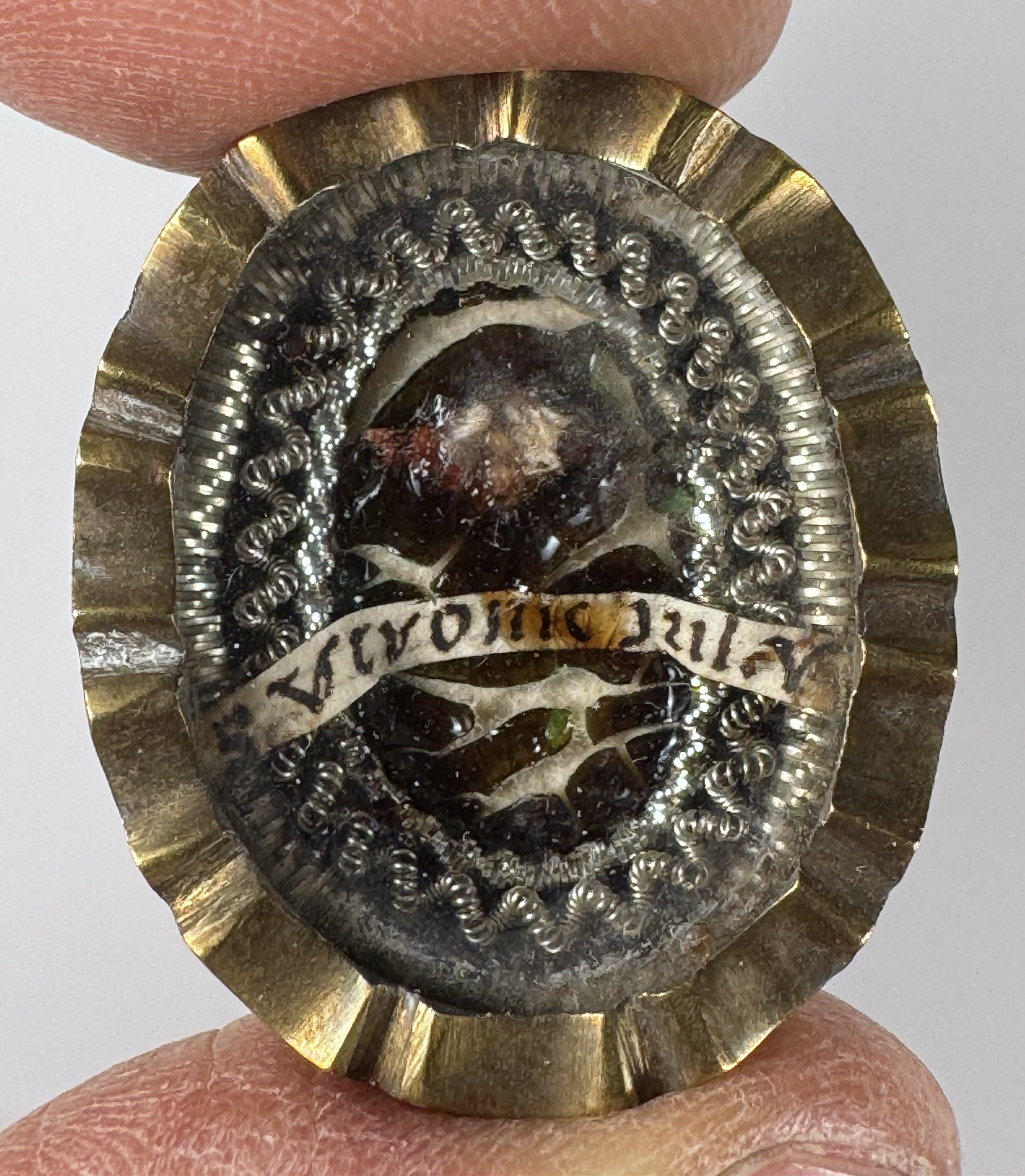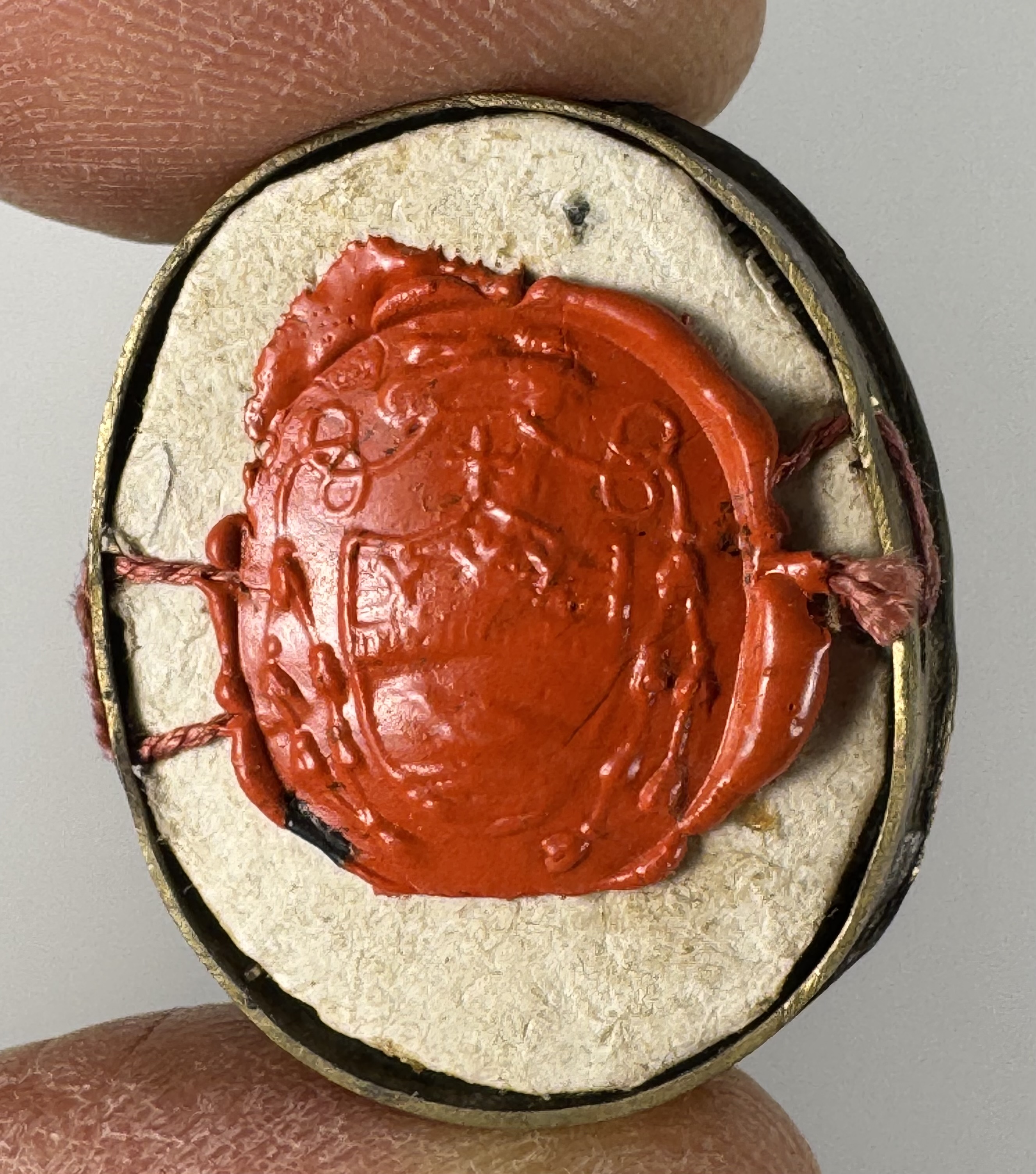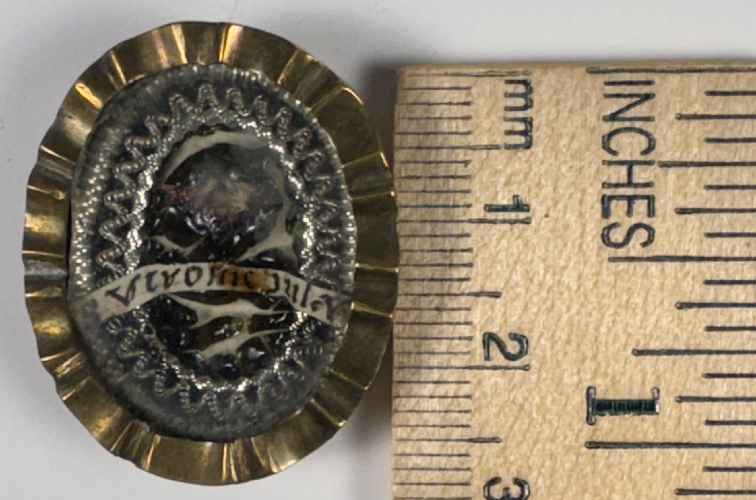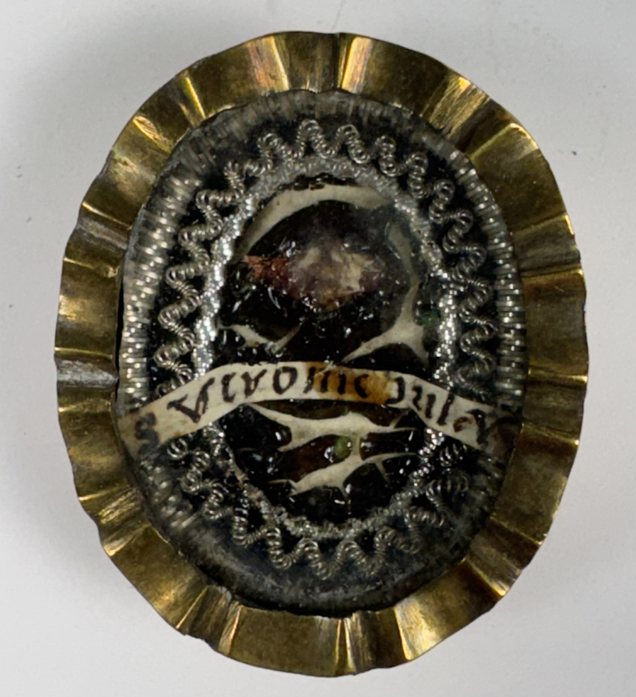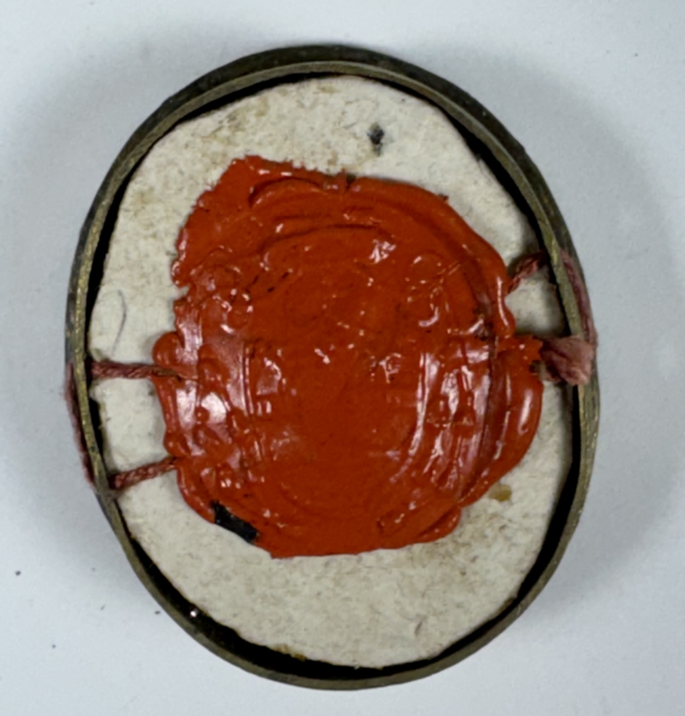 Oval glass-fronted brass pendant reliquary theca housing a relic of Saint Veronica Giuliani. The relic is surrounded by silver wire ornamentation, and identified in Latin on a manuscript cedula label as S. Veronic. Jul. V. (Saint Veronica Giuliani, Virgin). On the back, the theca is secured with a perfectly preserved seal of red Spanish wax bearing an imprint of a coat of arms of an unidentified Roman Catholic Bishop.