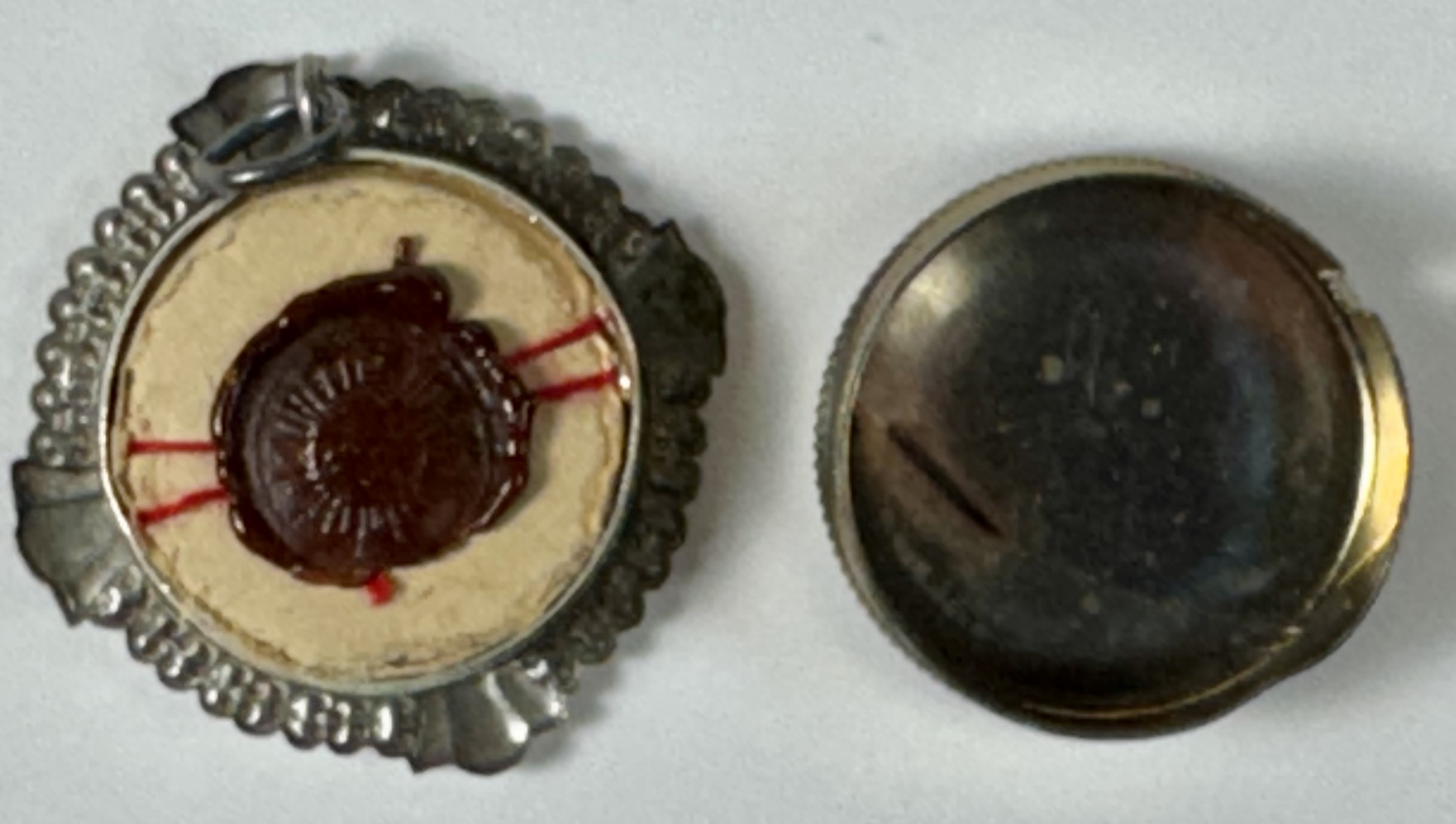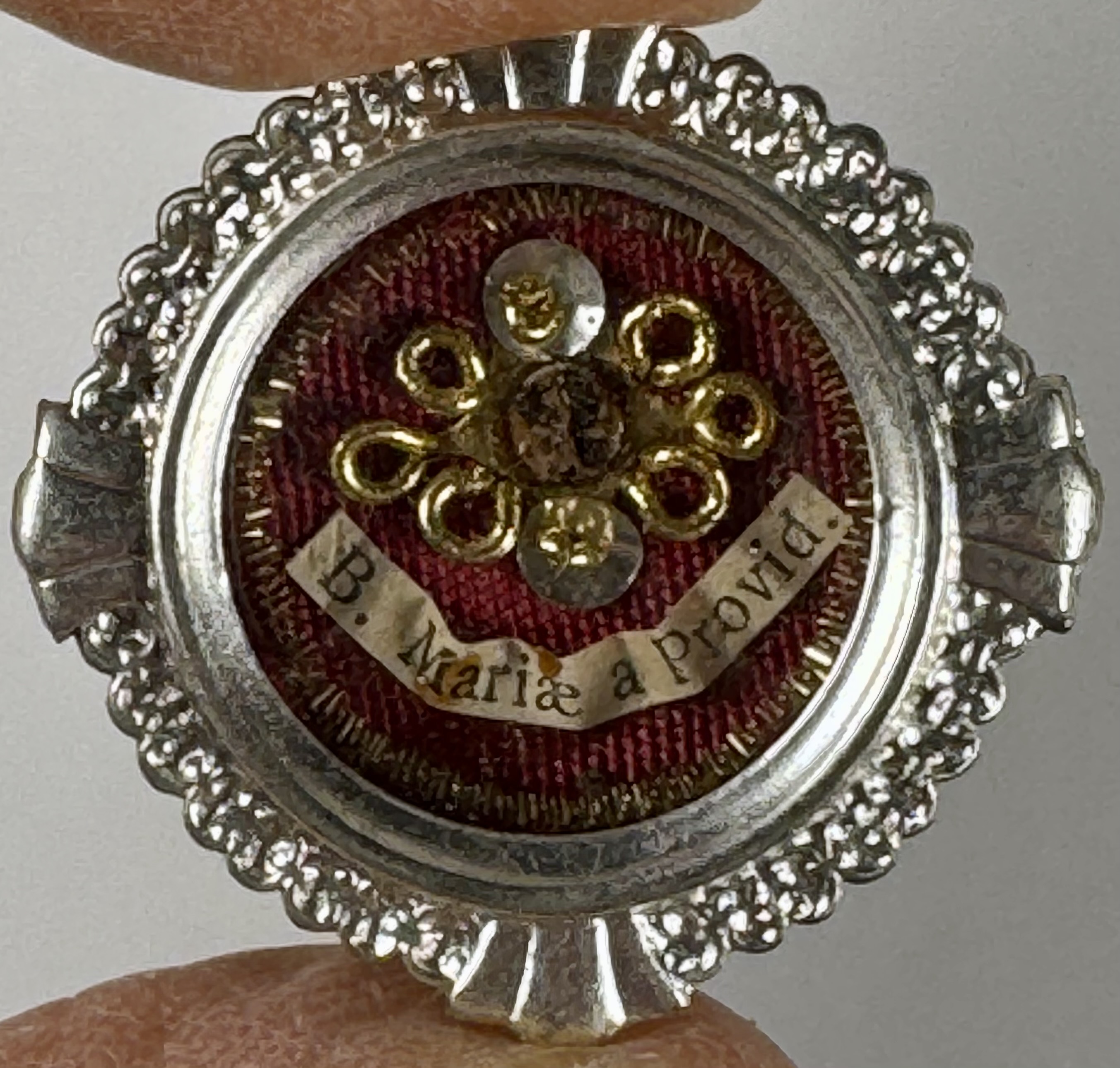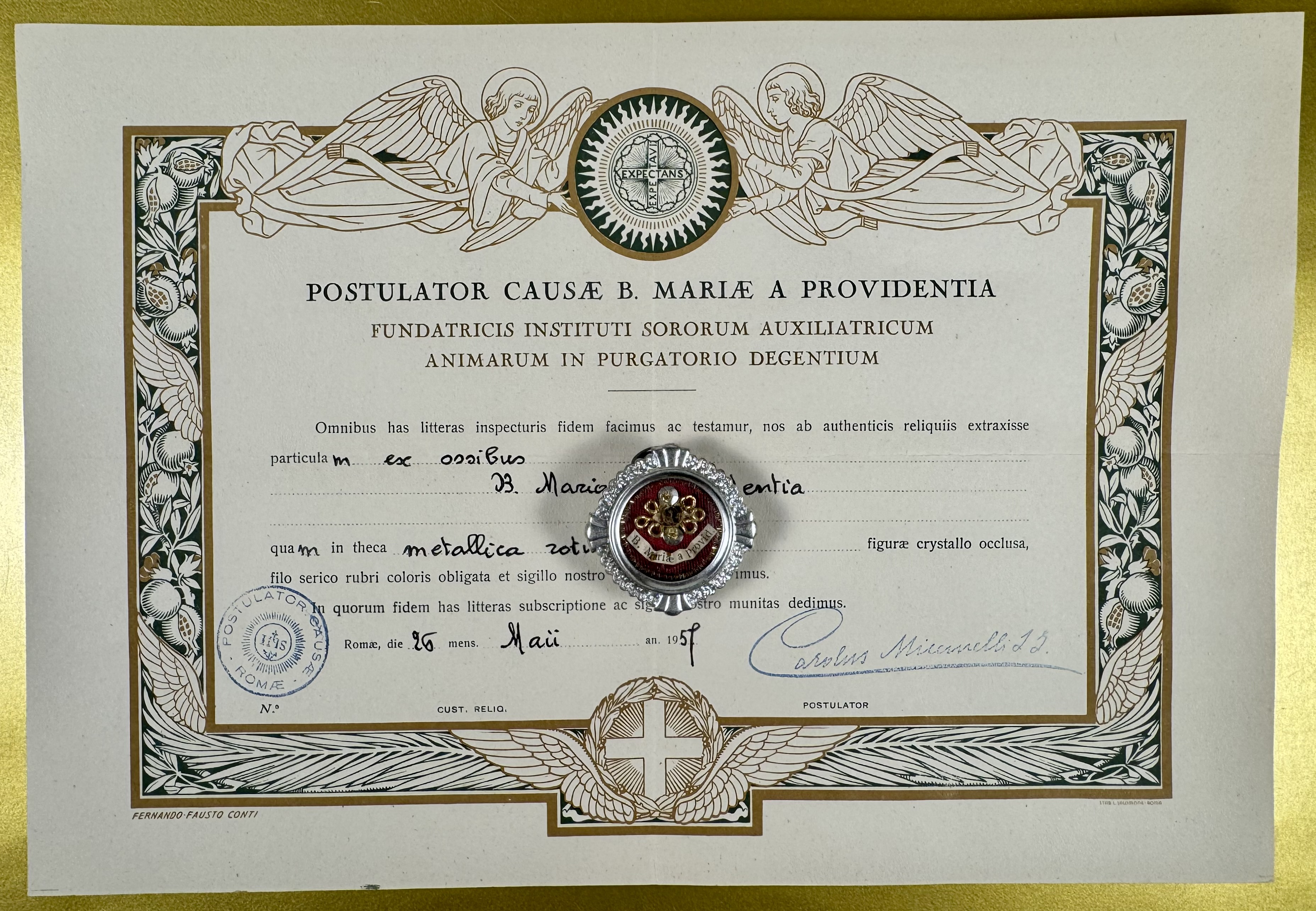 Round white-metal glass-fronted reliquary theca housing the first-class ex ossibus (of the bone) relic of the Blessed Mary of Providence. The relic is affixed to a red silk ground and identified in Latin on a typeset cedula label as B. Mariae a Provid. (Blessed Mary of Providence). On the back, under a protective cap, the theca is secured by a seal of red Spanish wax bearing an imprint of a coat of arms of the Society of Jesus (The Jesuits). The reliquary is accompanied by the original matching authentics document issued by the Postulator General of the Order on 26 May 1957 (the very day of her beatification).