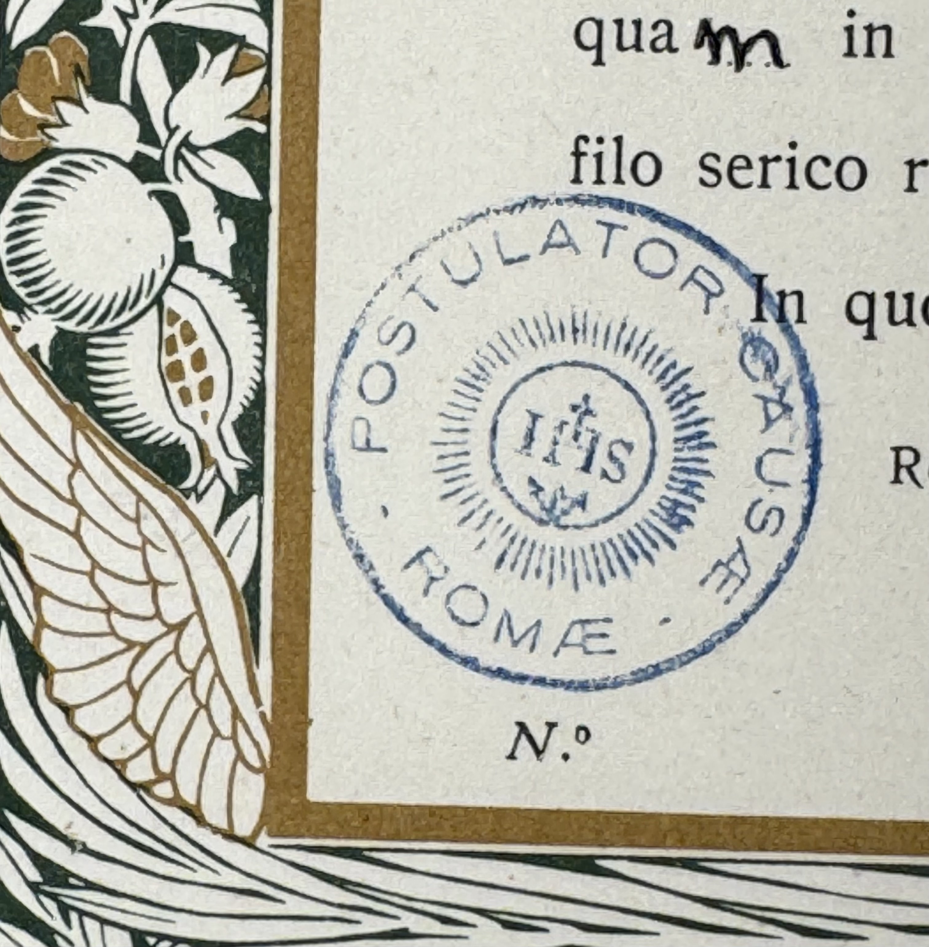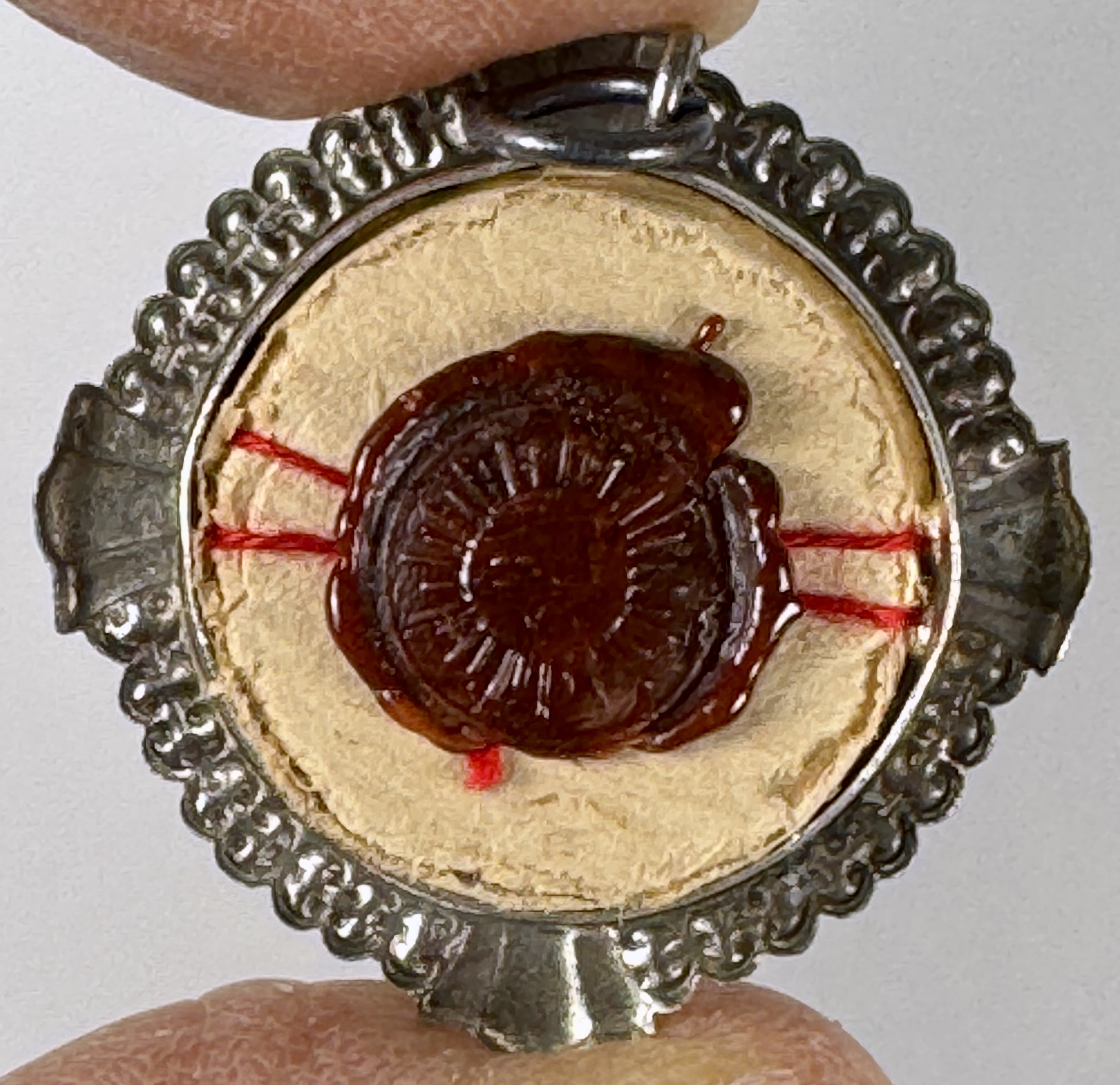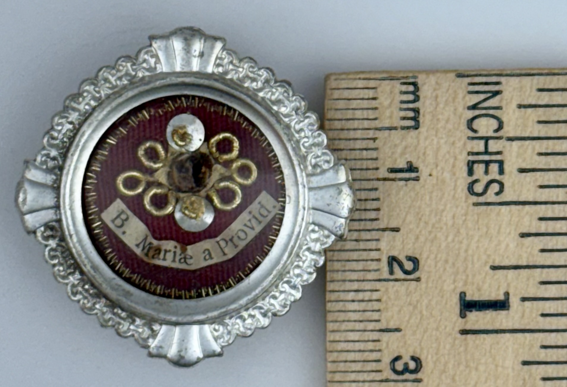 Round white-metal glass-fronted reliquary theca housing the first-class ex ossibus (of the bone) relic of the Blessed Mary of Providence. The relic is affixed to a red silk ground and identified in Latin on a typeset cedula label as B. Mariae a Provid. (Blessed Mary of Providence). On the back, under a protective cap, the theca is secured by a seal of red Spanish wax bearing an imprint of a coat of arms of the Society of Jesus (The Jesuits). The reliquary is accompanied by the original matching authentics document issued by the Postulator General of the Order on 26 May 1957 (the very day of her beatification).