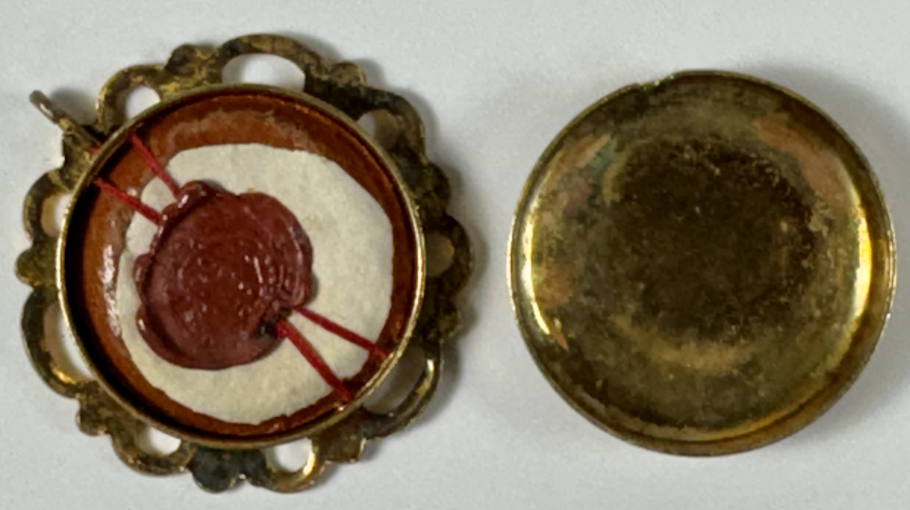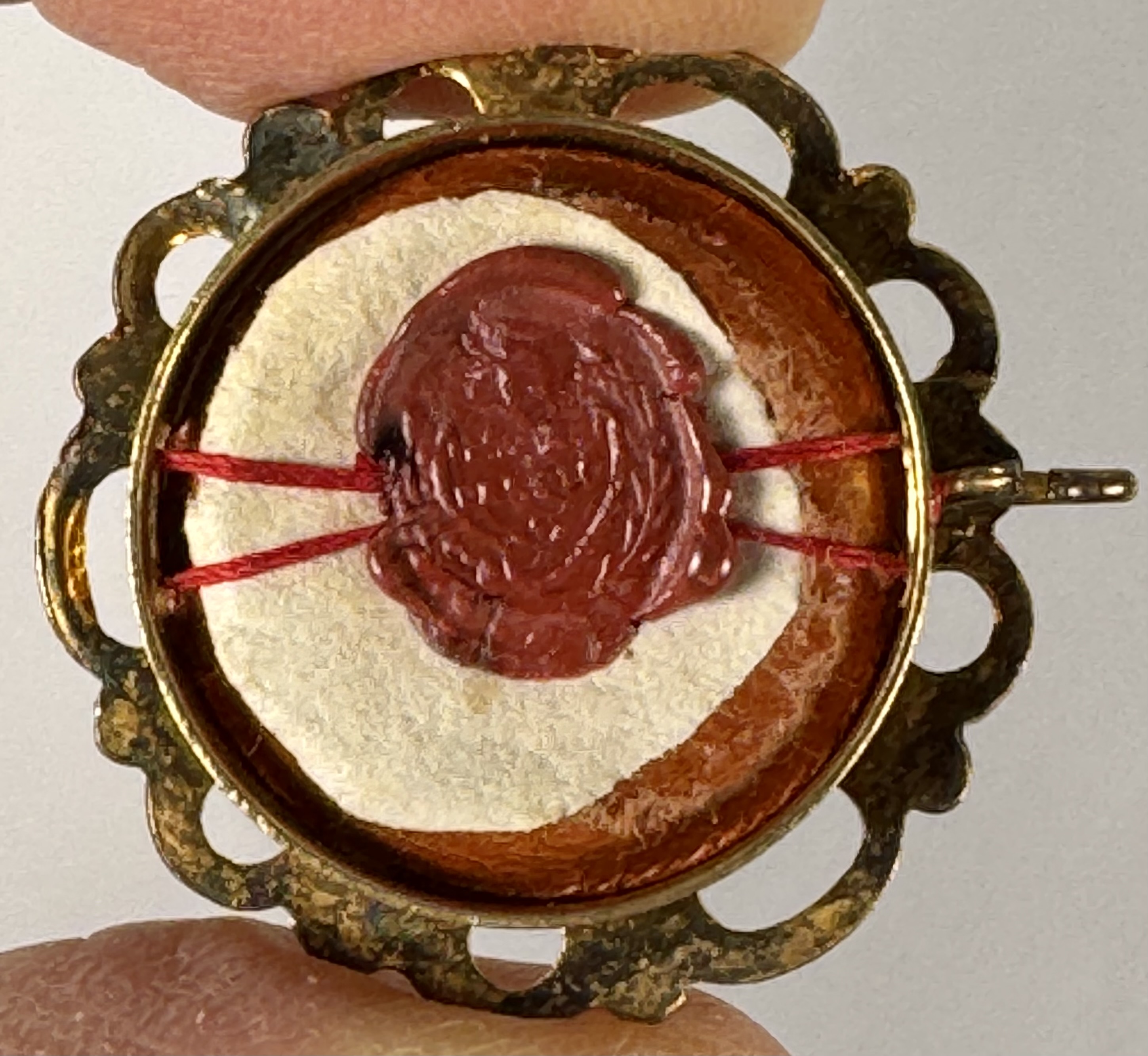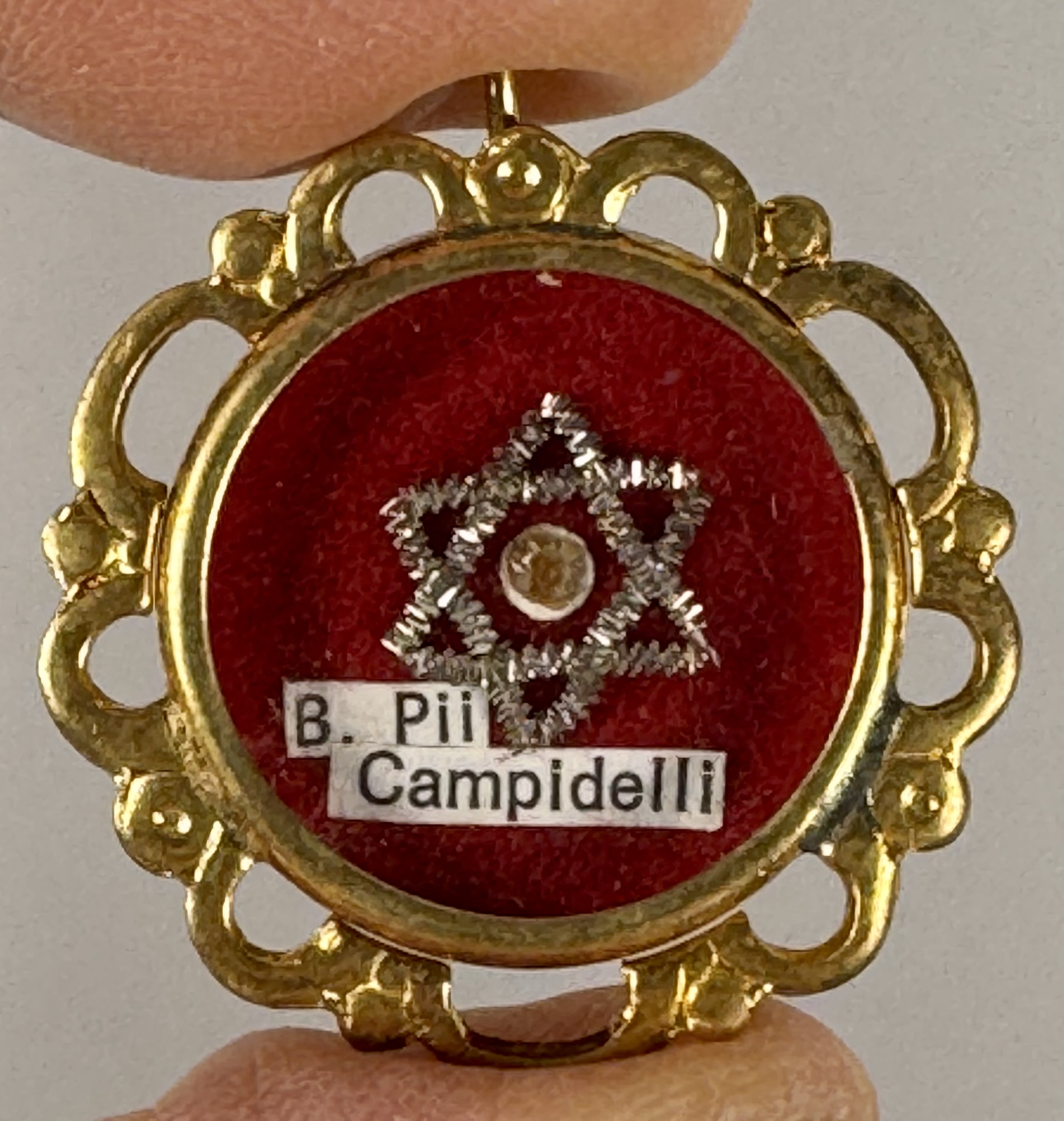 Round yellow-metal glass-fronted reliquary theca housing the first-class ex ossibus (of the bone) relic of Blessed Pius of Saint Aloysius. The relic is affixed to a red silk ground surrounded by silver wire ornamentation and identified in Latin on a typeset cedula label as B. Pii Campidelli (Blessed Pius Campidelli). On the back, under a protective cap, the theca is secured with a seal of red Spanish wax bearing an imprint of a coat of arms of the Congregation of the Passion of Jesus Christ (commonly known as the Passionists).