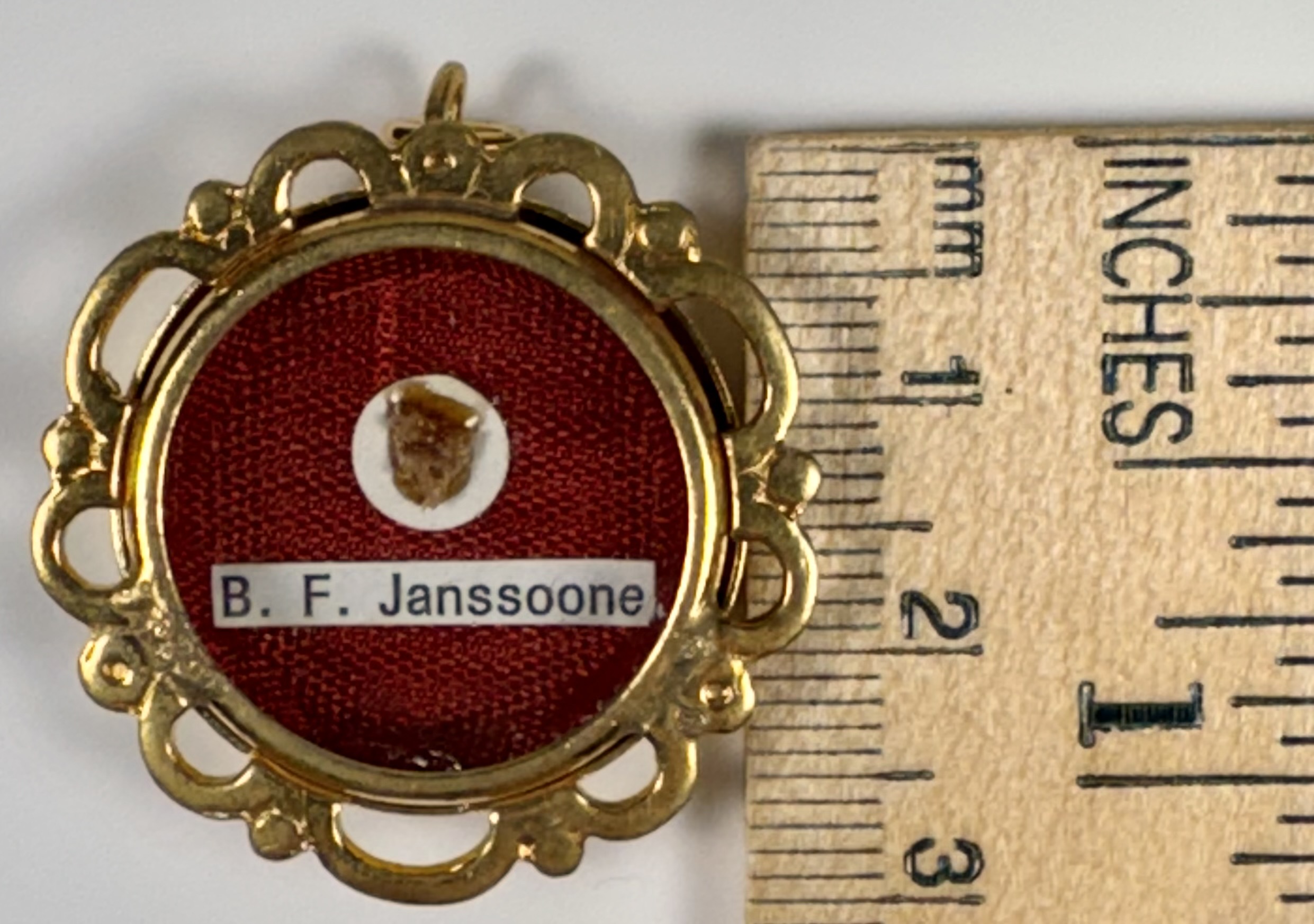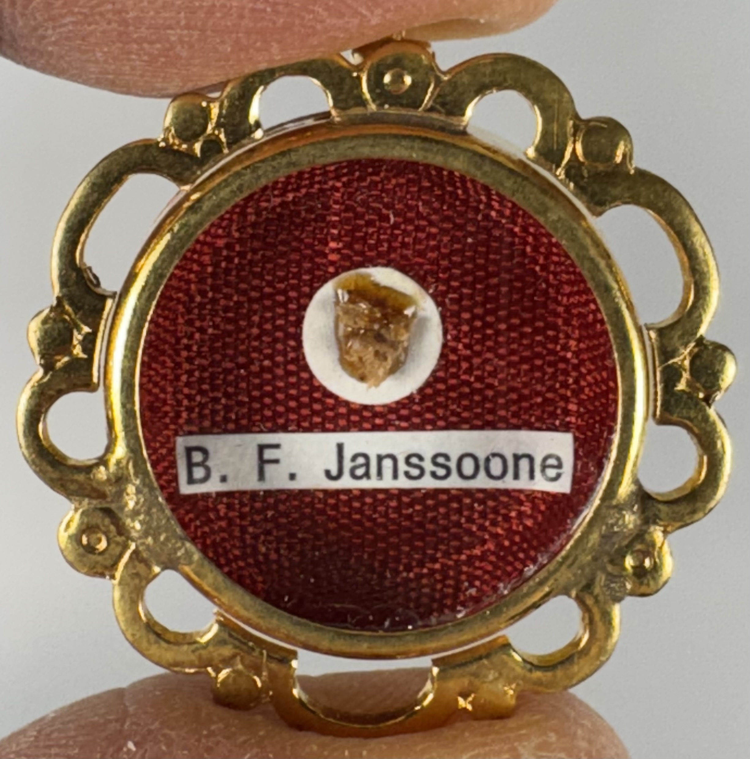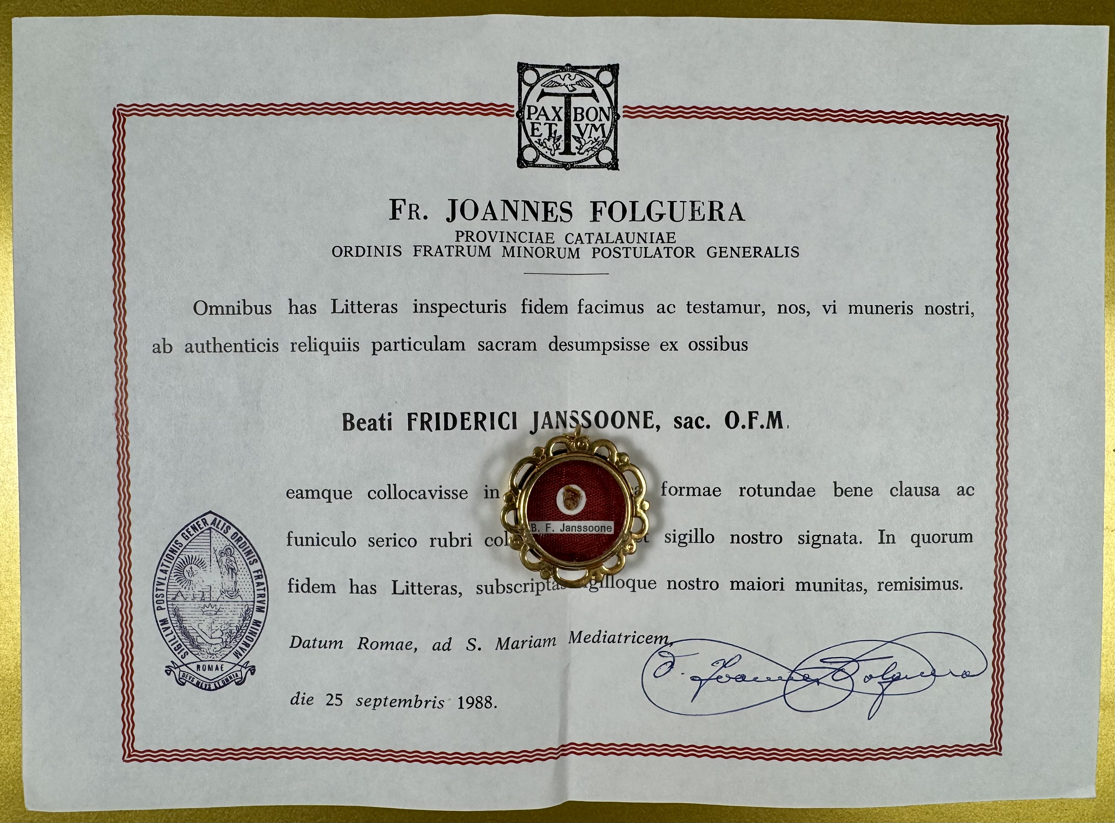 Round glass-fronted yellow-metal reliquary theca housing the first-class ex ossibus (of the bone) relic of Blessed Frédéric Janssoone. The relic is affixed to a red silk ground and identified in Latin on a typeset cedula label as B. F. Janssoone (Blessed Frédéric Janssoone). On the back, under the protective cap, the theca is secured with a seal of red Spanish wax bearing an imprint of a coat of arms of the Order of the Friars Minor. The relic is accompanied by the original matching authentics document issued and signed in September 25, 1988 (the very day of his beatification) by the Postulator General of the Friars Minors responsible for the cause of beatification and canonization.