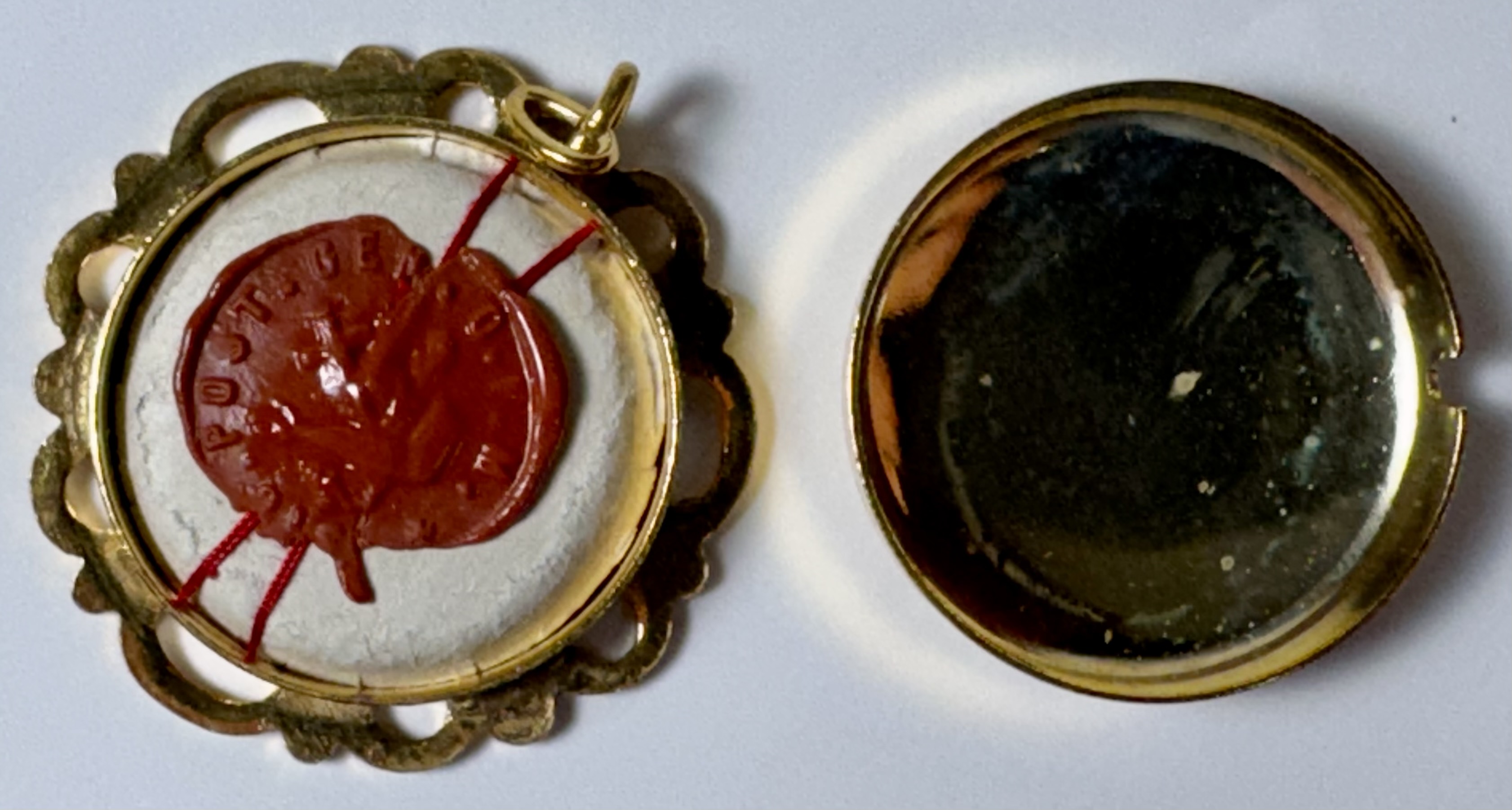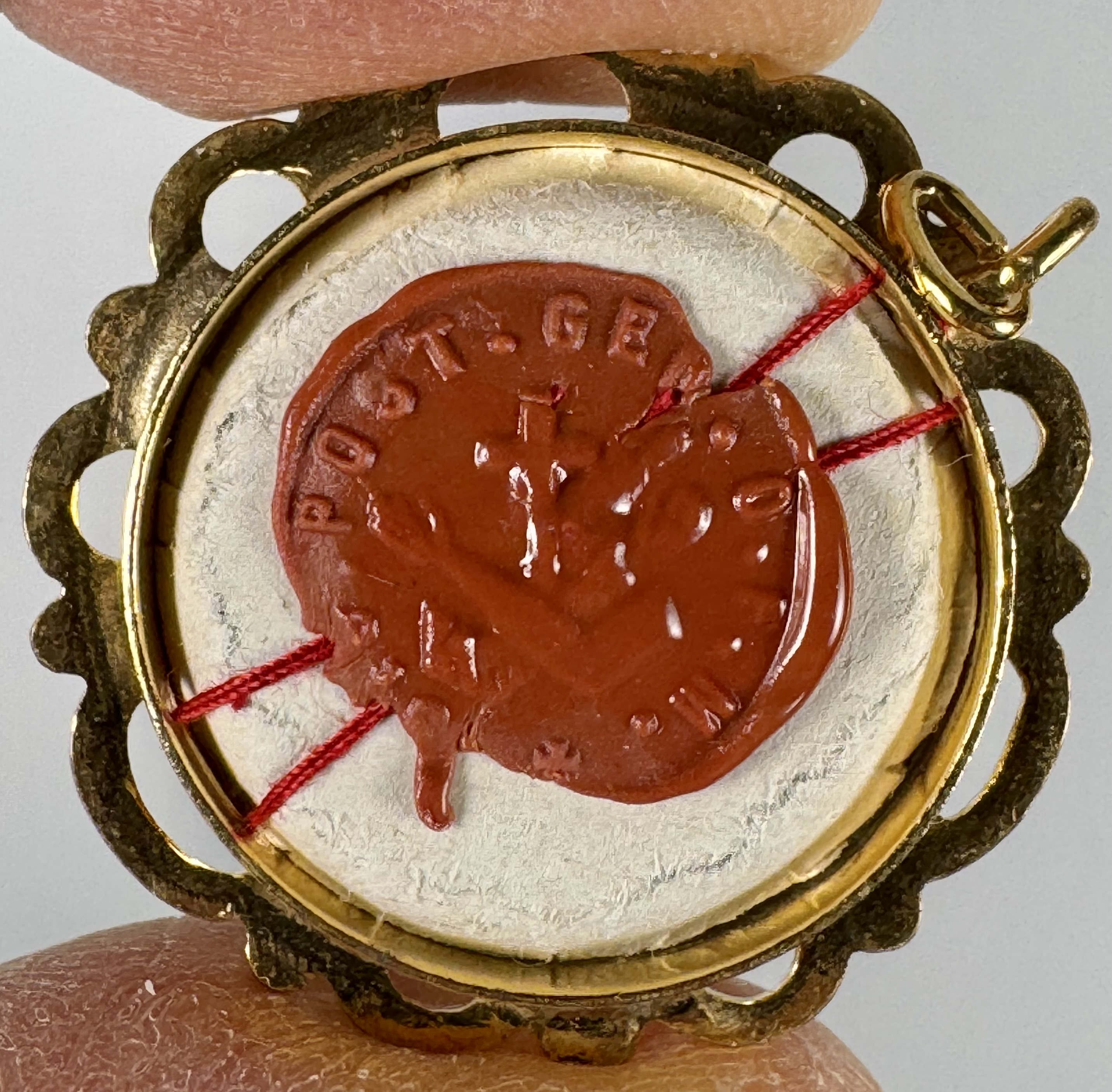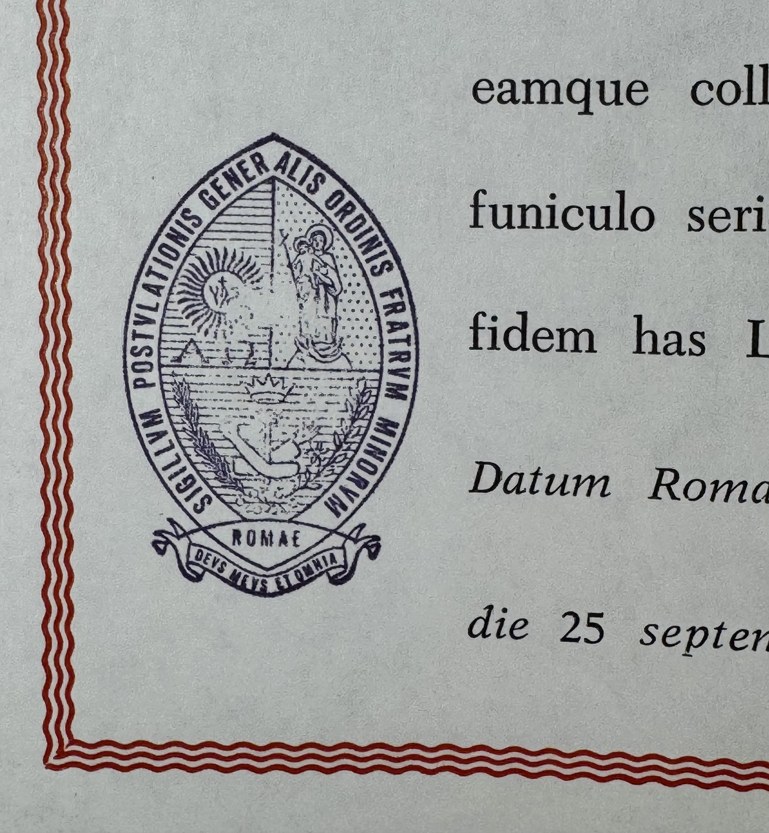 Round glass-fronted yellow-metal reliquary theca housing the first-class ex ossibus (of the bone) relic of Blessed Frédéric Janssoone. The relic is affixed to a red silk ground and identified in Latin on a typeset cedula label as B. F. Janssoone (Blessed Frédéric Janssoone). On the back, under the protective cap, the theca is secured with a seal of red Spanish wax bearing an imprint of a coat of arms of the Order of the Friars Minor. The relic is accompanied by the original matching authentics document issued and signed in September 25, 1988 (the very day of his beatification) by the Postulator General of the Friars Minors responsible for the cause of beatification and canonization.