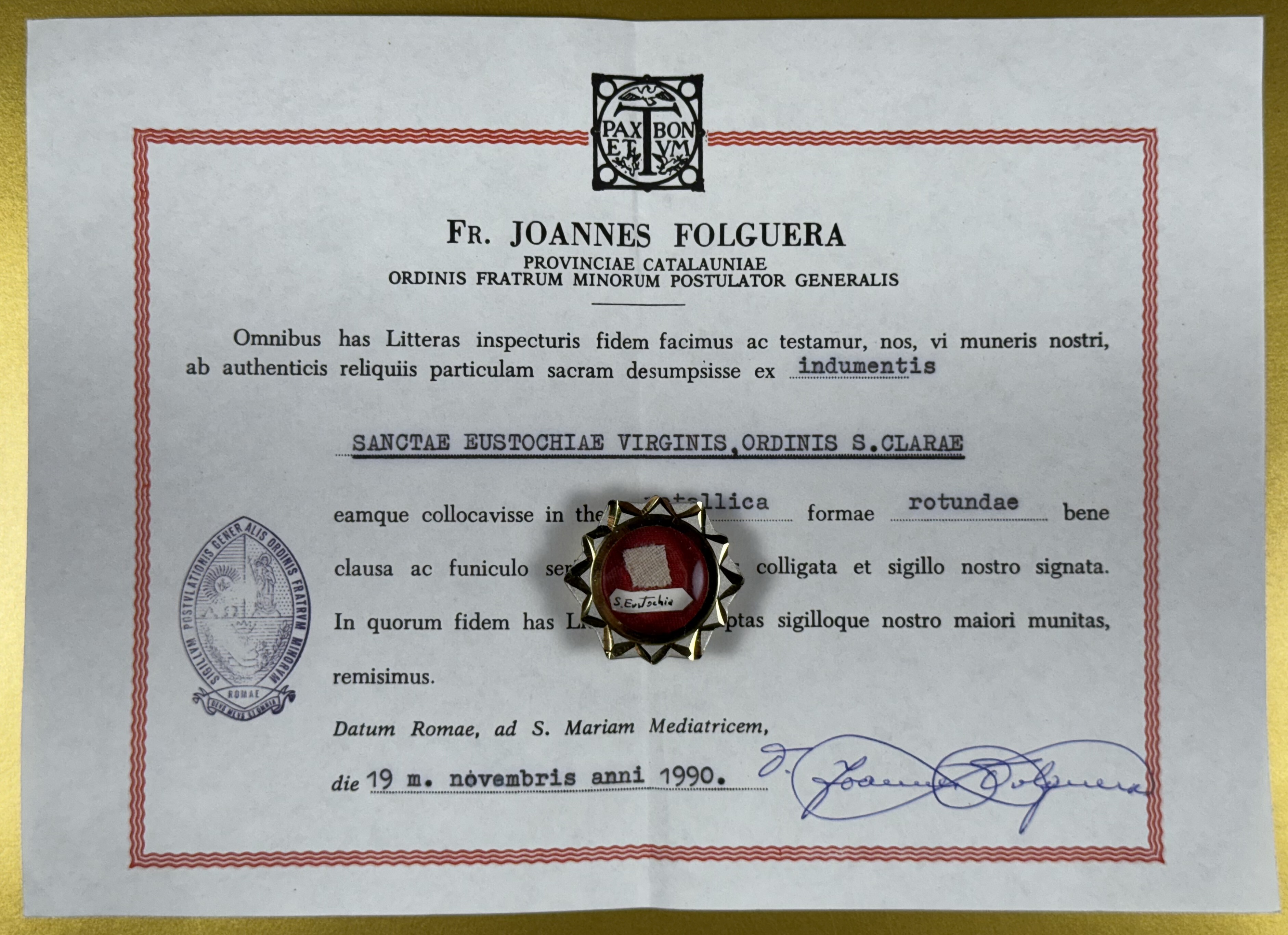 Saint Eustochia Calafato (†1485) is a Franciscan Italian saint from the Order of the Poor Clares. In 1464 she founded a convent which became known as Montevergine ("Mountain of the Virgin"). The building project was apparently completed through the funding of a wealthy relative. Eustochia was chosen abbess, and at the time of her death, the convent was home to 50 sisters. She died on 20 January 1485, at the age of 50. She was canonized on 11 June 1988 in Messina by Pope John Paul II. She is co-patroness of Messina and her Feast Day is commemorated on 20 January.